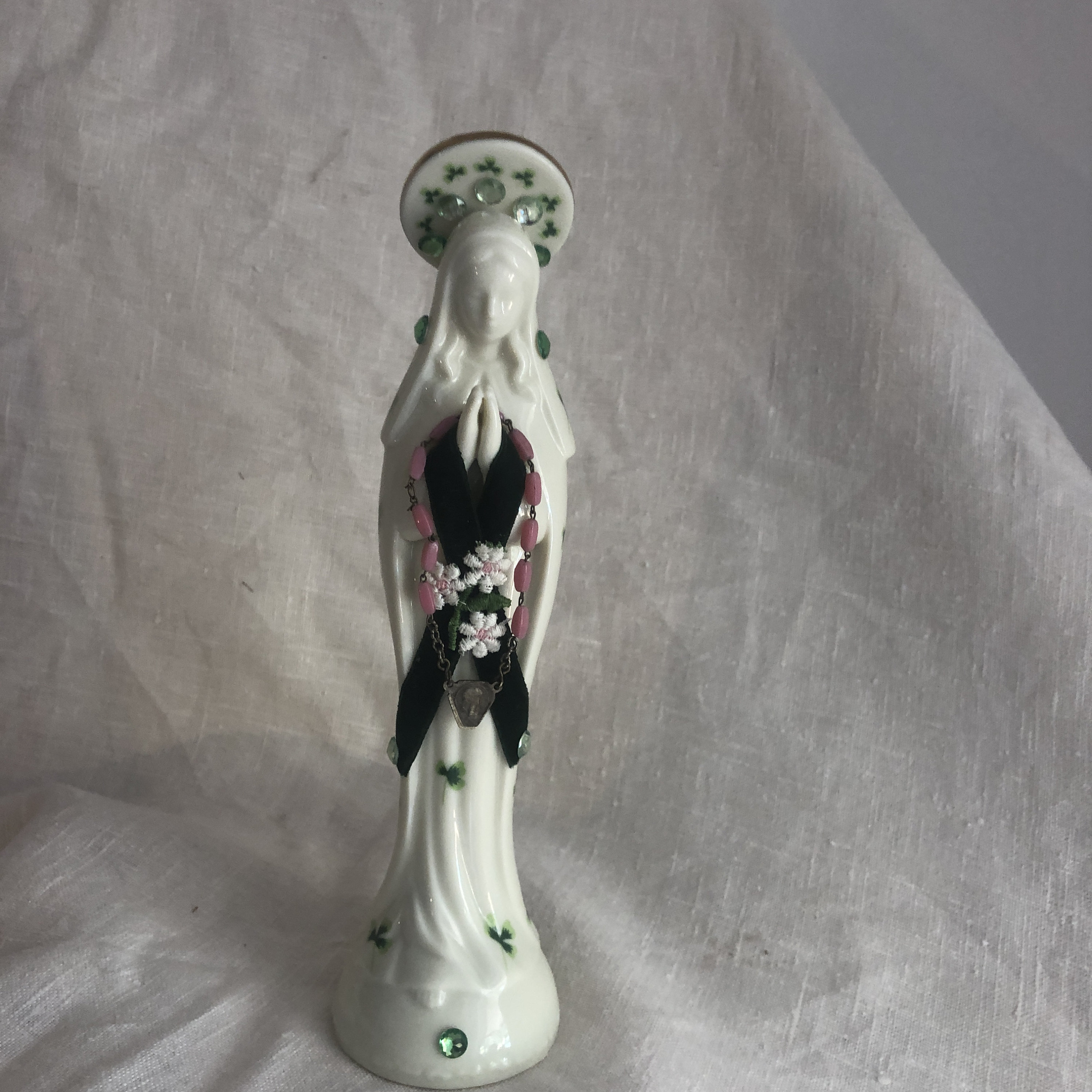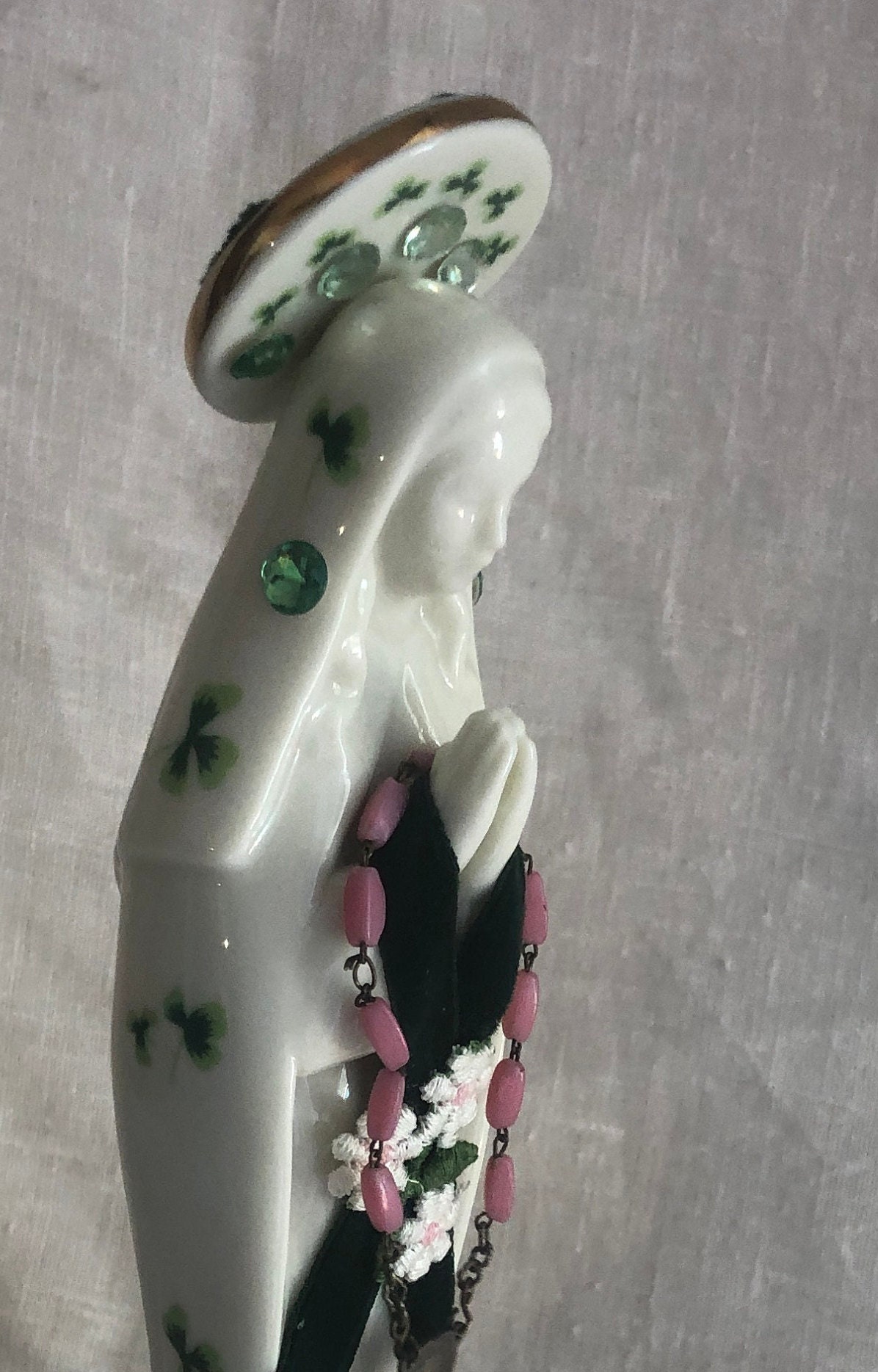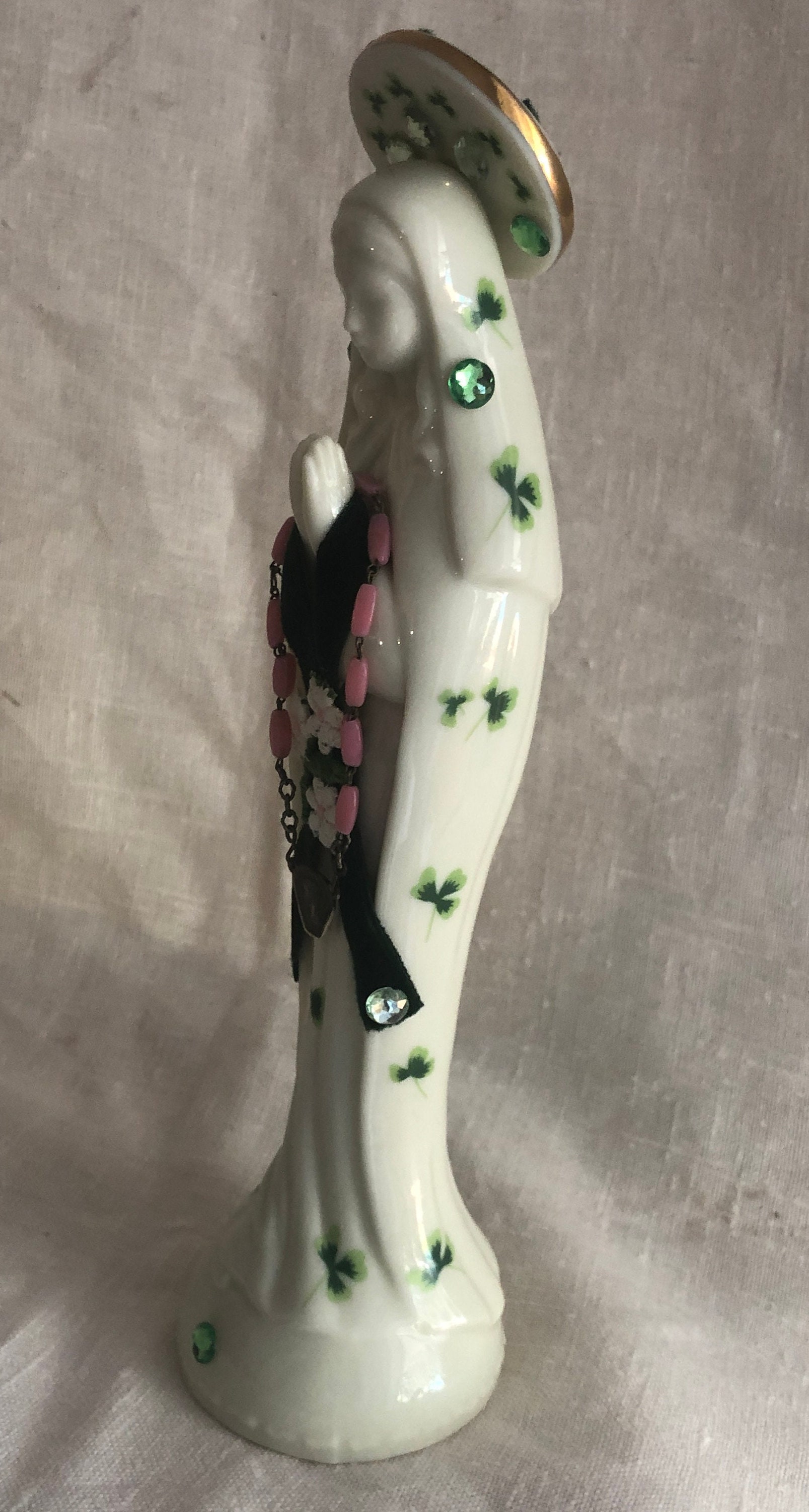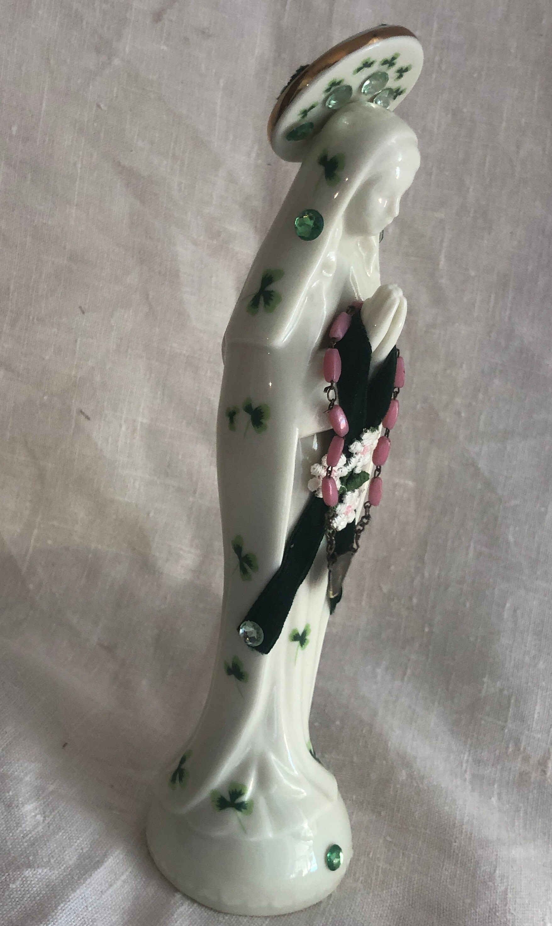 This piece is a vintage ceramic statue with a print of green shamrocks on the ceramic and an Artistic Style of Green Velvet, Assoorted Small Green Stones and a Daisy Appliqe .. Pink Rosary Beads with a small metal vintage medallion. Beads are glued in place . Halo has assorted green stones and at back a cross in dark green velvet and a pink heart stone.