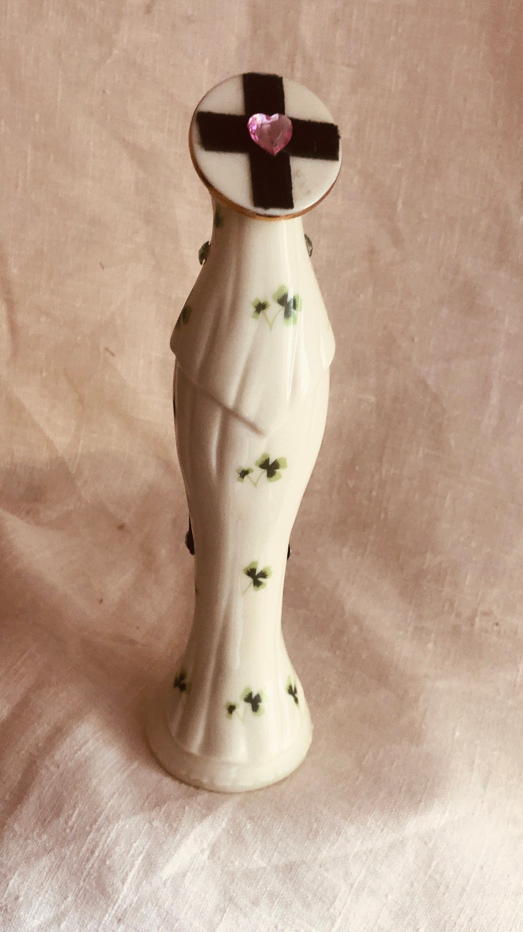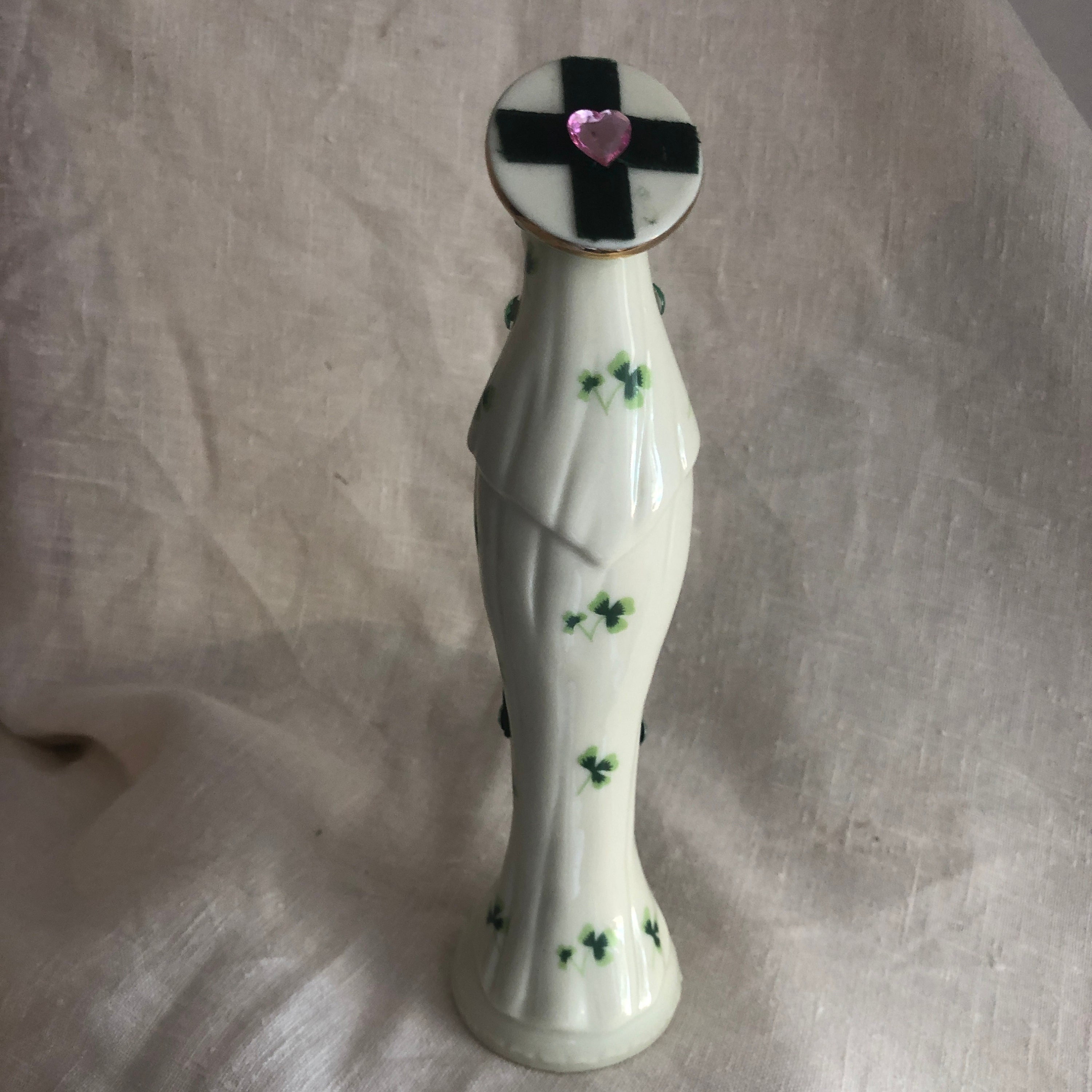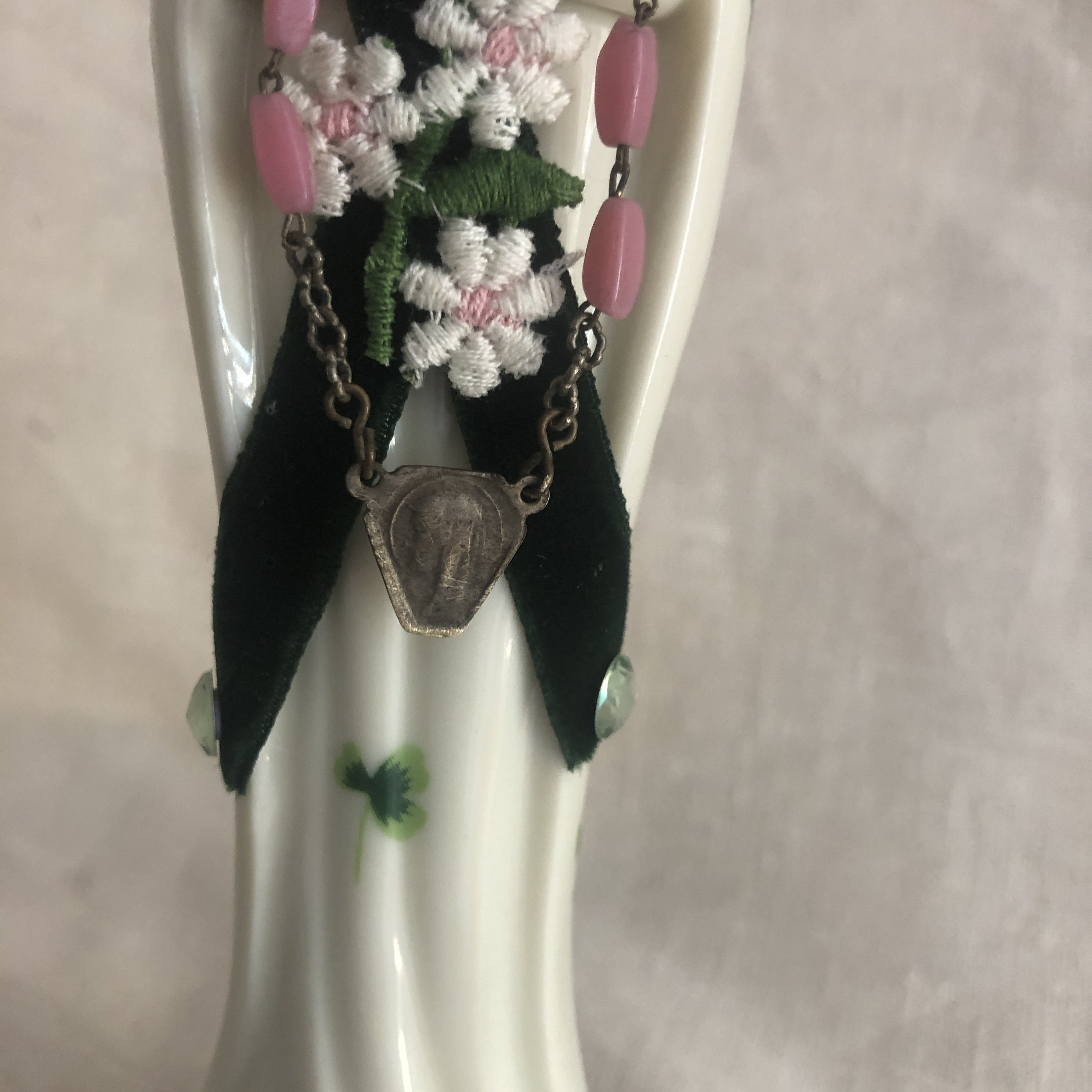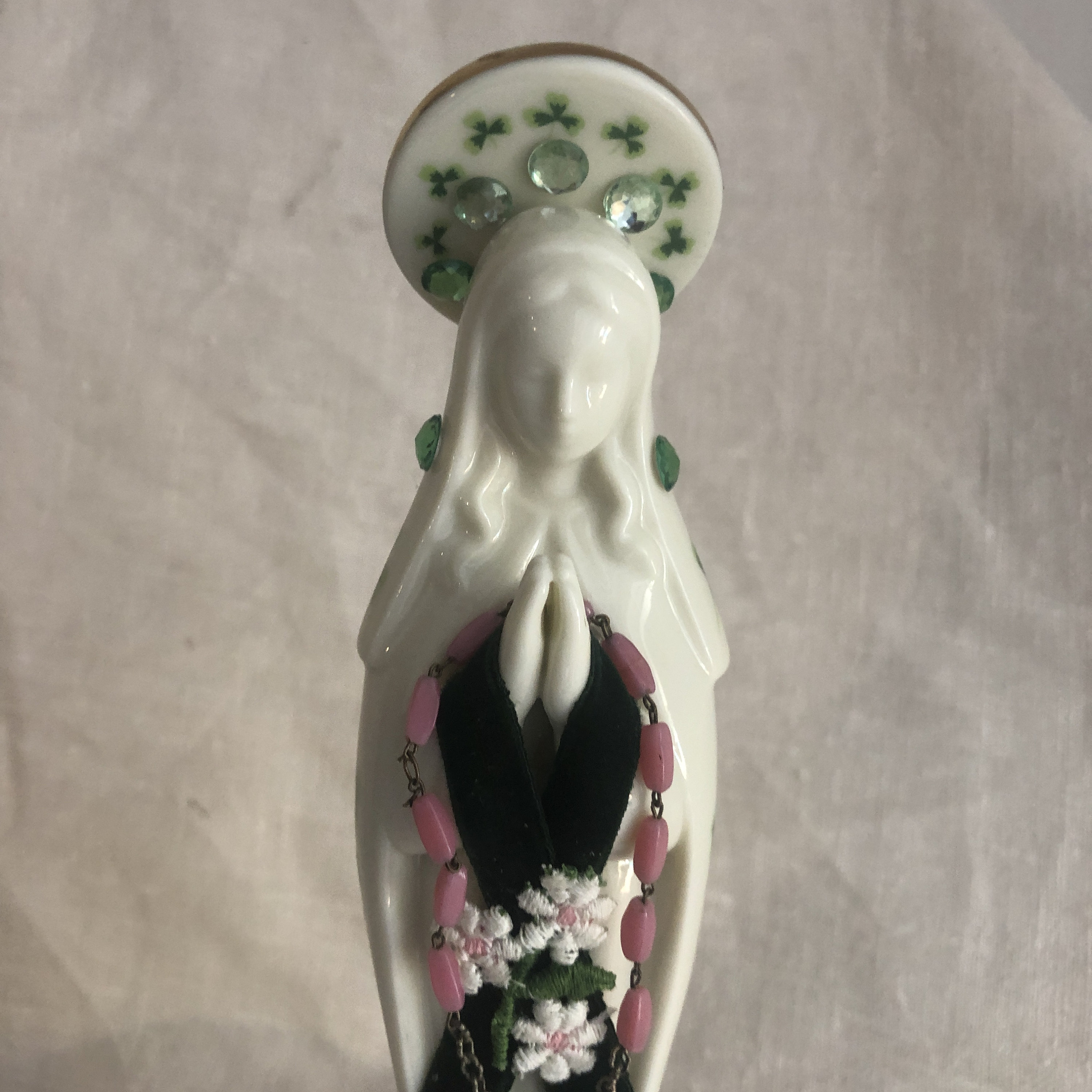 This piece is a vintage ceramic statue with a print of green shamrocks on the ceramic and an Artistic Style of Green Velvet, Assoorted Small Green Stones and a Daisy Appliqe .. Pink Rosary Beads with a small metal vintage medallion. Beads are glued in place . Halo has assorted green stones and at back a cross in dark green velvet and a pink heart stone.