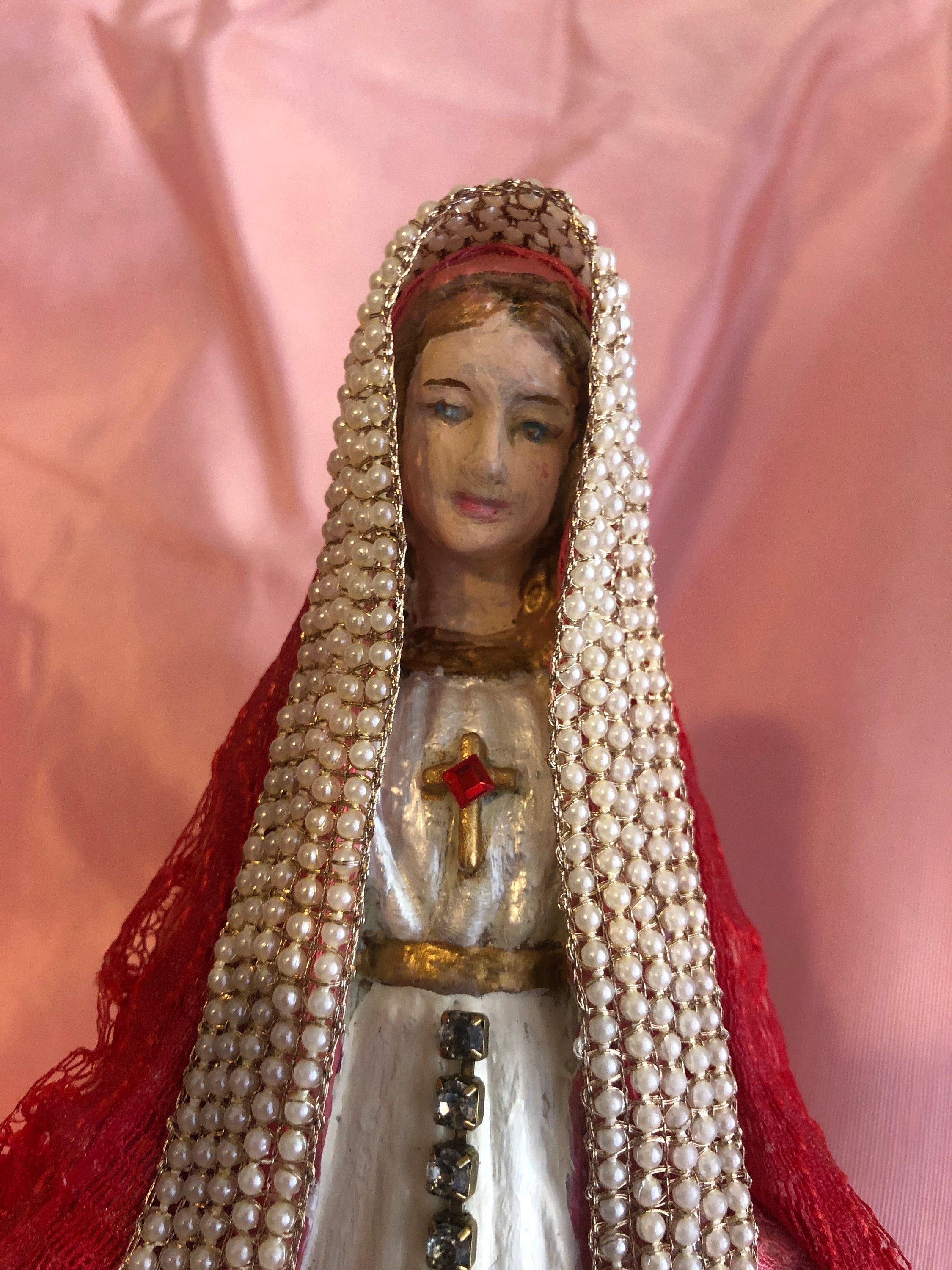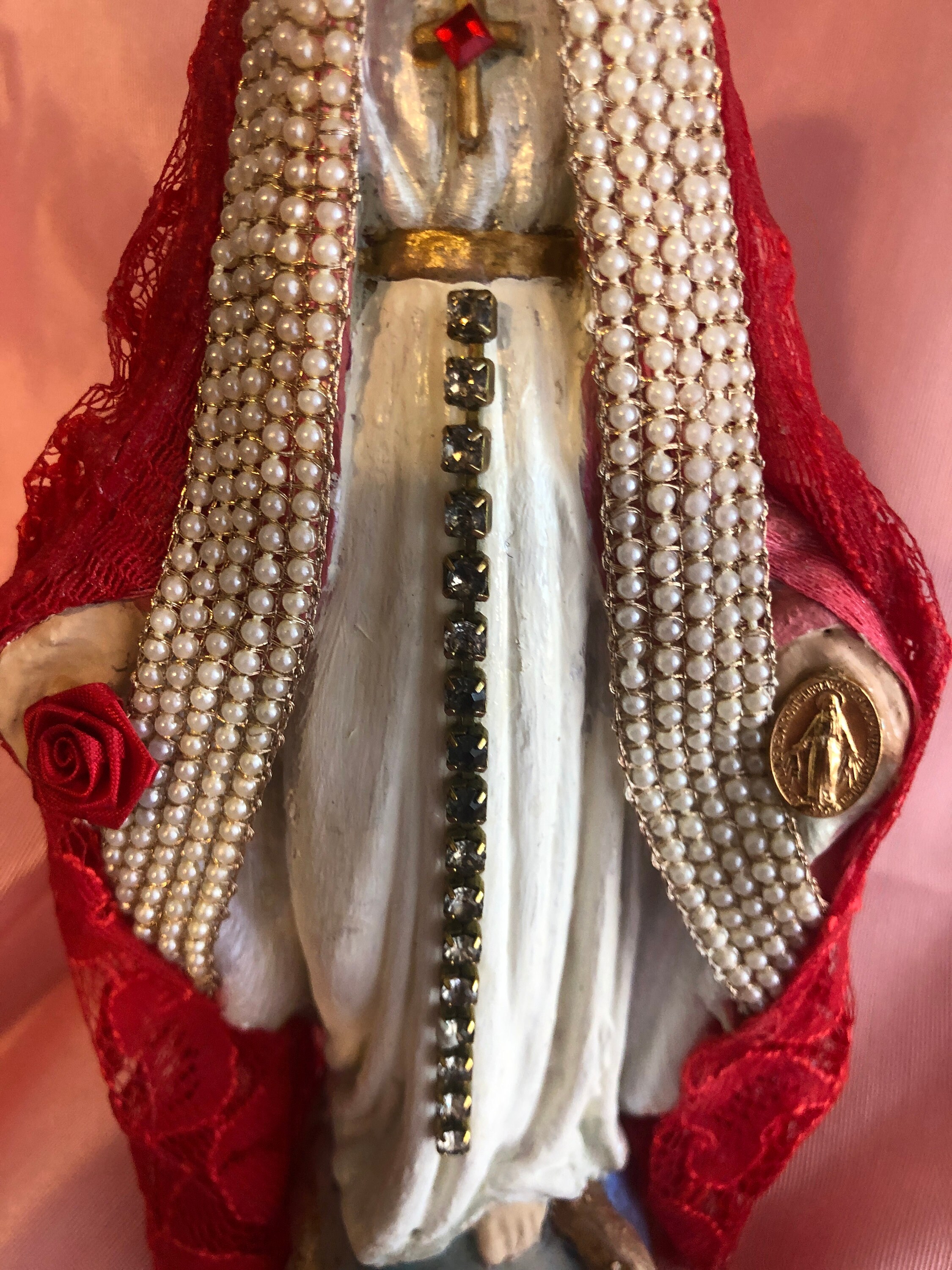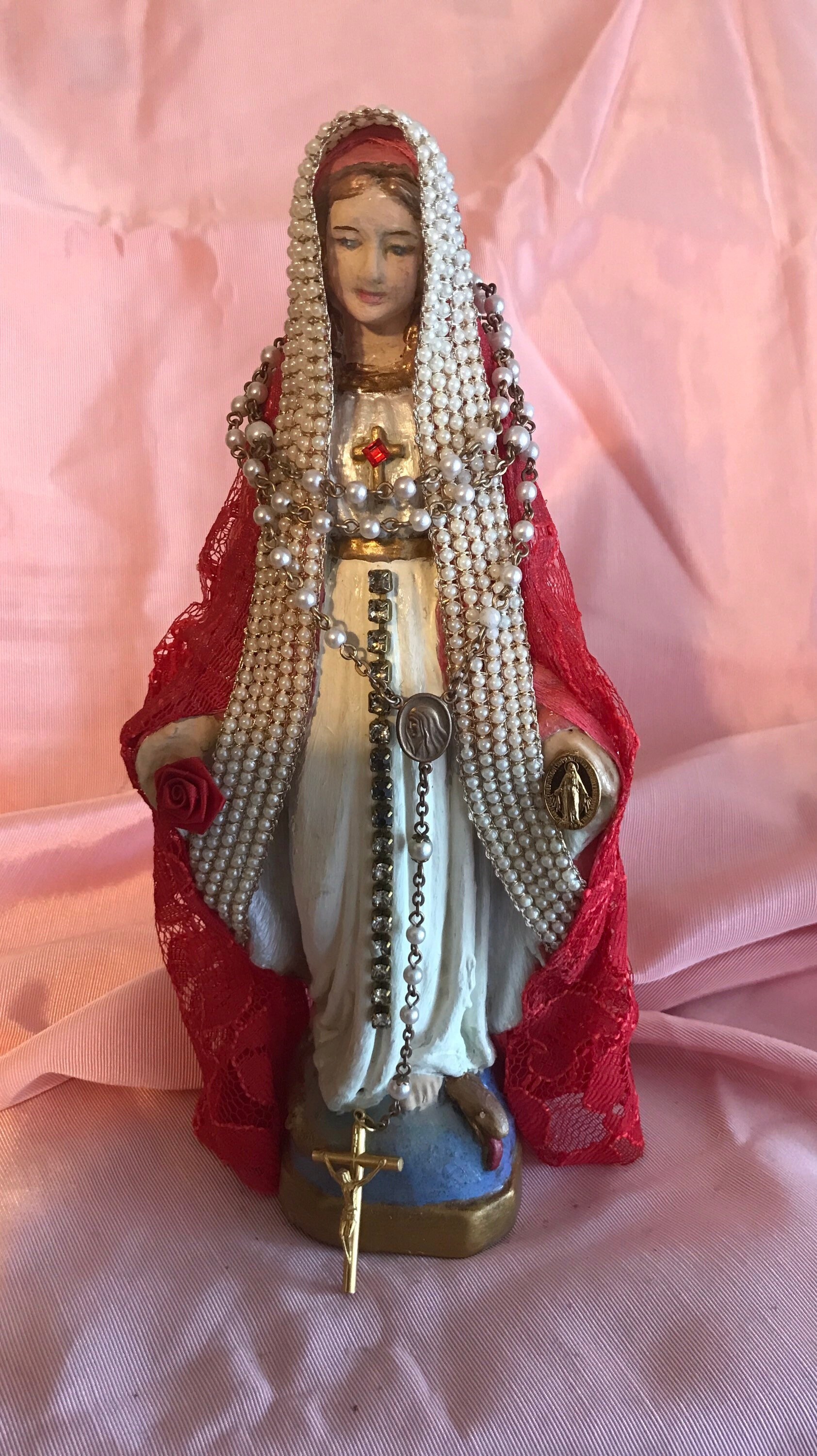 Artistic Style in colors White and White Pearl on Dress with Gold Accent paint. Rhinestones down front of the skirt. Red Lace and Faux Pearl Trim with small red silk flower and a goldtone oval Madonna medal in the other hand. . White Pearl Rosary Beads wth Brass tone Metal Crucifix from Italy. The Rosary has been wrapped 3 times around the statue. Sometimes w glue these in place but felt this Rosary was better just wrapped with the cross below the base and you can set the cross once in your home