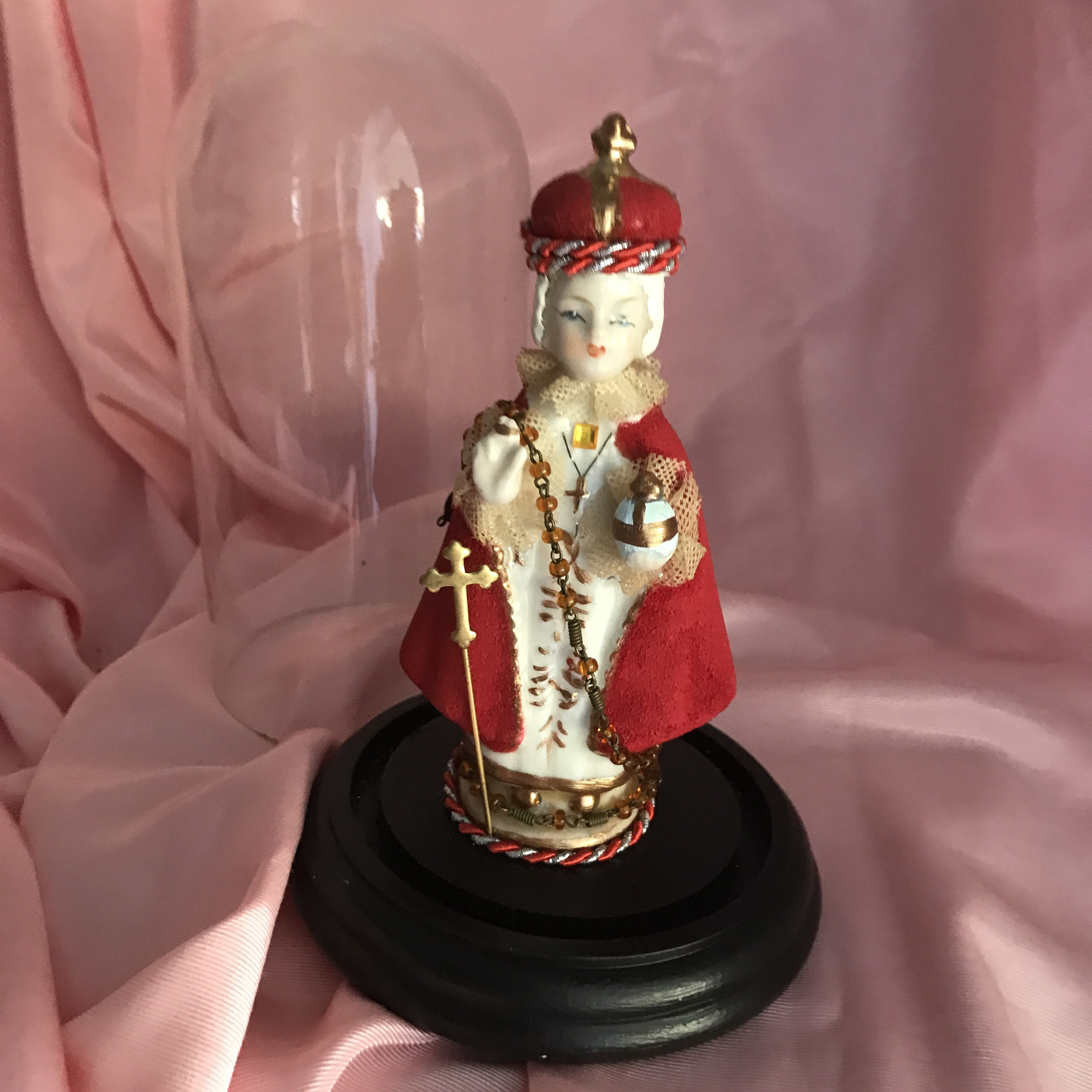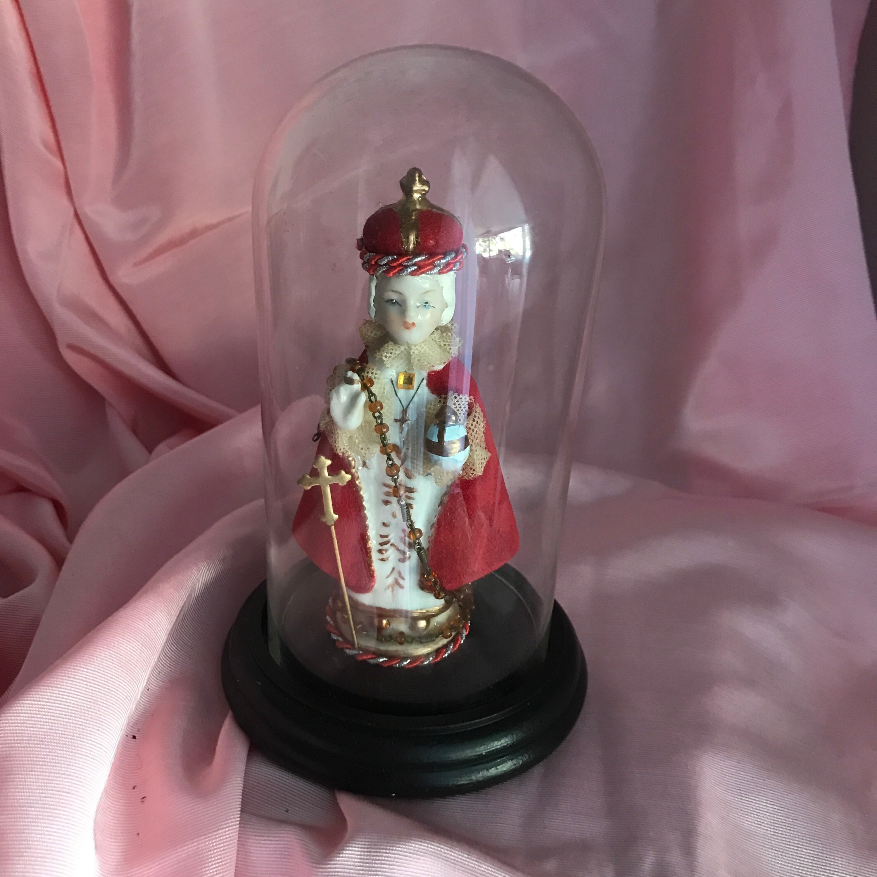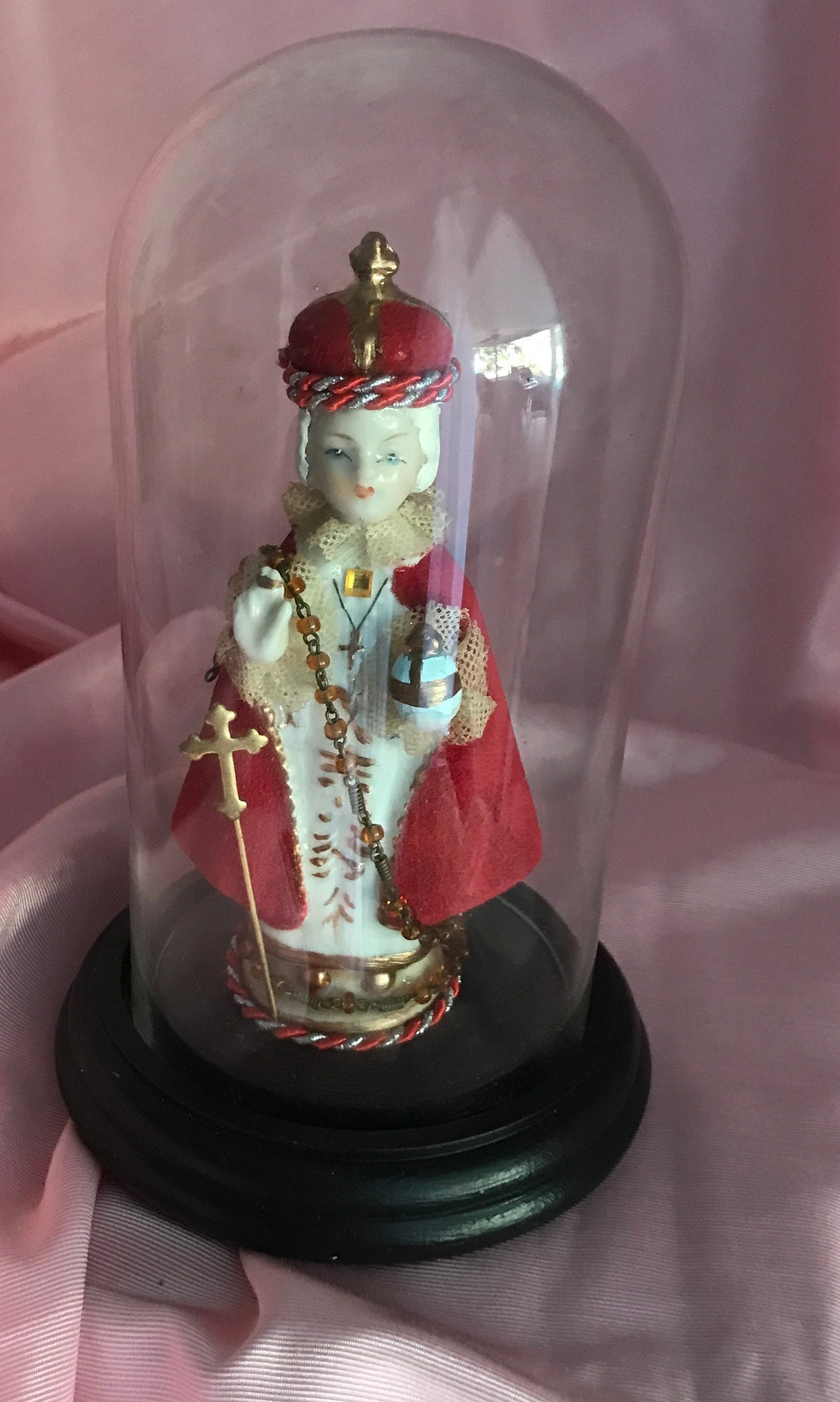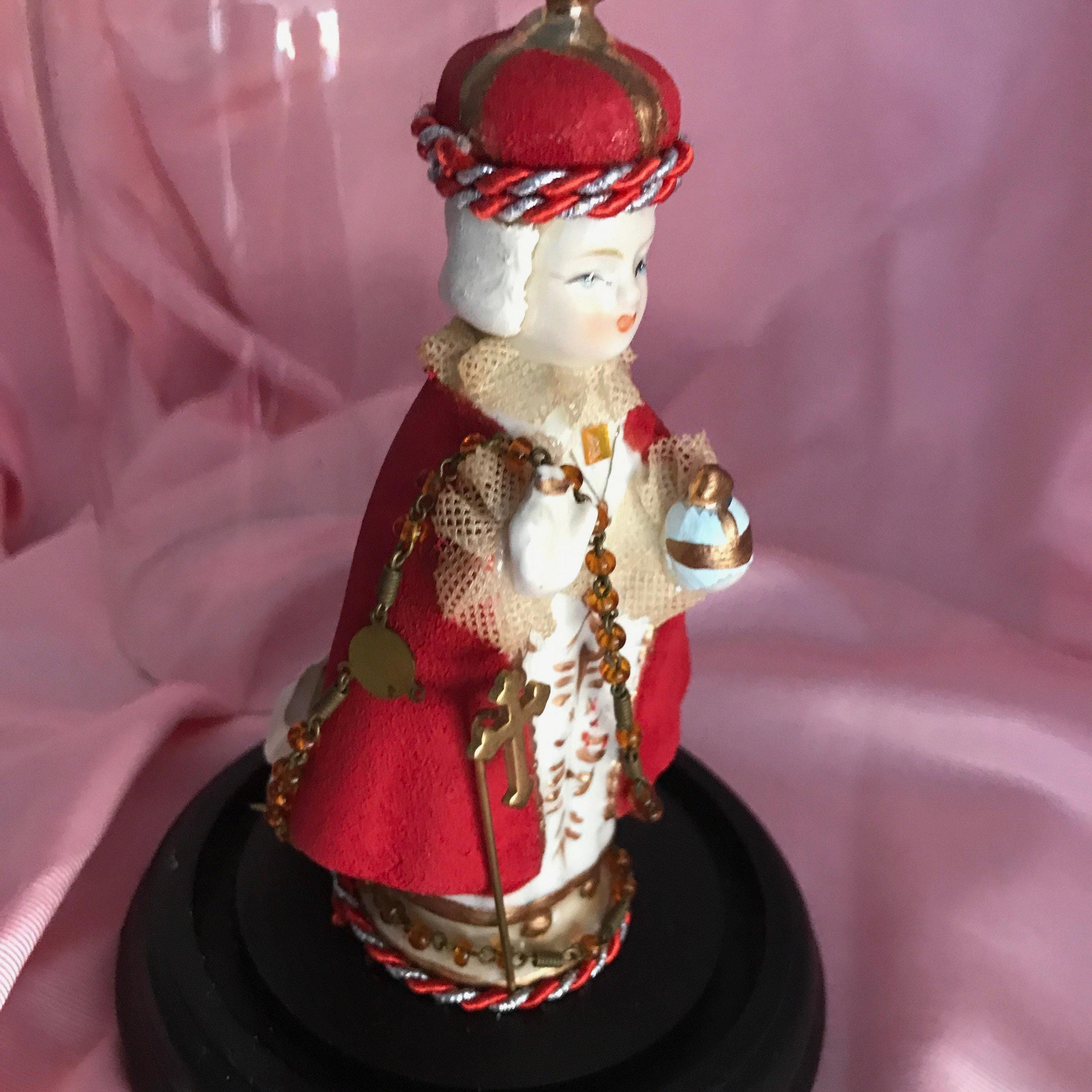 Devotional Art Statue by 2nd Hand Revival Art Studio One of a Kind - Handmade and Unique !! 2nd Hand Revival takes old vintage religious statues that have had prior age , use or damage and turns each piece into a unique piece of art ! Infant of Prague is a Ceramic Material This piece is about 50 years old .. He came to us with all his red coloring missing from his cloak and crown . We repainted and gave him beautiful white hair and painted face. Gold Trim repainted. Ribbon Trim of red and silver thin rope with vintage rosary bead and goldtone metal stick pin added at front. Back has a small embossed cross and a white fabric flower at base. See photos for details Glass Dome fits nicely in the wood base and Infant of Prague is secured with a screw into the wood base Approximately Measures: 7.25" to top of the dome and wood base about 4" wide across Signed on Bottom in Gold : DavKat 2022 2nd Hand Revival This is a beautiful Little Piece of Art !!! Thanks for Looking