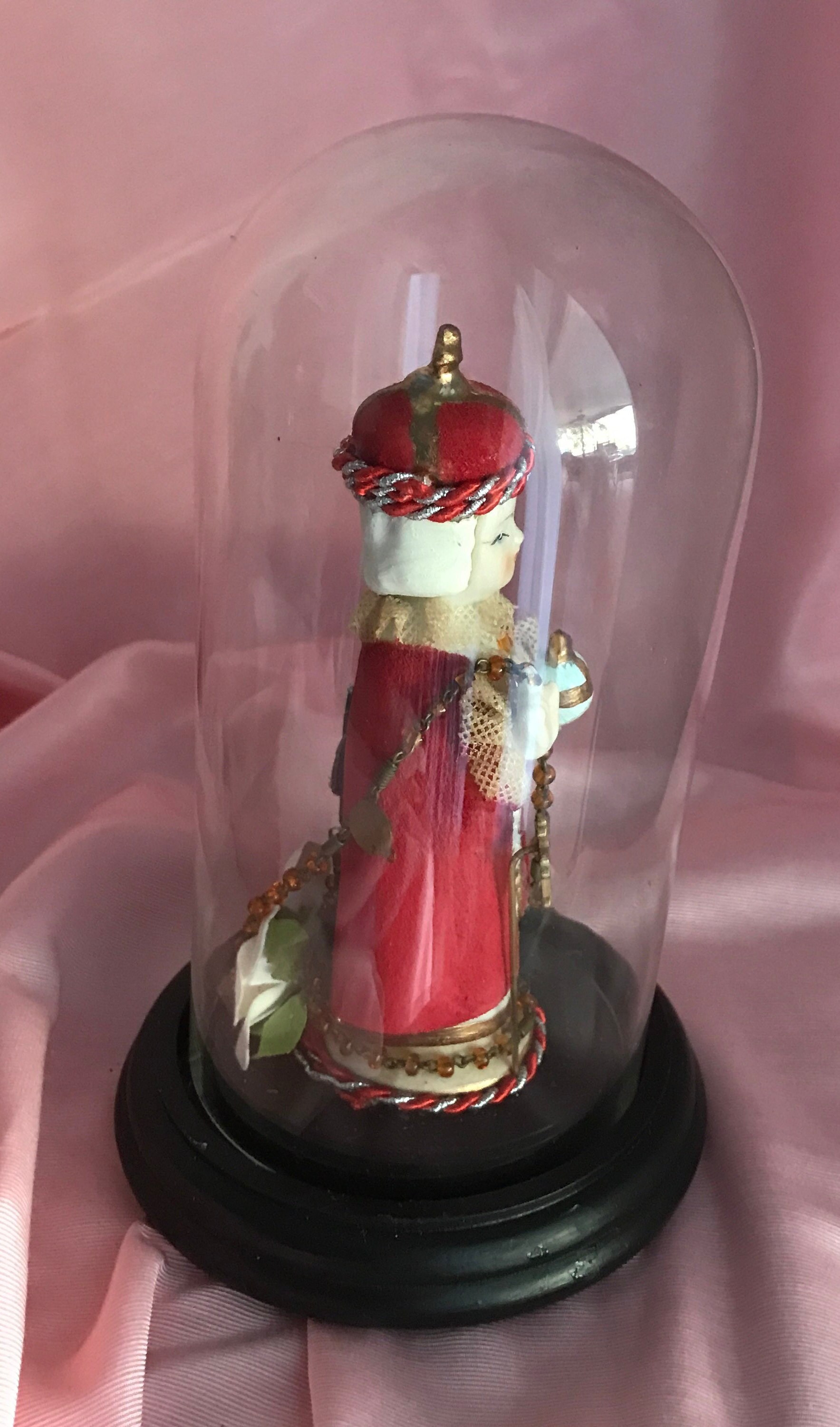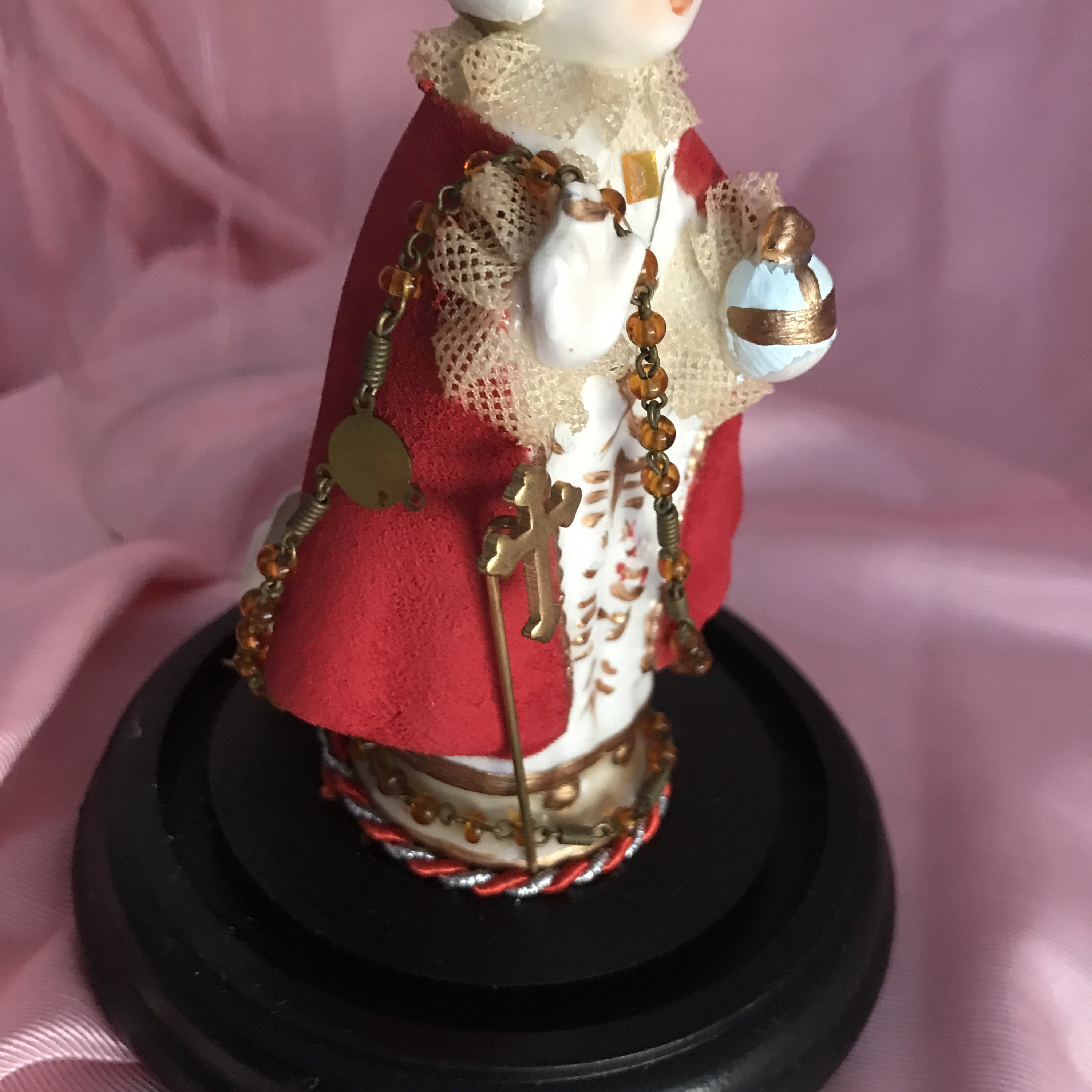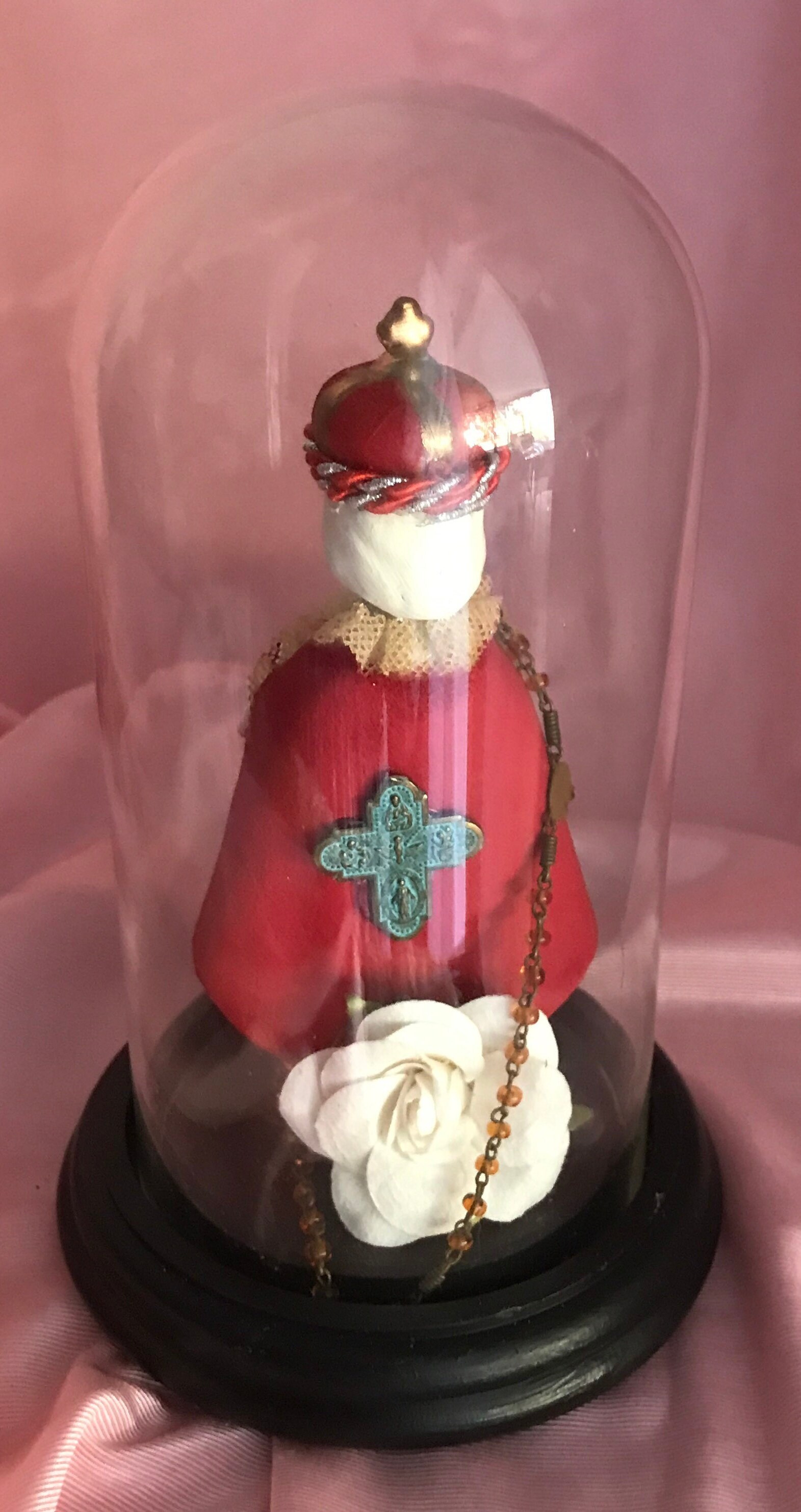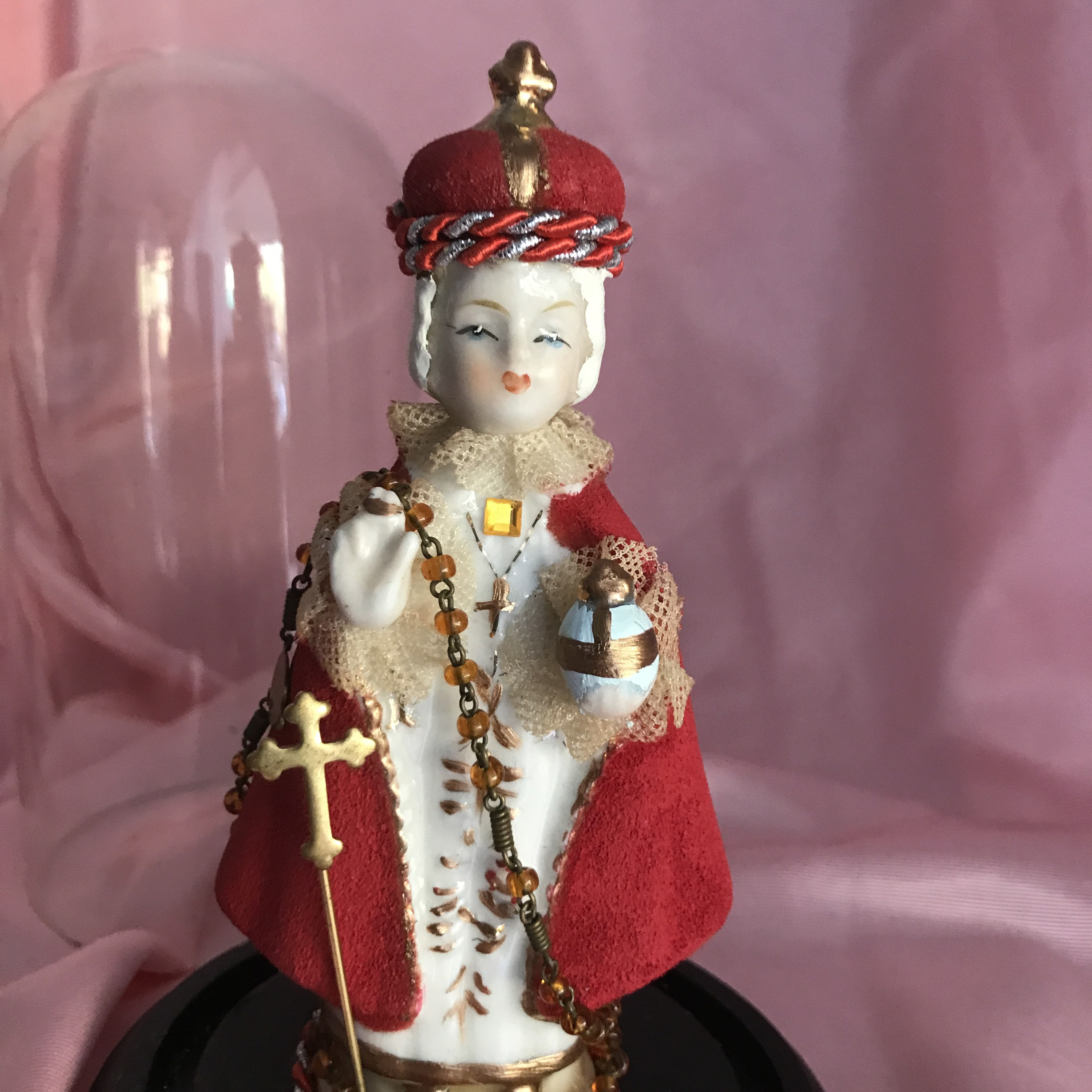 Devotional Art Statue by 2nd Hand Revival Art Studio One of a Kind - Handmade and Unique !! 2nd Hand Revival takes old vintage religious statues that have had prior age , use or damage and turns each piece into a unique piece of art ! Infant of Prague is a Ceramic Material This piece is about 50 years old .. He came to us with all his red coloring missing from his cloak and crown . We repainted and gave him beautiful white hair and painted face. Gold Trim repainted. Ribbon Trim of red and silver thin rope with vintage rosary bead and goldtone metal stick pin added at front. Back has a small embossed cross and a white fabric flower at base. See photos for details Glass Dome fits nicely in the wood base and Infant of Prague is secured with a screw into the wood base Approximately Measures: 7.25" to top of the dome and wood base about 4" wide across Signed on Bottom in Gold : DavKat 2022 2nd Hand Revival This is a beautiful Little Piece of Art !!! Thanks for Looking
