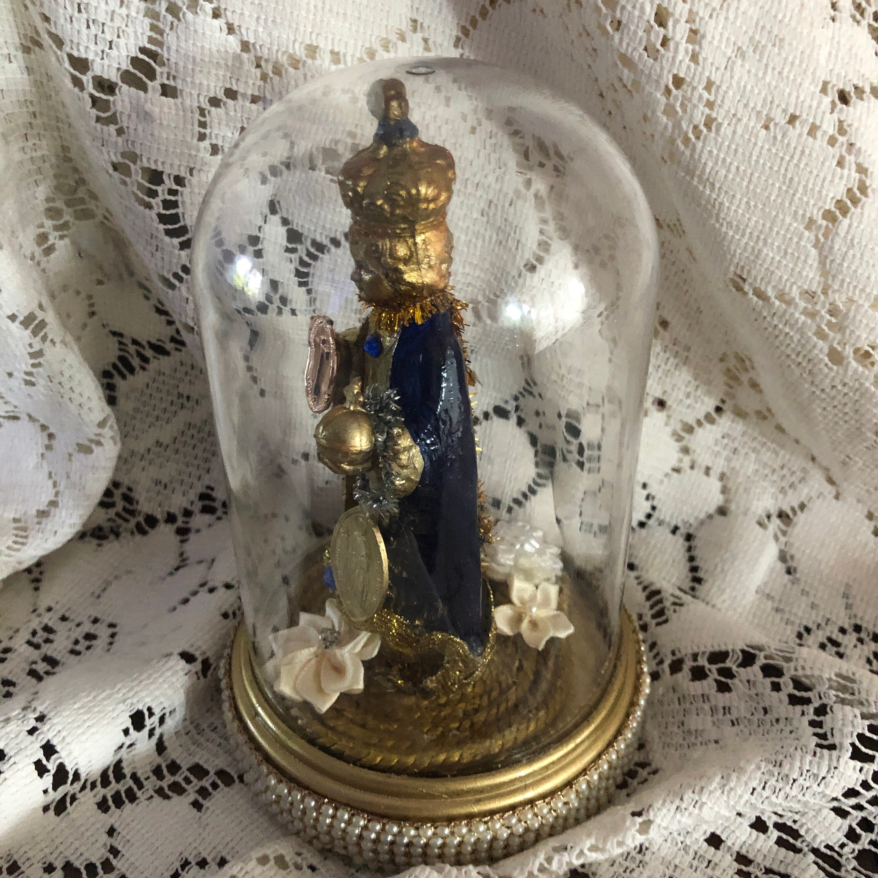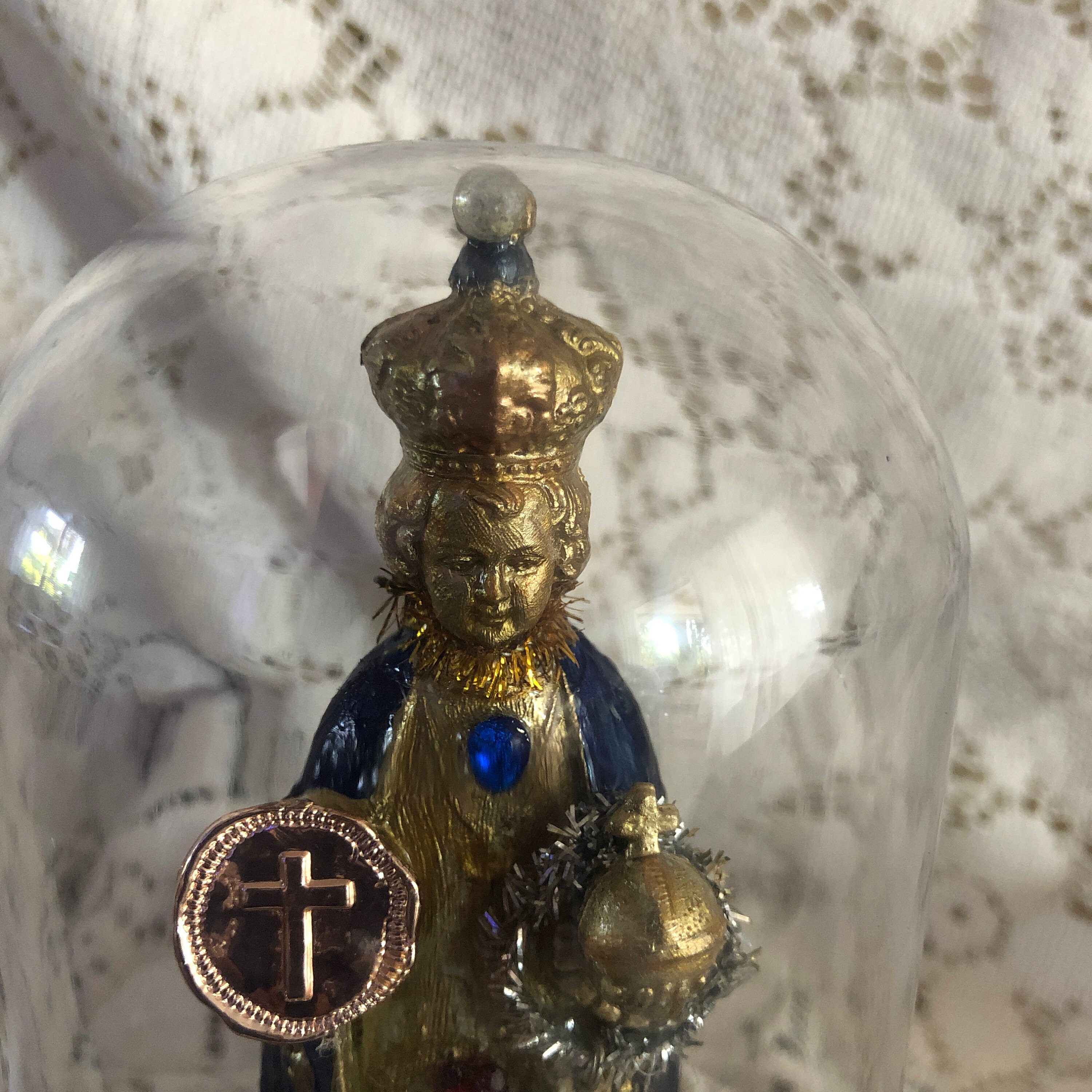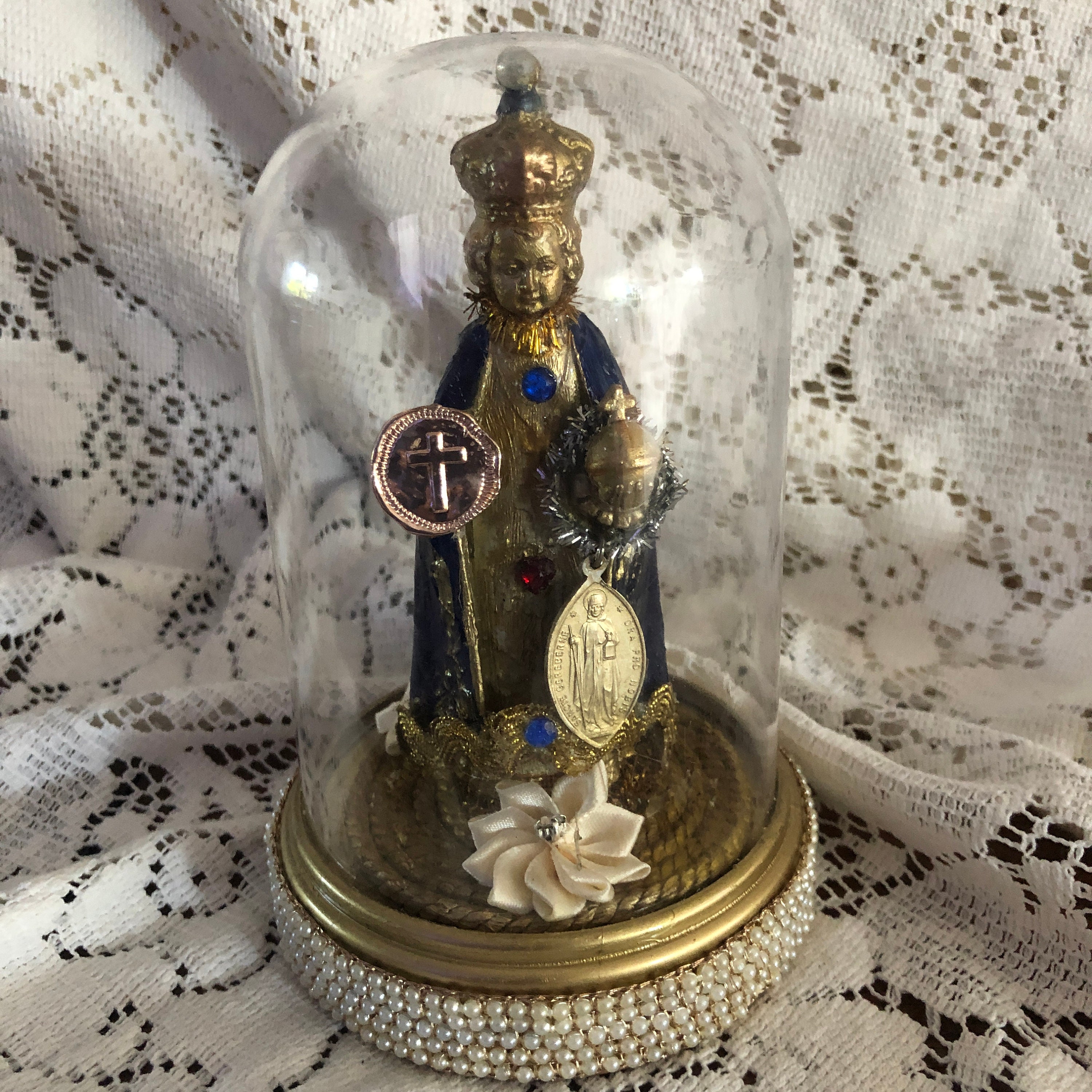 This piece came to us with no colors or adornments . We Hand painted Infant in Blue and Gold with glossy finish and gold paint details Gold paint highlites in the hair - Face is a light gold paint as well as the embossed crown We added our personal touch of iconic embellishments and stones as well as a small red ruby colored heart at front, Infant holds a vintage meda in one hand - painted medal, A Goldtone Metal Embossed Cross Disc in the other . Vintage trims - and sparkly dark gold cross at back . Vintage Gold Trim trim at the Base with some Small silk flowers at back of the Infant. Statue is vintage plastic and is held in place with the plastic clear dome that is not removable . Dome and Base is Plastic and trimmed in a faux pearl trim.