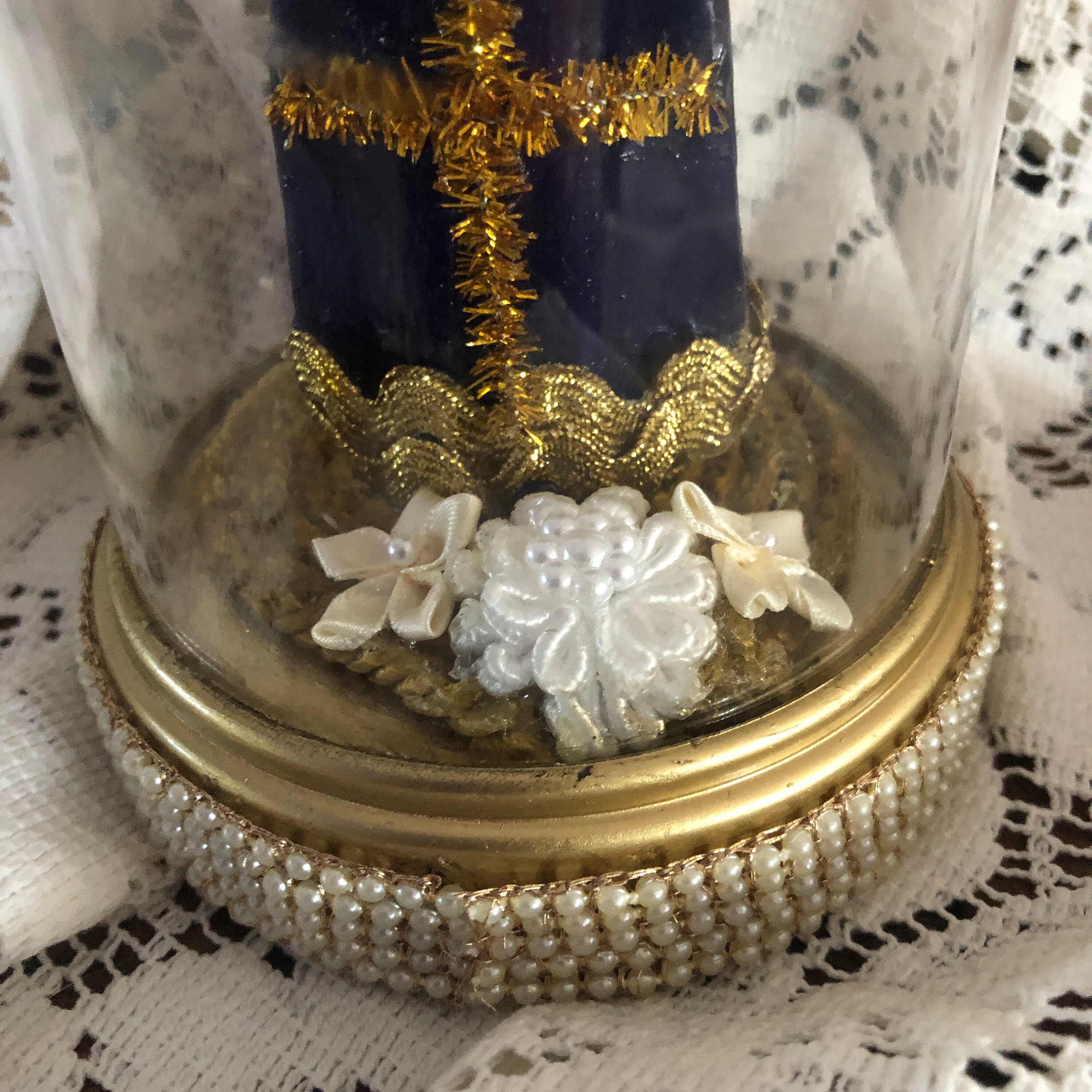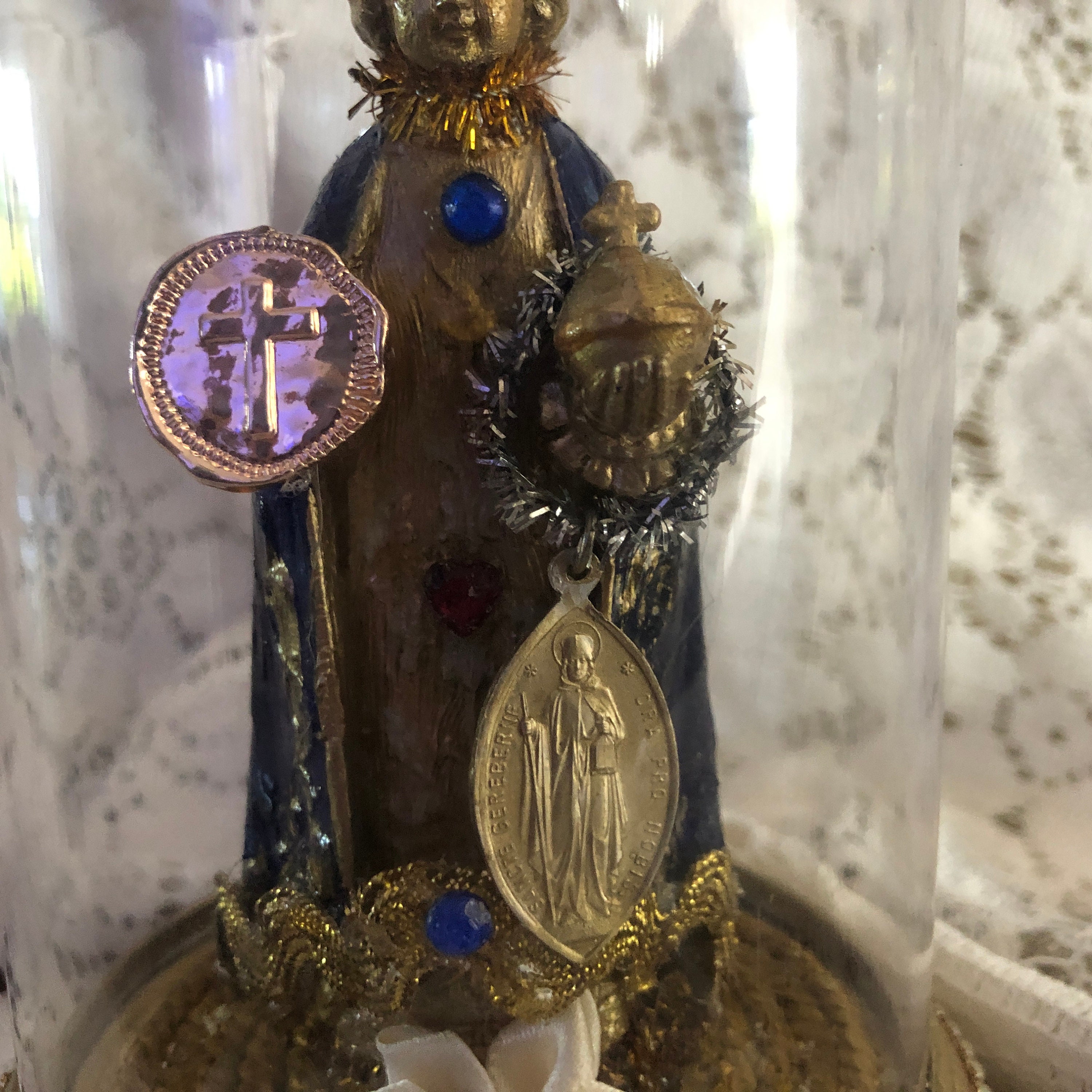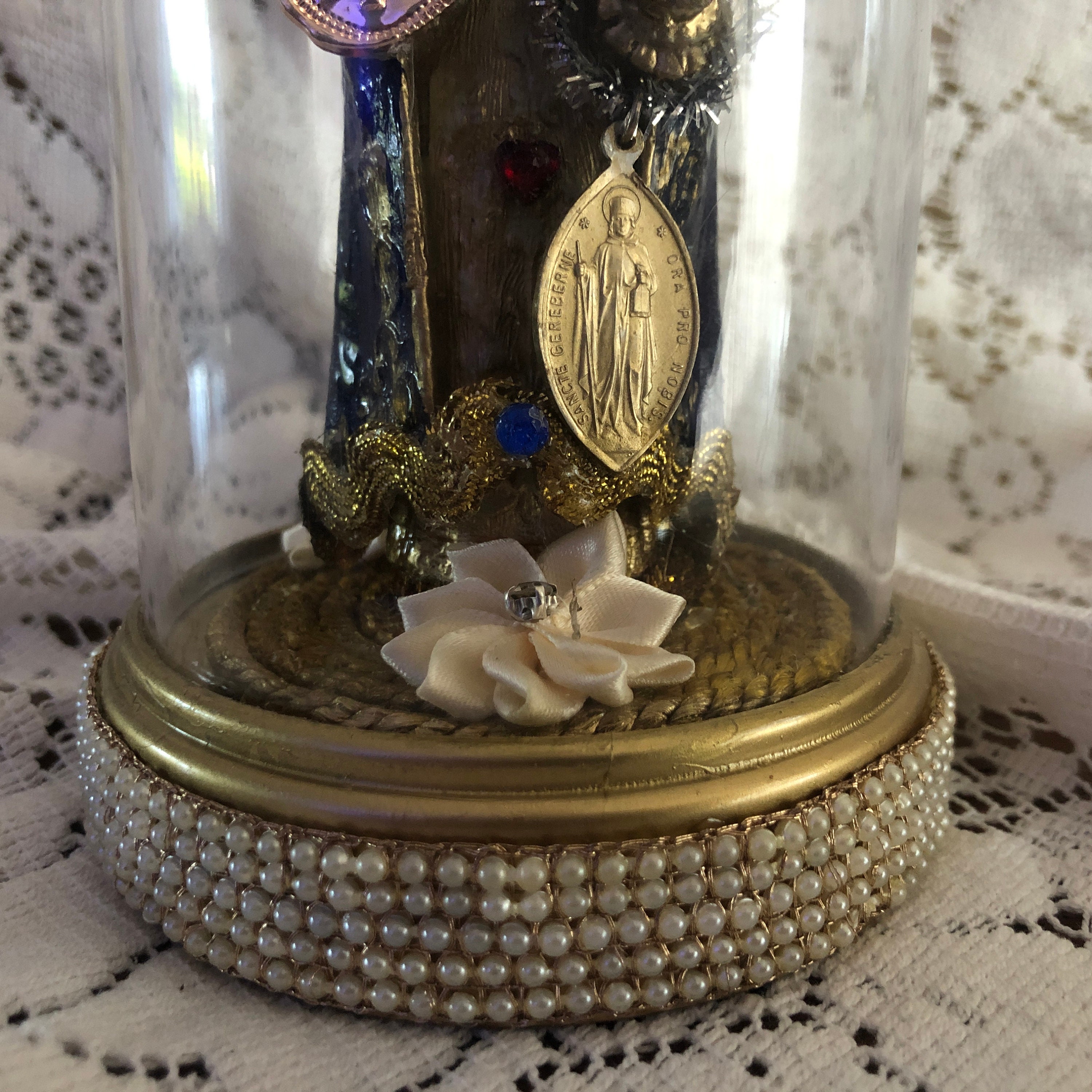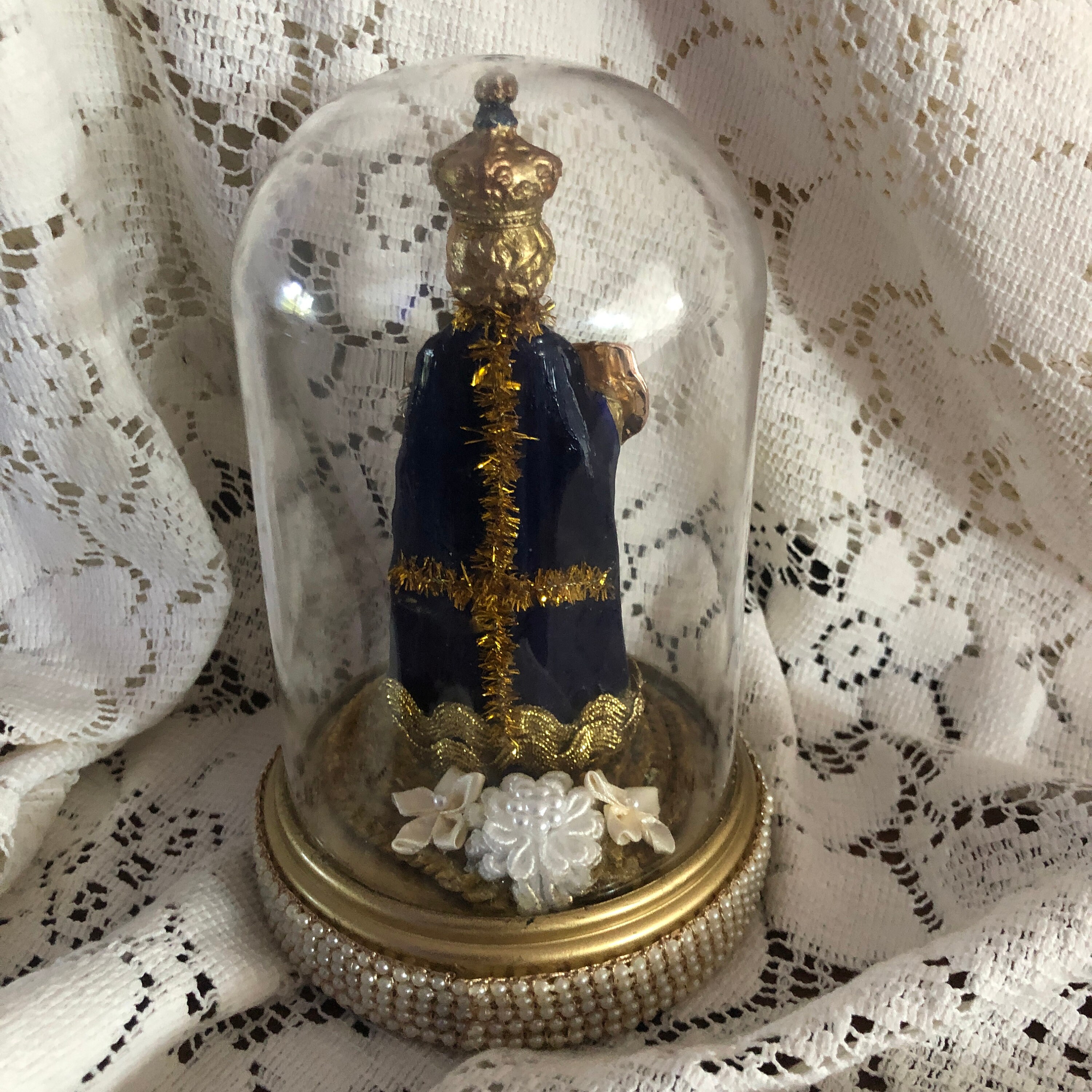 This piece came to us with no colors or adornments . We Hand painted Infant in Blue and Gold with glossy finish and gold paint details Gold paint highlites in the hair - Face is a light gold paint as well as the embossed crown We added our personal touch of iconic embellishments and stones as well as a small red ruby colored heart at front, Infant holds a vintage meda in one hand - painted medal, A Goldtone Metal Embossed Cross Disc in the other . Vintage trims - and sparkly dark gold cross at back . Vintage Gold Trim trim at the Base with some Small silk flowers at back of the Infant. Statue is vintage plastic and is held in place with the plastic clear dome that is not removable . Dome and Base is Plastic and trimmed in a faux pearl trim.