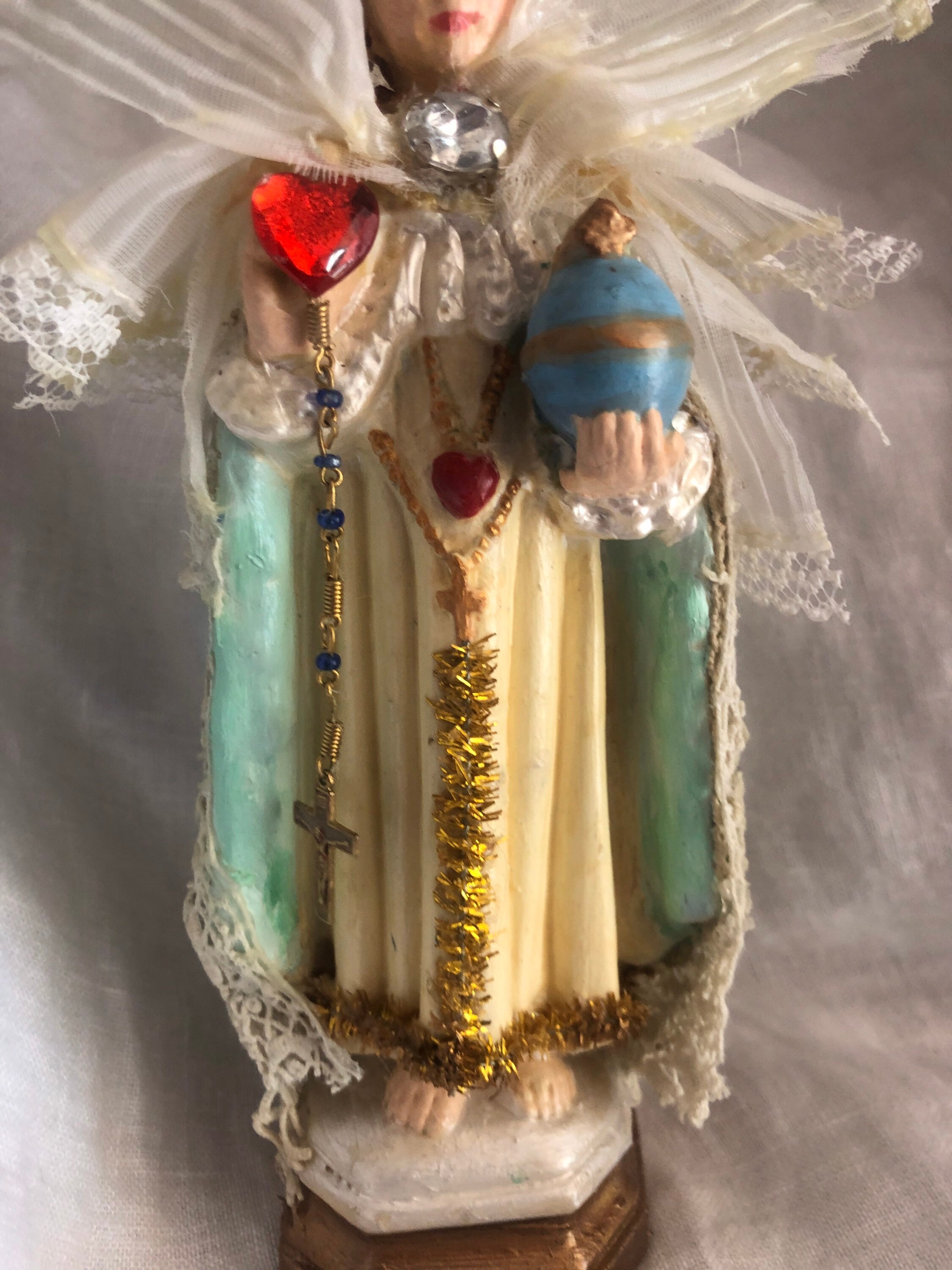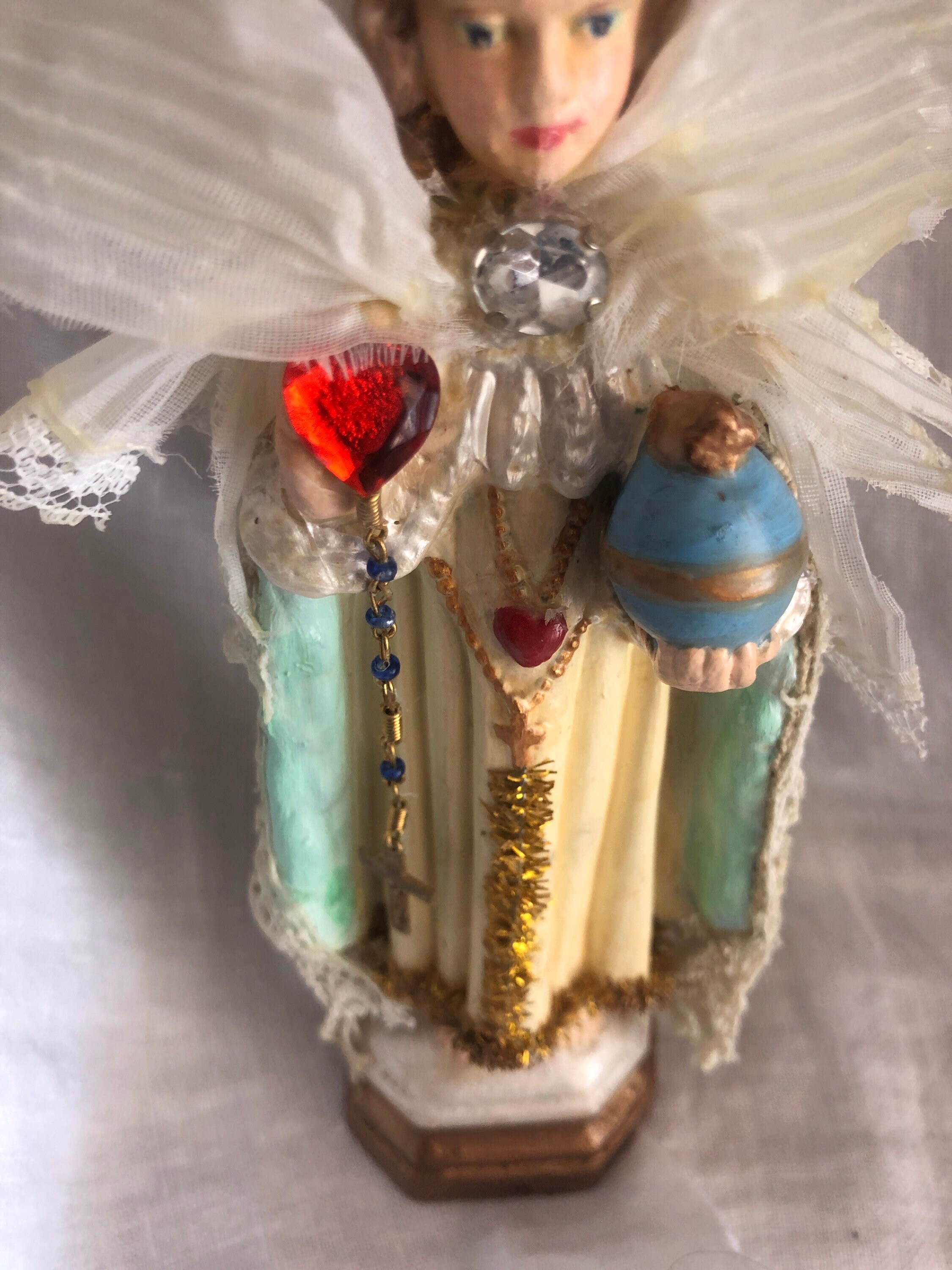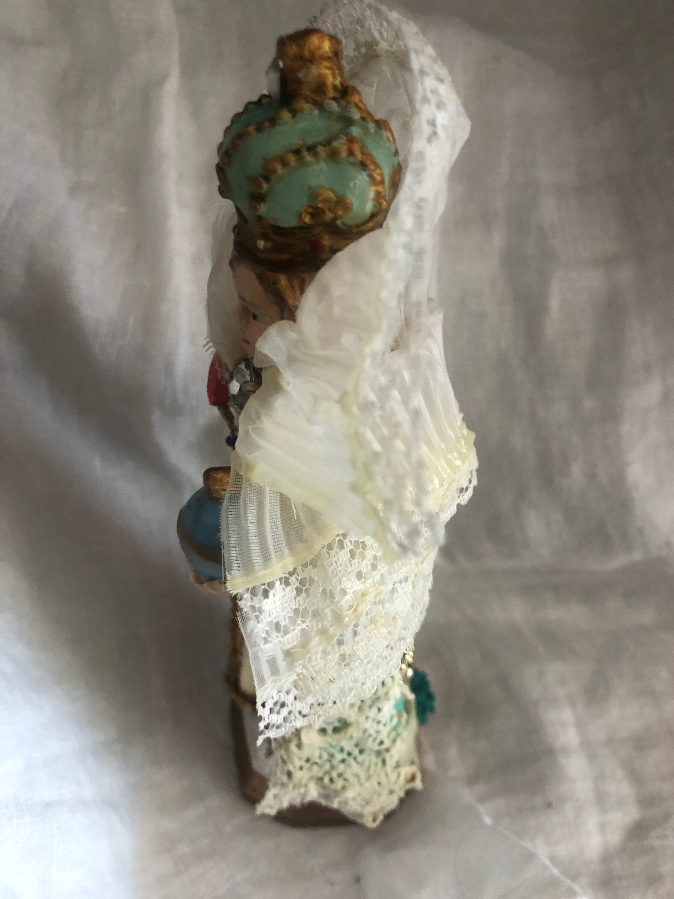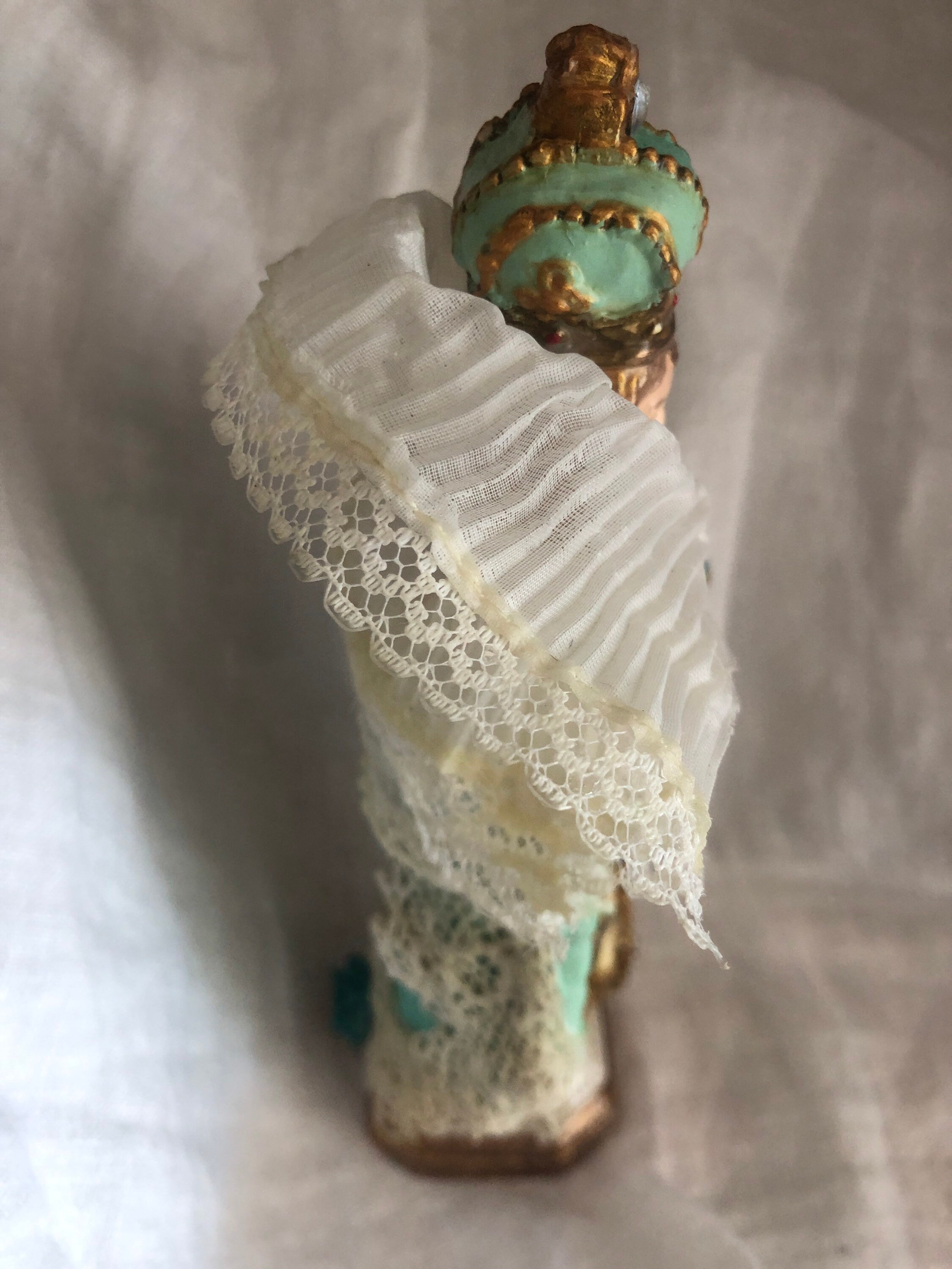 This piece came to us with hardly any paint and nics and scrapes and no face paint. We painted in a light sea green and off white colors.. meticulously painted details on the face and body - overglaze of a semi gloss patina. The 4 tier collar is pleated with lace trim . The color is semi stiff as we added an antique color glaze to give the collar some support to stand in place. We added our personal touch of iconic embellishments , This piece holds a faceted red heart , a faceted clear stone at the center front of the collar and an antique small brass embossed crucifix and blue small beads, lots of vintage laces and some gold trims to accent this piece. Hand Painted Details on the crown Lots of Antique Fabric trims of in various styles .. .. See photos Back has a cross style of small bead and clear rhinestones. Blue Resin Flower at back bottom and the antique lace trim is held in place Face has been repainted - - Gold paint highlites in the hair. Approximately Measures 8" Tall to top of the crown - Base is about 2" Wide bottom is signed 2nd Hand Revival Art Studio by DavKat 2022 see photos for details - handmade art