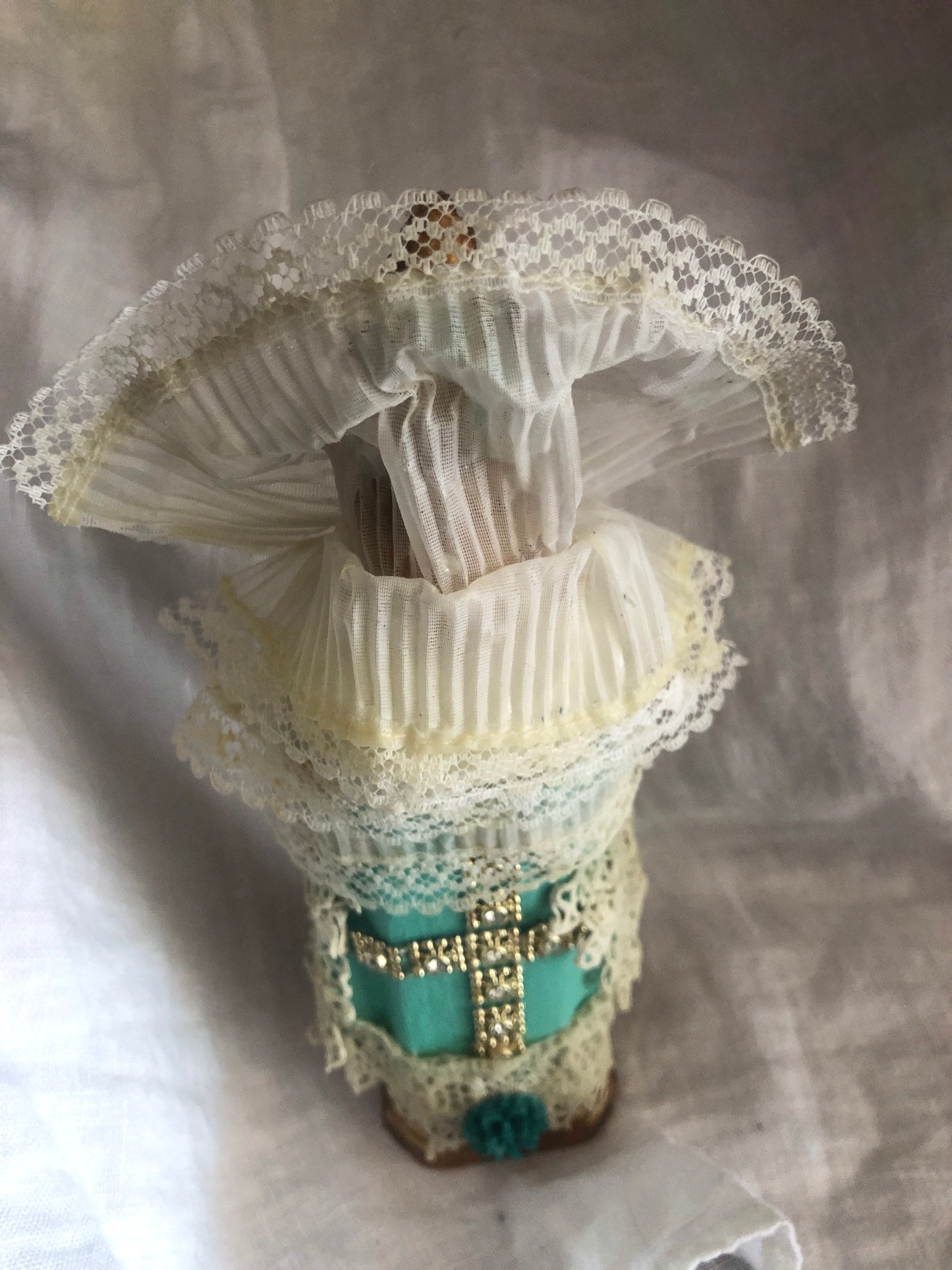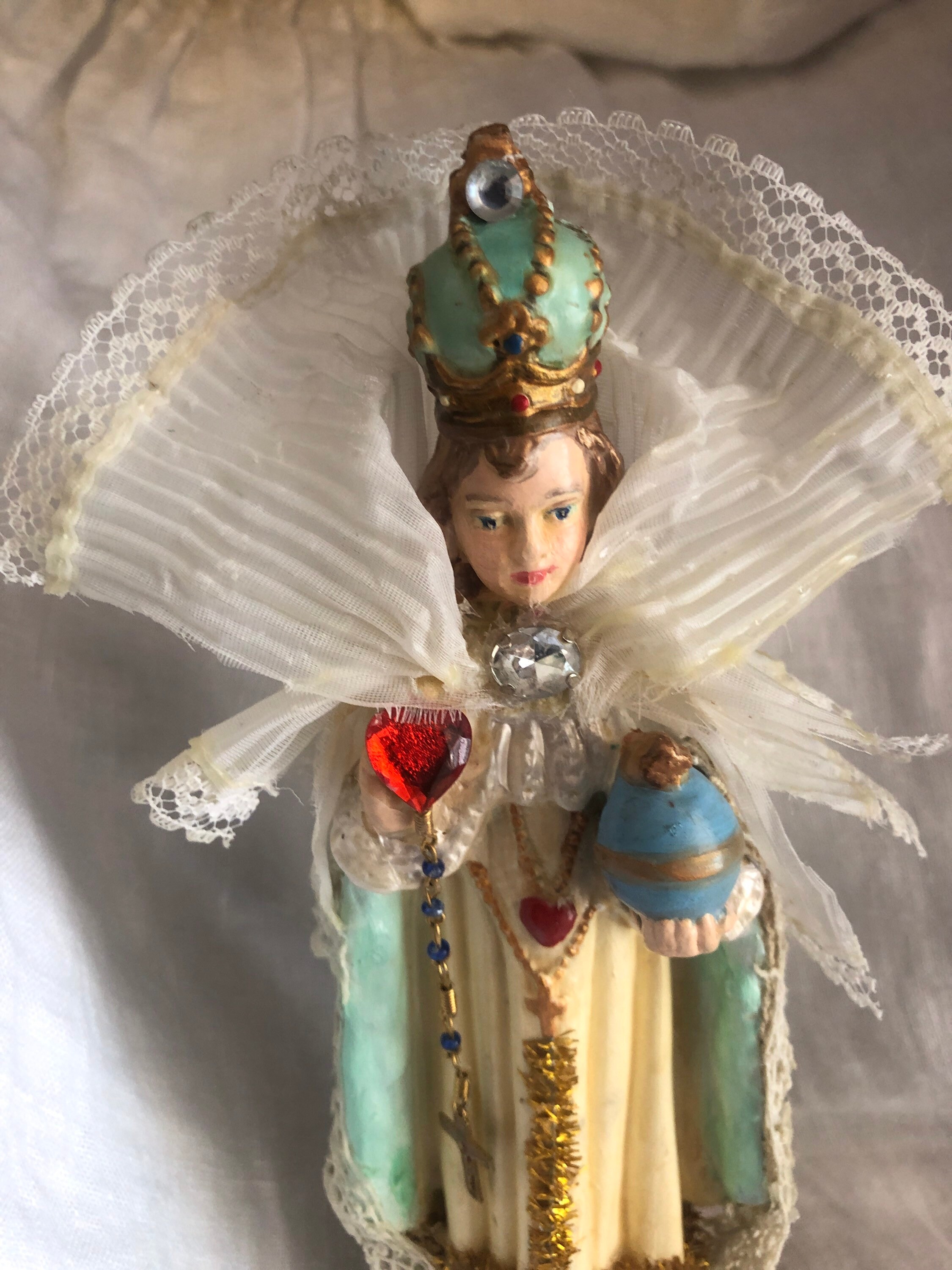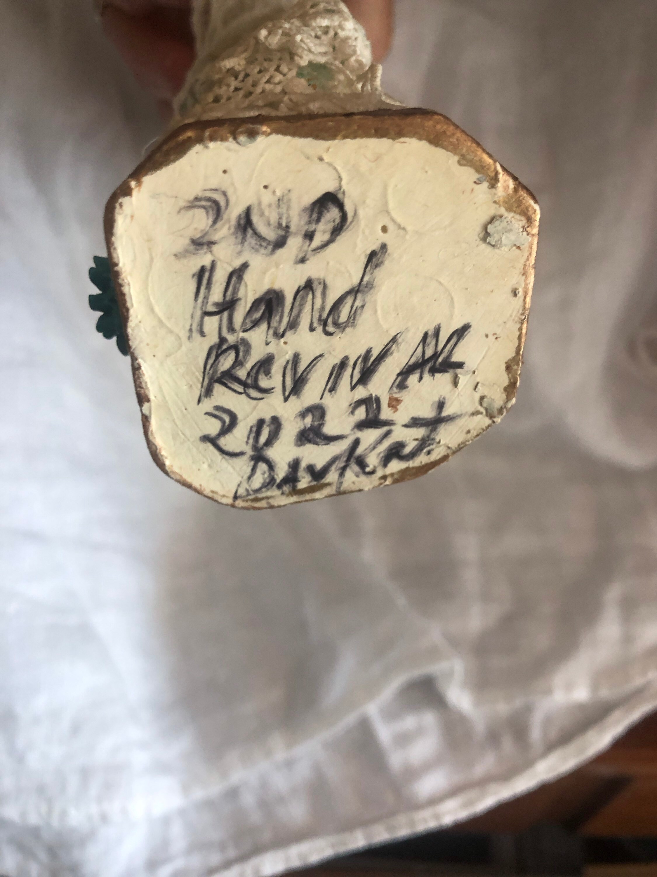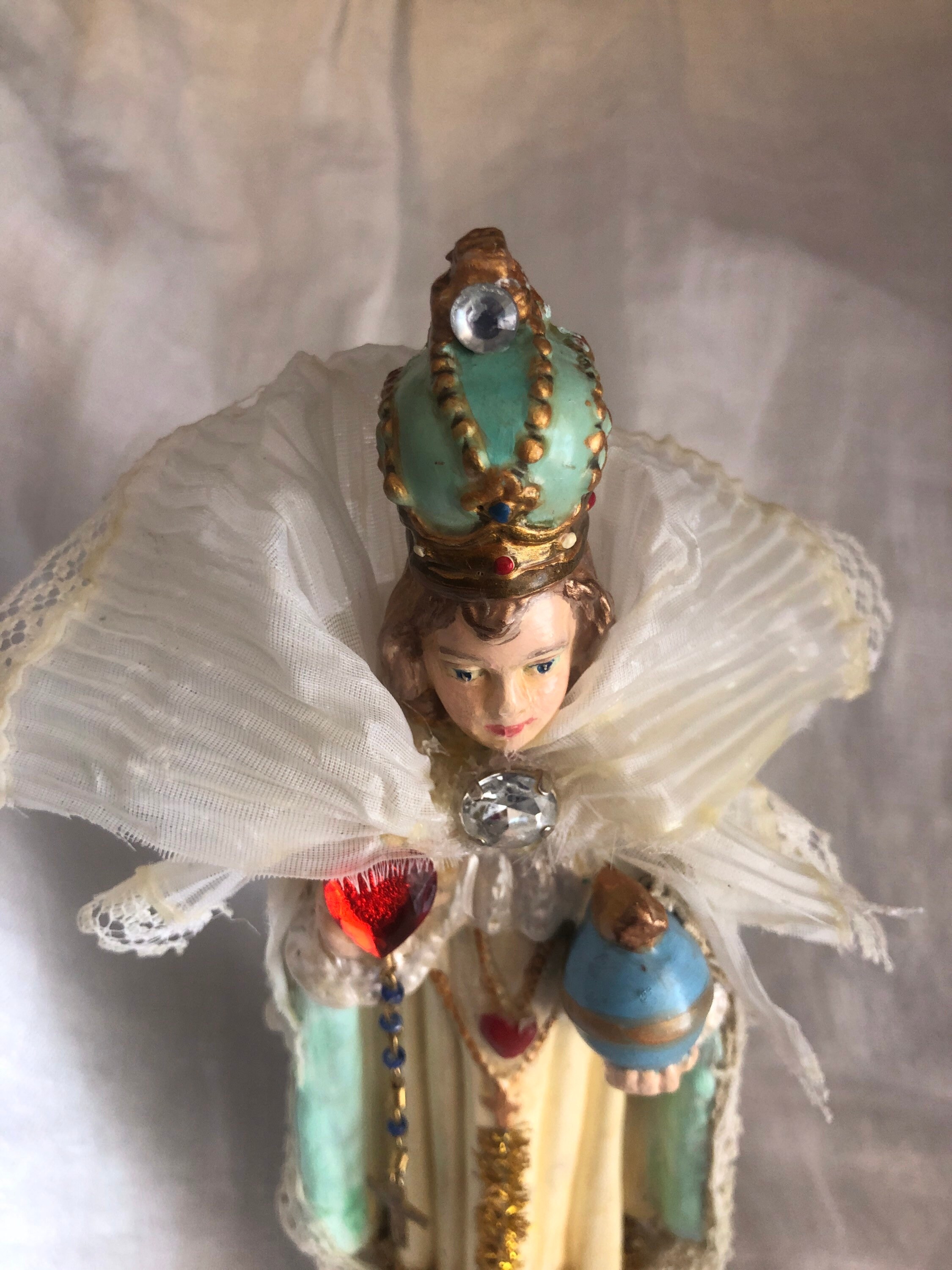 This piece came to us with hardly any paint and nics and scrapes and no face paint. We painted in a light sea green and off white colors.. meticulously painted details on the face and body - overglaze of a semi gloss patina. The 4 tier collar is pleated with lace trim . The color is semi stiff as we added an antique color glaze to give the collar some support to stand in place. We added our personal touch of iconic embellishments , This piece holds a faceted red heart , a faceted clear stone at the center front of the collar and an antique small brass embossed crucifix and blue small beads, lots of vintage laces and some gold trims to accent this piece. Hand Painted Details on the crown Lots of Antique Fabric trims of in various styles .. .. See photos Back has a cross style of small bead and clear rhinestones. Blue Resin Flower at back bottom and the antique lace trim is held in place Face has been repainted - - Gold paint highlites in the hair. Approximately Measures 8" Tall to top of the crown - Base is about 2" Wide bottom is signed 2nd Hand Revival Art Studio by DavKat 2022 see photos for details - handmade art