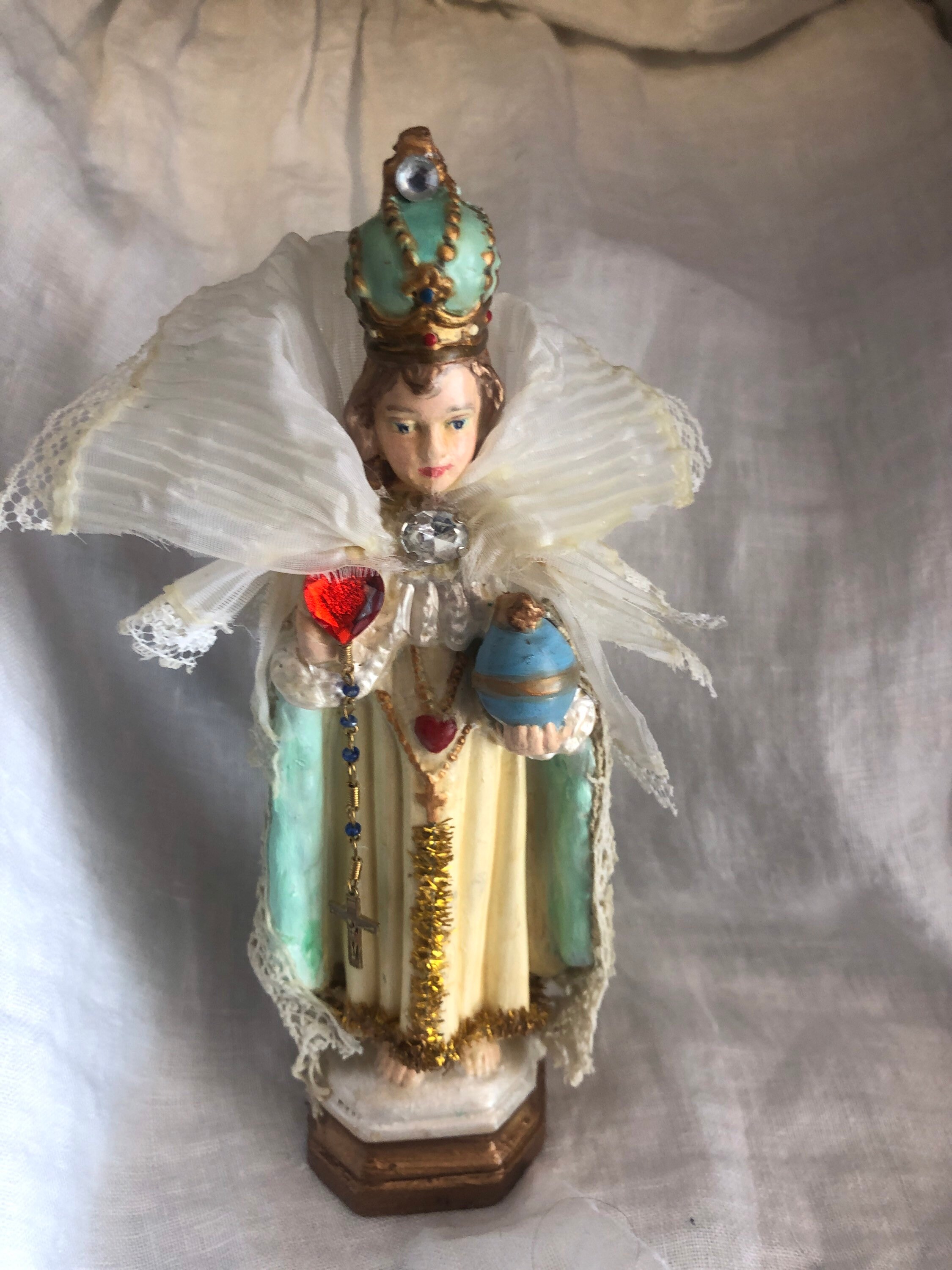 Infant of Prague Blue & Gold Devotional Art Statue by 2nd Hand Revival Art Gallery Devotional Art - One of a Kind !! 2nd Hand Revival takes old vintage religious statues that have had prior age use & discolor or damage and turns each piece into a unique piece of art ! We are 2nd Hand Revival as we bring back to life these beautiful old statues. Our pieces are not perfect and we don't want them to be perfect.