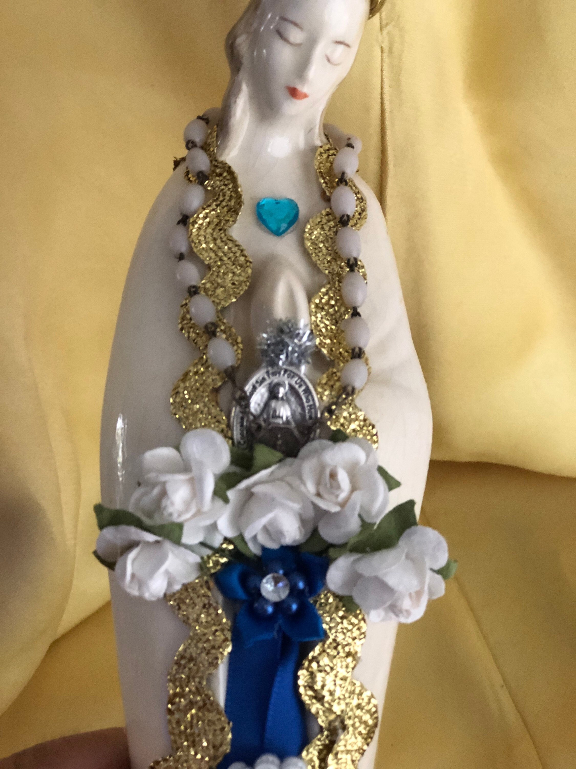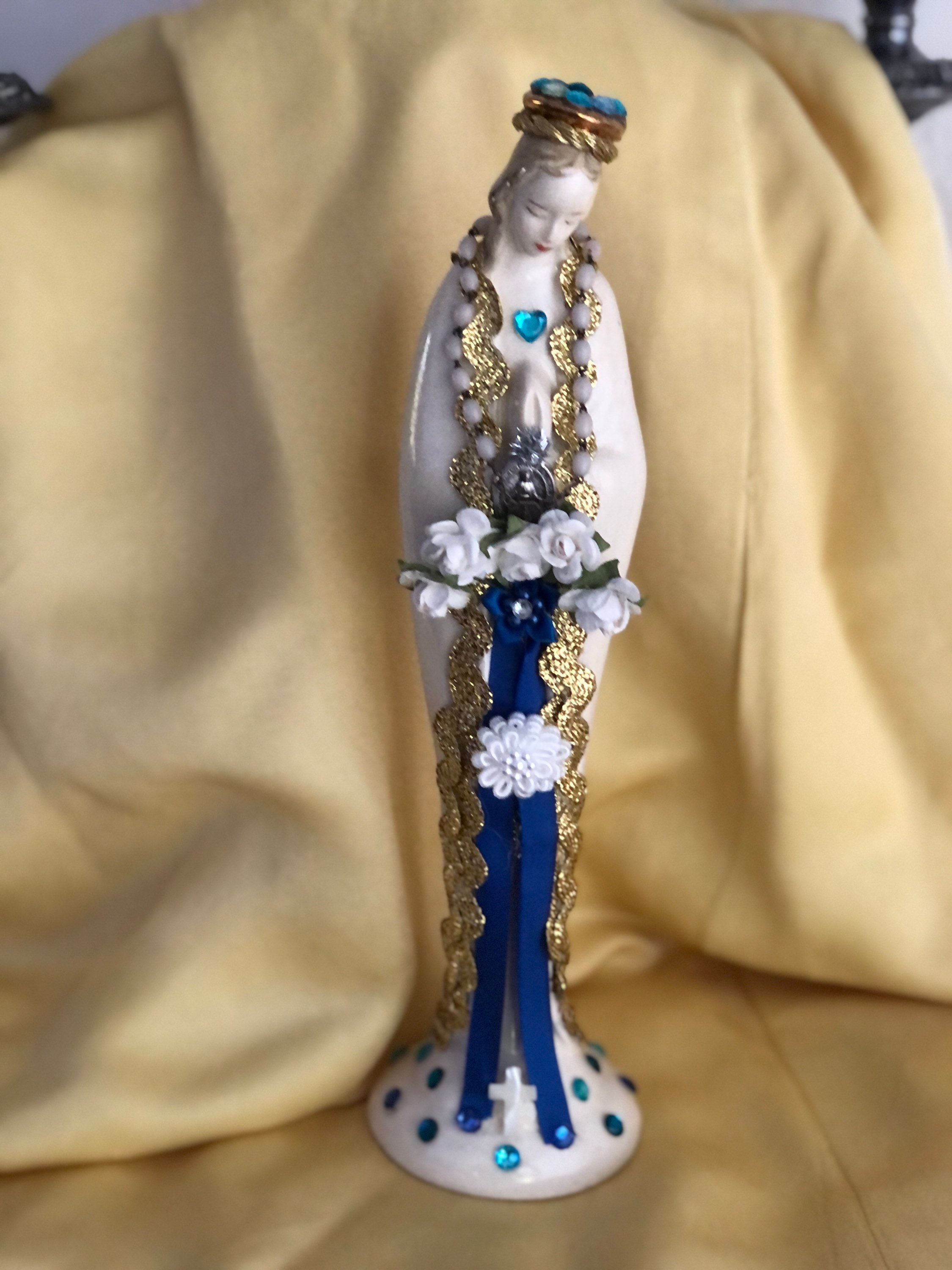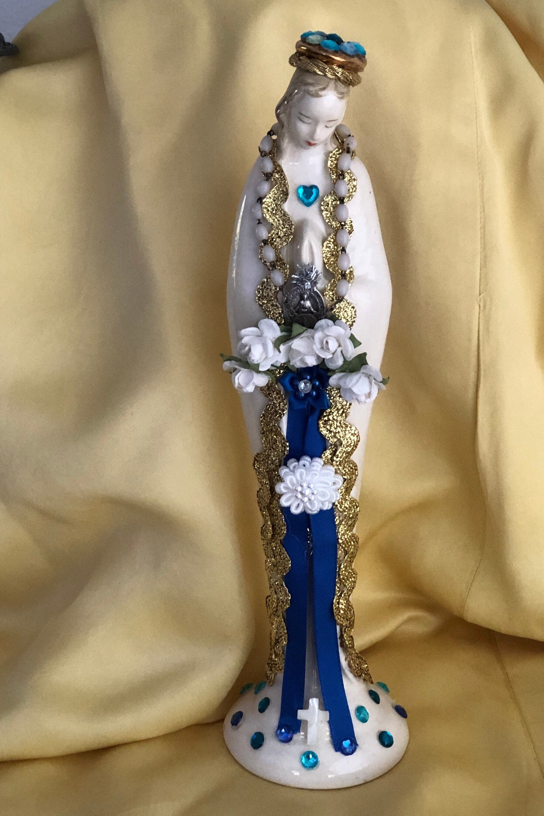 An Original 2nd Hand Revival Creation is this piece which is light weight hollow ceramic vintage statue/figurine with Gold Metallic Ric Tac Trim , Blue Satin Trim and White Flowers . A Vintage Virgin Mary Medallion . Vintage White Rosary Beads around her neck and below the Virgin Mary Medallion you can see a small metal vintage charm on the rosary beads. We added Blue and White Paper and Some Satin Flowers - lots of small faceted plastic stones in blues of various colors. A small pearlized cross at base. Back is a beautiful Blessed Mother of Sorrows Pray for us felt and paper medallion surrounded by blue stones. Gold Painted Halo has a trim of metallic gold rope trim and at top blue colored stones
