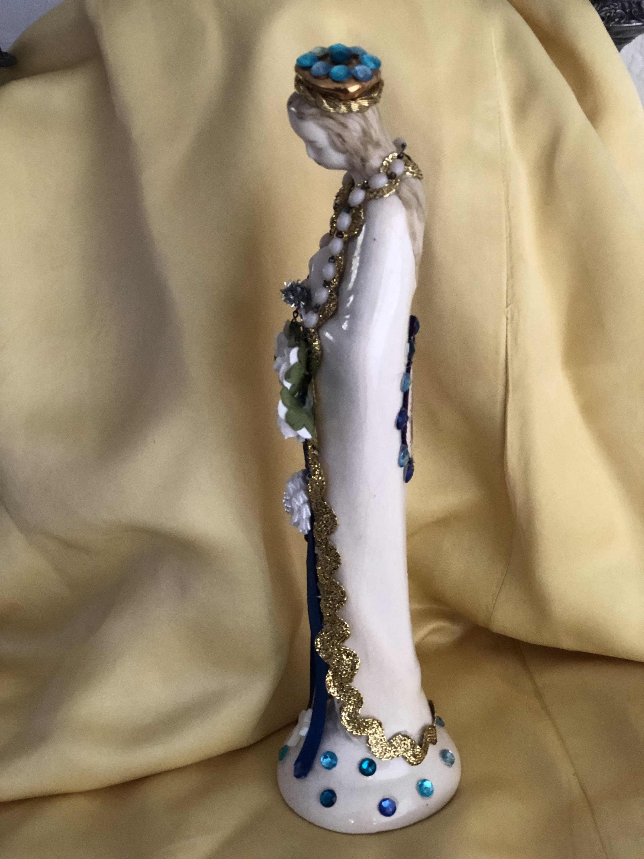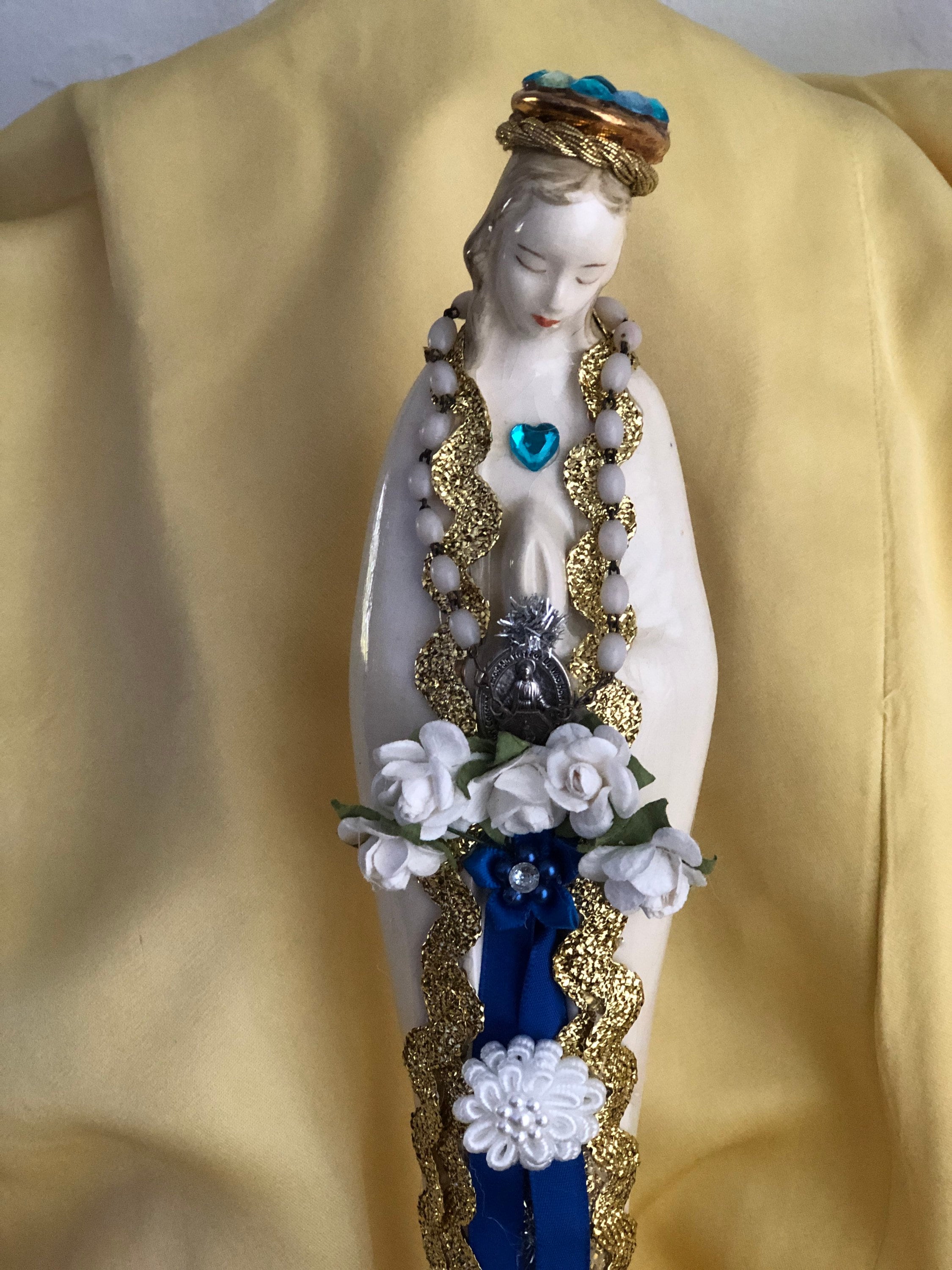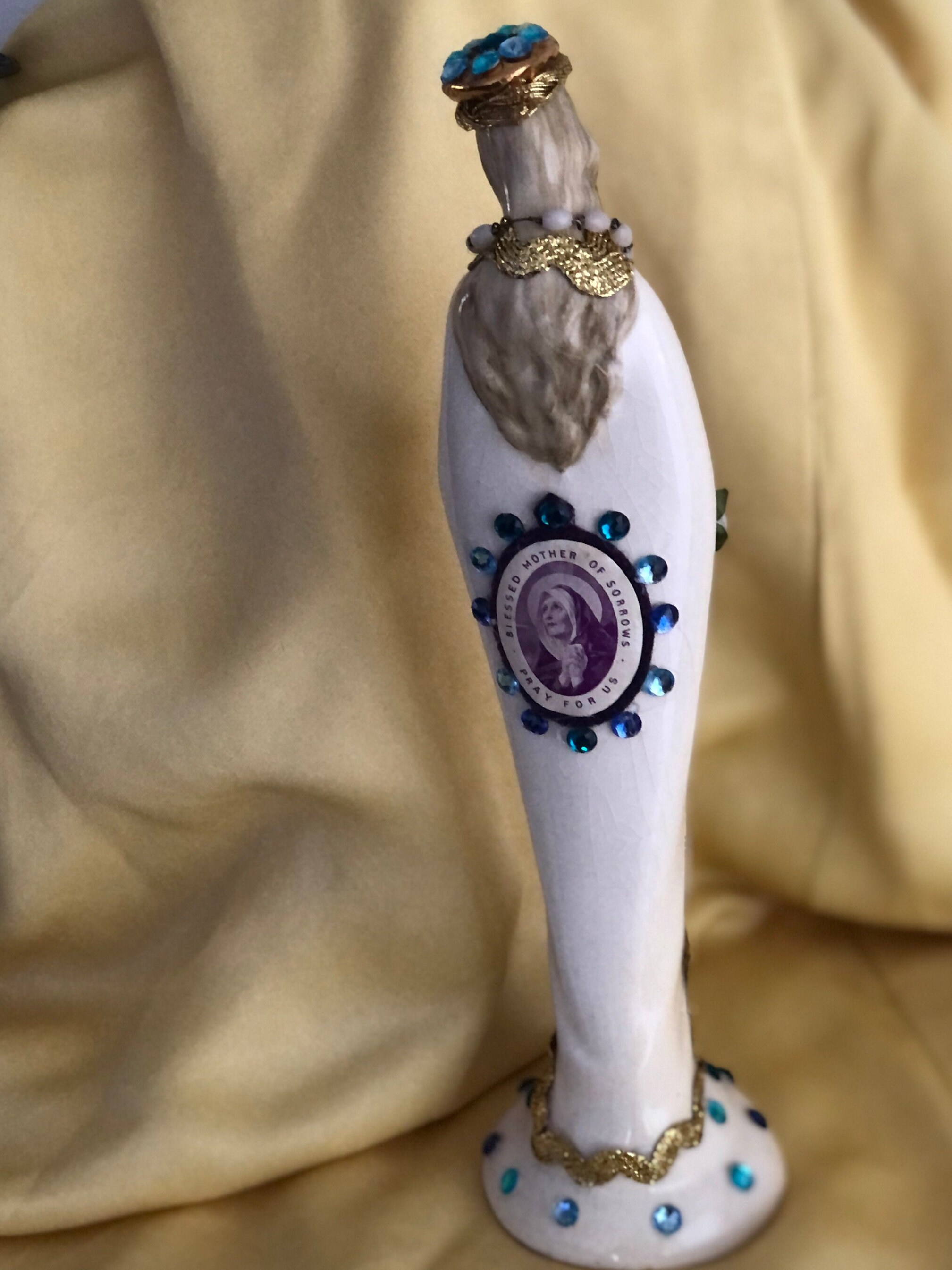 An Original 2nd Hand Revival Creation is this piece which is light weight hollow ceramic vintage statue/figurine with Gold Metallic Ric Tac Trim , Blue Satin Trim and White Flowers . A Vintage Virgin Mary Medallion . Vintage White Rosary Beads around her neck and below the Virgin Mary Medallion you can see a small metal vintage charm on the rosary beads. We added Blue and White Paper and Some Satin Flowers - lots of small faceted plastic stones in blues of various colors. A small pearlized cross at base. Back is a beautiful Blessed Mother of Sorrows Pray for us felt and paper medallion surrounded by blue stones. Gold Painted Halo has a trim of metallic gold rope trim and at top blue colored stones