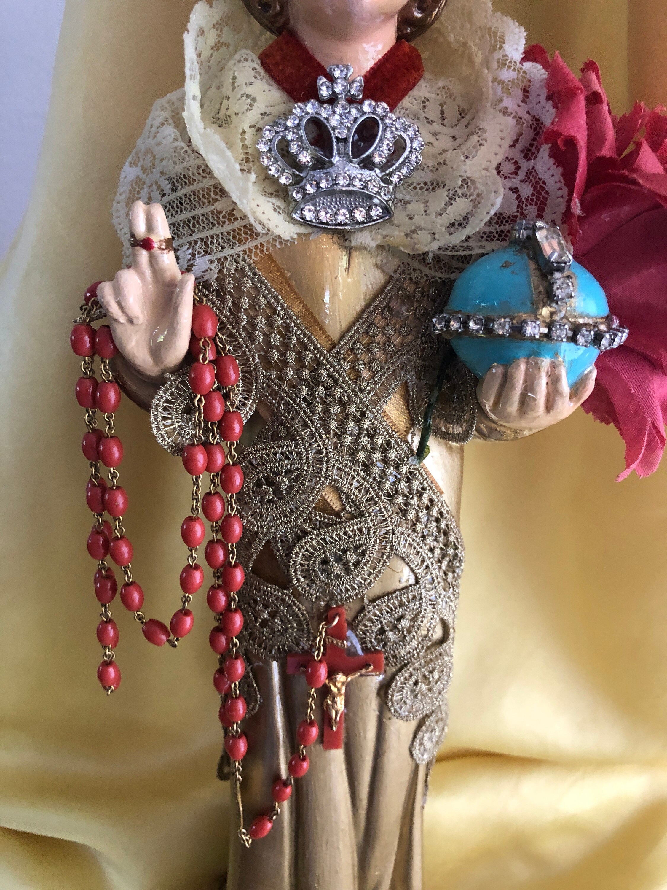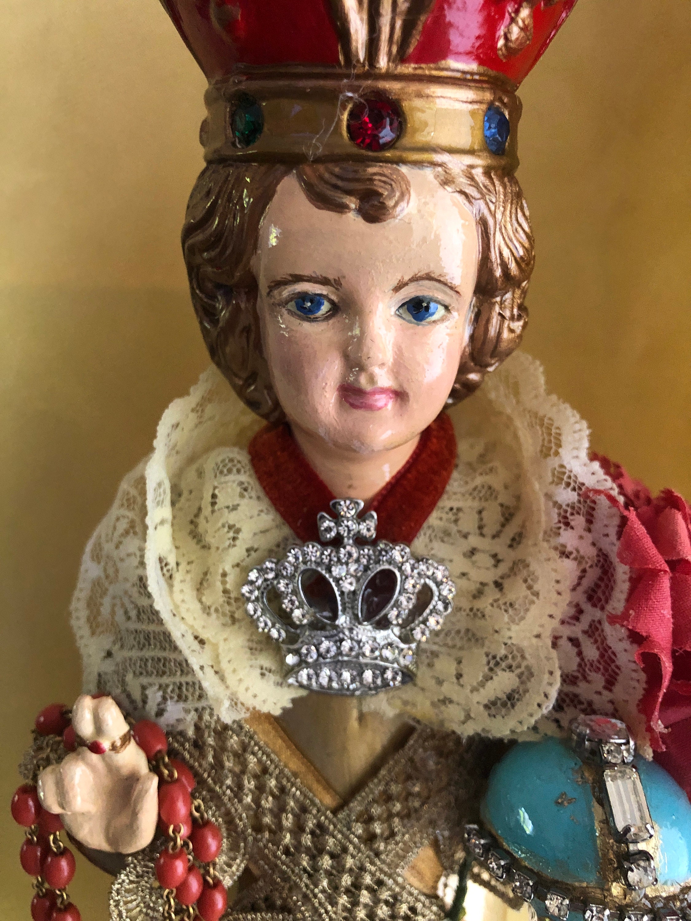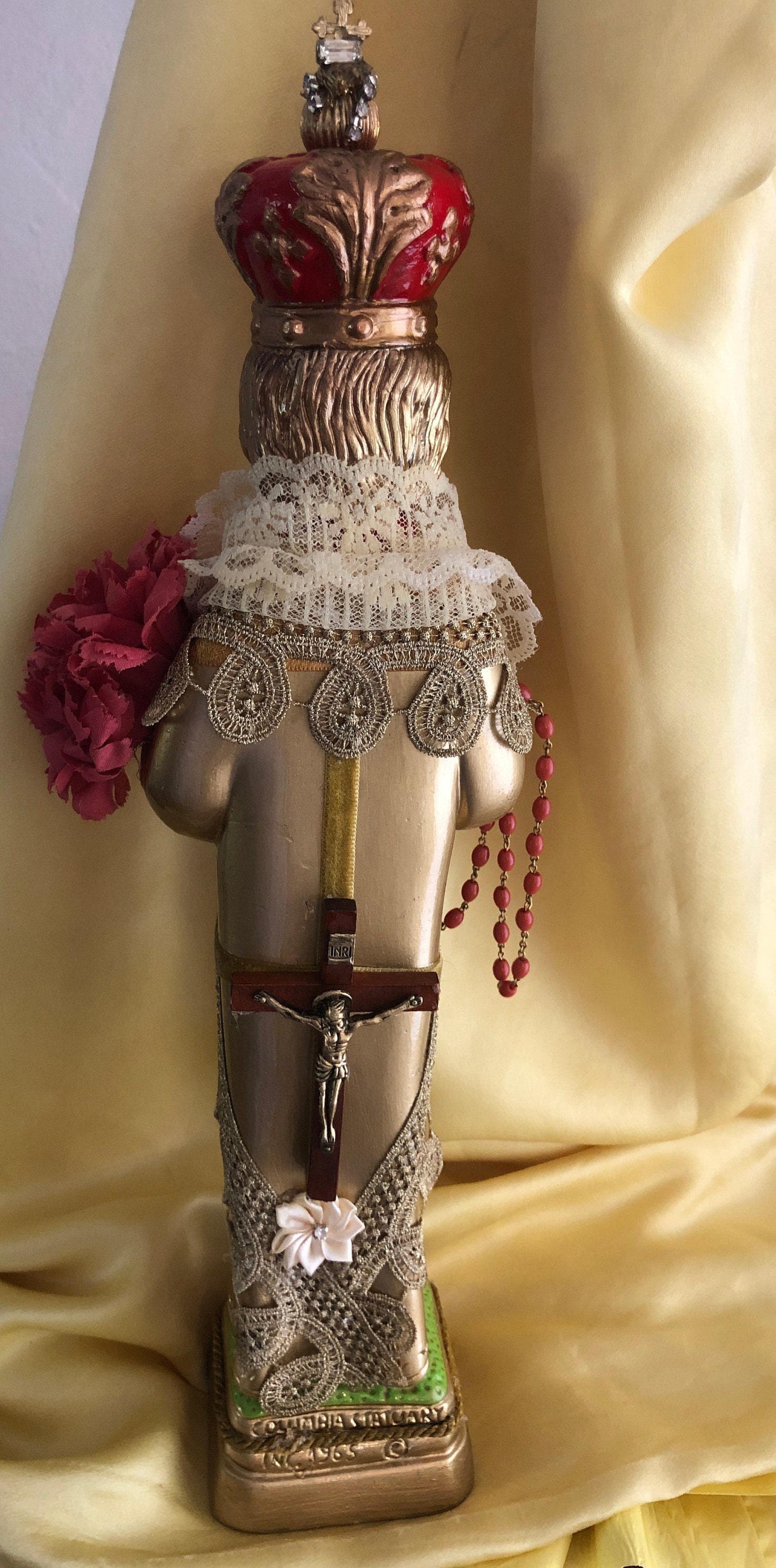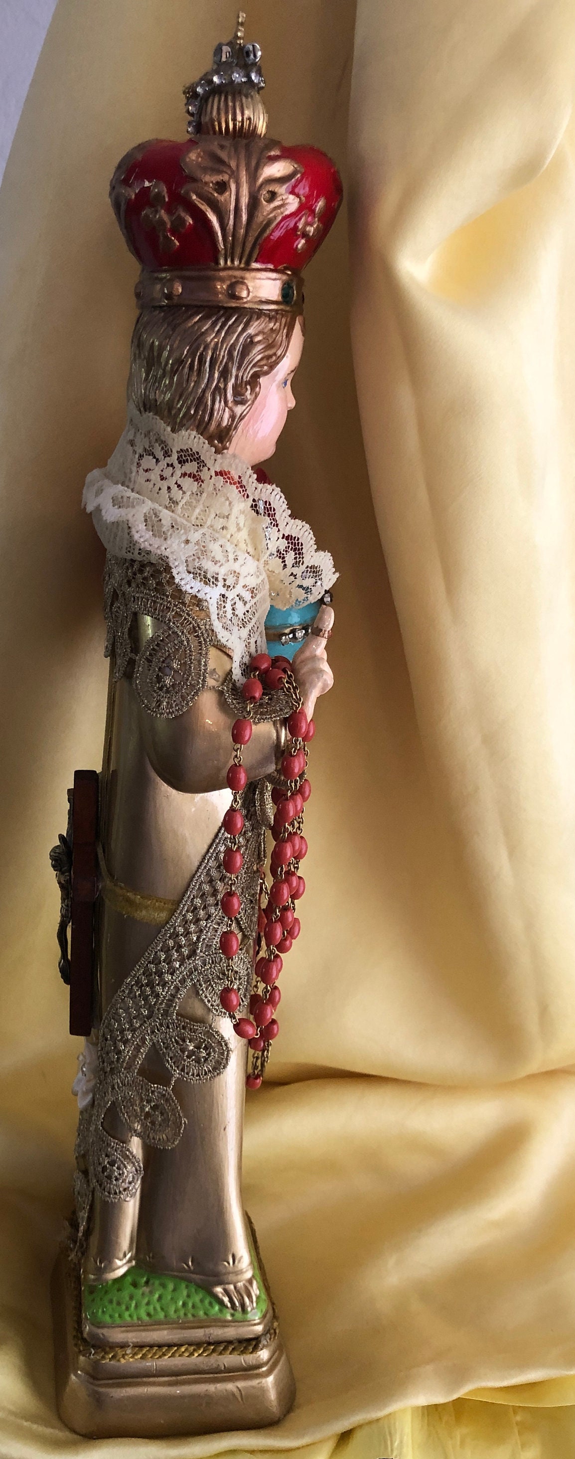 Artistic Style in colors This is our Gold w Gold Trim & Vintage 3 Tier Lace Collar - Rhinestone Crown Pin at Neck Infant of Prague Statue. This is a Vintage Solid One Piece Chalkware Statue that we have revived . Originally a Columbia Statutory Figure from Italy - Label on the bottom