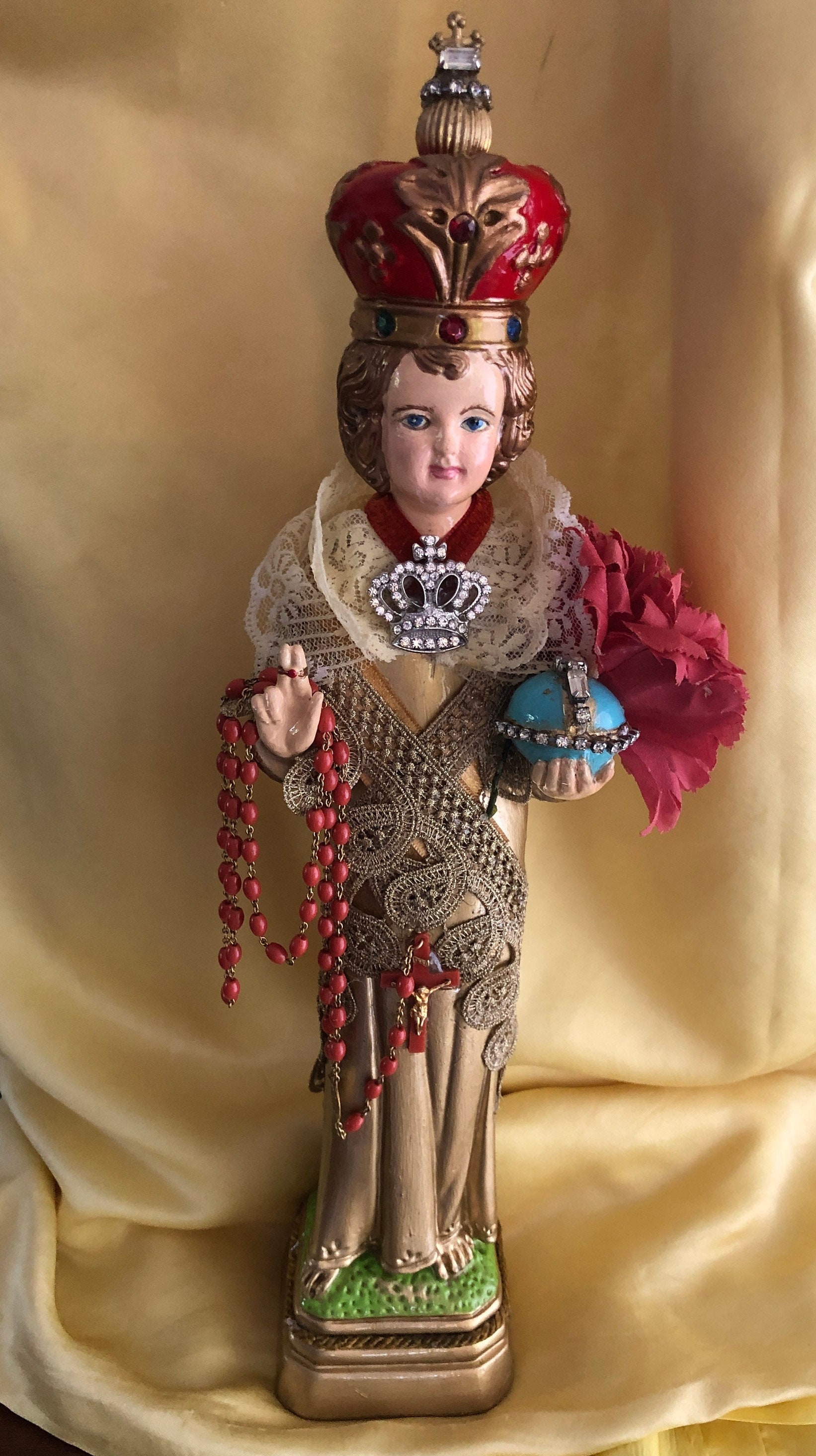 Infant of Prague Devotional Art Statue by 2nd Hand Revival Art Gallery Devotional Art - One of a Kind !! 2nd Hand Revival takes old vintage religious statues that have had prior age use & discolor or damage and turns each piece into a unique piece of art ! Our pieces are not perfect and we don't want them to be perfect. We are 2nd Hand Revival as we bring back to life these beautiful old statues. This piece came to us just in poor condition . It was very chipped and very little paint on the original surface .. We hand paint all details and add our personal touch of iconic embellishments. Statue is vintage solid chalkware