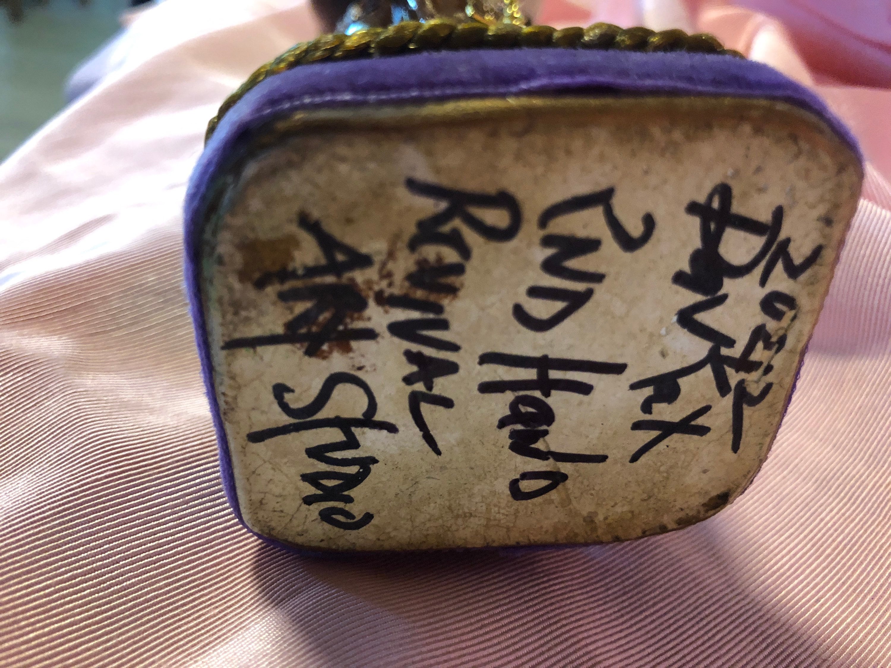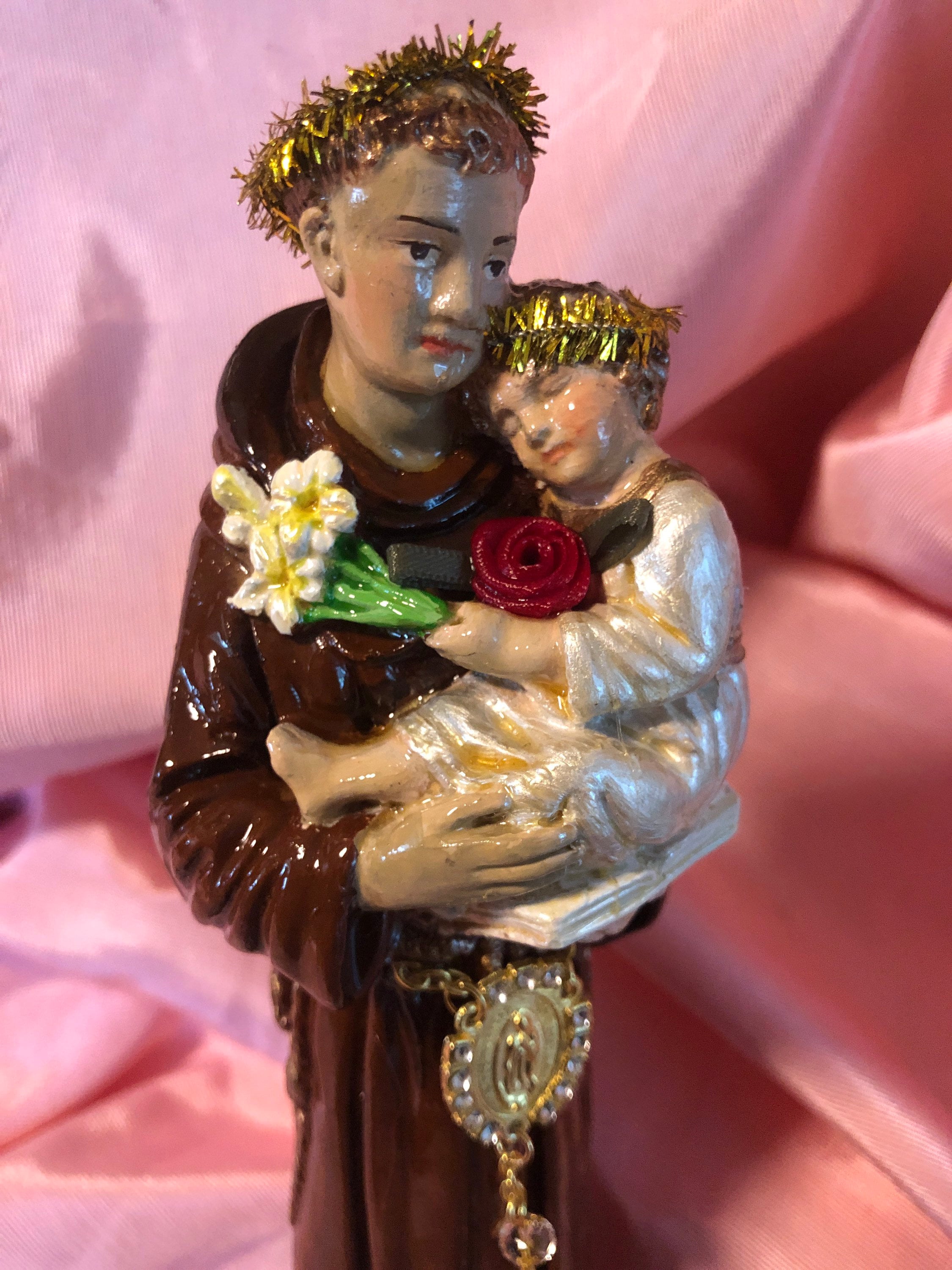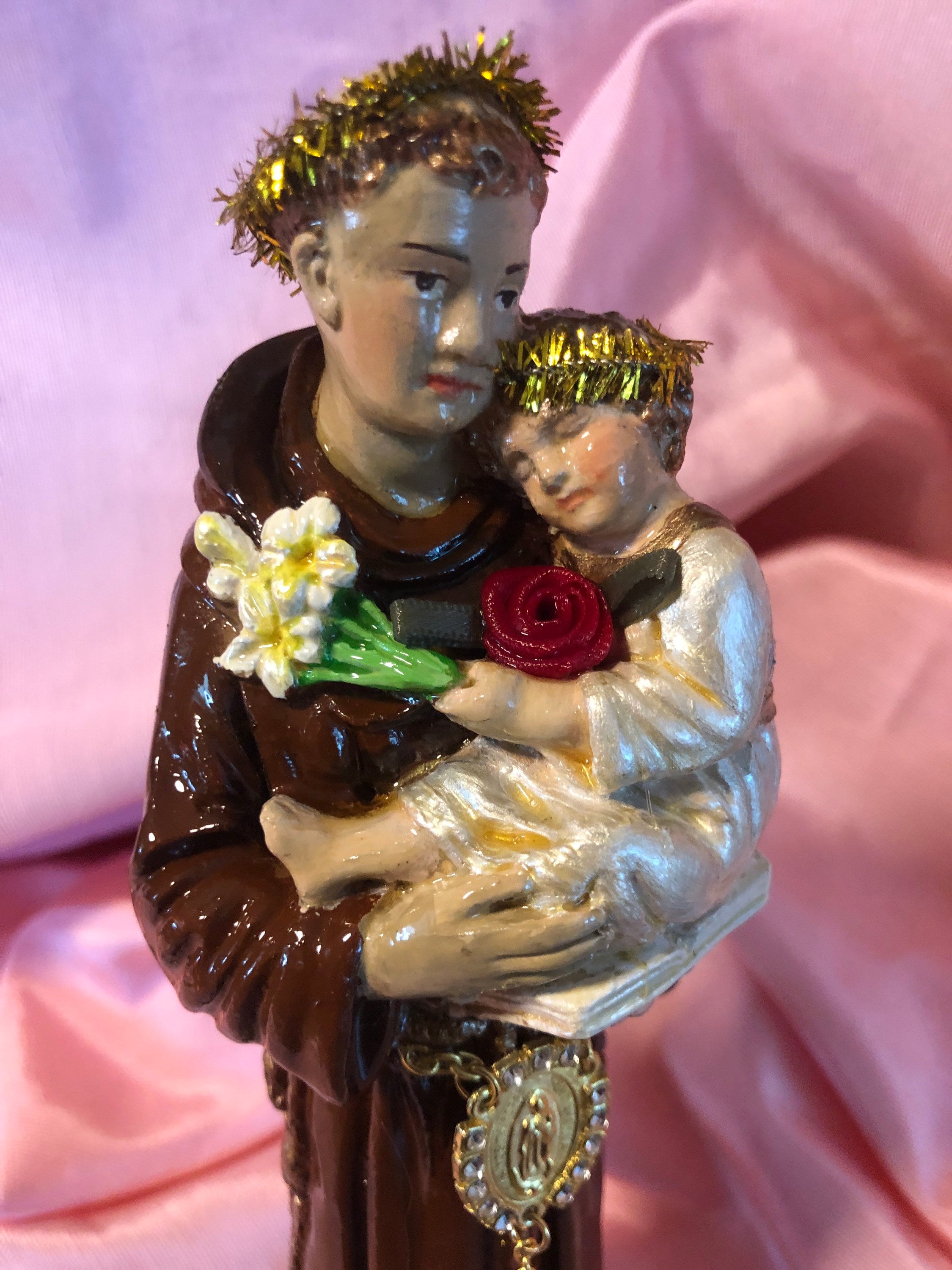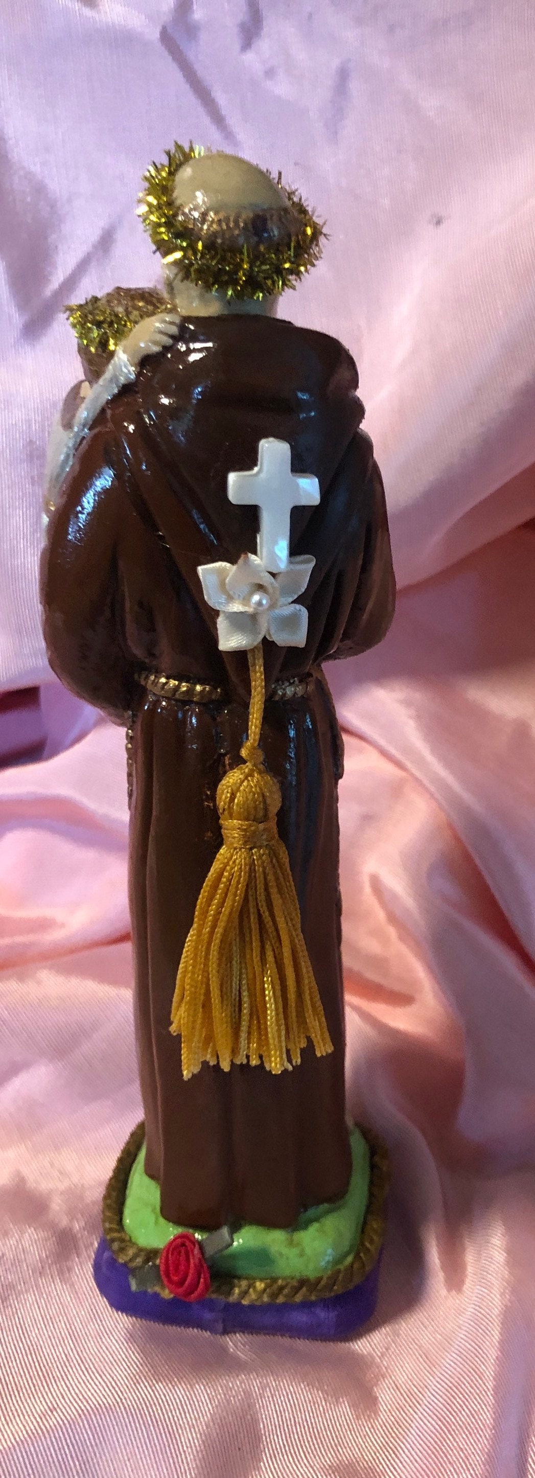 We paint back close to the original coloring ..added our personal touch of iconic embellishments. A goldtone Crucfix hangs from a goldtone embossed medal of the virgin mary . medal has a bead and small rhinestones around the medal. A small red rosette on baby. Gold Tinsel Halos . Back has a Yellowish Tassle that is secured in place . A small pearlize cross and an off white w pearl flowers . A small red rosette at back of base. Base has a purple vintage ribbon and a vintage goldtone rope trim .