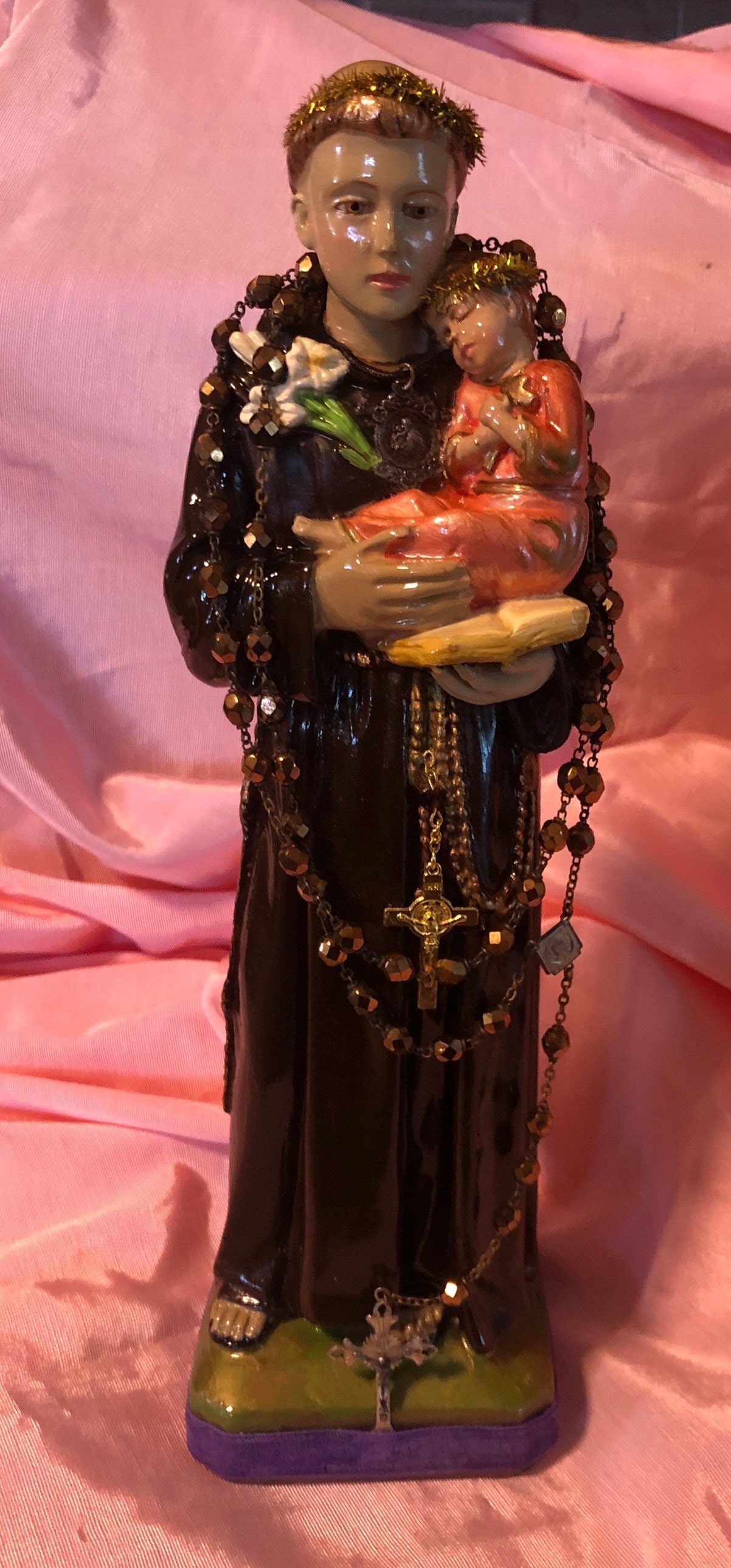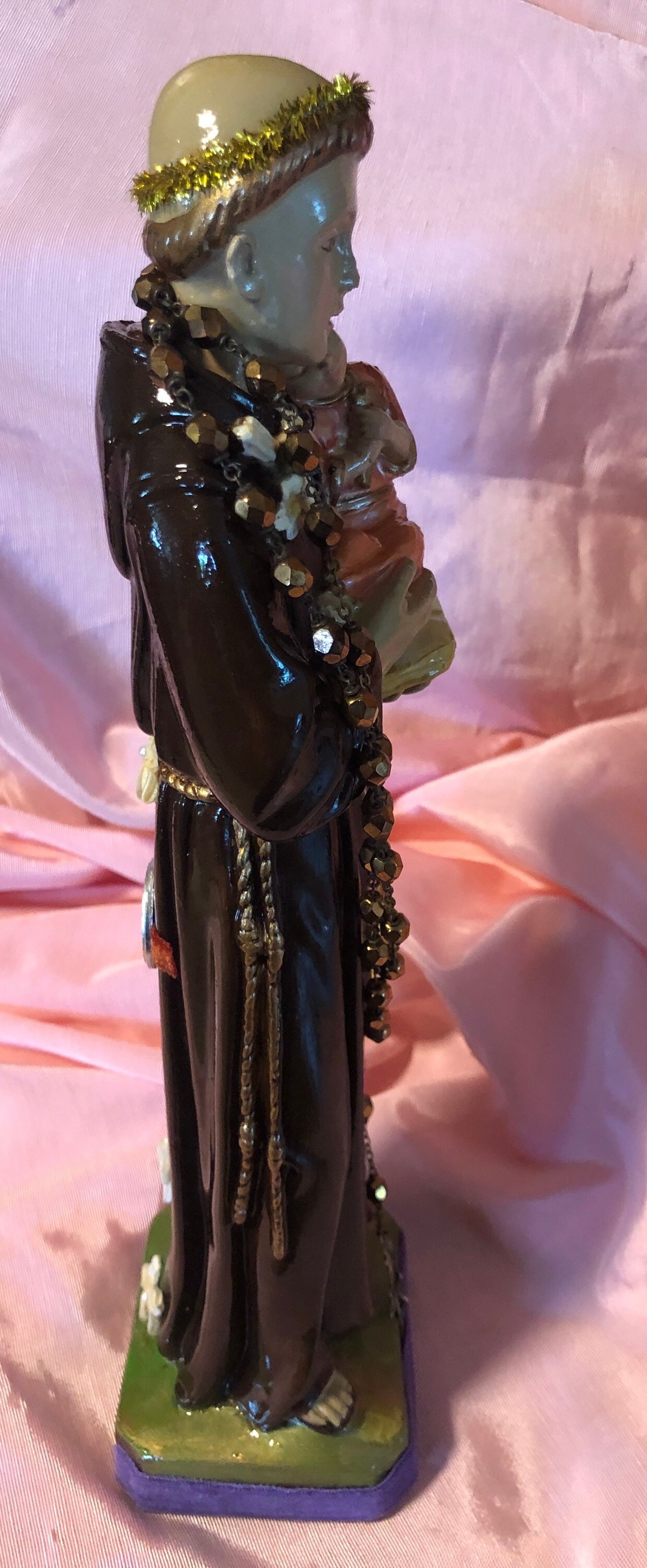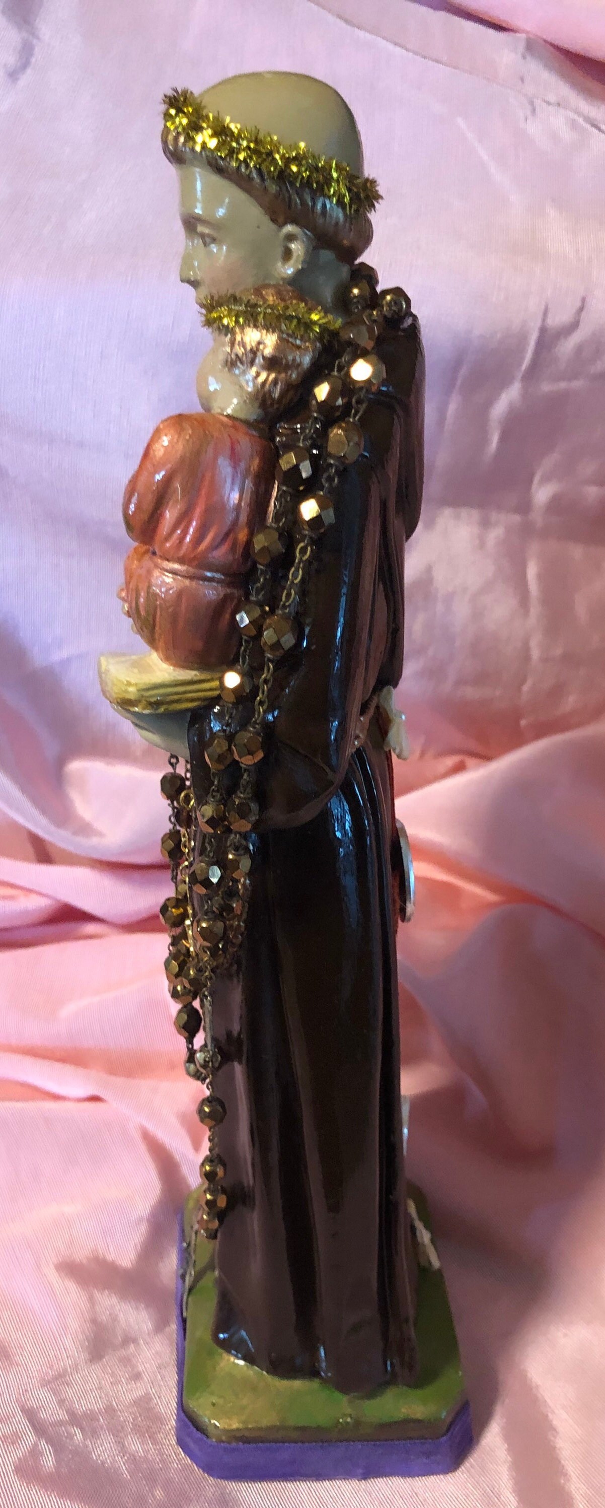 We painted back close to the original coloring ..added our personal touch of iconic embellishments of a goldtone metal crucifix on the dress . Around St. Anthony's neck is a small antique St. Anthony medal . The Back has a rust color velvet fabric cross on the dress . A Silvertrone Embossed round medal on the dress.