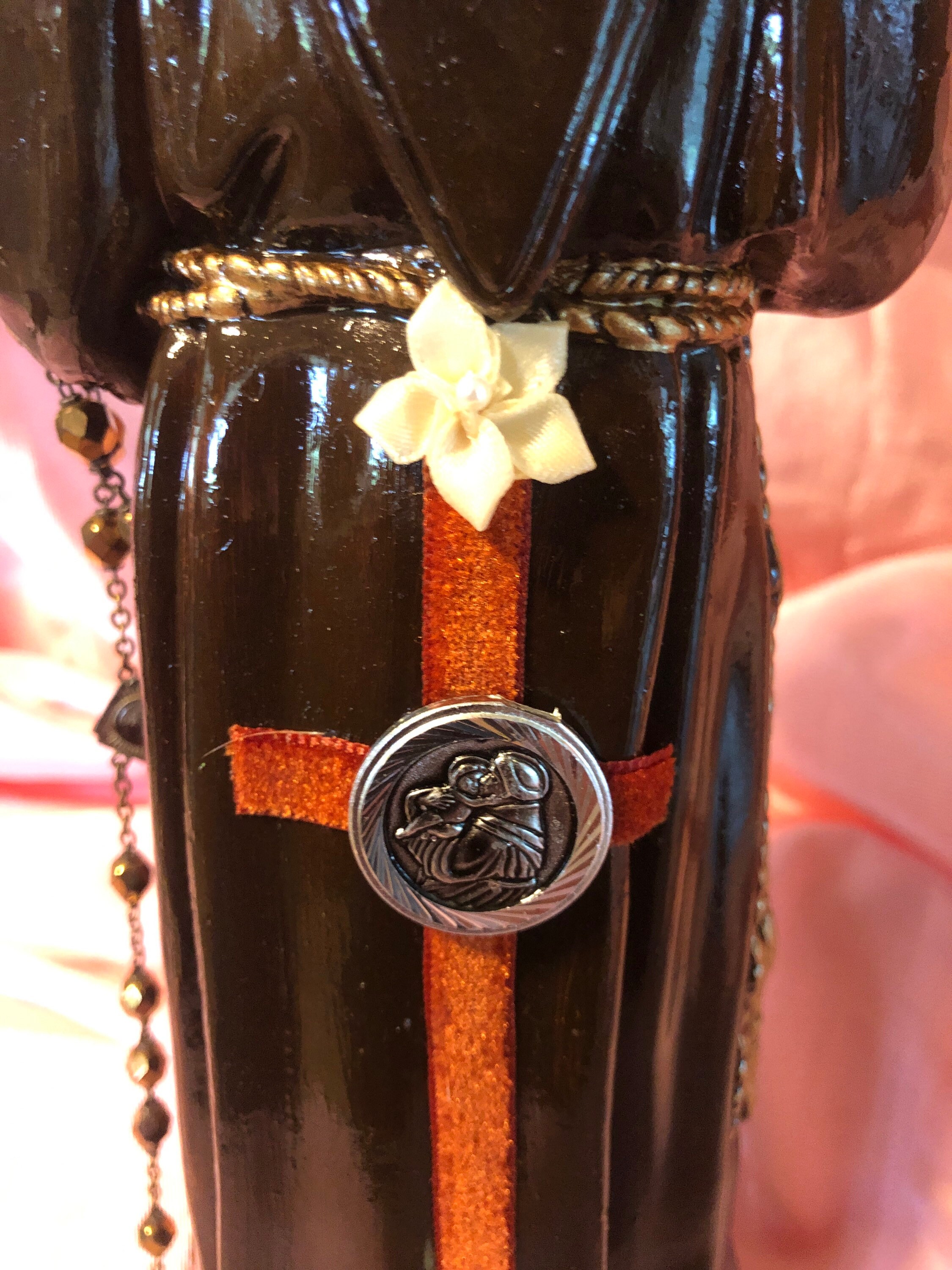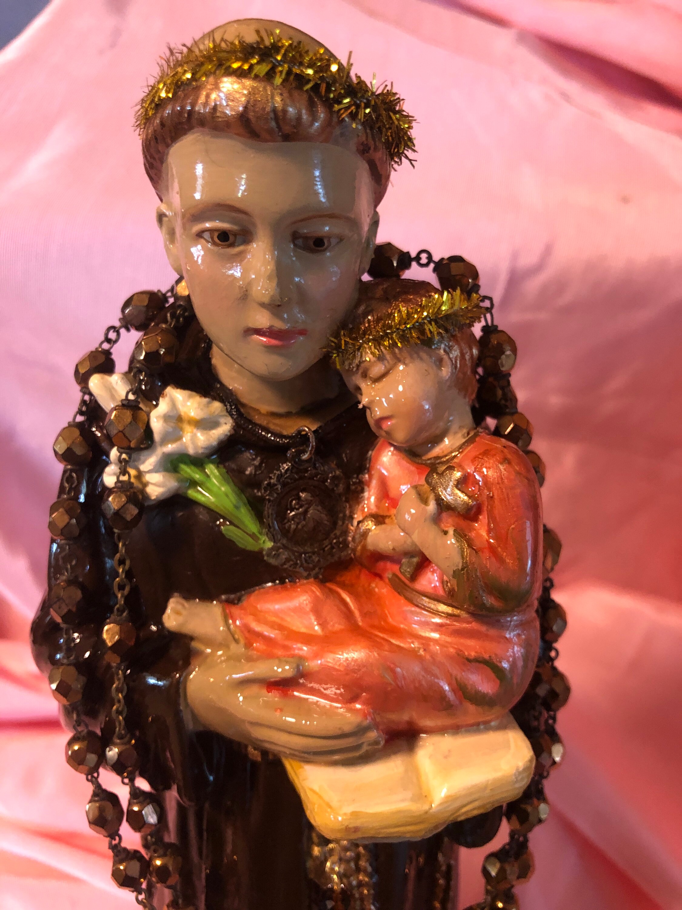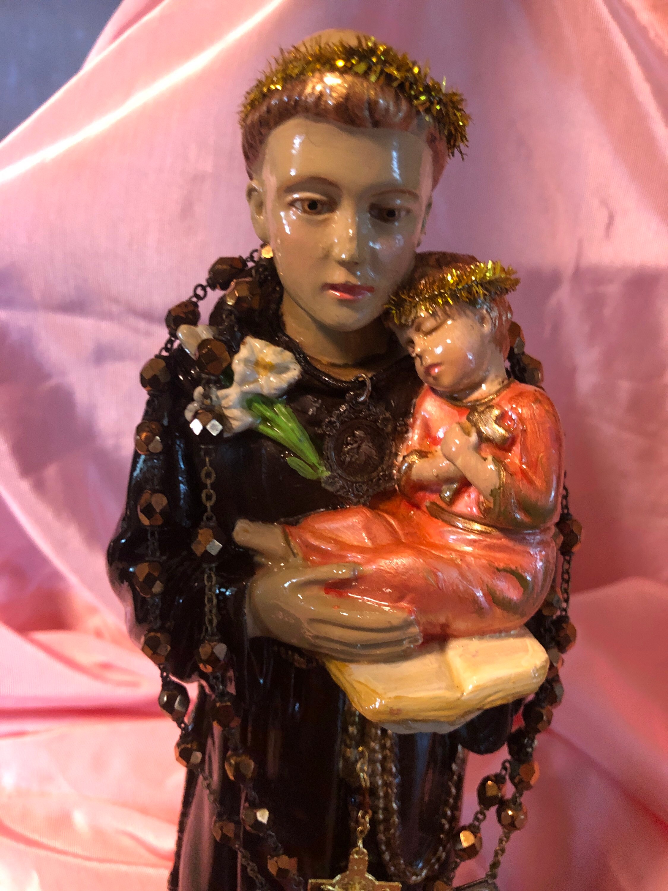We painted back close to the original coloring ..added our personal touch of iconic embellishments of a goldtone metal crucifix on the dress . Around St. Anthony's neck is a small antique St. Anthony medal . The Back has a rust color velvet fabric cross on the dress . A Silvertrone Embossed round medal on the dress.
