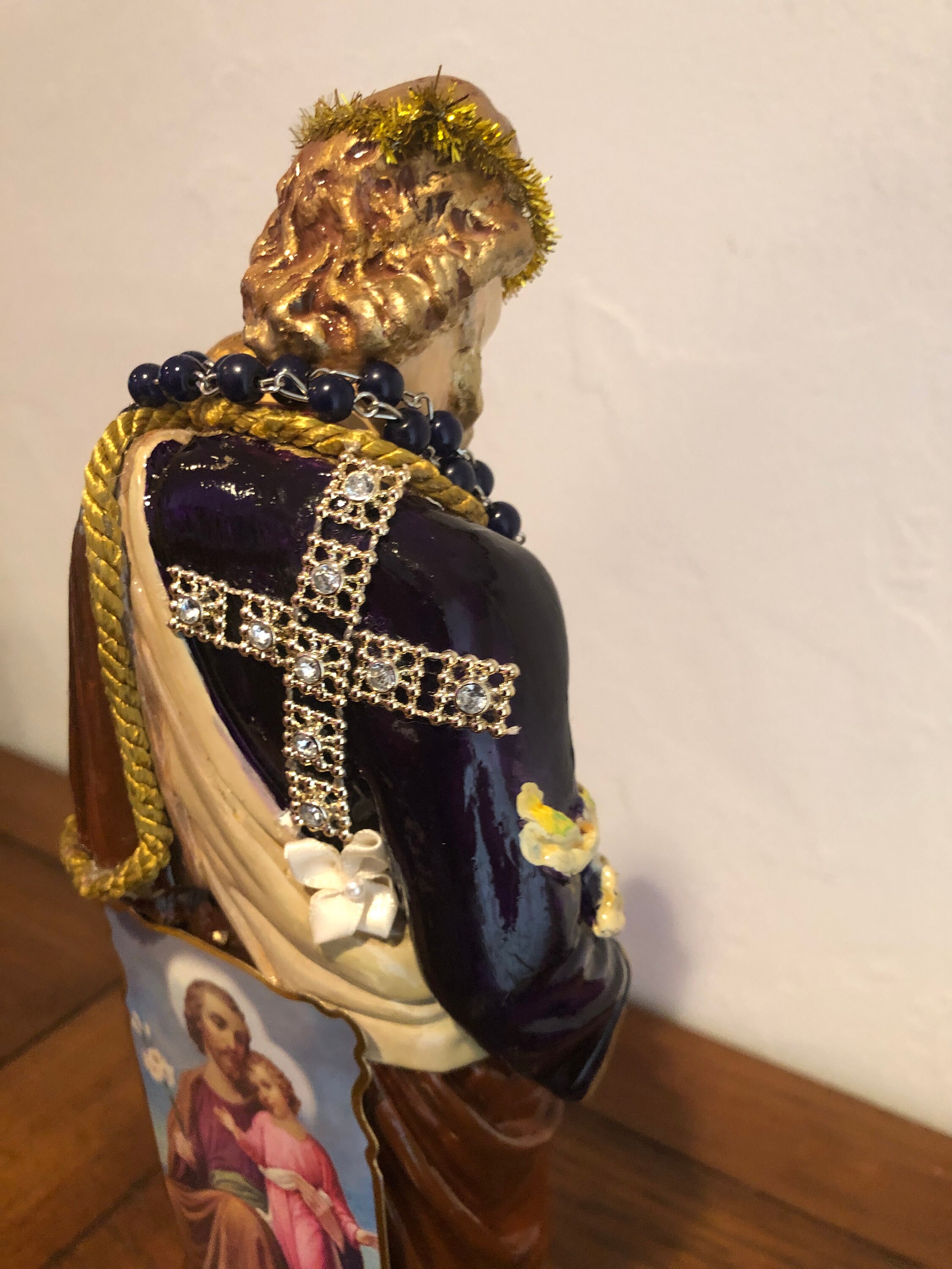 We painted back close to the original coloring ..added our personal touch embellishments of vintage gold rope trim .. lace shawl and flower on Baby Jesus Around St. Joseph's neck is a small antique medal .