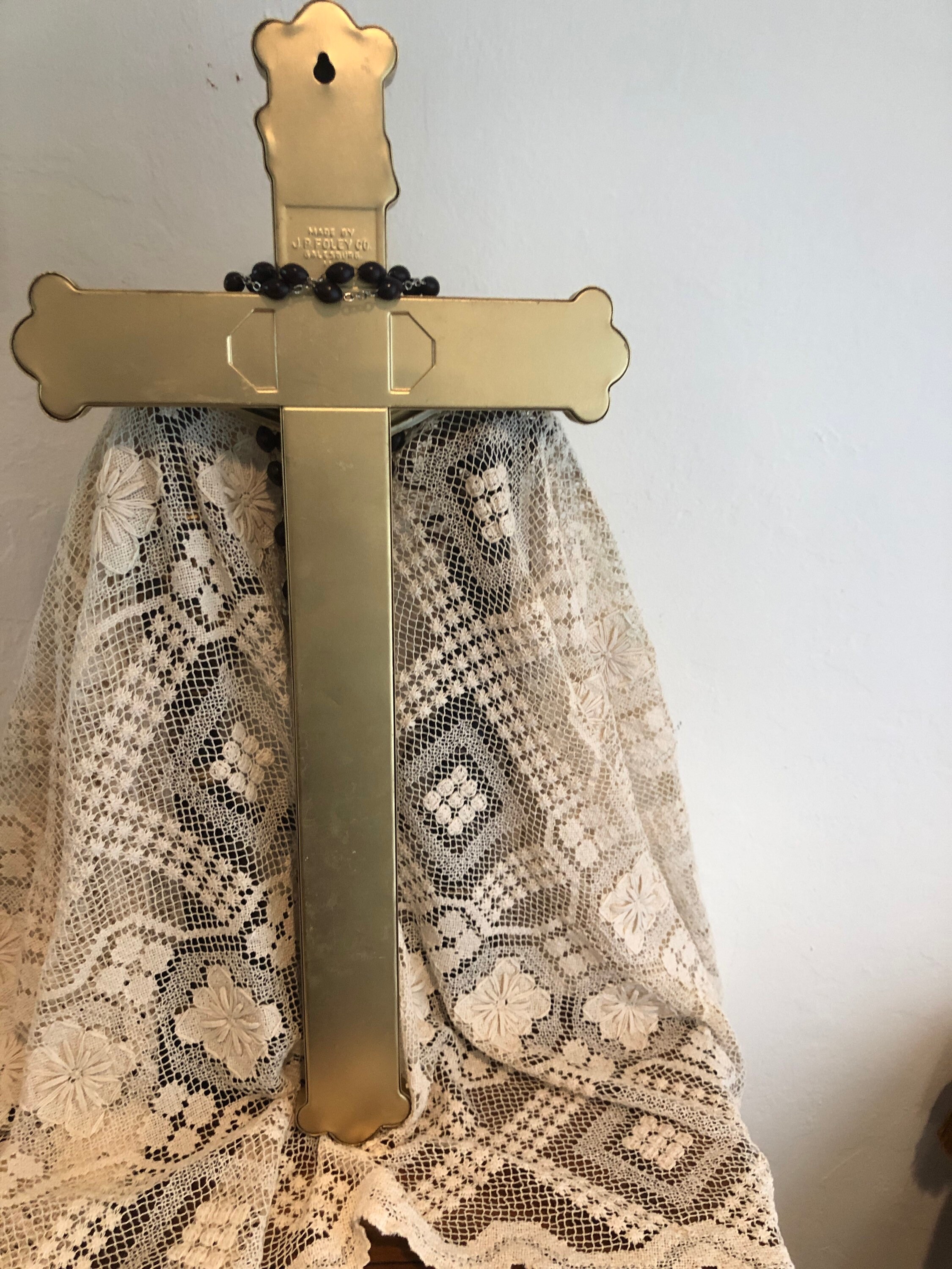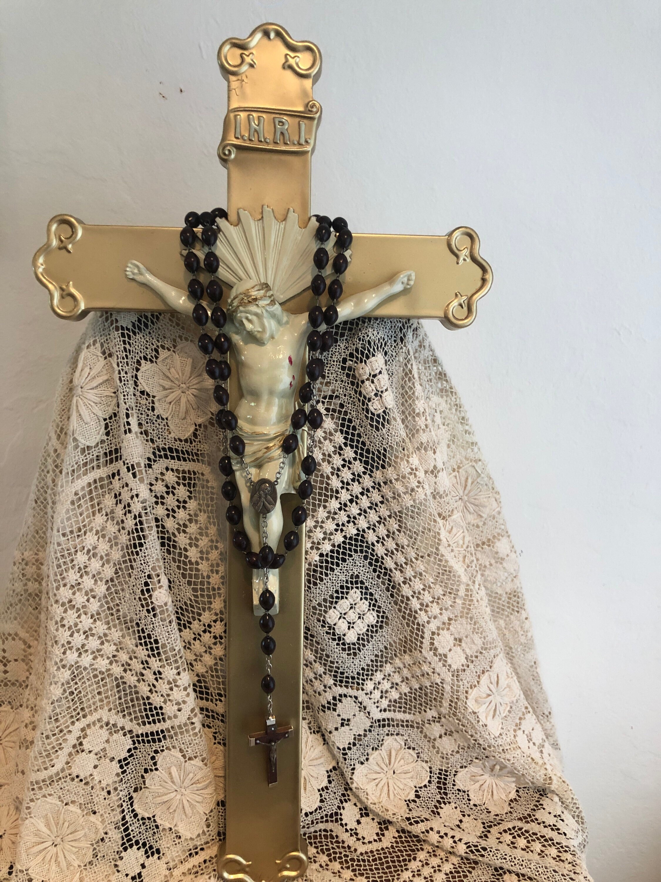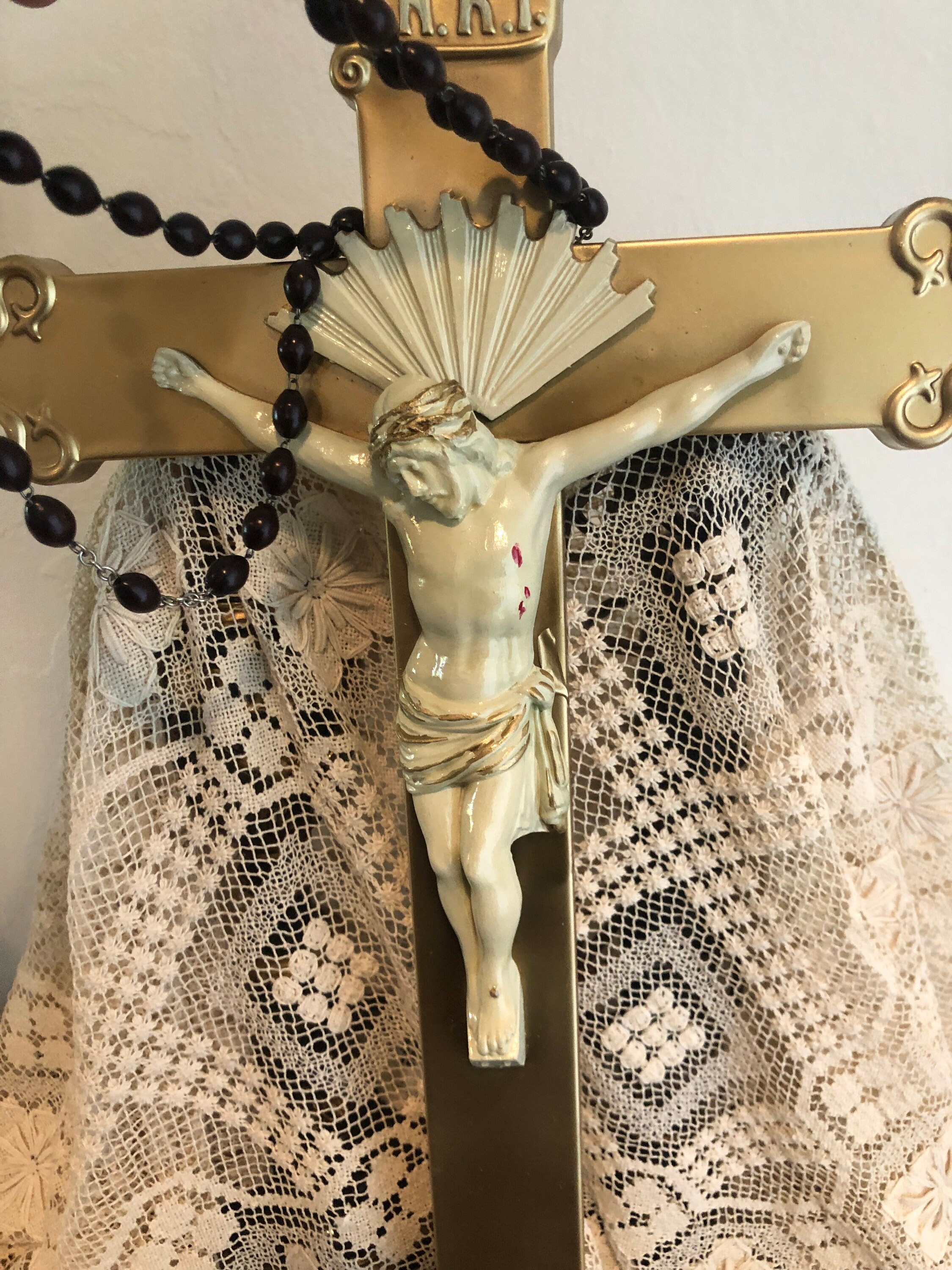Vintage Origin: J P FOLEY CO Galesburg, Ill. Crucifix for Wall Metal Cross and Raised Metal Jesus This piece has been revived by 2nd Hand Revival Art Studios in Sarasota, Florida Devotional Art - One of a Kind Piece ! We take antique and vintage religious iconic statues, figurines and whatever shows up for us on our porch . We love to give these pieces a new life. They are not perfect as most are old and in poor condition when we receive. This piece came to us in very poor condition. Little Paint was left on the metal and lots of scrapes and scratches . We painted several times over the metal in gold and and added handpainted details as you see in the photos . Glossy Finish over the entire piece Wood Rosary Beads from Italy are wrapped twice at top of the cross. They will be left free style for you to play at you choose. hole at back to hang This piece does have some surface wear due to age .. Stamped on Back - J P Foley 2nd Hand Revival also attaches a card of authenticity from their studio