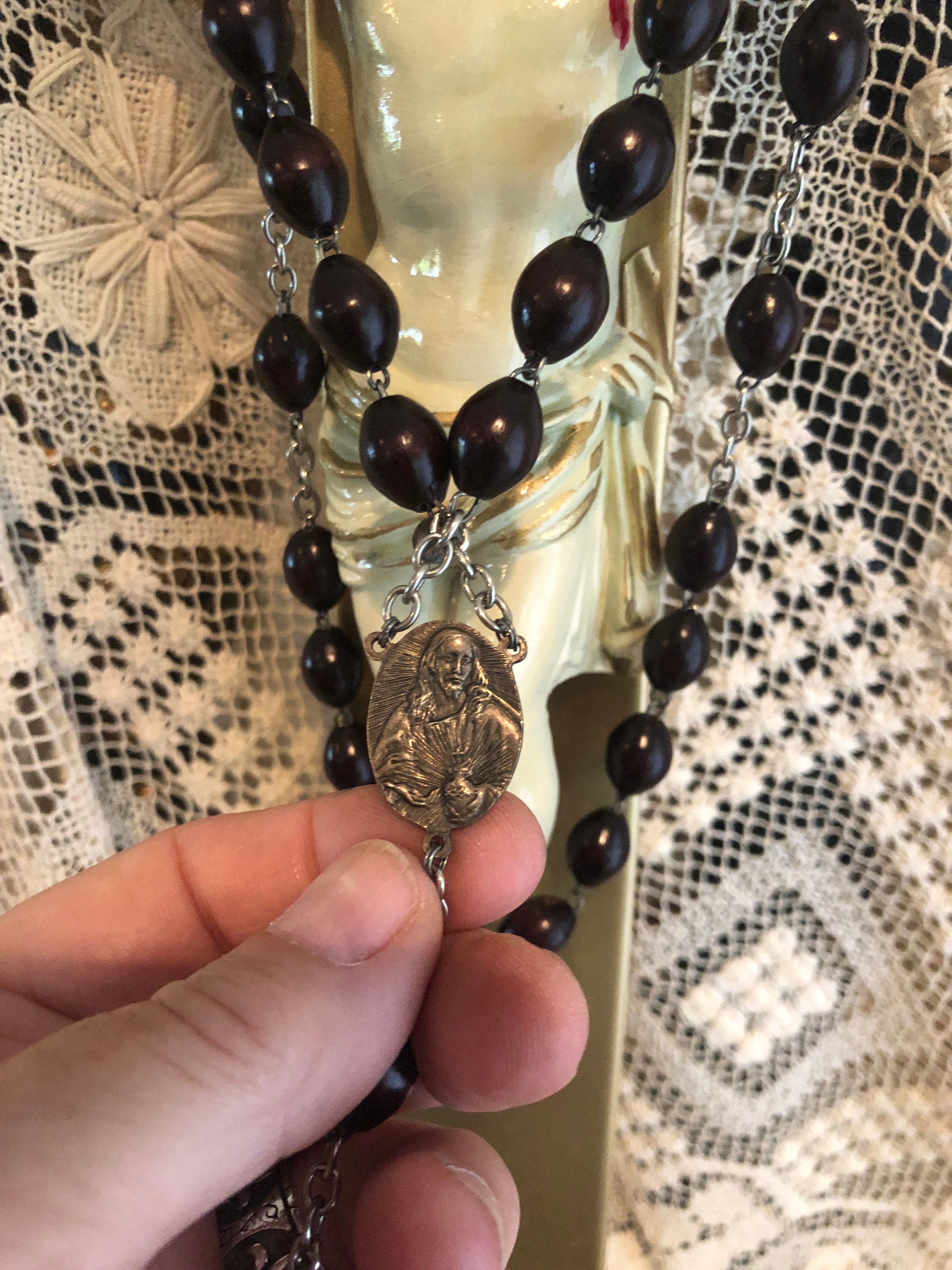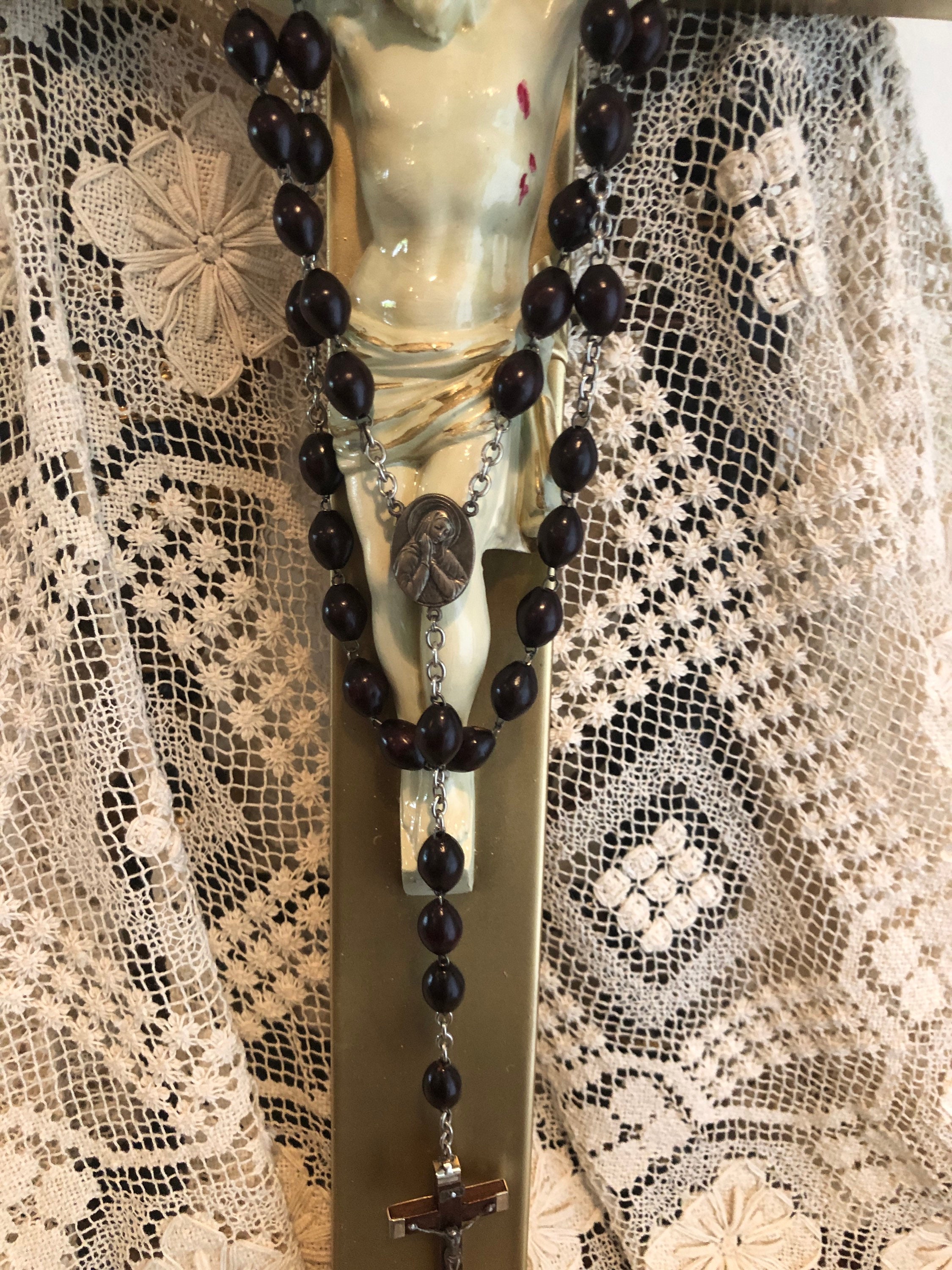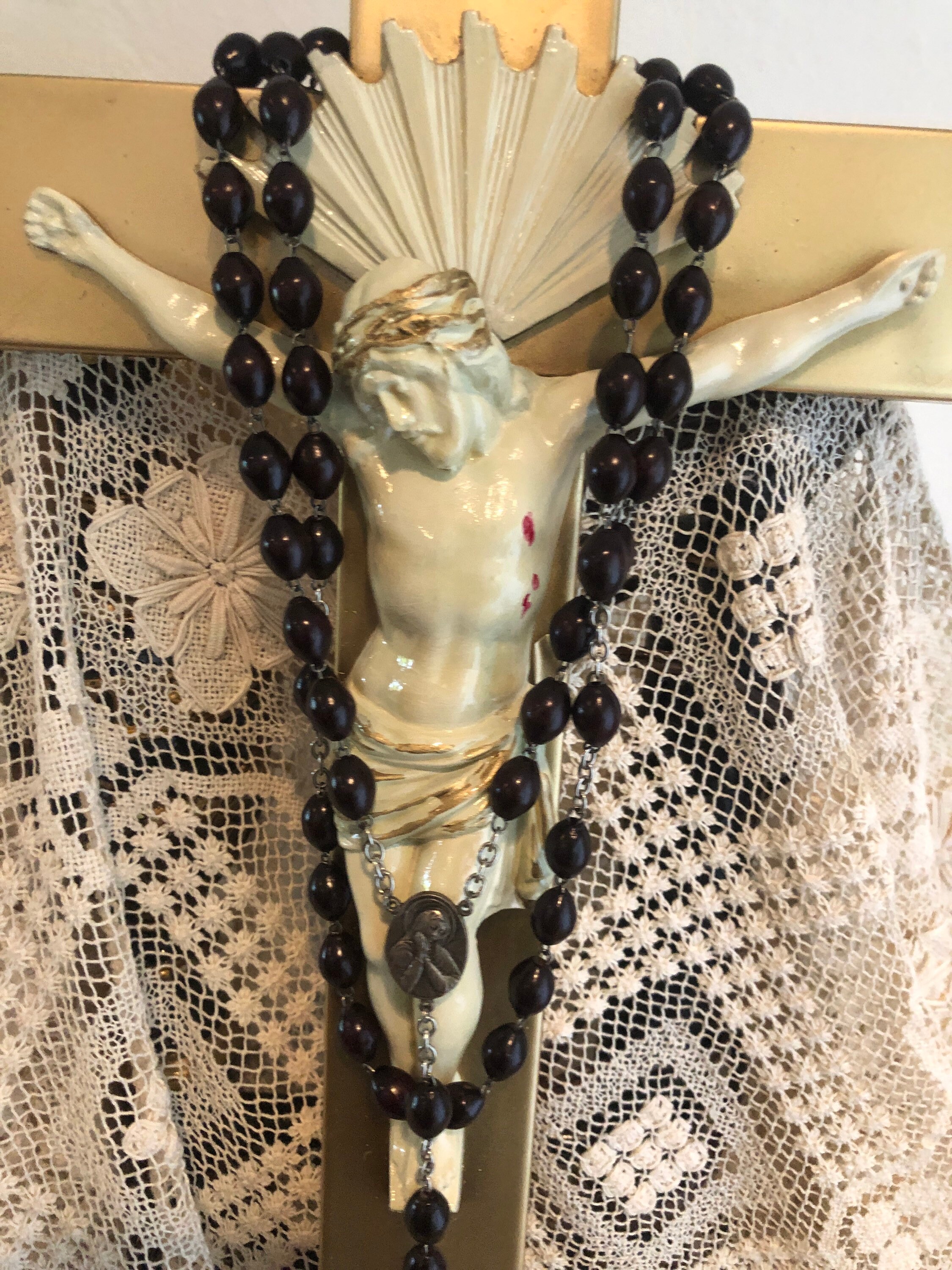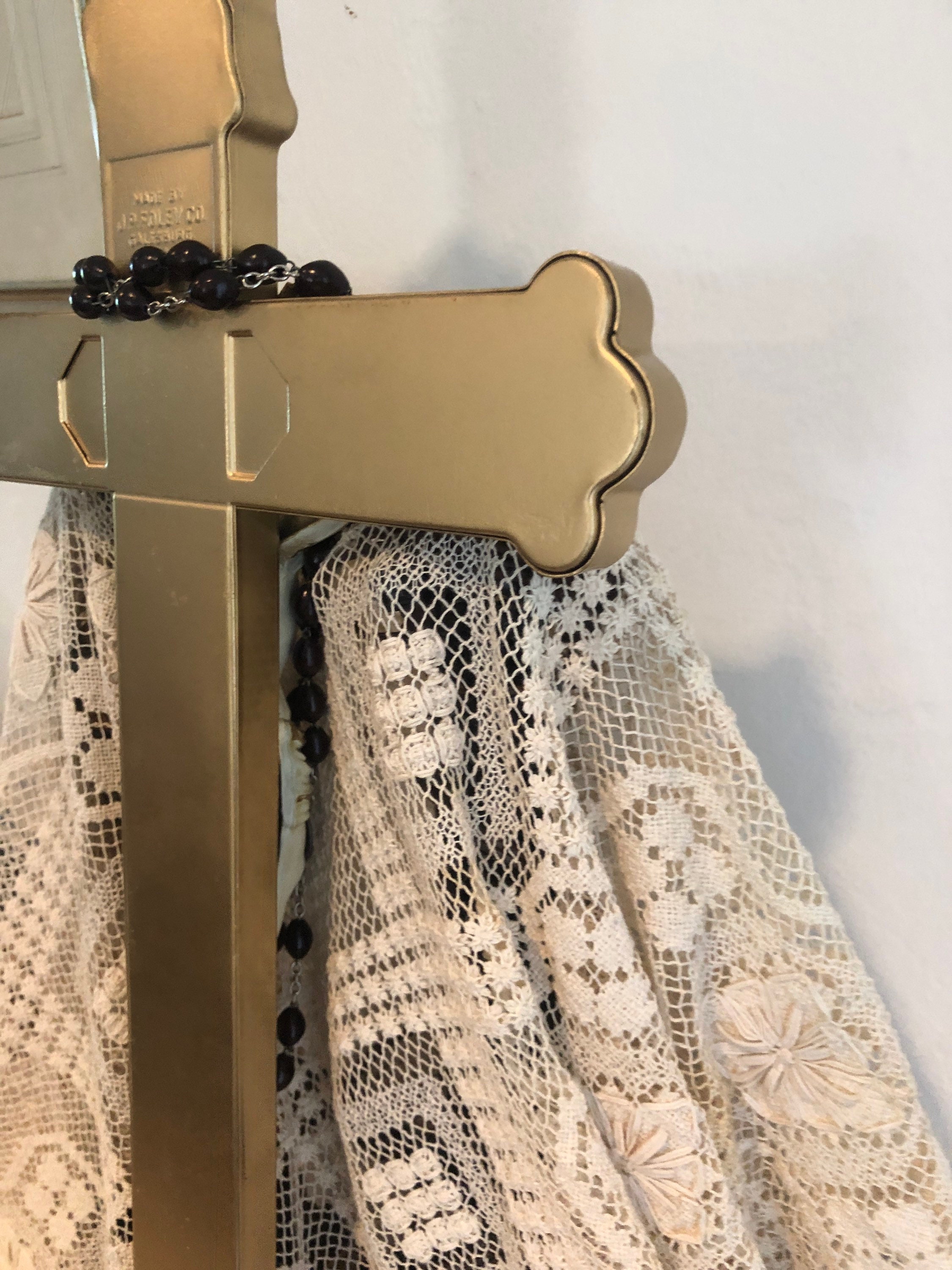 Vintage Origin: J P FOLEY CO Galesburg, Ill. Crucifix for Wall Metal Cross and Raised Metal Jesus This piece has been revived by 2nd Hand Revival Art Studios in Sarasota, Florida Devotional Art - One of a Kind Piece ! We take antique and vintage religious iconic statues, figurines and whatever shows up for us on our porch . We love to give these pieces a new life. They are not perfect as most are old and in poor condition when we receive. This piece came to us in very poor condition. Little Paint was left on the metal and lots of scrapes and scratches . We painted several times over the metal in gold and and added handpainted details as you see in the photos . Glossy Finish over the entire piece Wood Rosary Beads from Italy are wrapped twice at top of the cross. They will be left free style for you to play at you choose. hole at back to hang This piece does have some surface wear due to age .. Stamped on Back - J P Foley 2nd Hand Revival also attaches a card of authenticity from their studio