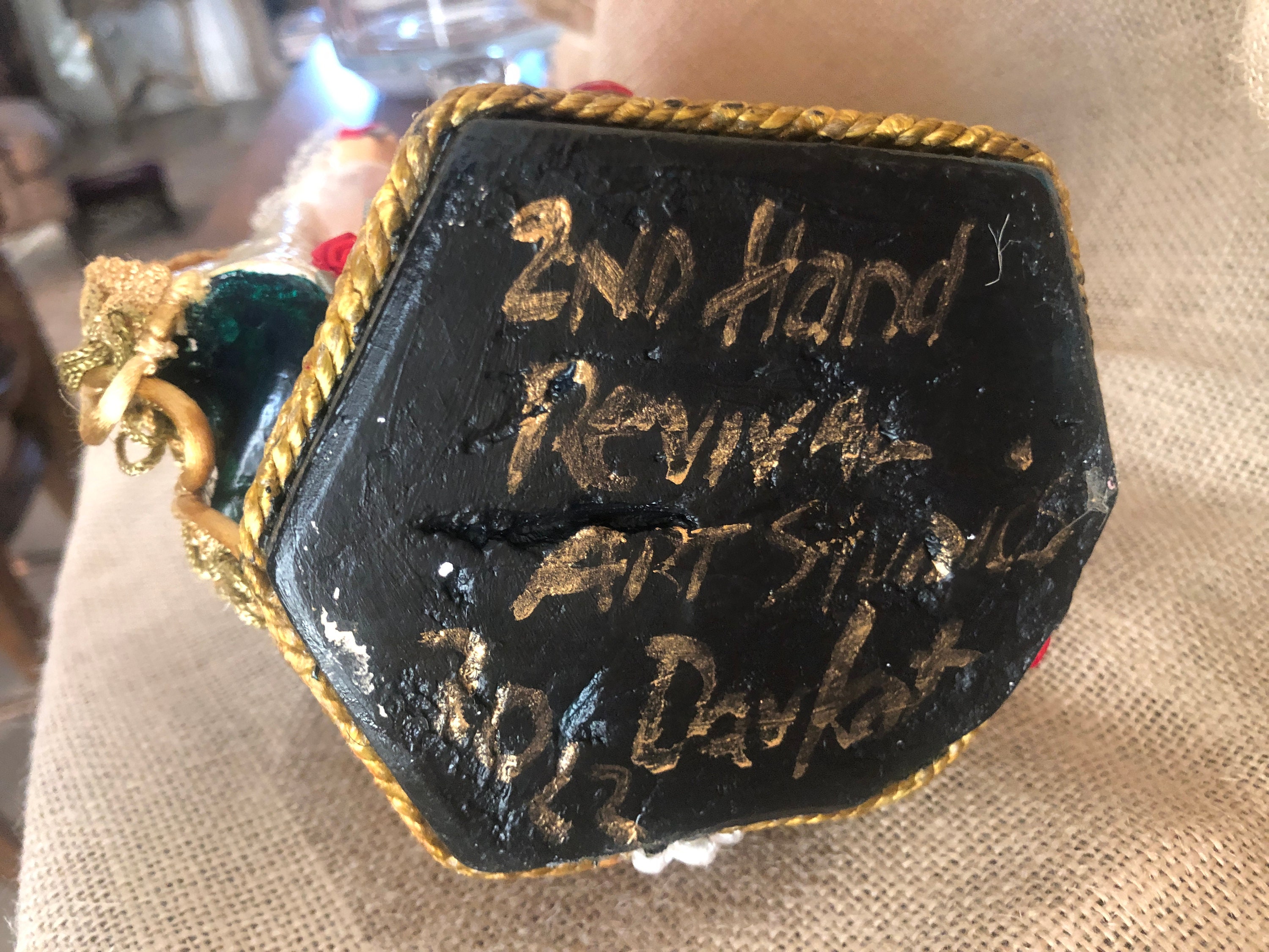 Back : Antique crucifix silverplate at center back . Black and Gold Base is a gloss finish . Face has been softly painted - Gold paint highlites the hair. Approximately Measures 12.5" Tall to top of the top & 4" wide across base. Bottom is signed 2nd Hand Revival Art Studio by DavKat ( Resident Artist) 2022 see photos for details - handmade devotional art
