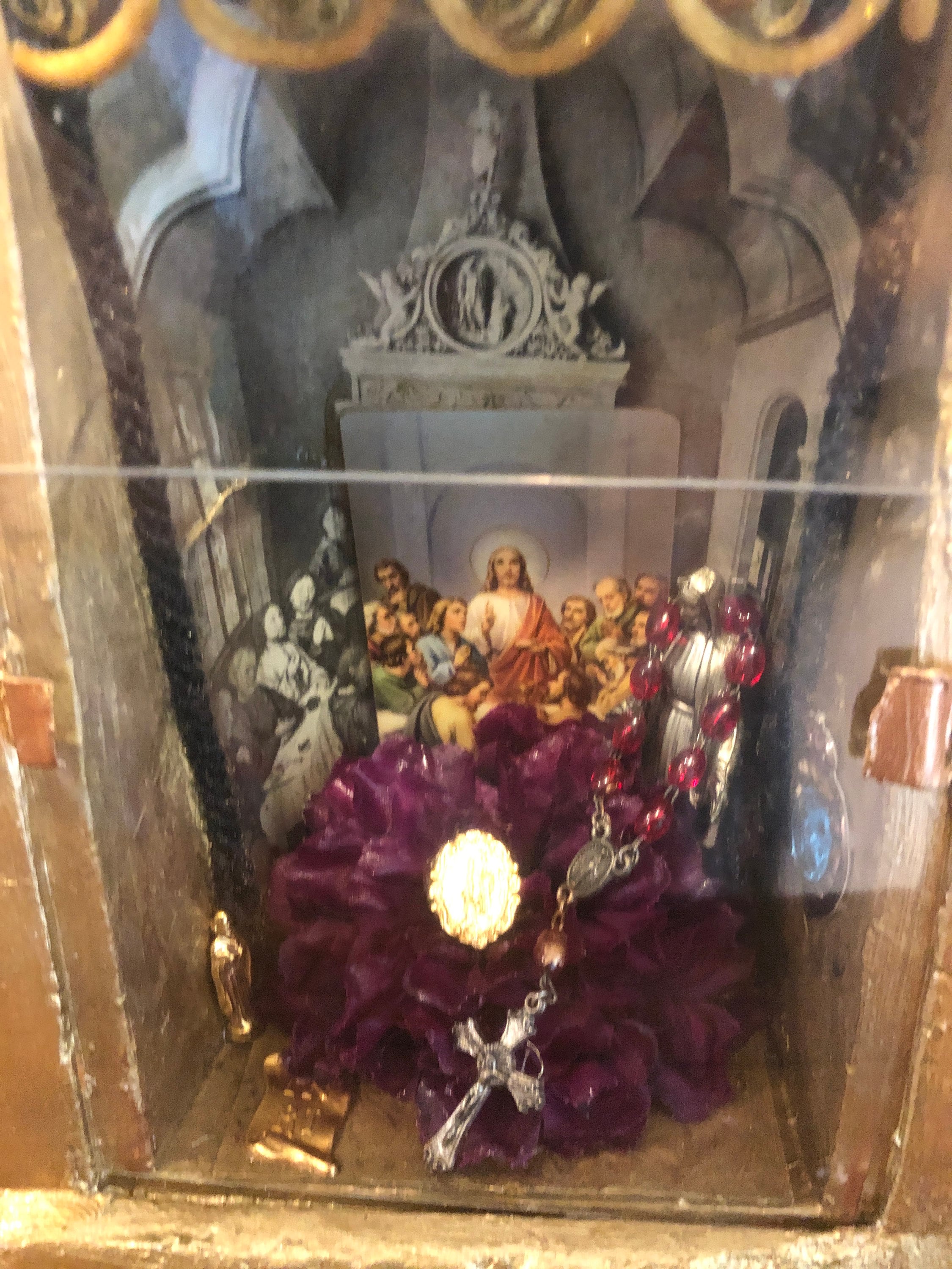 Back : Diorama sits behind a cover which is plastic and held in with 2 gold metal tabs .. This is fragile but I did not want to glue in place in consideration that you might have your own little icon to add . I can glue in place as the 2 tabs are very fragile. Inside: Black and White Print at background with Last Supper in center back . a Purple Fabric Flower has been stiffened in place with serveral small religious pieces: St Joseph , INRI and Our Lady of Fatima at center . Virgin Mary small figurine in silver with a small red beaded vintage chaplet is set in place .