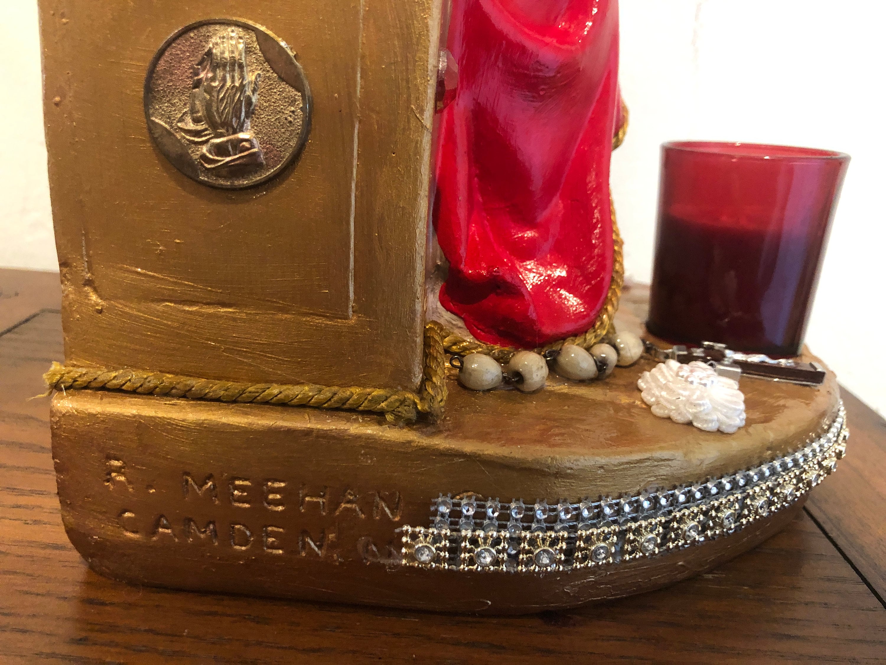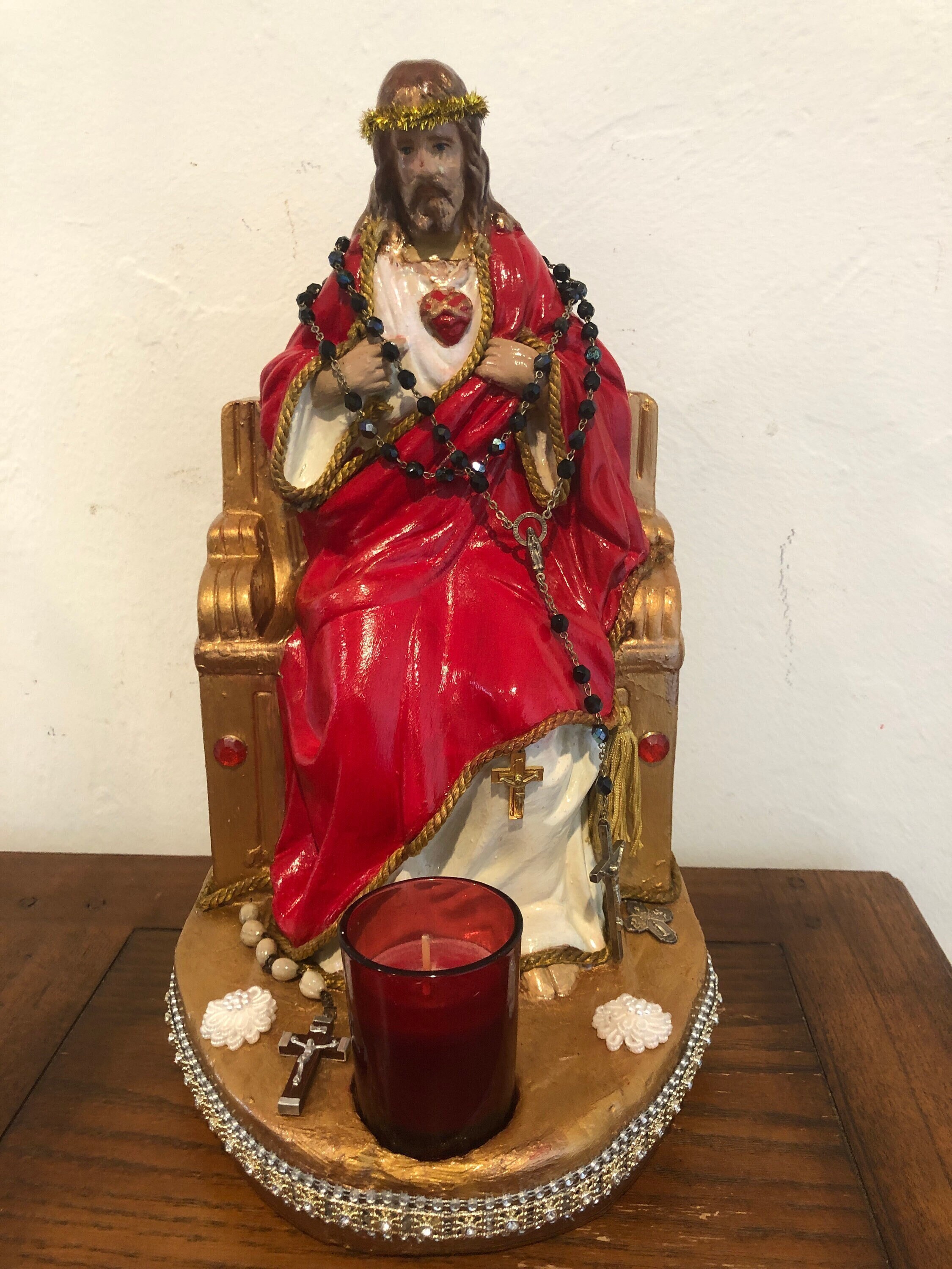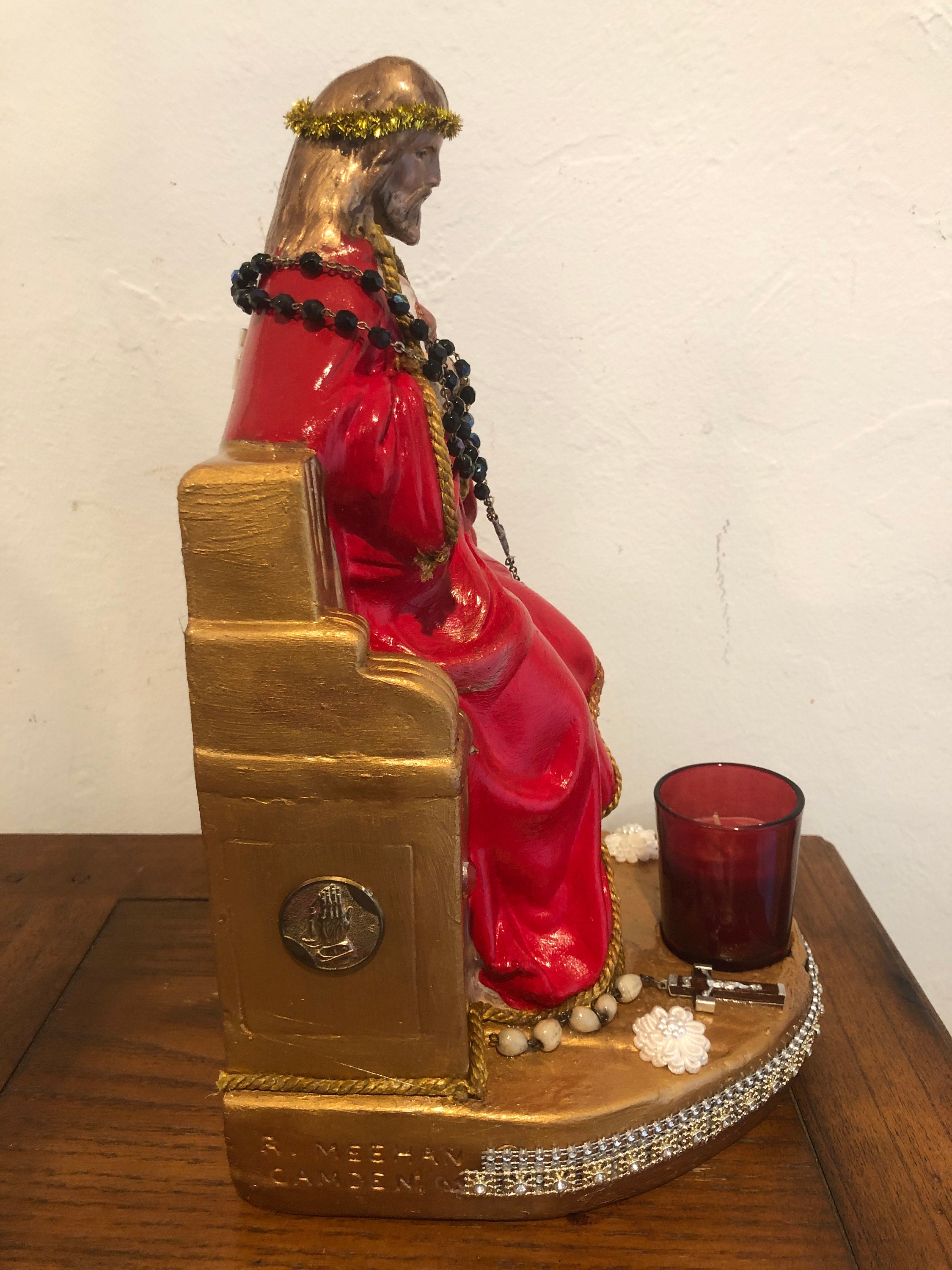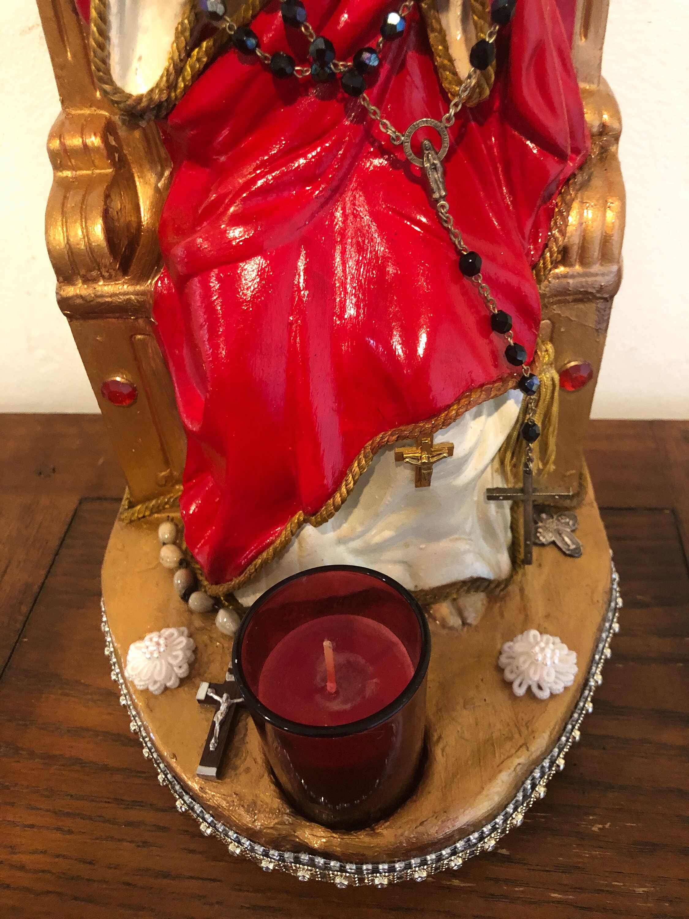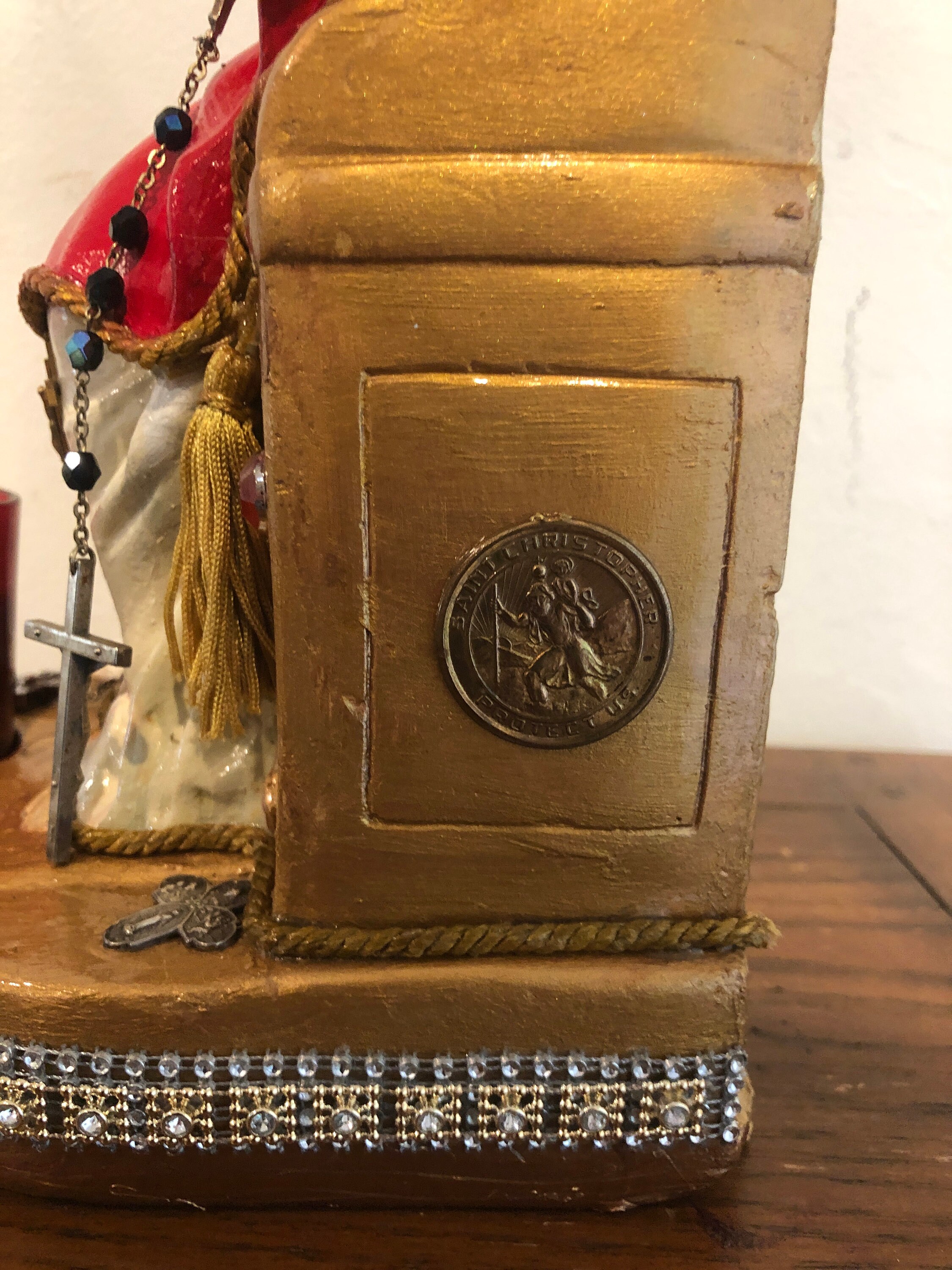 Throne is a metallic gold .. we used several color golds for a mottled color . Altar is trimmed in various bead trips around the front .. Note the front end and the flat surface are a little primitive .. Red Glass Votive candle is removeable. White Fabric Flowers , Small Chaplet and on right a small medal adds details to the flat surface . On each side of the throne - Metallic Vintage Praying Hands & other side : Saint Christopher protect us metal medallion . A small goldtone metal crucifix attached to the dress below the knee Rosary beads - Italy - Vintage - Back faceted beads ... can be removed or adjusted