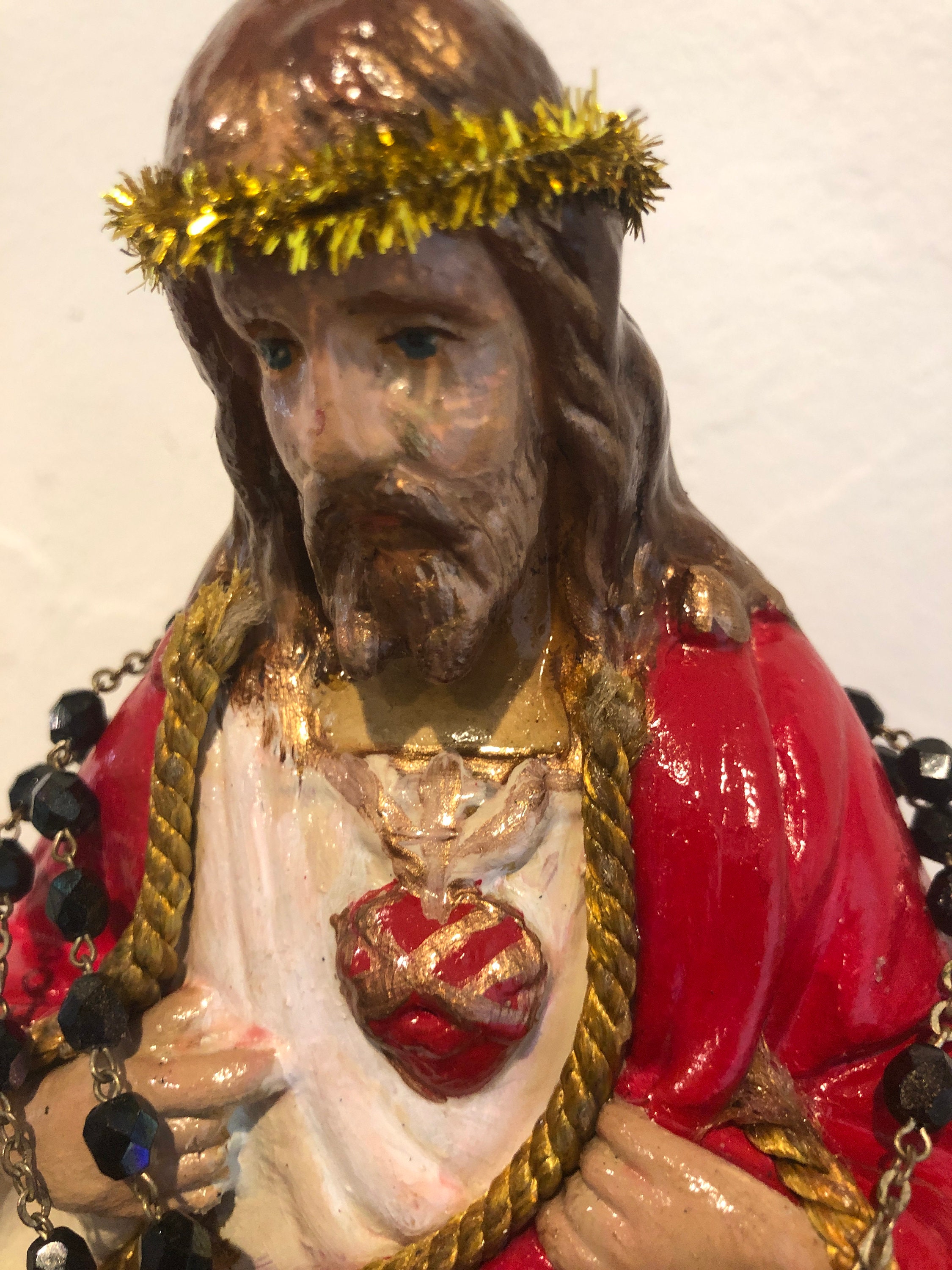 2nd Hand Revival takes antique and vintage religious statues that have had prior age use & discolor or damage and turns each piece into a unique piece of art ! Our pieces are not perfect and we don't want them to be perfect. We are 2nd Hand Revival as we bring back to life these beautiful vintage statues. We hand paint all details and add our personal touch of iconic embellishments. Statue is vintage a heavy solid chalkware /plaster . He came to us with lots of gouges and missing pieces of chalkware . you can see at front where the votive sits an uneven pattern on the surface . Very little paint left on him and at back was nothing but the 2 metal clips you see holding in the plastic cover on the diorama .. We hope you can offer him a new life as he really is a beautiful piece of art !