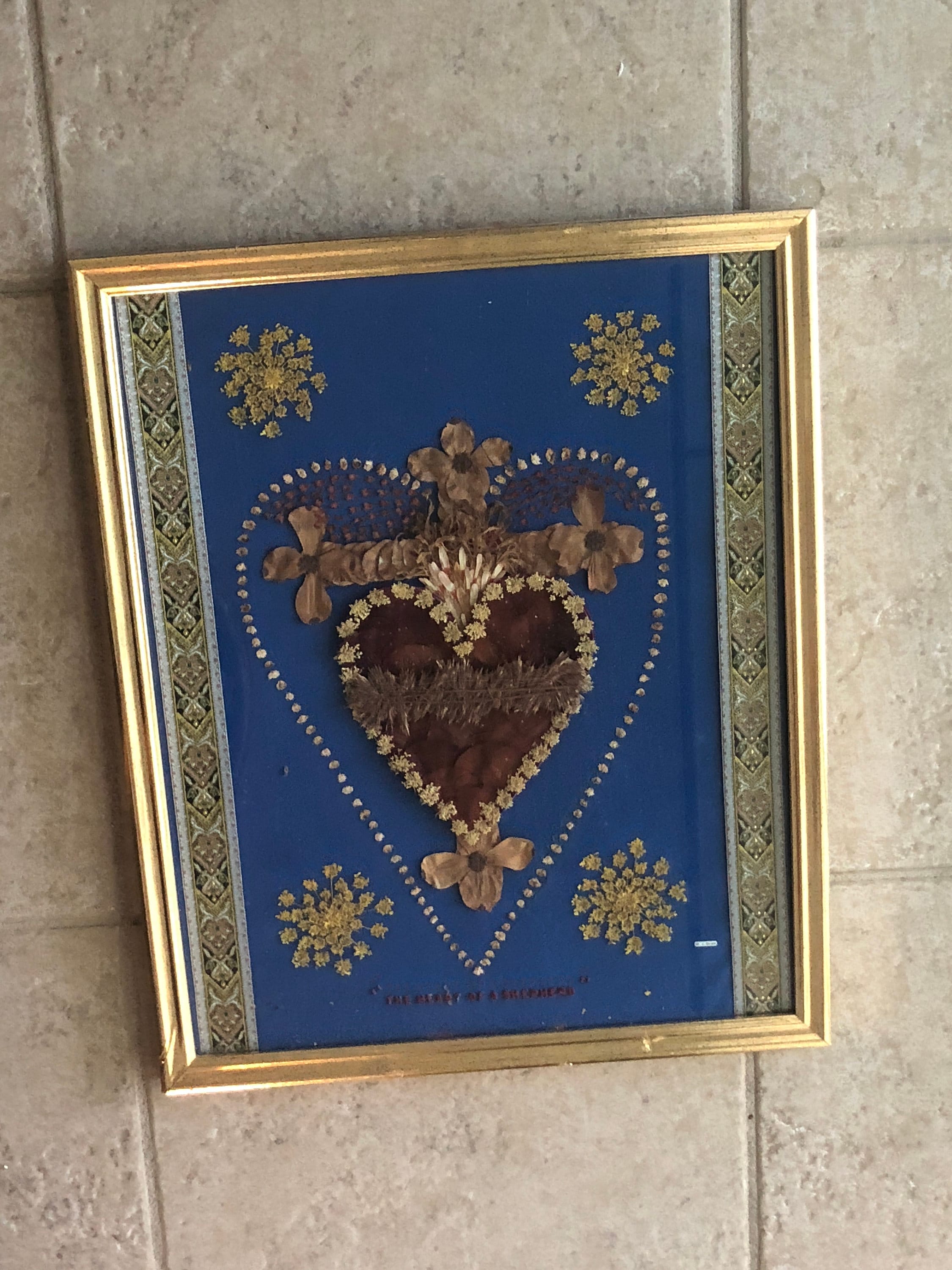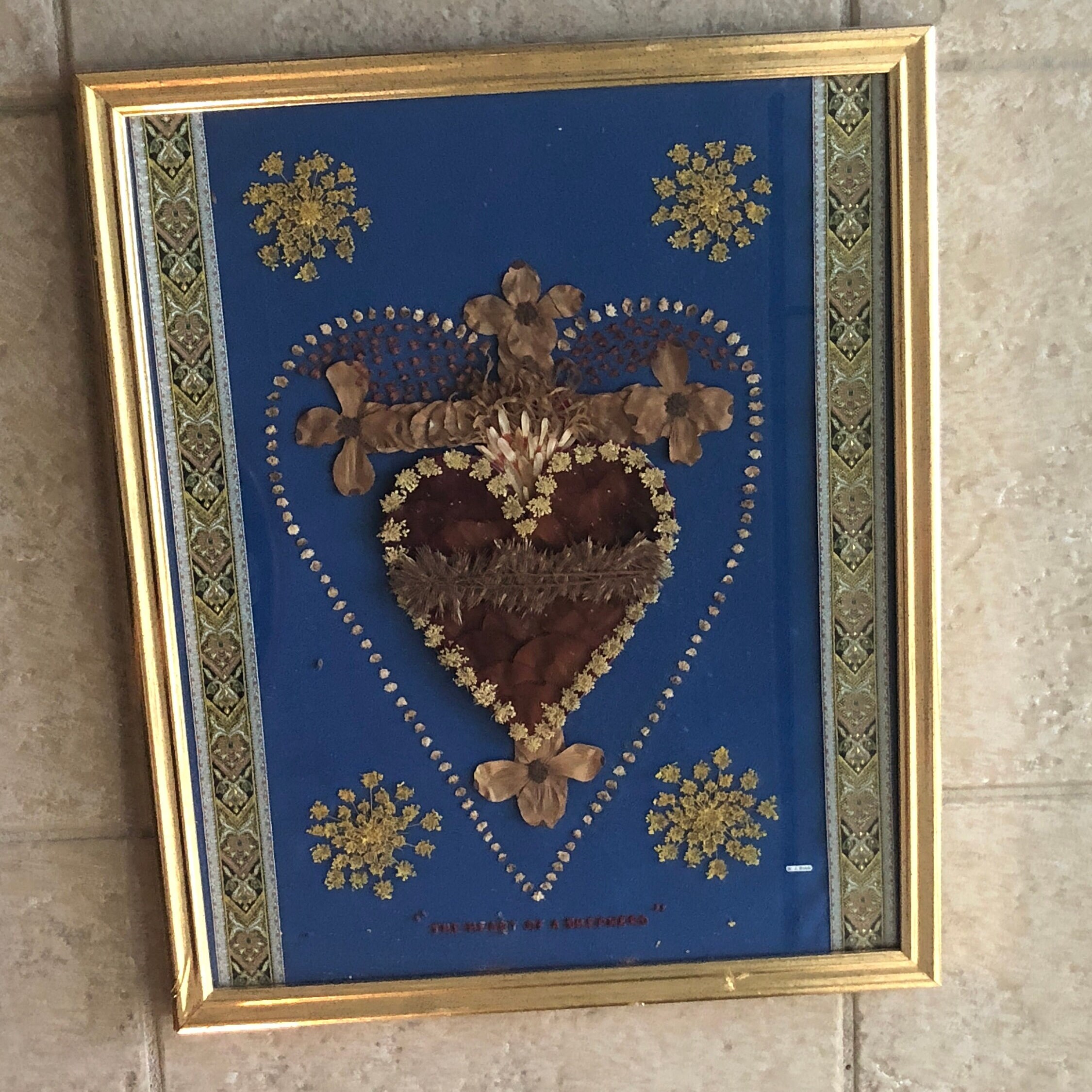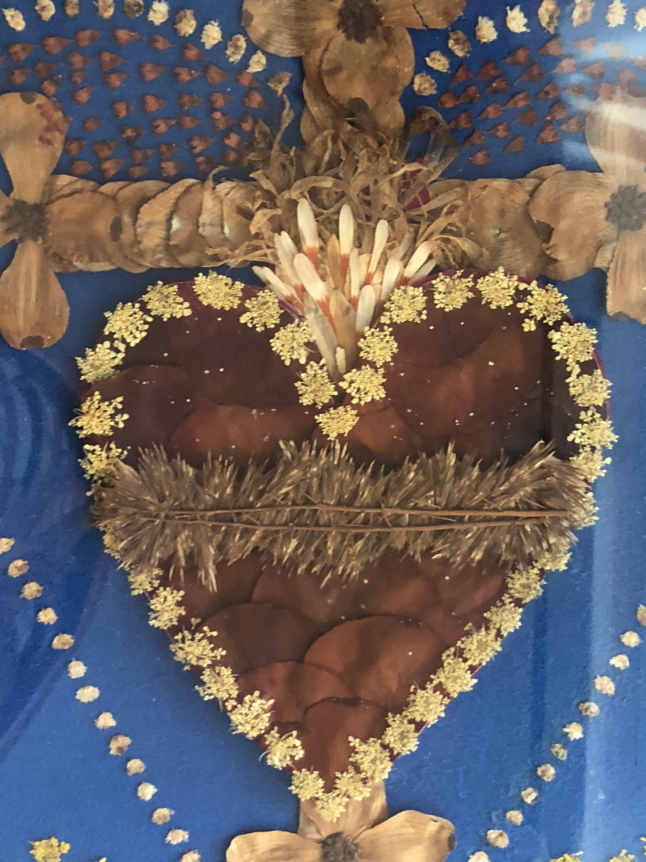 Sacred Heart in Dried Flowers with dried flower accents and ornate ribbons on each side . Blue Felt Fabric Background