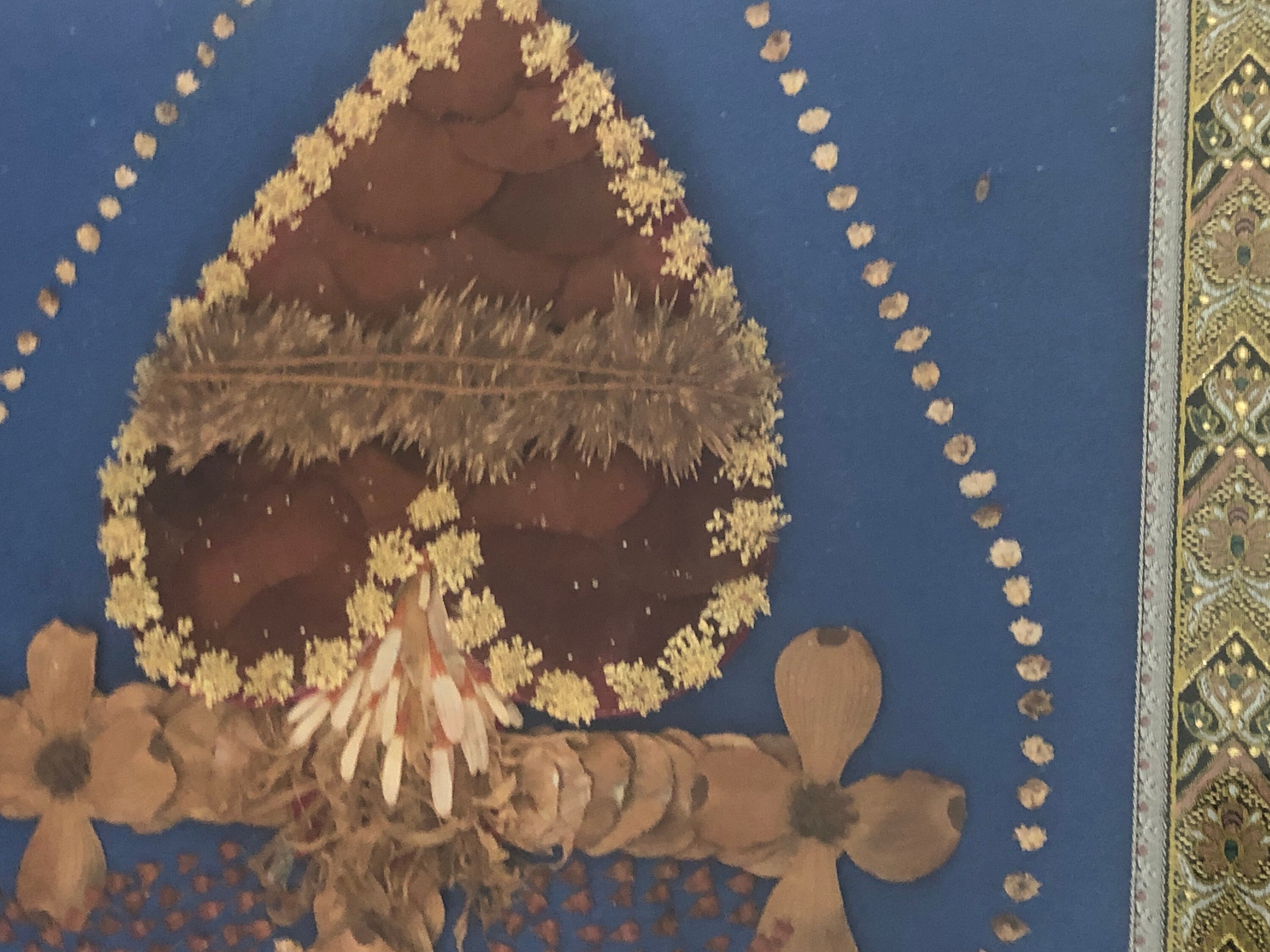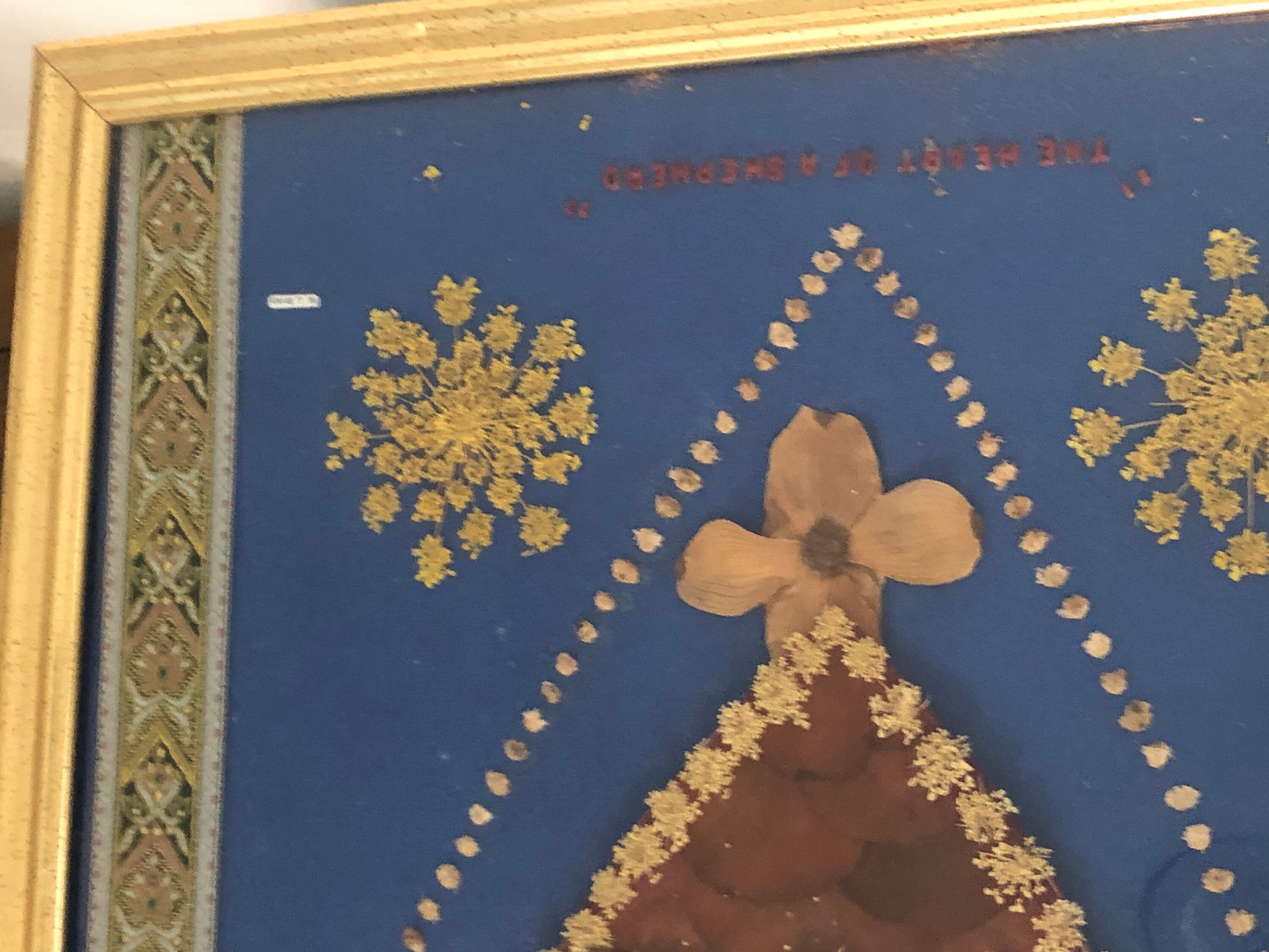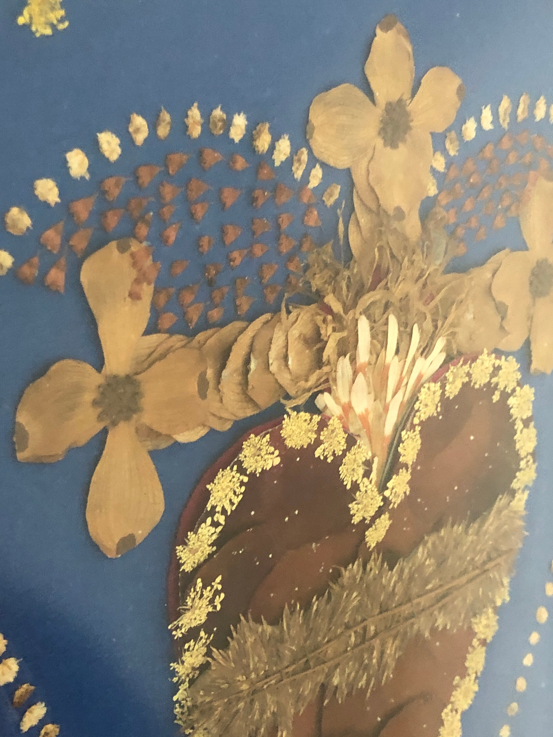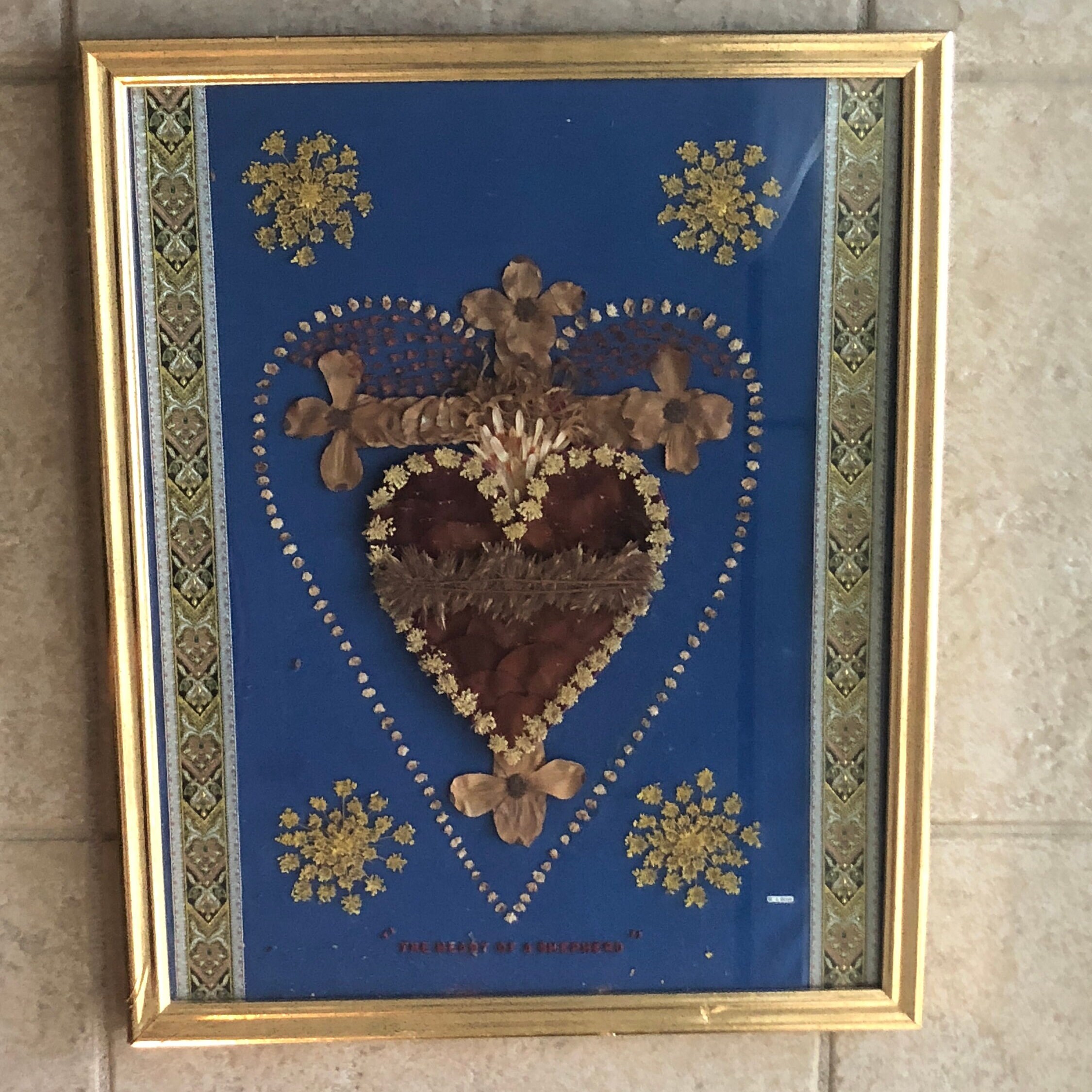 Sacred Heart in Dried Flowers with dried flower accents and ornate ribbons on each side . Blue Felt Fabric Background
