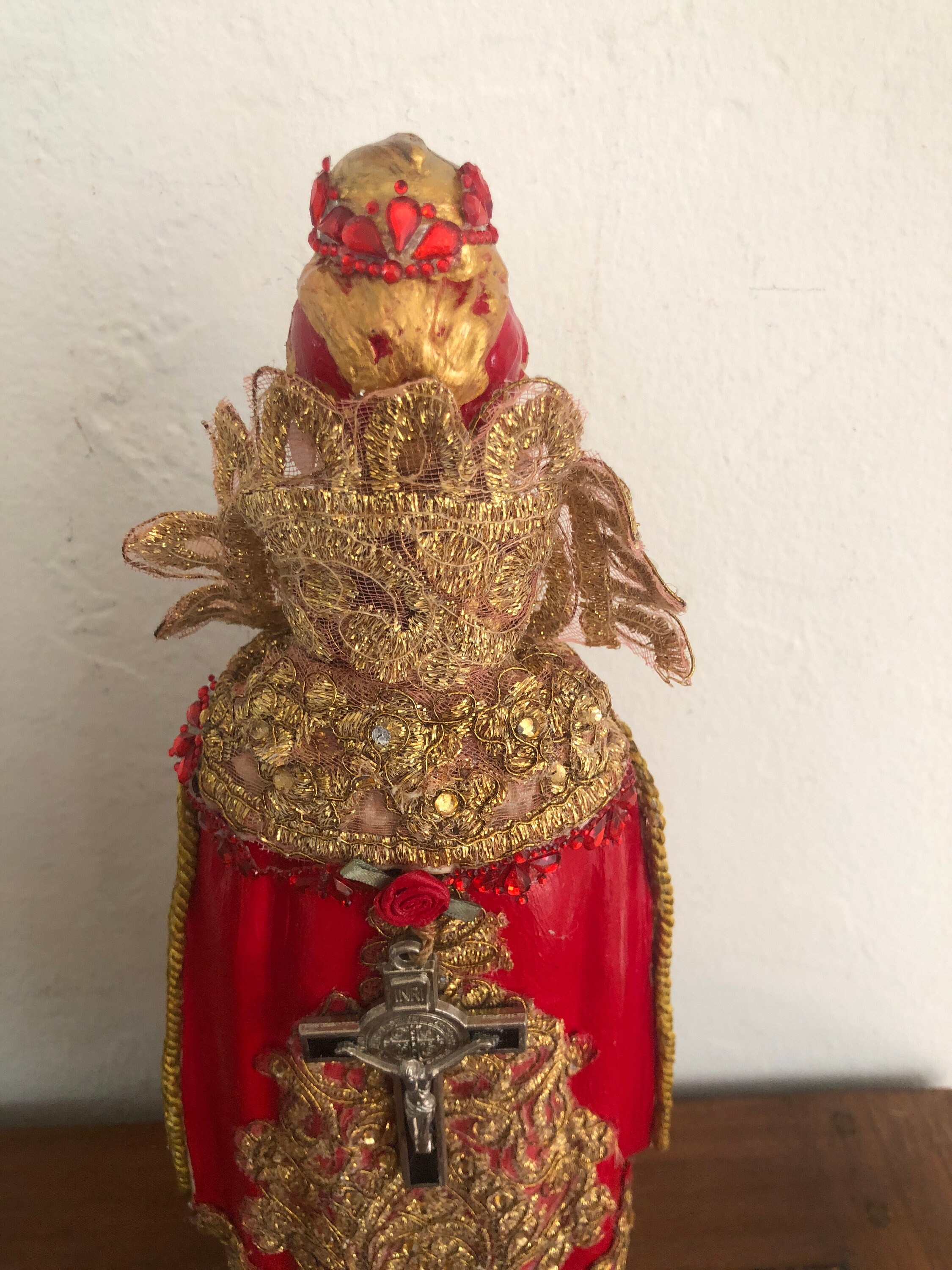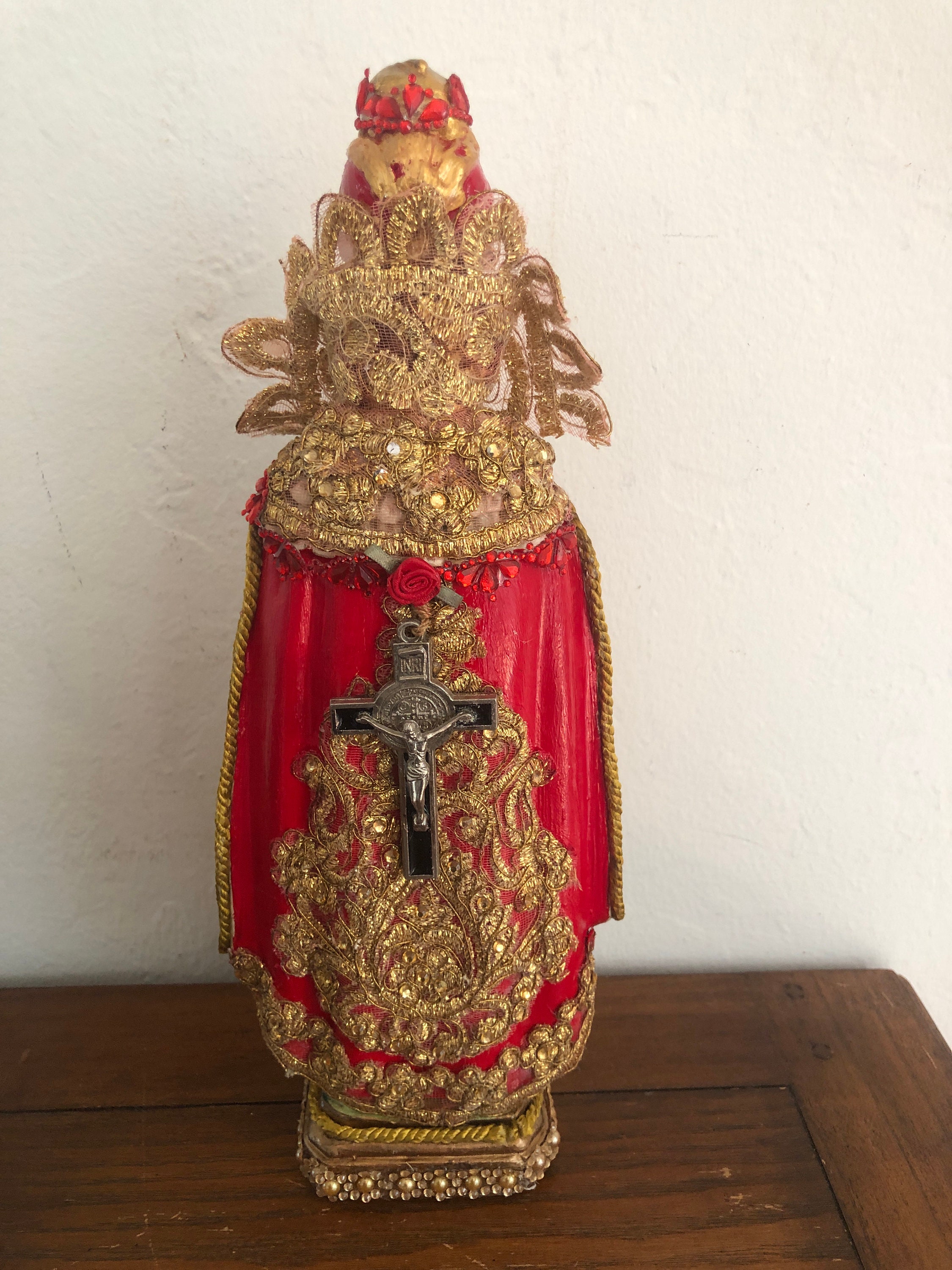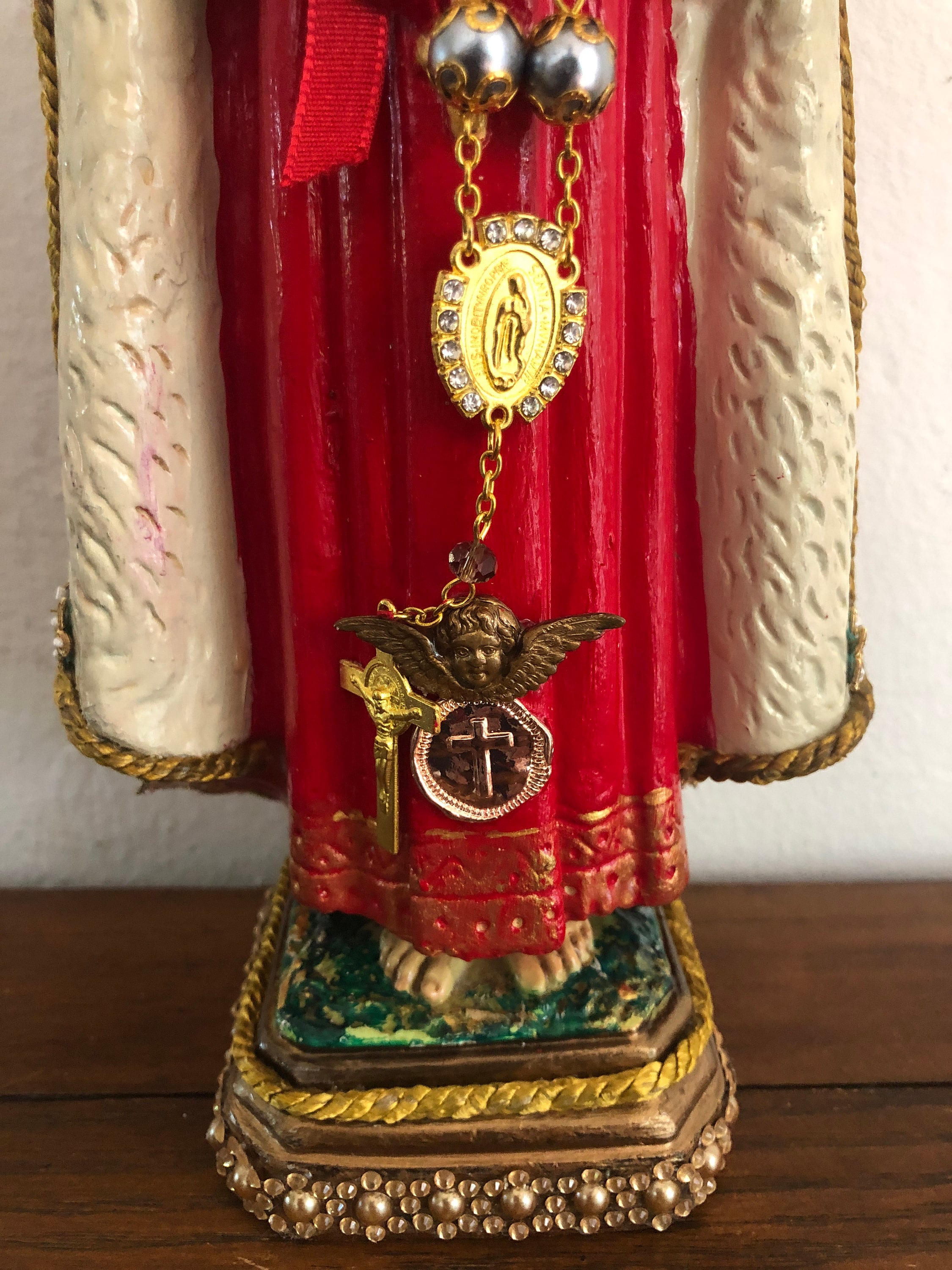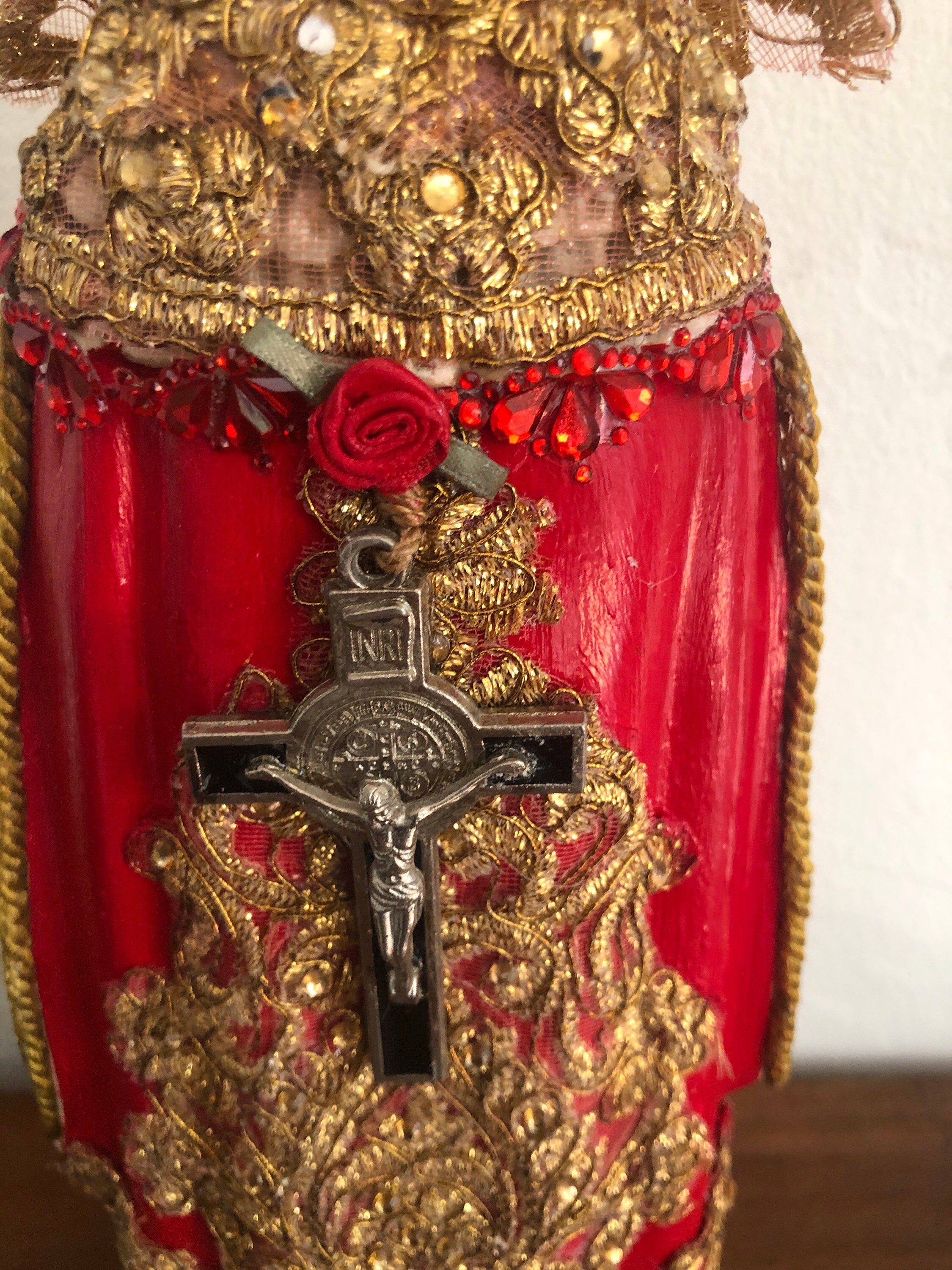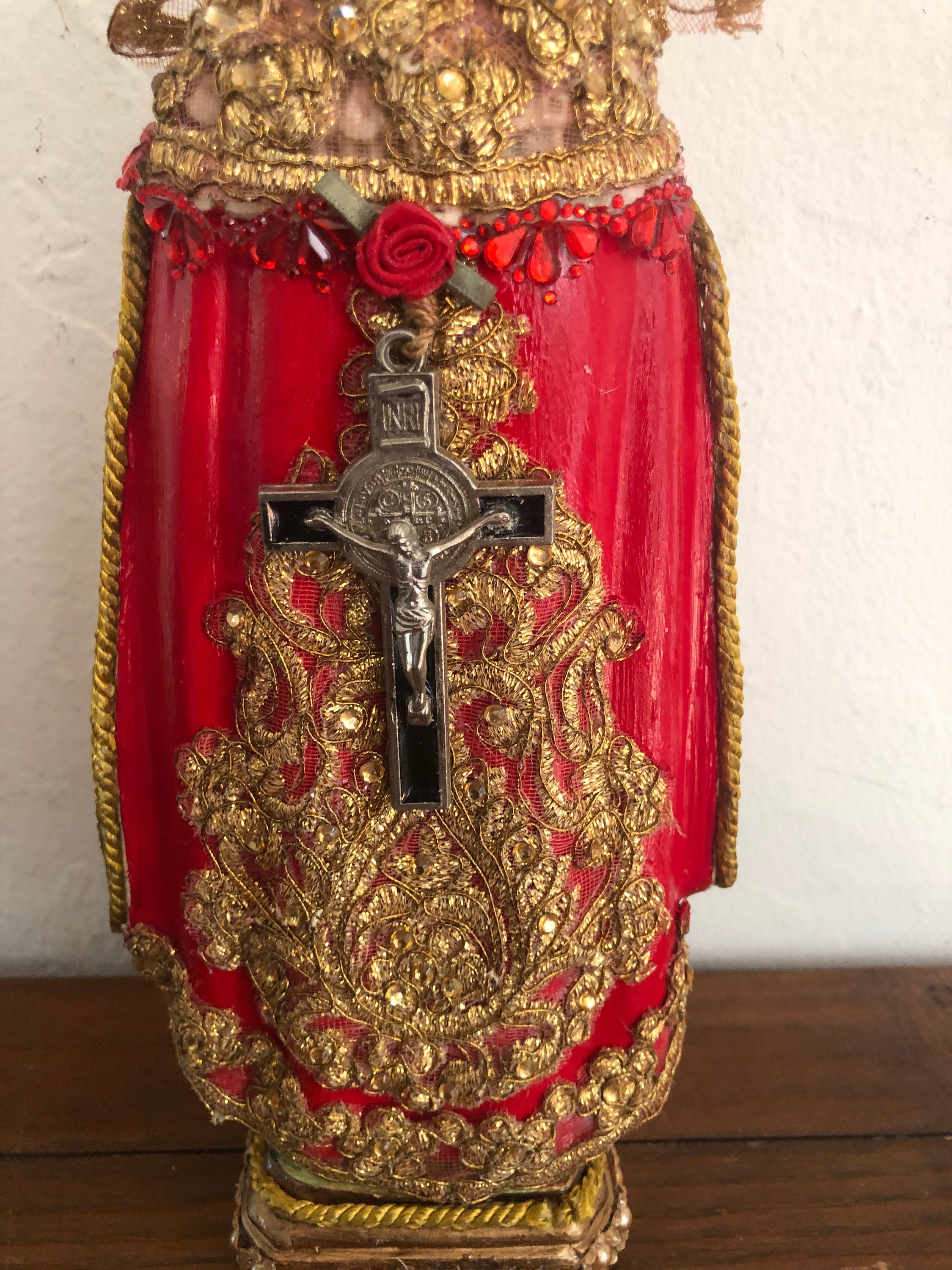 Artistic Style in colors This is our Red Dress Robe and Cape .. with Fabric Antique Gold Rope Trim . Collar with a Gold Metallic Lace . Infant of Prague holds a Large Crown Brooch with clear stones . ( not removeable ) Gray Silver Bead Chaplet in a gold tone metal and embossed Virgin Mary surrounded by rhinestones and a Gold Metal Embossed Crucifix . Small Iconic Religious pieces adorn the statue as well as some flowers and red velvet ribbon on the pin of the brooch . Note the faux red stone accents on the back of the cape and at top of the crown . Back of the piece is beautiful with matching gold metallic lace and a large metallic Crucifix .