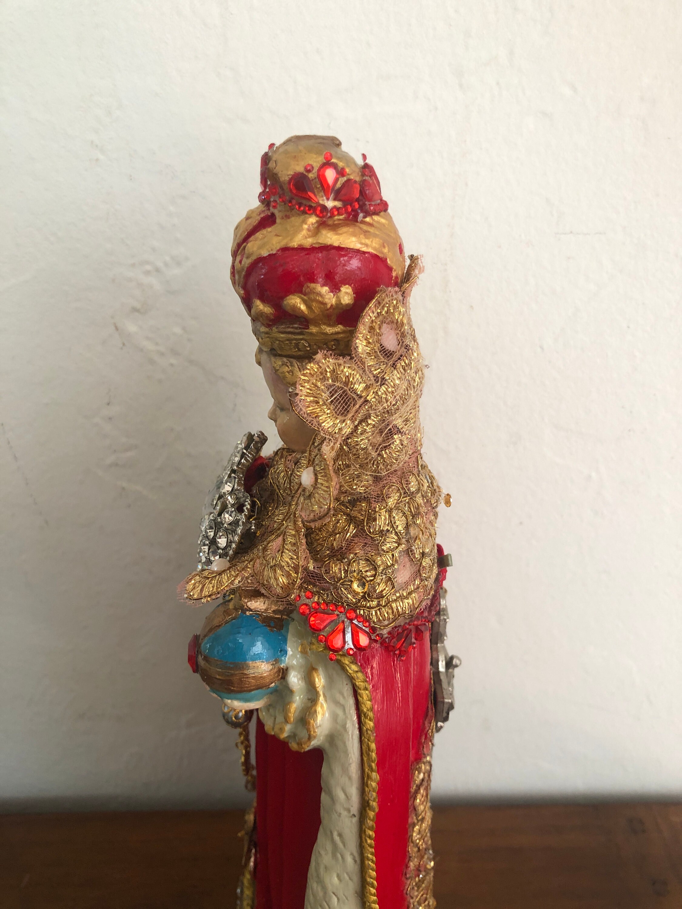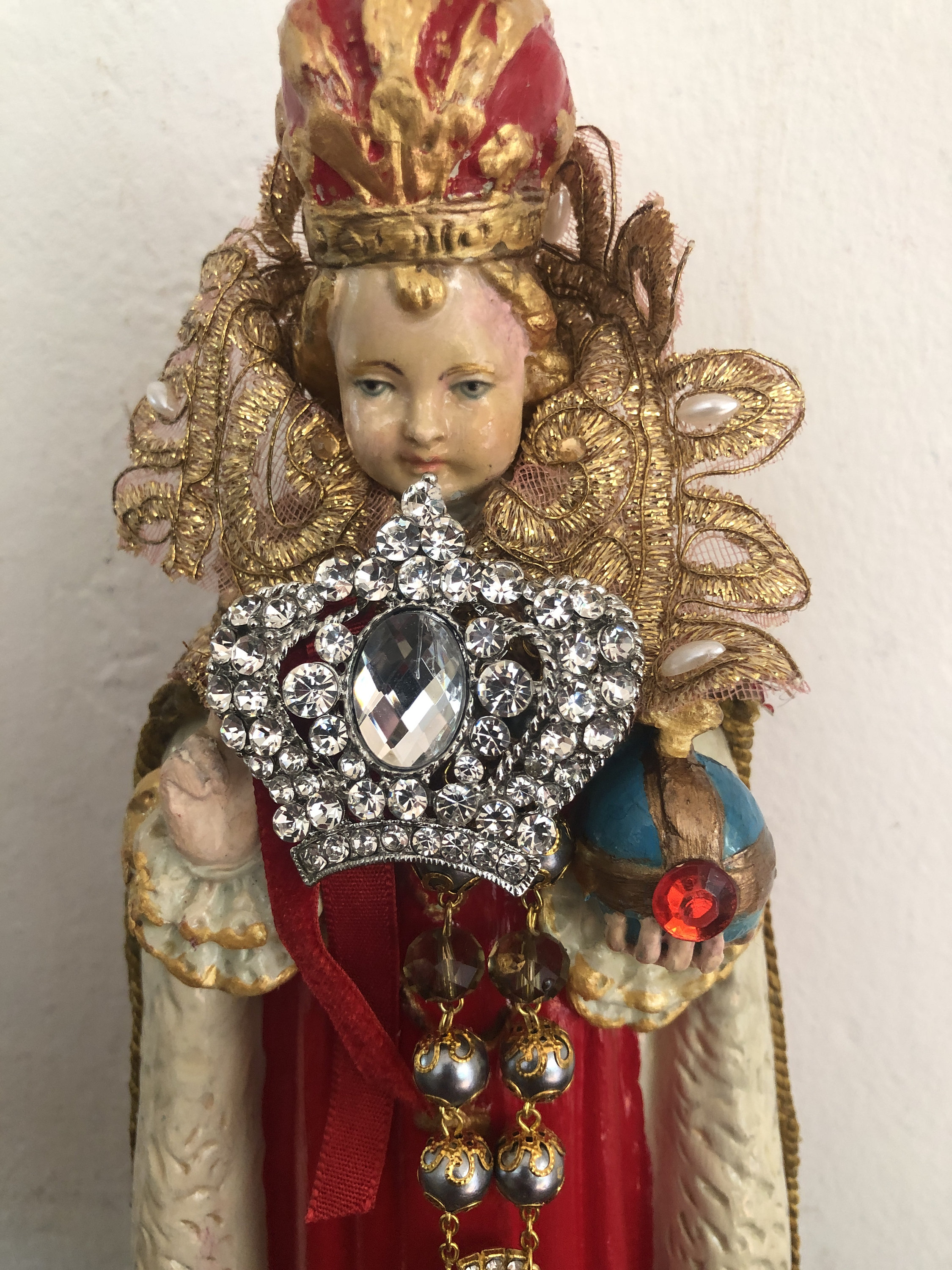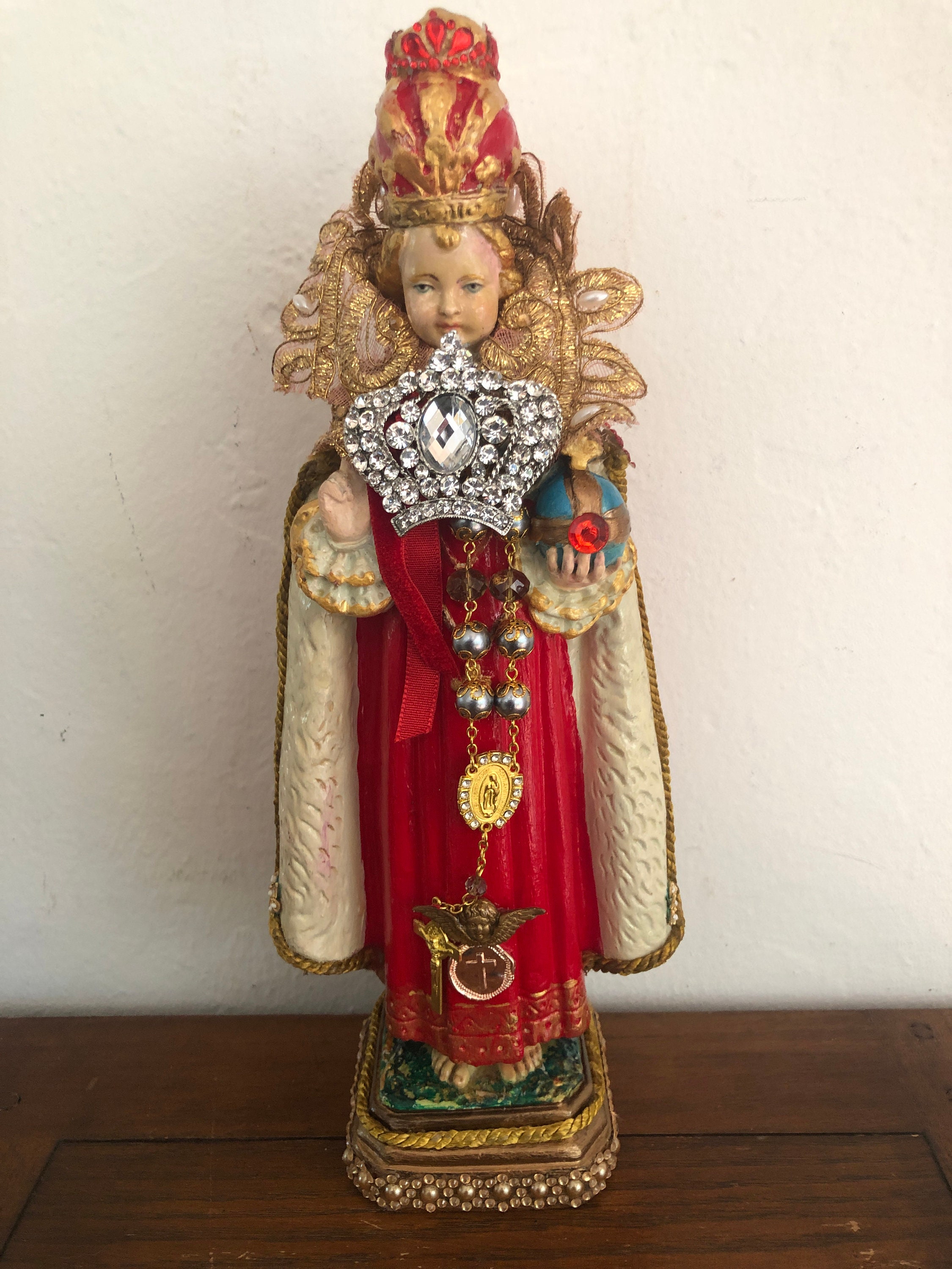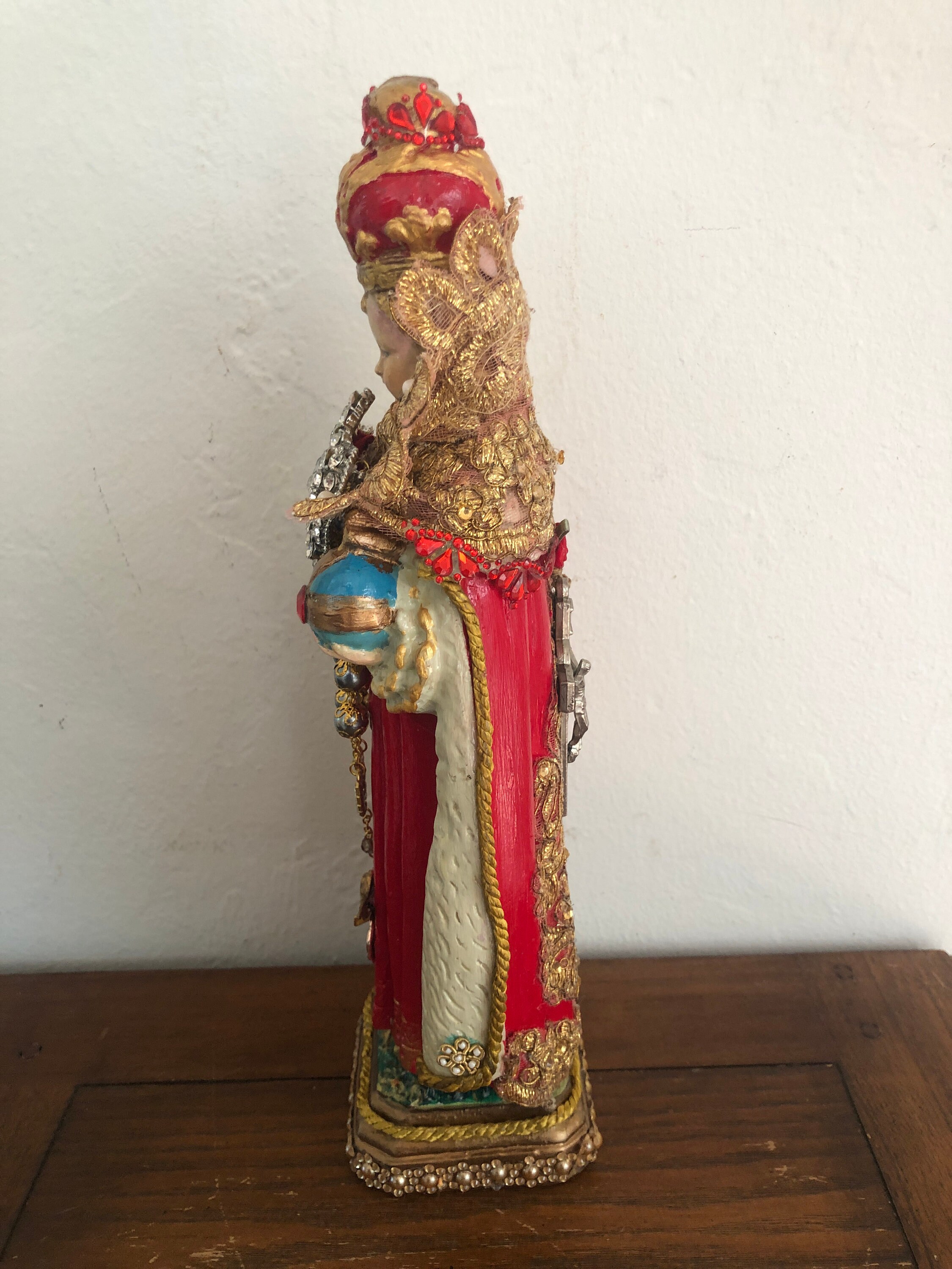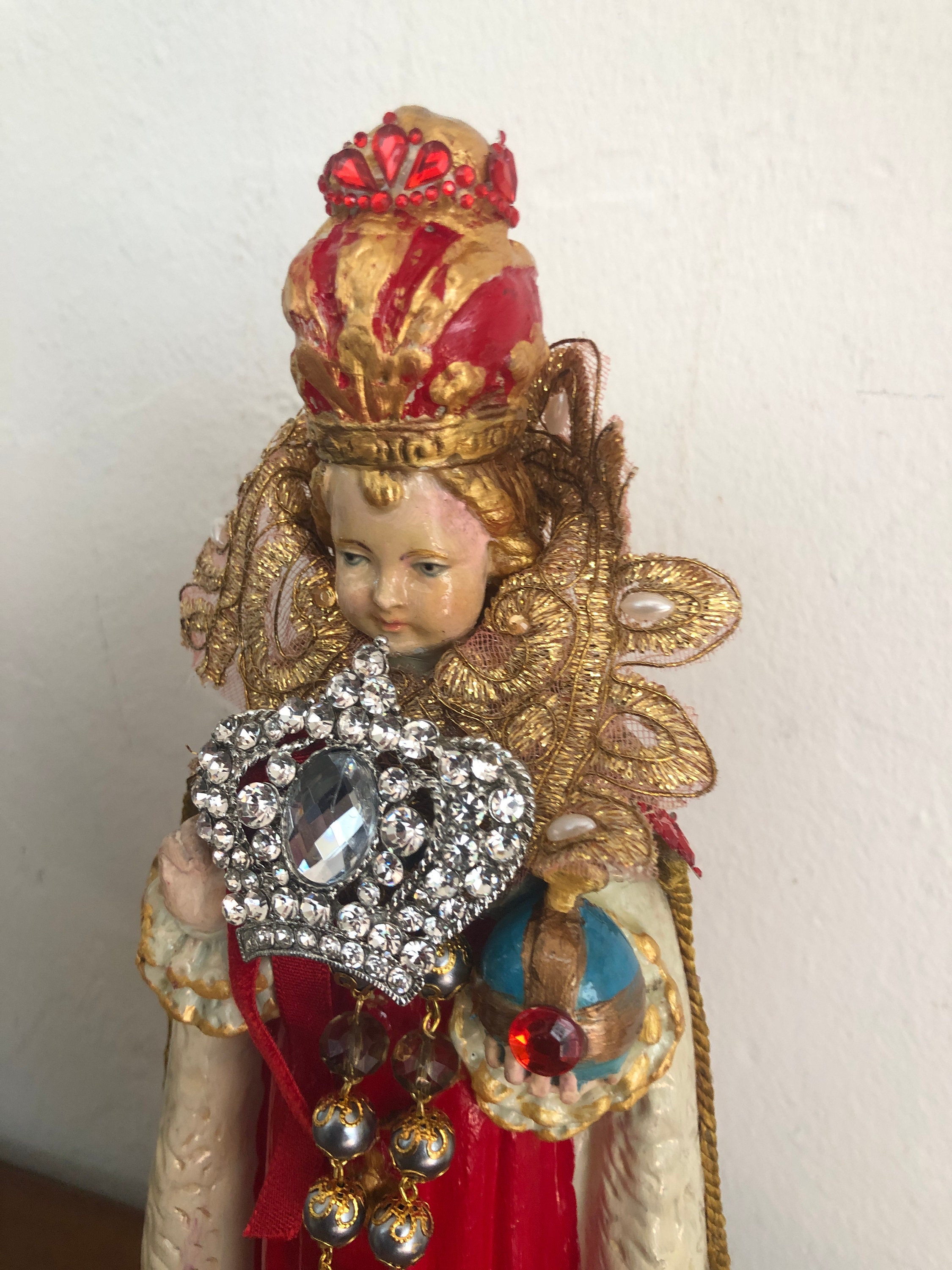 Infant of Prague Devotional Art Statue by 2nd Hand Revival Art Gallery Devotional Art - One of a Kind !! 2nd Hand Revival takes old vintage religious statues that have had prior age use & discolor or damage and turns each piece into a unique piece of art ! Our pieces are not perfect and we don't want them to be perfect. We are 2nd Hand Revival as we bring back to life these beautiful old statues. This piece came to us just in poor condition . It was very chipped and very little paint on the original surface .. We hand paint all details and add our personal touch of iconic and unique one of a kind embellishments.
