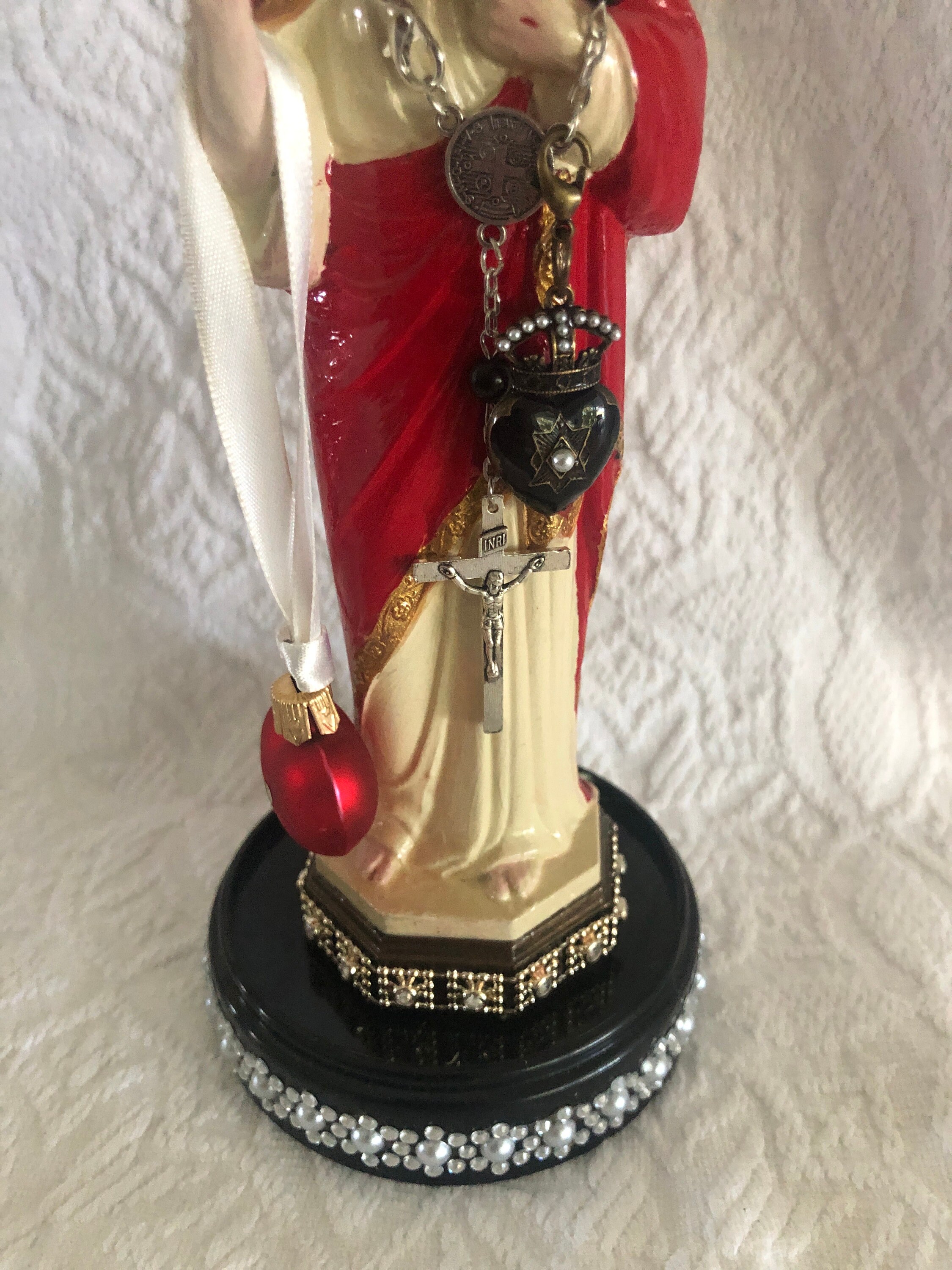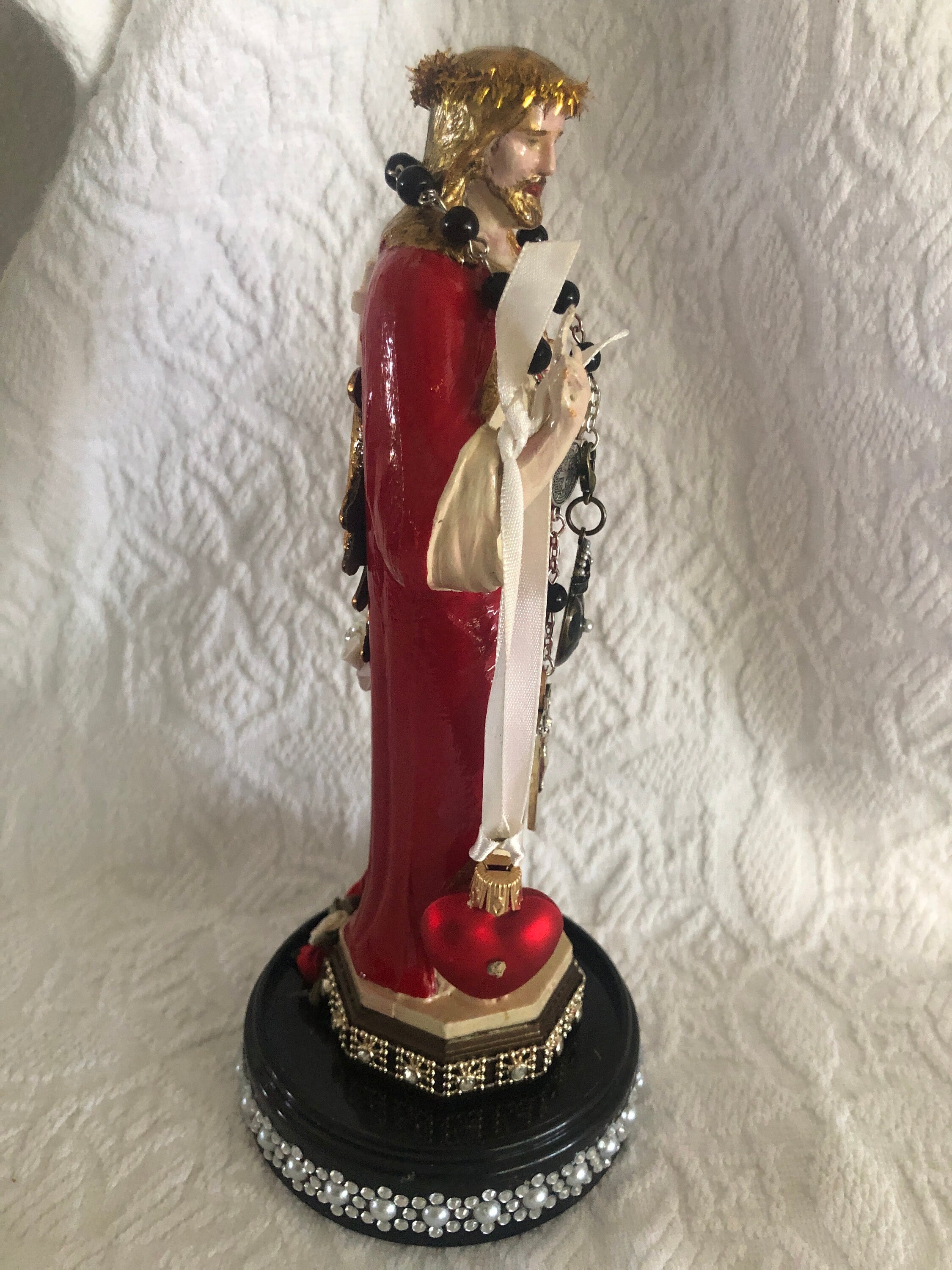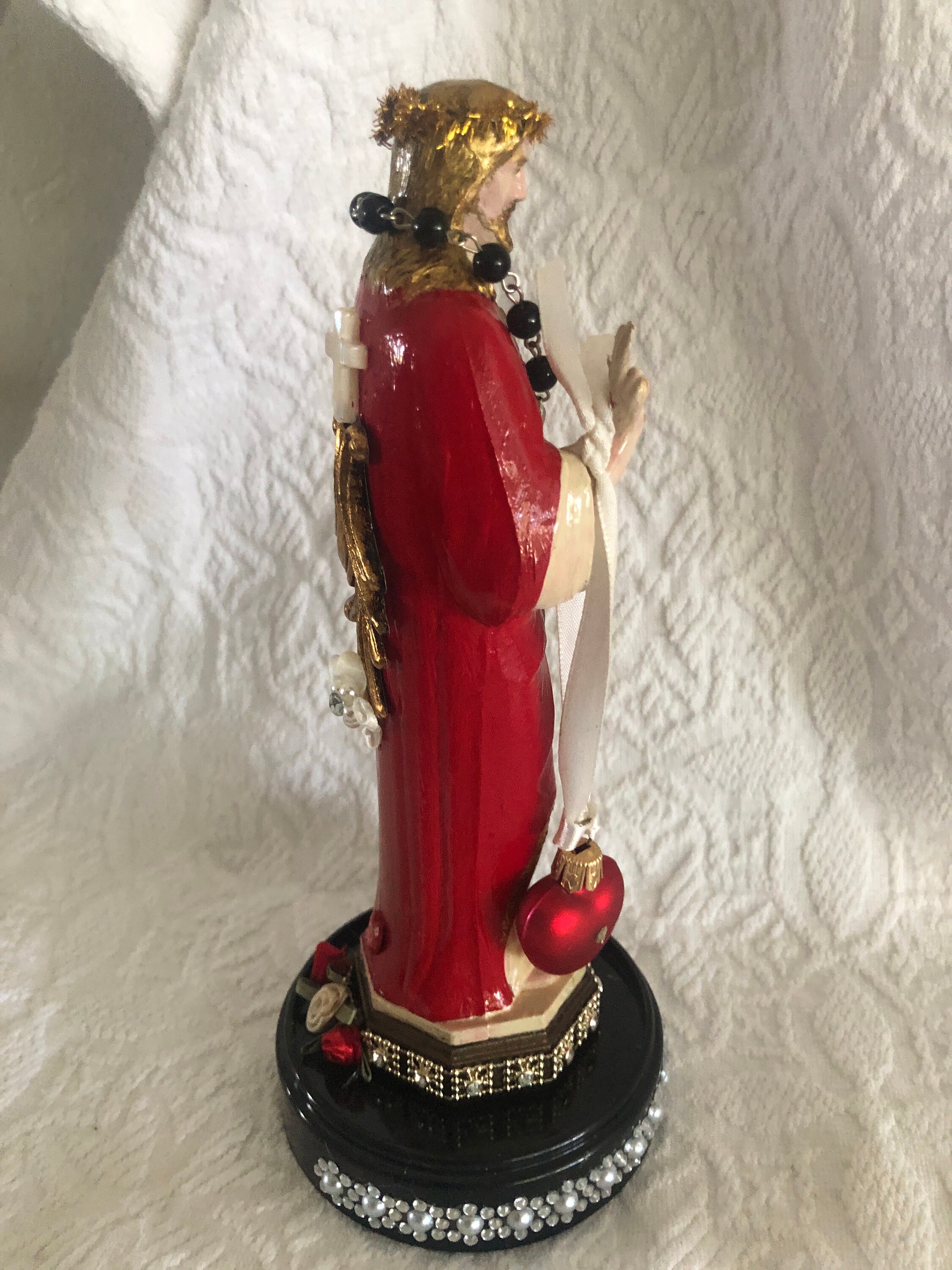 Sacred Heart Jesus Art Statue with Black Chaplet and Red Heart Artist Statue - Devotional Art from 2nd Hand Revival Art Studios. Hoping each unique hand made piece brings you happiness . Add a small votive candle in front for extra accent to this piece. We find vintage and antique religious iconic statues, figurines and altars that are damged, broken and in disrepair , worn or just discarded , Our creative teams brings each one back to life.. This is why we are called 2nd Hand Revival .. We recycle and upcycle each piece in our unique vision and offer each one a unique style in hopes they are offered a new home for many years to come . . One of a Kind - Each Made with TLC .. This plastic statue came with no paint. Painted in the artist rendering .. with Red and Soft Whilte colors. Gold Trim . Gossy Finish Jesus has a Black Chaplet and attached is a Black Metal and Enamel Heart Charm . Also a Red Heart on White Ribbon on the other hand ( removeable) Back , we added a few adornments as you see in the photos .