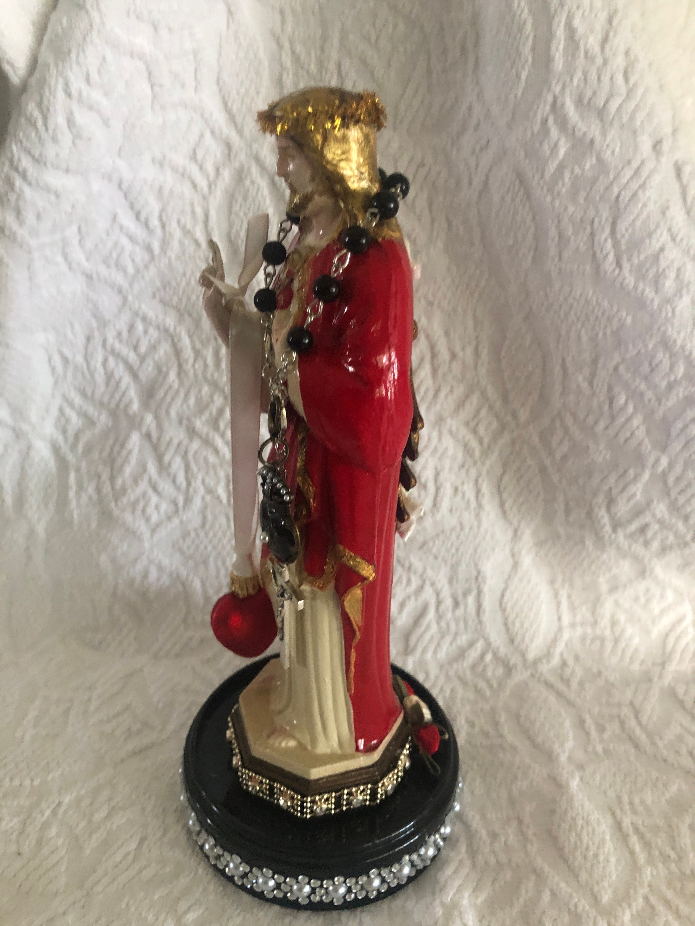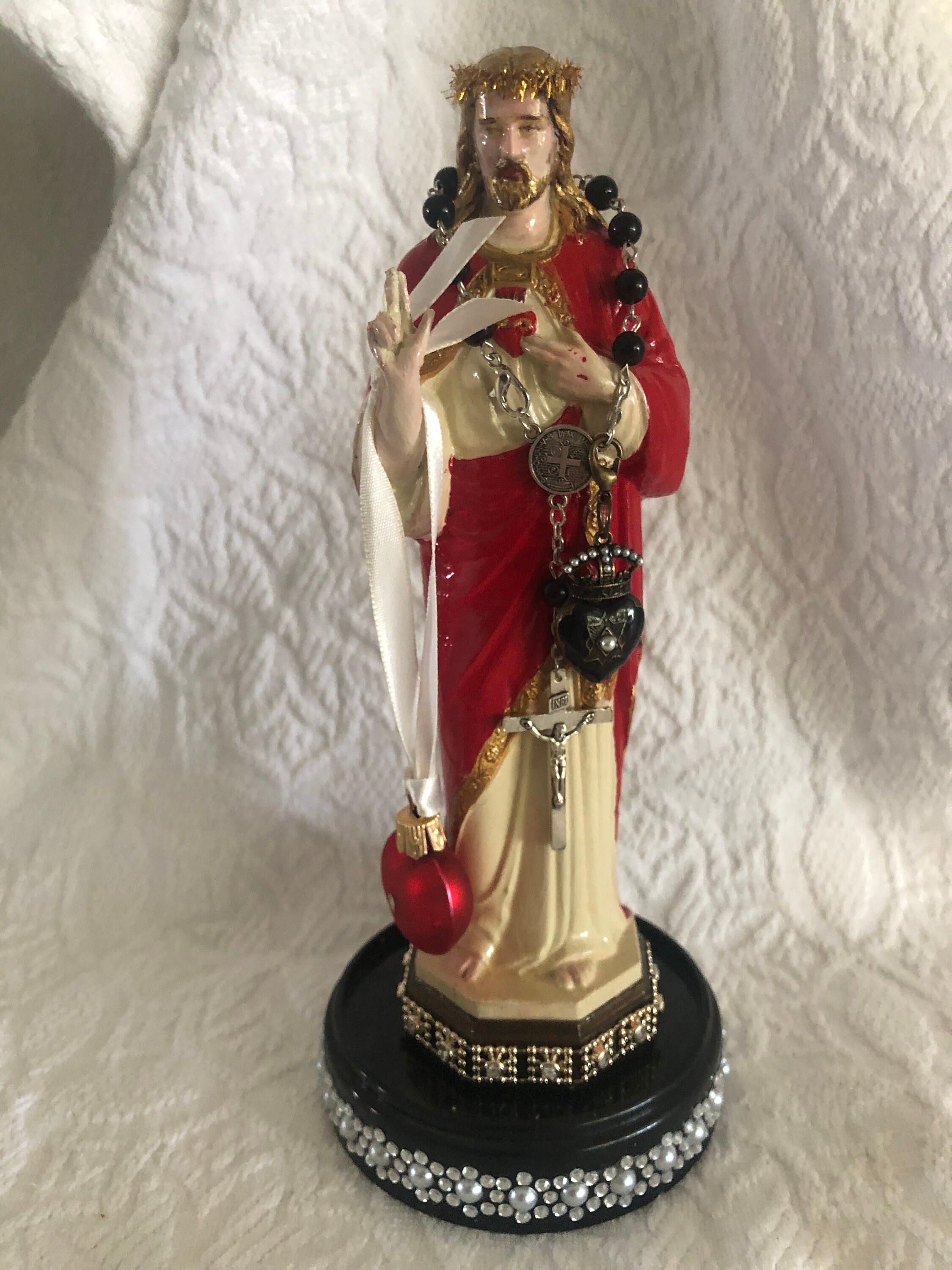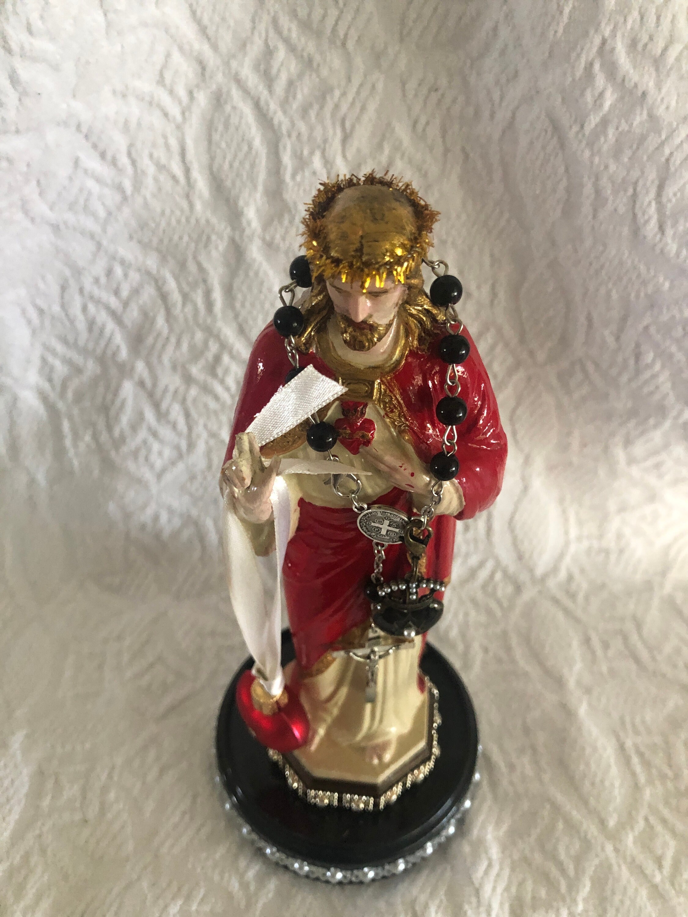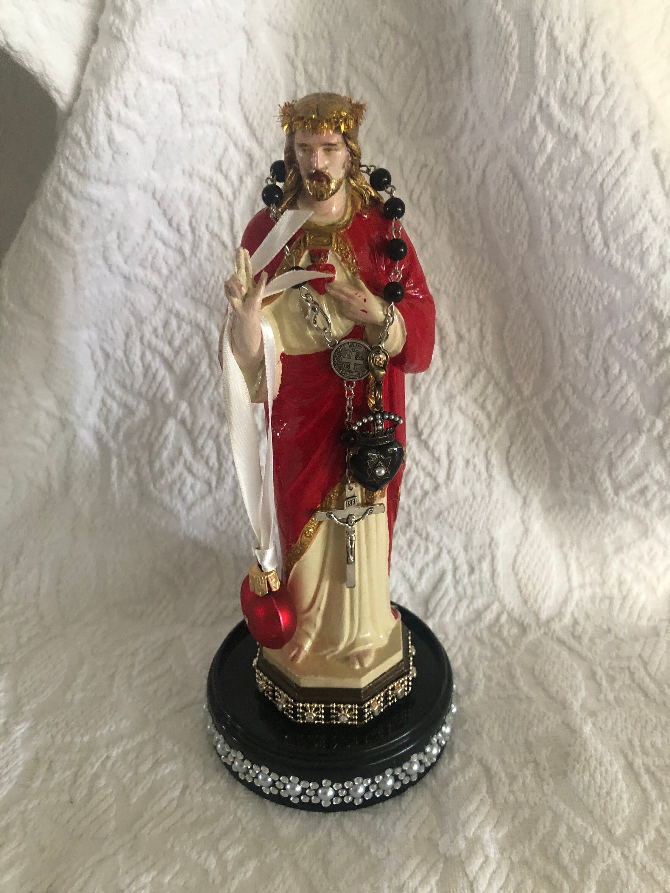Sacred Heart Jesus Art Statue with Black Chaplet and Red Heart Artist Statue - Devotional Art from 2nd Hand Revival Art Studios. Hoping each unique hand made piece brings you happiness . Add a small votive candle in front for extra accent to this piece. We find vintage and antique religious iconic statues, figurines and altars that are damged, broken and in disrepair , worn or just discarded , Our creative teams brings each one back to life.. This is why we are called 2nd Hand Revival .. We recycle and upcycle each piece in our unique vision and offer each one a unique style in hopes they are offered a new home for many years to come . . One of a Kind - Each Made with TLC .. This plastic statue came with no paint. Painted in the artist rendering .. with Red and Soft Whilte colors. Gold Trim . Gossy Finish Jesus has a Black Chaplet and attached is a Black Metal and Enamel Heart Charm . Also a Red Heart on White Ribbon on the other hand ( removeable) Back , we added a few adornments as you see in the photos .