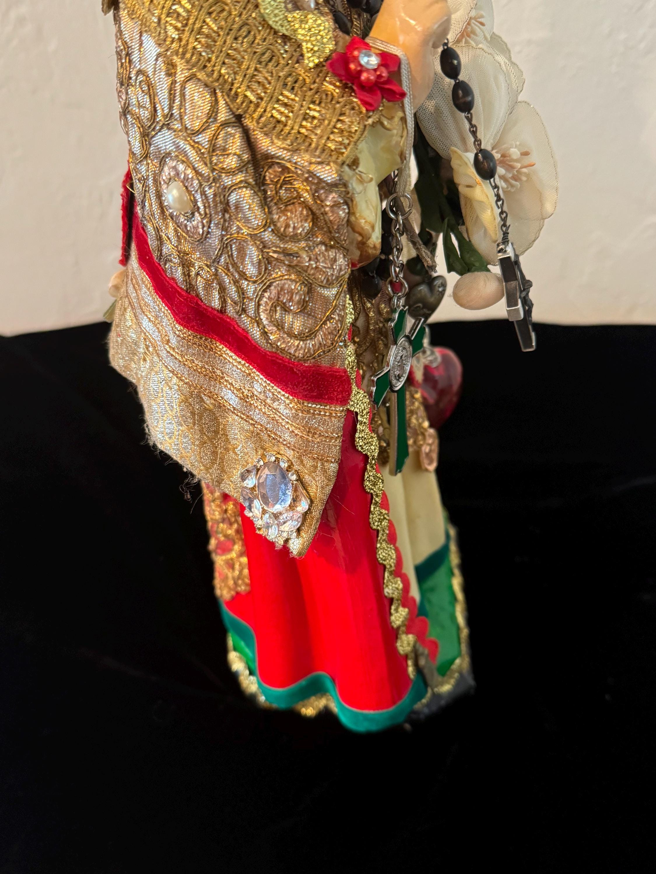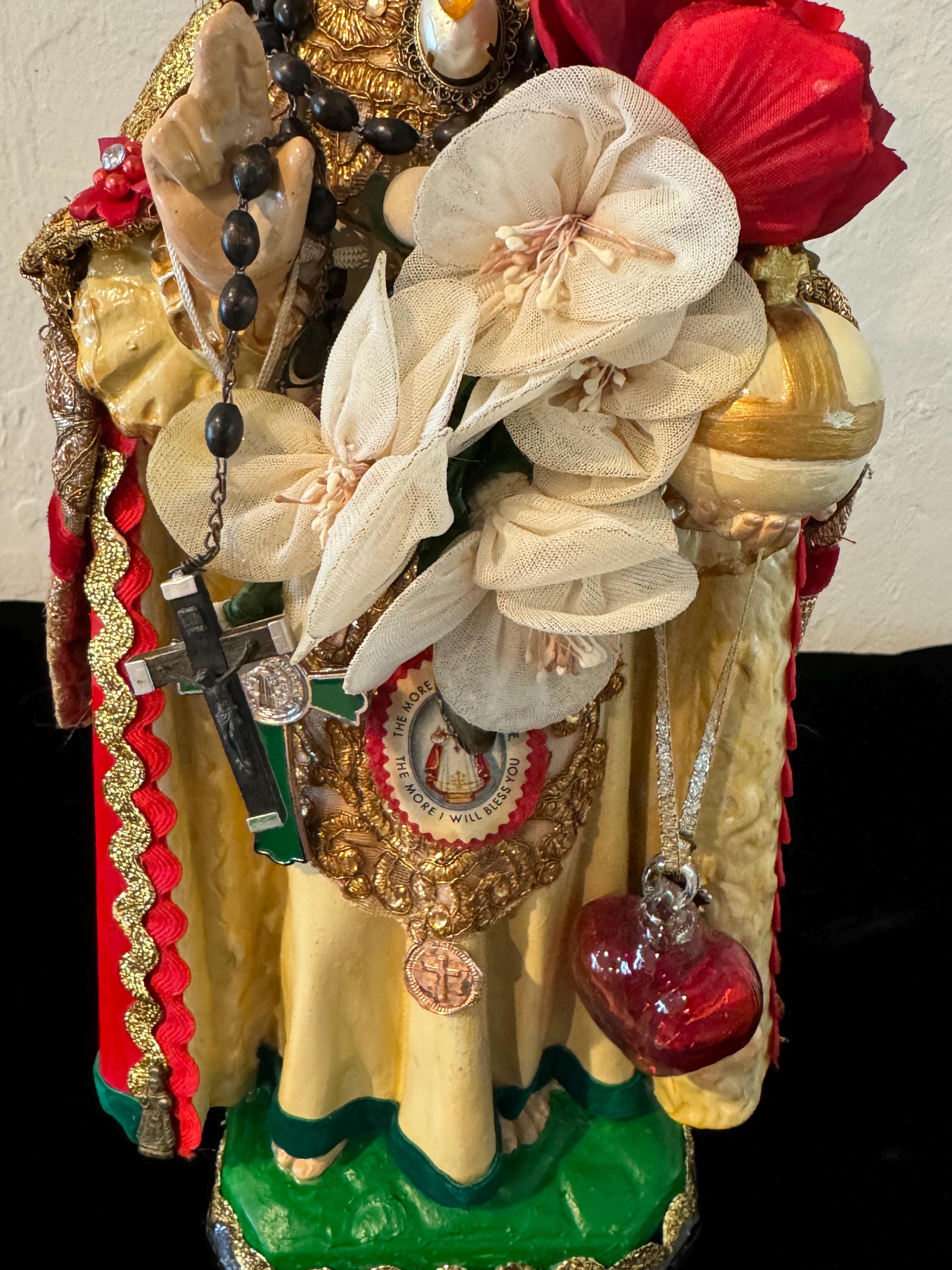 Vintage White Nylon Fabric Flower Boquet ( some age discolor) and a red poppy style fabric flower as well. Green Enameled over silver metal crucifix hangs on a silver right . Review the piece for all the small icons attached. Red Glass Heart hangs off gold metallic ribbon - Small Black Enameled Heart with see pearls is clipped to the gold ribbon . Black antique roasary from Italy and so many other small iconic pieces, Face has been softly painted in the original vintage colors Gold paint highlights the hair. Crown at top is gold metallic and a clear rhinestone Approximately Measures 18" Tall to top & 5" wide across base. Bottom is signed 2nd Hand Revival Art Studio by DavKat ( Resident Artist) 2024 see photos for details - handmade devotional art