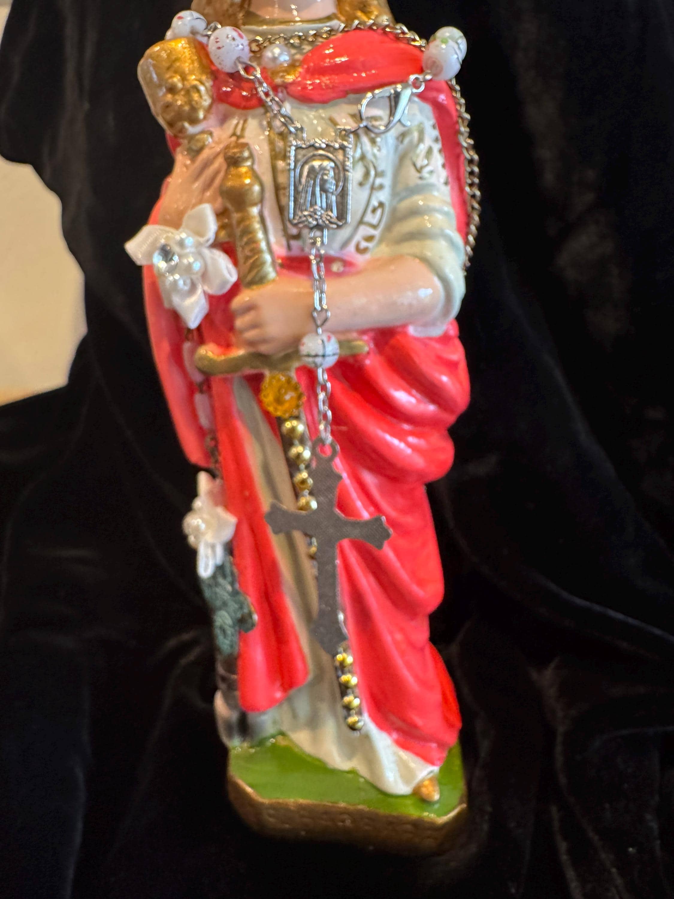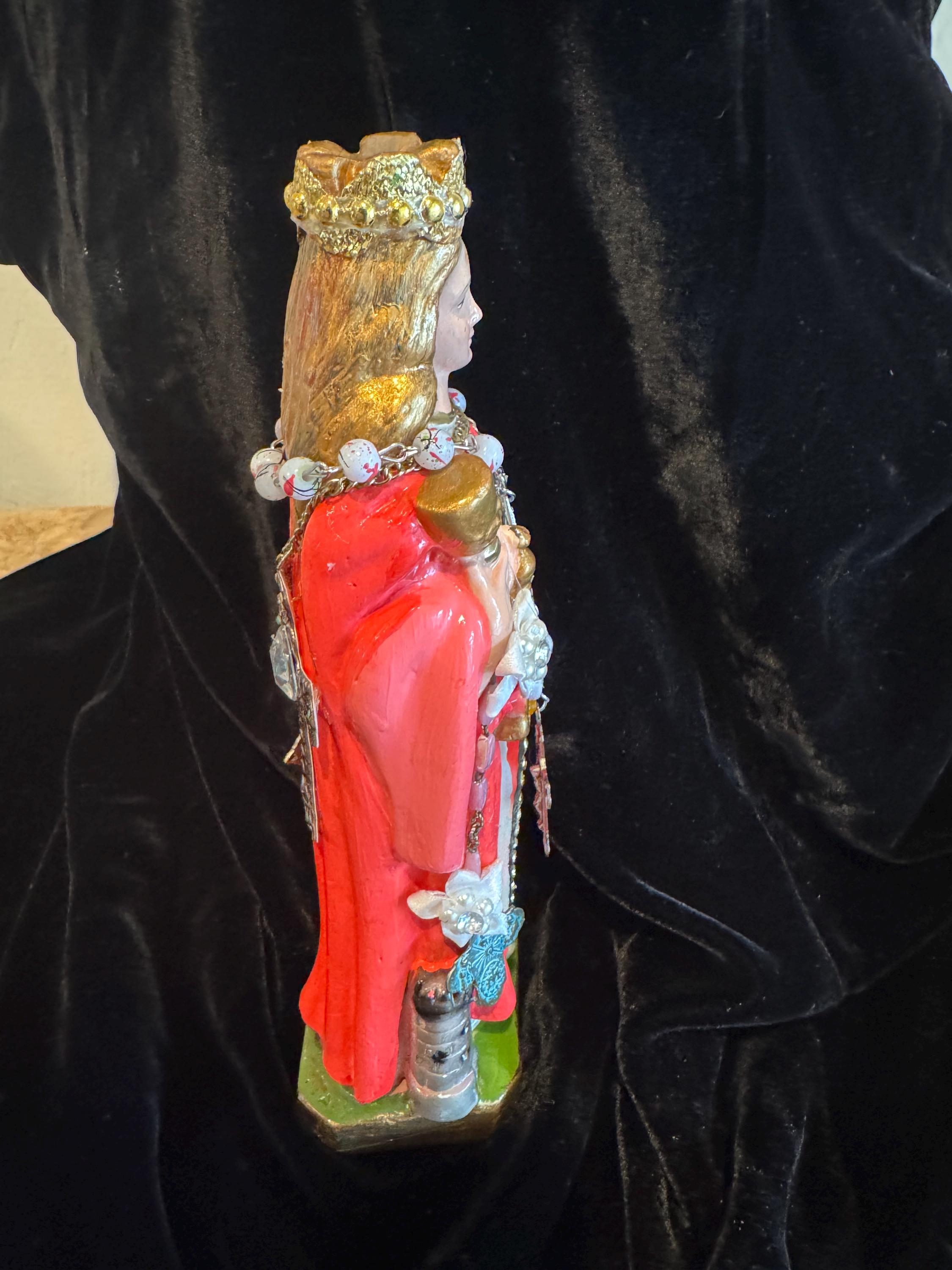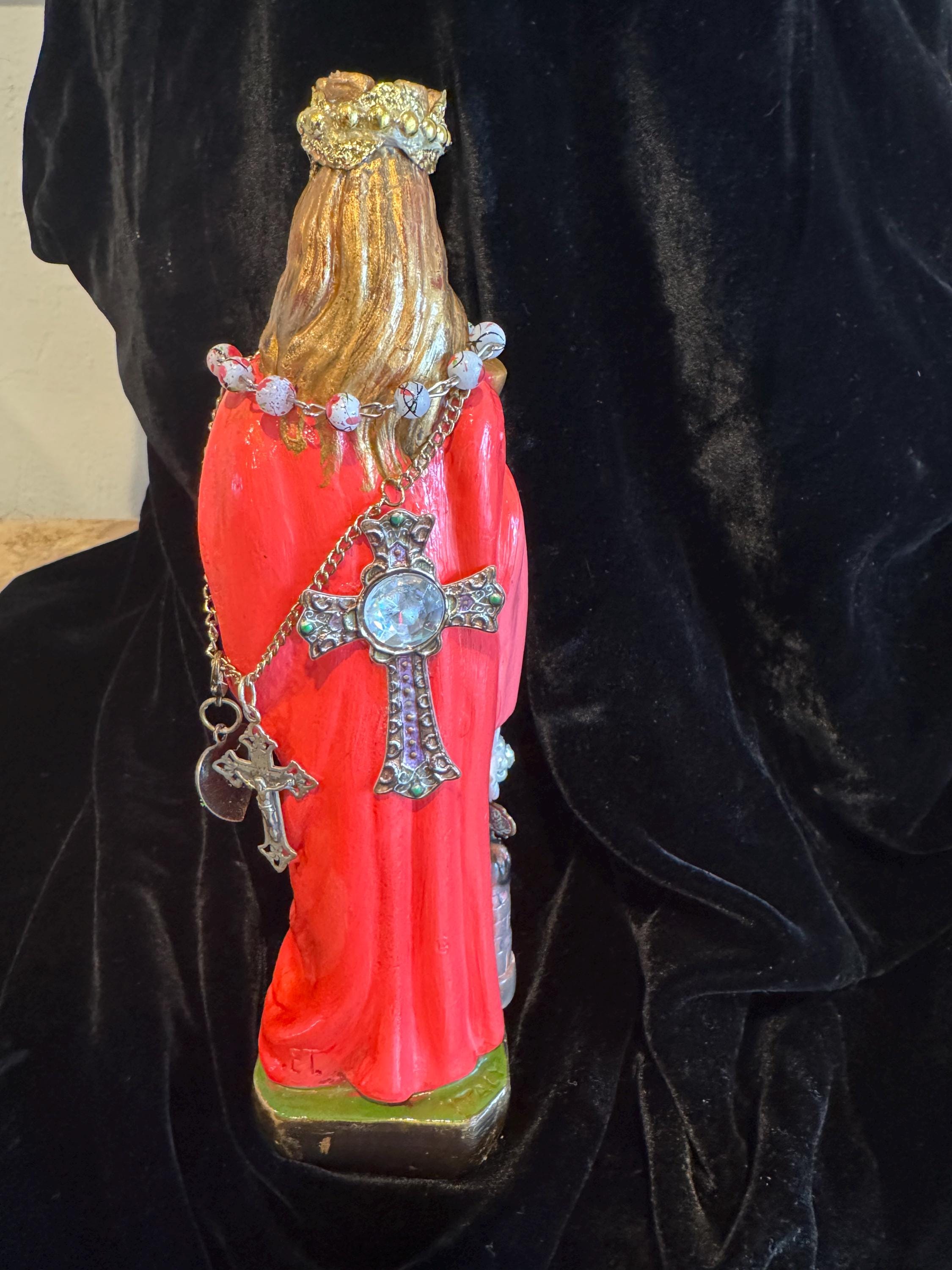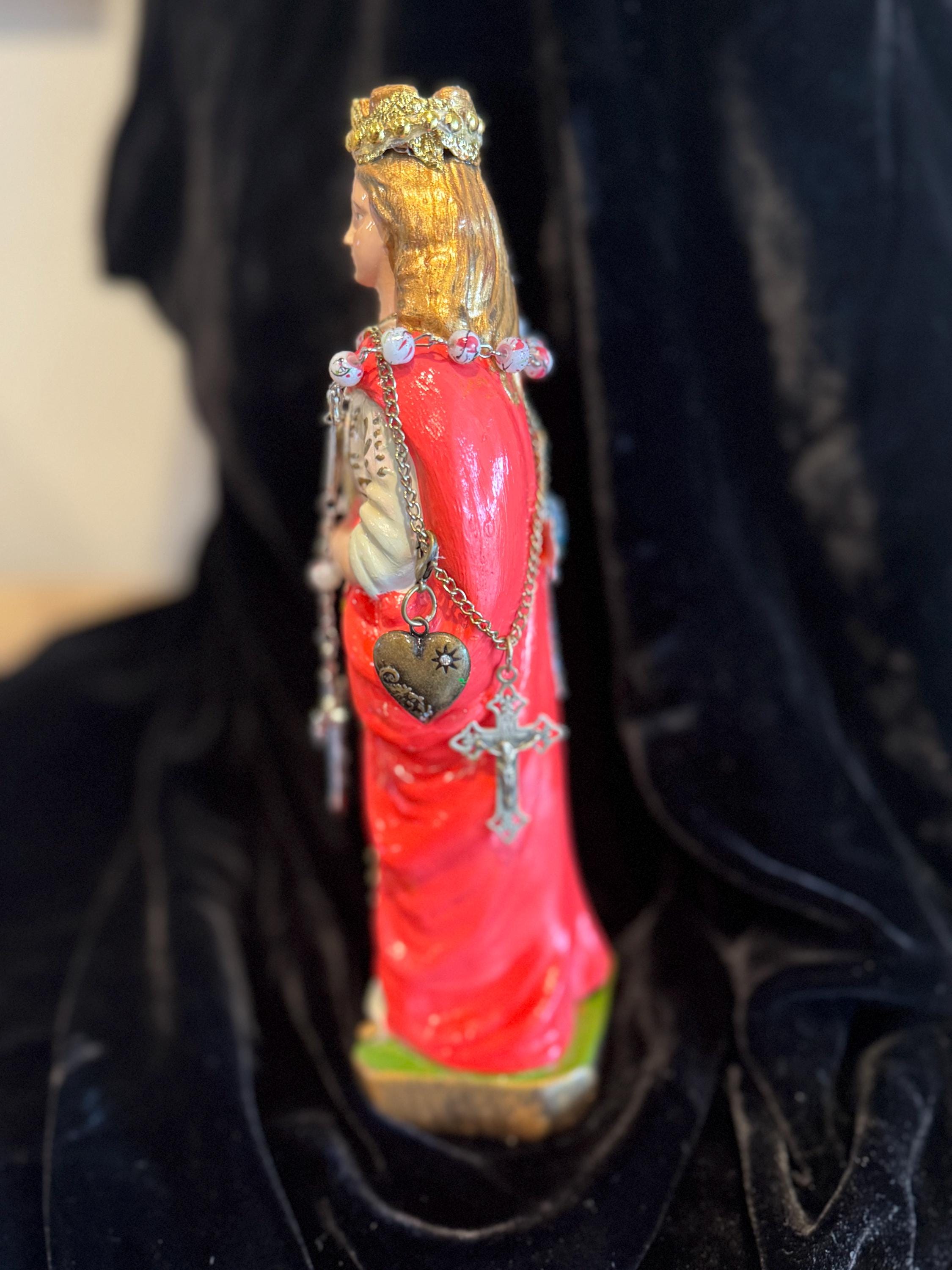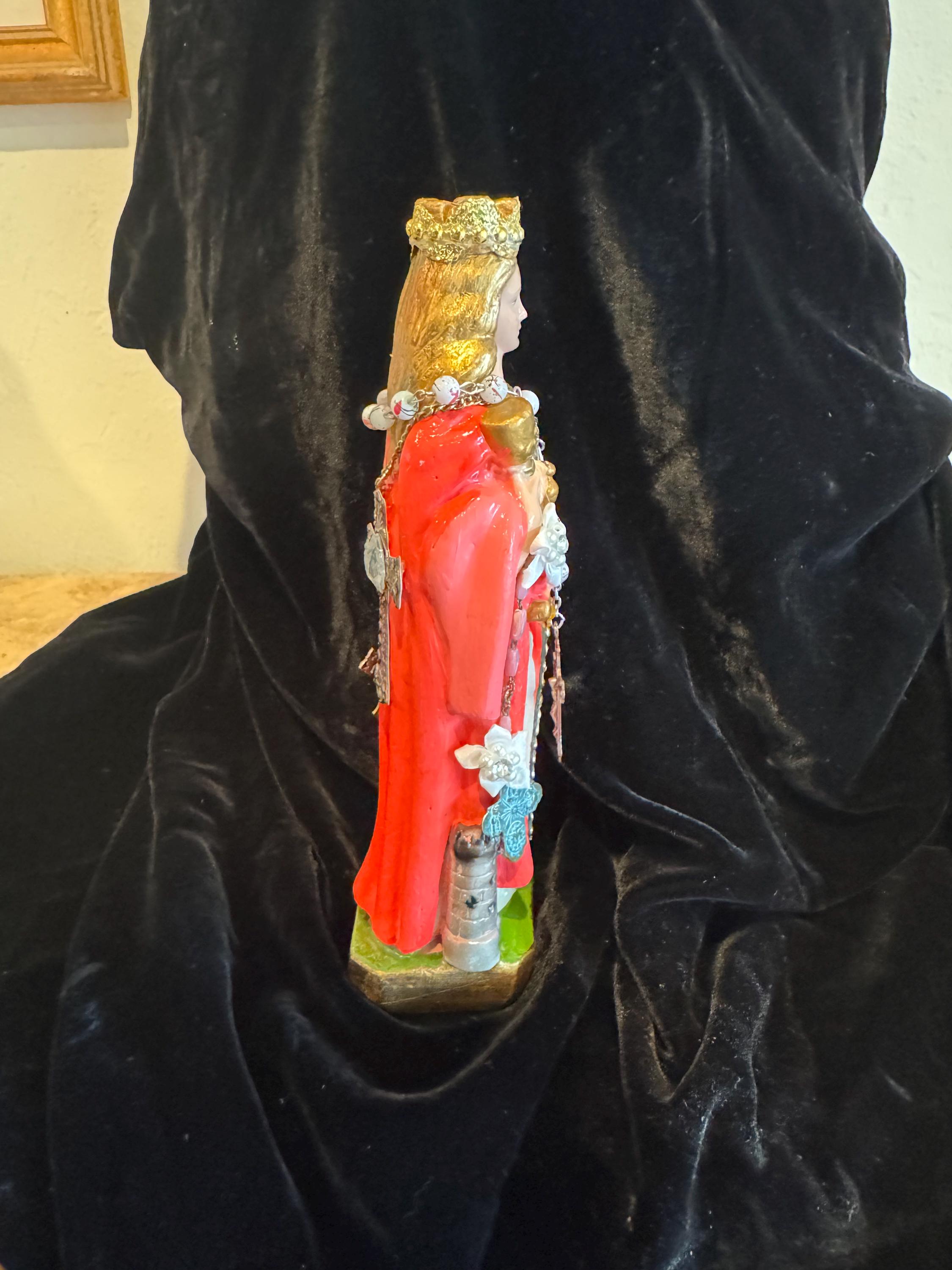 This particular piece is a vintage plaster/chalkware statue of St. Barbara, expertly restored to evoke the original coloring, while incorporating our signature touches. The statue features: