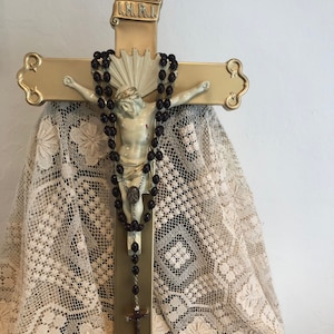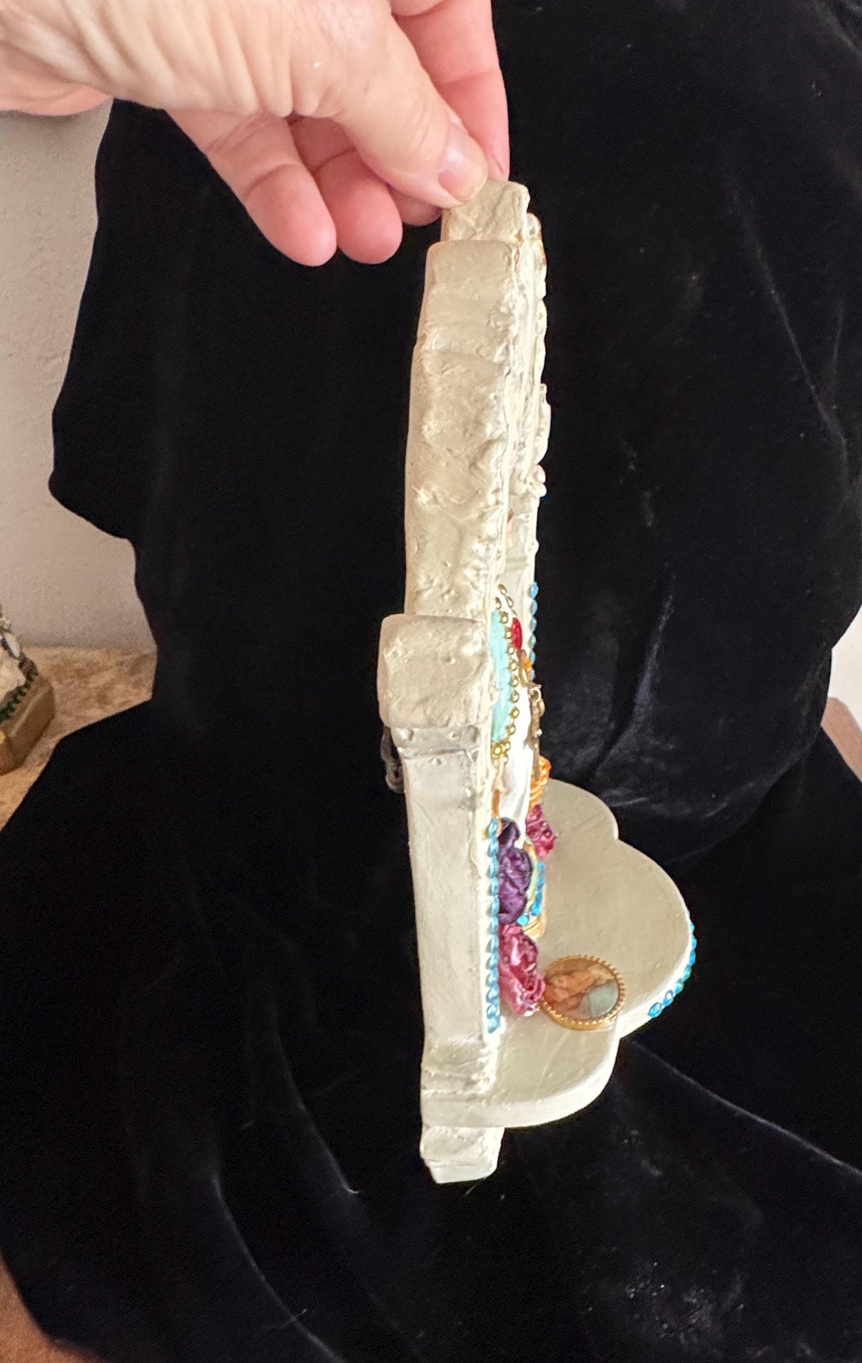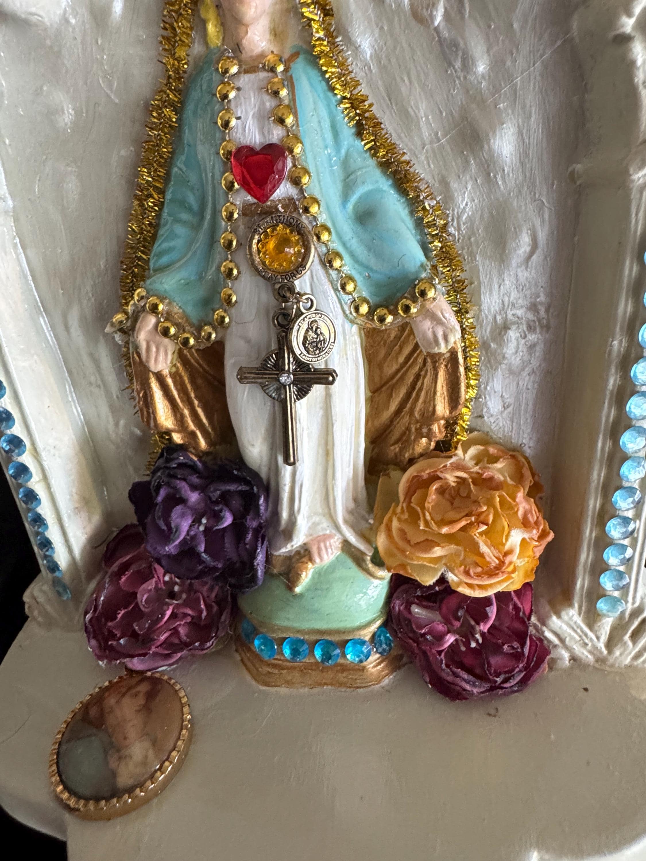 This piece rescued from a state of age and wear. Very Faded colors have been thoughtfully restored, and new life has been breathed into it with hand-painted details, fabric trims ,flowers, and iconic religious embellishments.