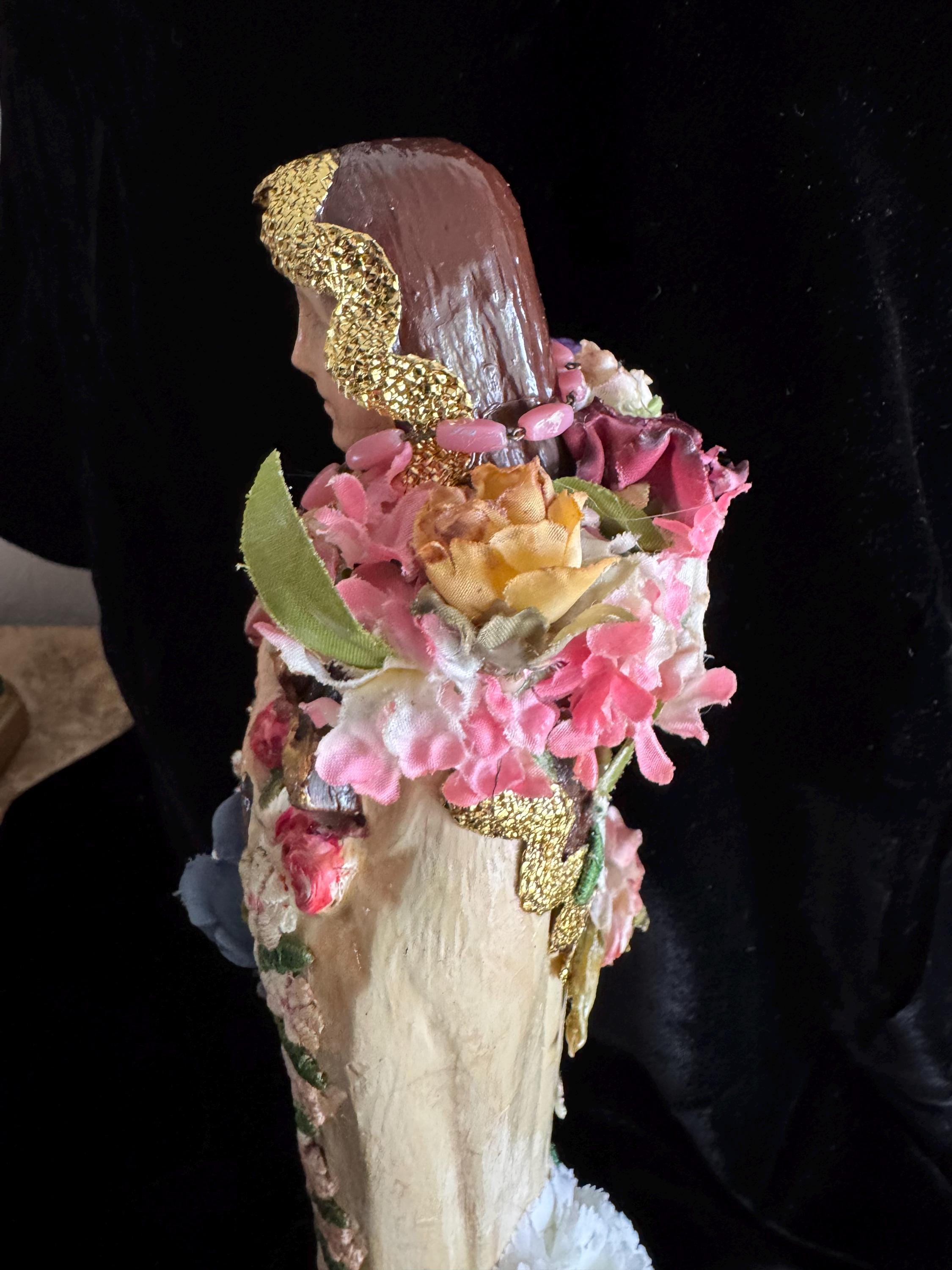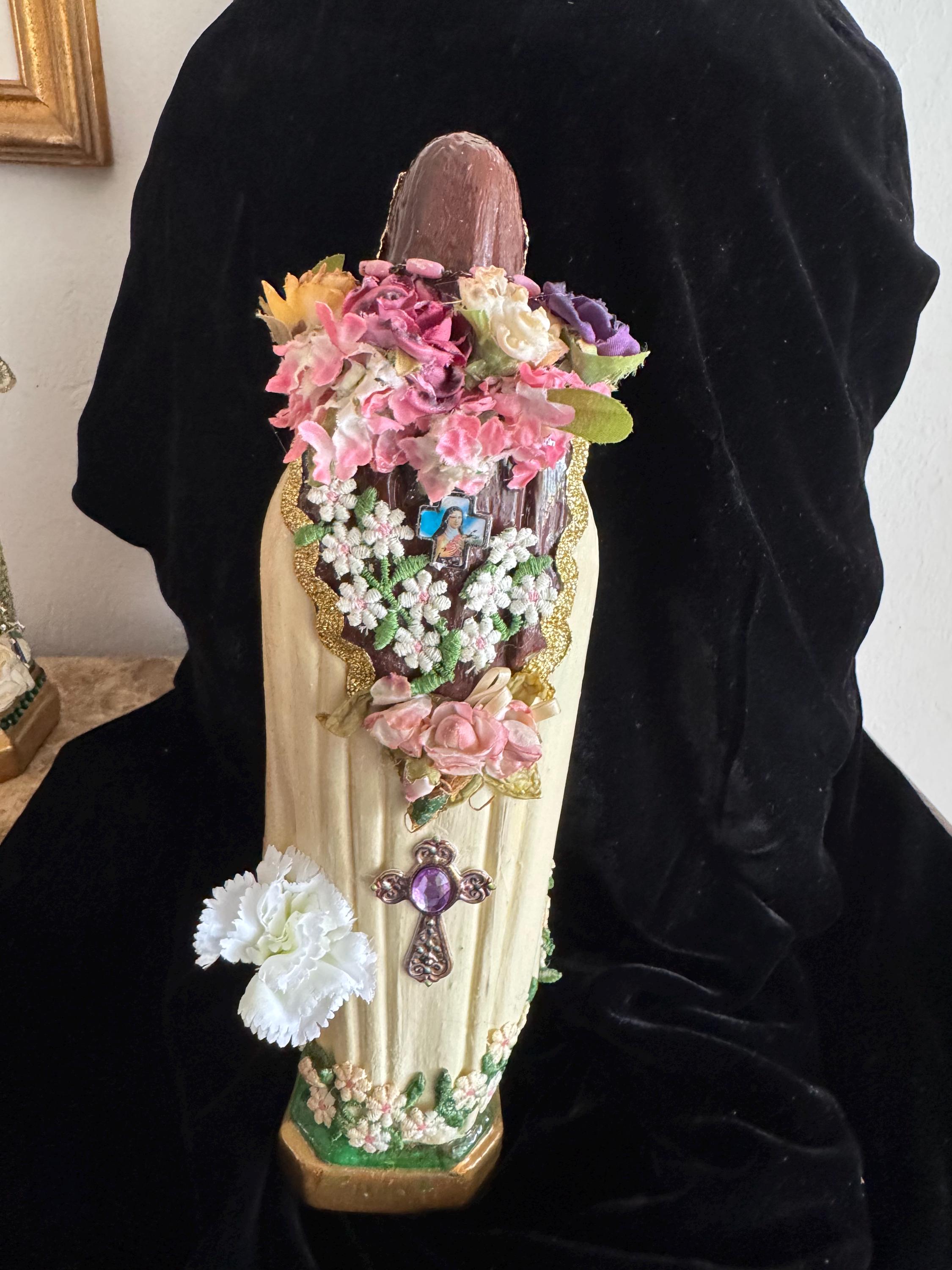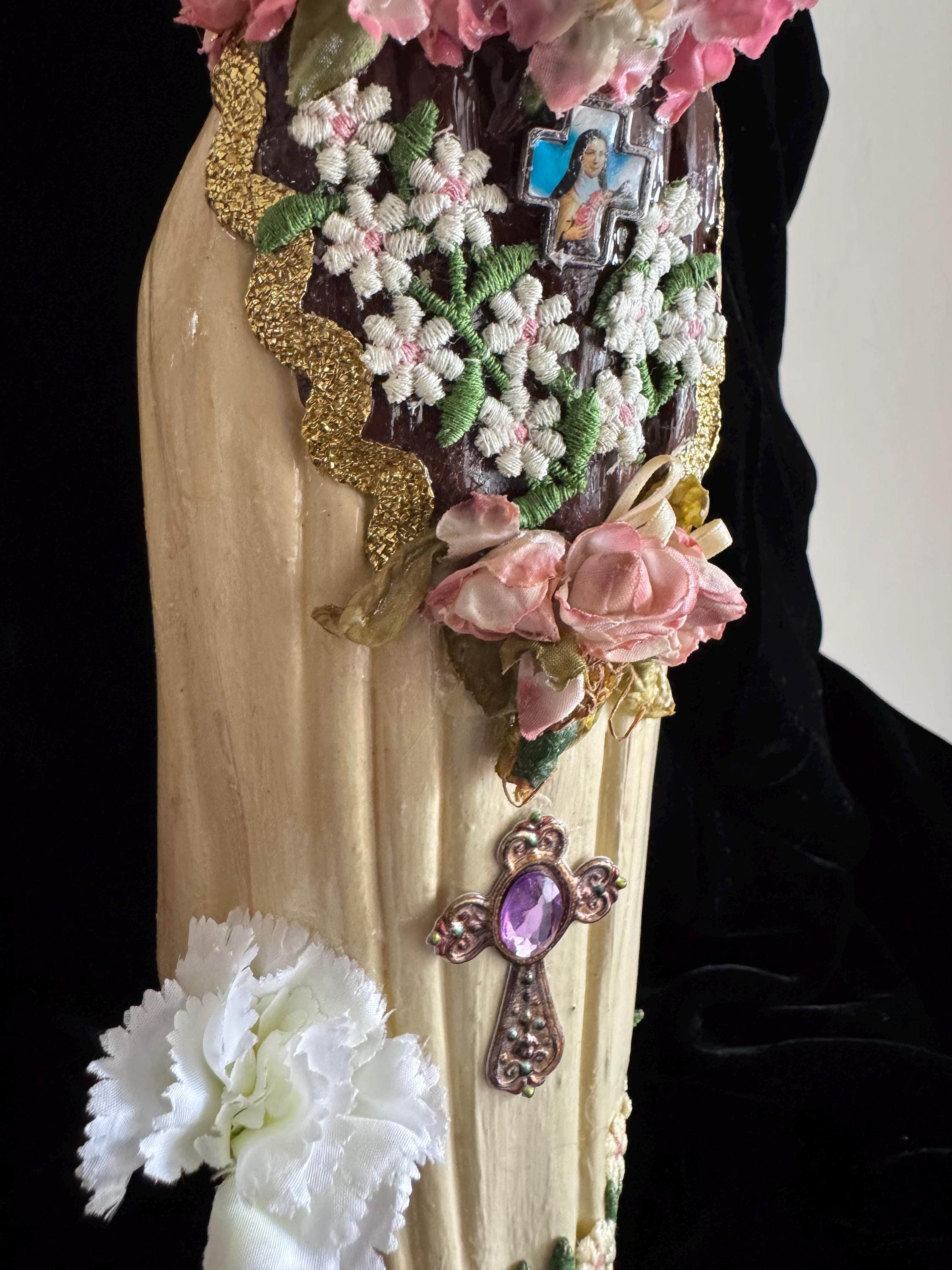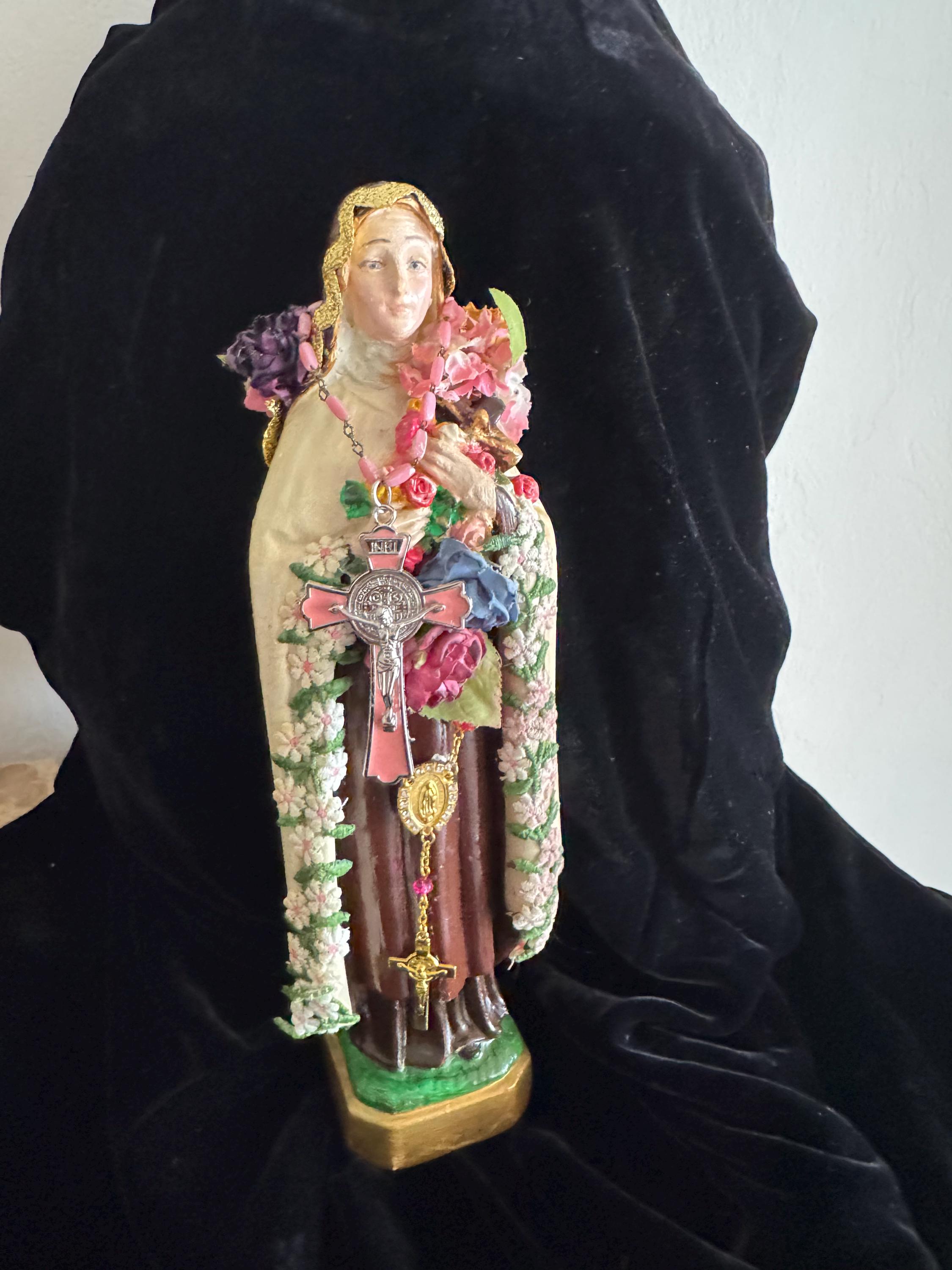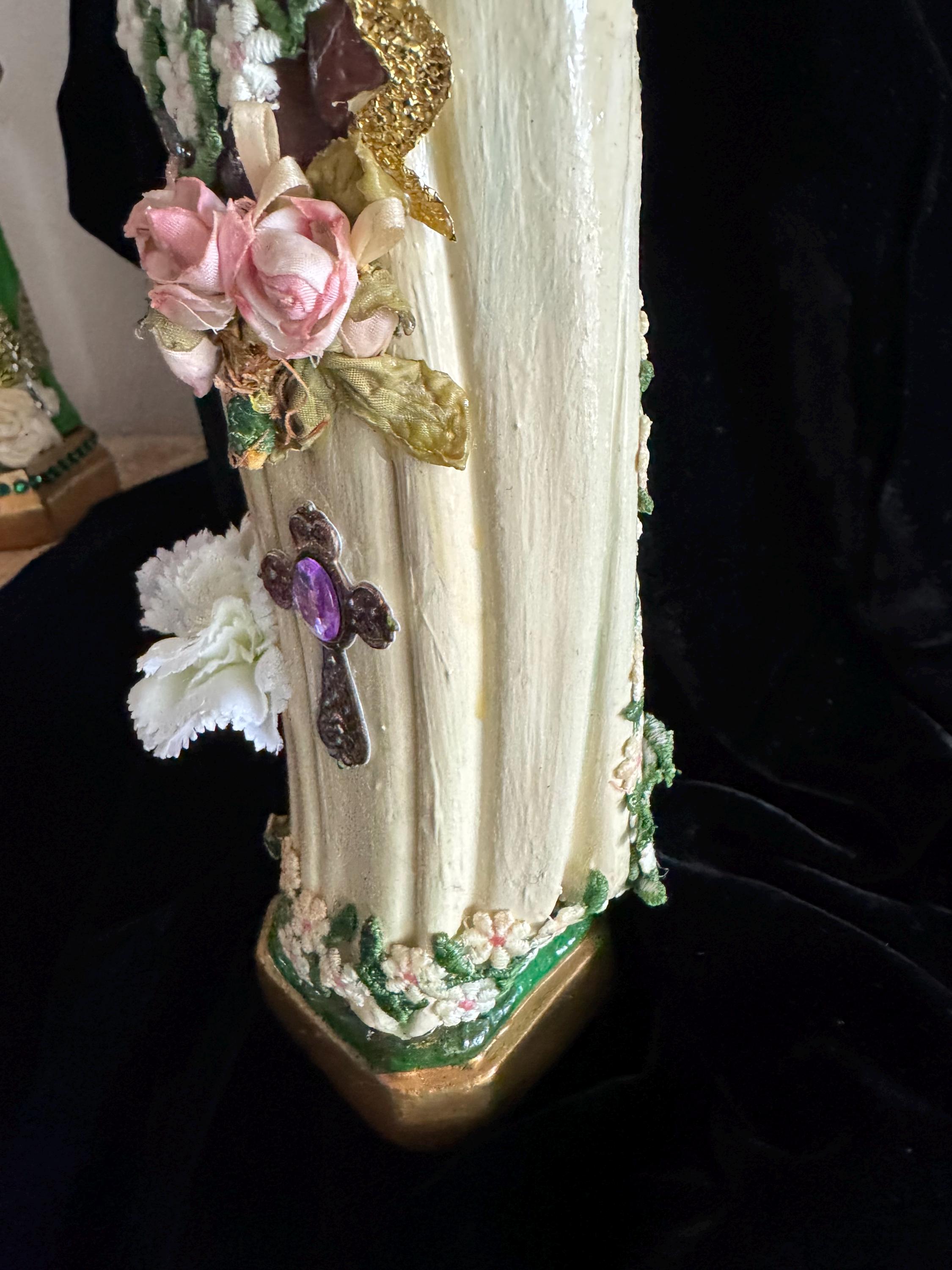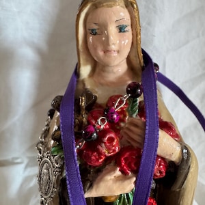 Saint Theresa "The Little Flower of Jesus" Devotional Art Statue One of a Kind - Each Made with TLC Another Beautiful created by 2nd Hand Revival Art Studio. Vintage Chalkware Plaster Regligious Statues brought back to life in our Art Studio . These vintage chalkware statues come to our studio in pieces or cracked, missing hands and broken necks.. Sometimes just paint worn down or no paint at all .. we want the to be appreciated for what they are and get them into good homes . Our goal is to give them a 2nd Life.. Thus the name 2nd Hand Revival. This Statue of Saint Theresa has lots of chips and worn paint .. face was missing all the paint . We painted back to traditional colors and added a very glossy finish .. Trims in vintageWhite Daisies in white with pink centers ... Lots of Fabric Flowers which have been varnished and are stiff in place and religious icons as you see in the photos . A Pink enamel and silver metal crucifix hangs off of a small pink part of a rosary around her neck and is removable as it is not fixed to the figure . A Gold tone metal Oval of Virgin Mary and below is a pink bead and a raised crucifix You will see that our statues are not perfect and we don't try to make them perfect. Our paint style is sometimes textured and has variations of colors . 2023 2nd Hand Revival Cloth Tag and signed by DavKat See our Gallery for other One of a Kind Statues ! Nice paint but as this is the artist rendering .. please review as there is over paint , bits of stain, varnish .. these statues are not meant to be perfect Please review all photos for details One of a kind with adornments and accents .. repainted, retouched and adorned pieces , each with it's own personality Approximately Measures 11.75" Tall See Photos Thanks for Looking. See our other Collectible Artist inspired Religious items in my store