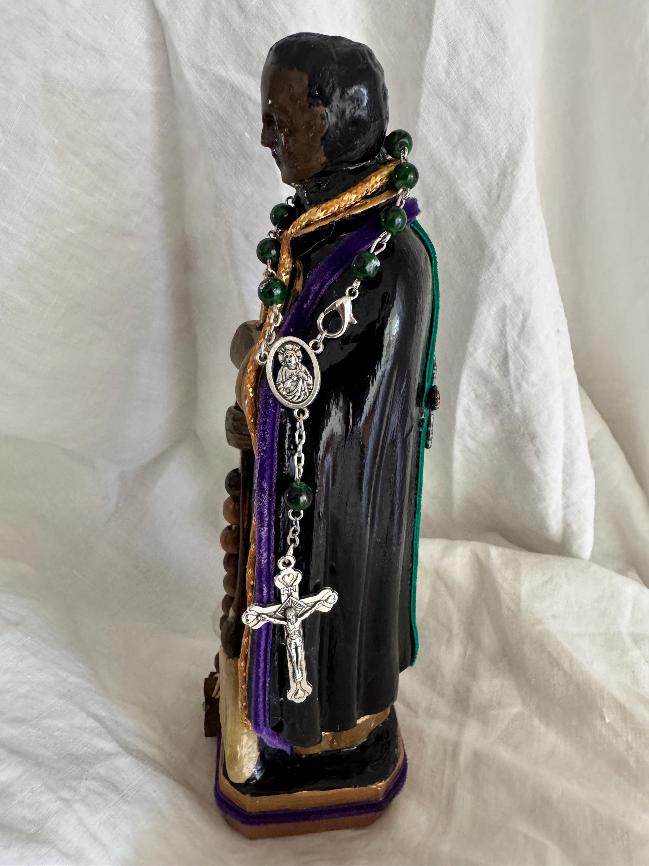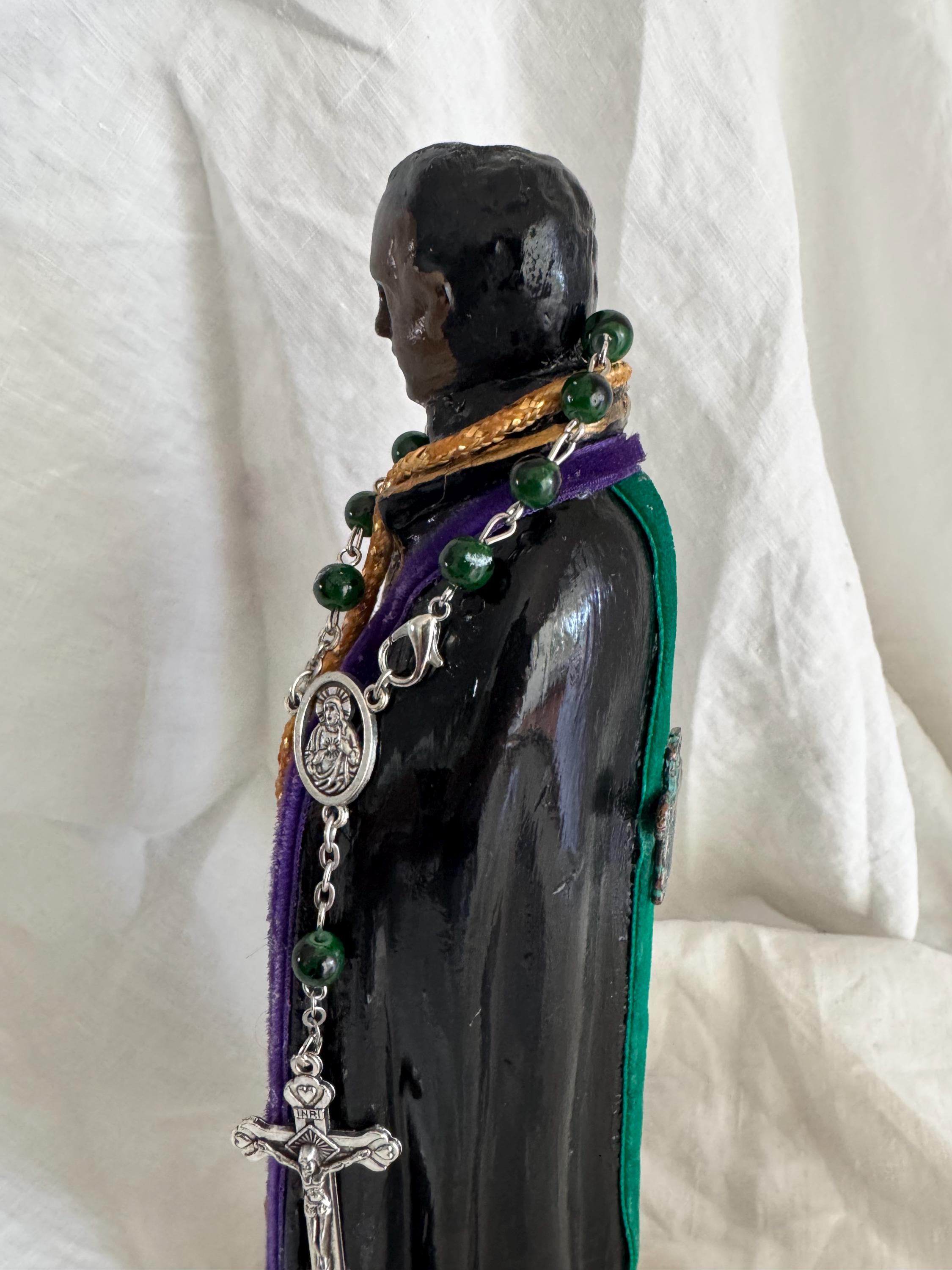 This vintage statue has a classic style and was totally and intricately repainted with a very glossy finish We added some religious icons and trimmed in gold vintage rope trim and purple velvet . Green Bead Chaplet. Back is green velvet and metal verdigris and bonze color cross Original markers on back base: 1938 and illegible letters Measures 8.5" Tall to top of the statue and Base 2.25" Square Comes with Round Wood Stand as you see in photos Signed : 2nd Hand Revival DavKat 2024 See Photos for Details Thanks for Looking. Lots of Collectible Artist Created Devotional Art - Unique One of a Kind