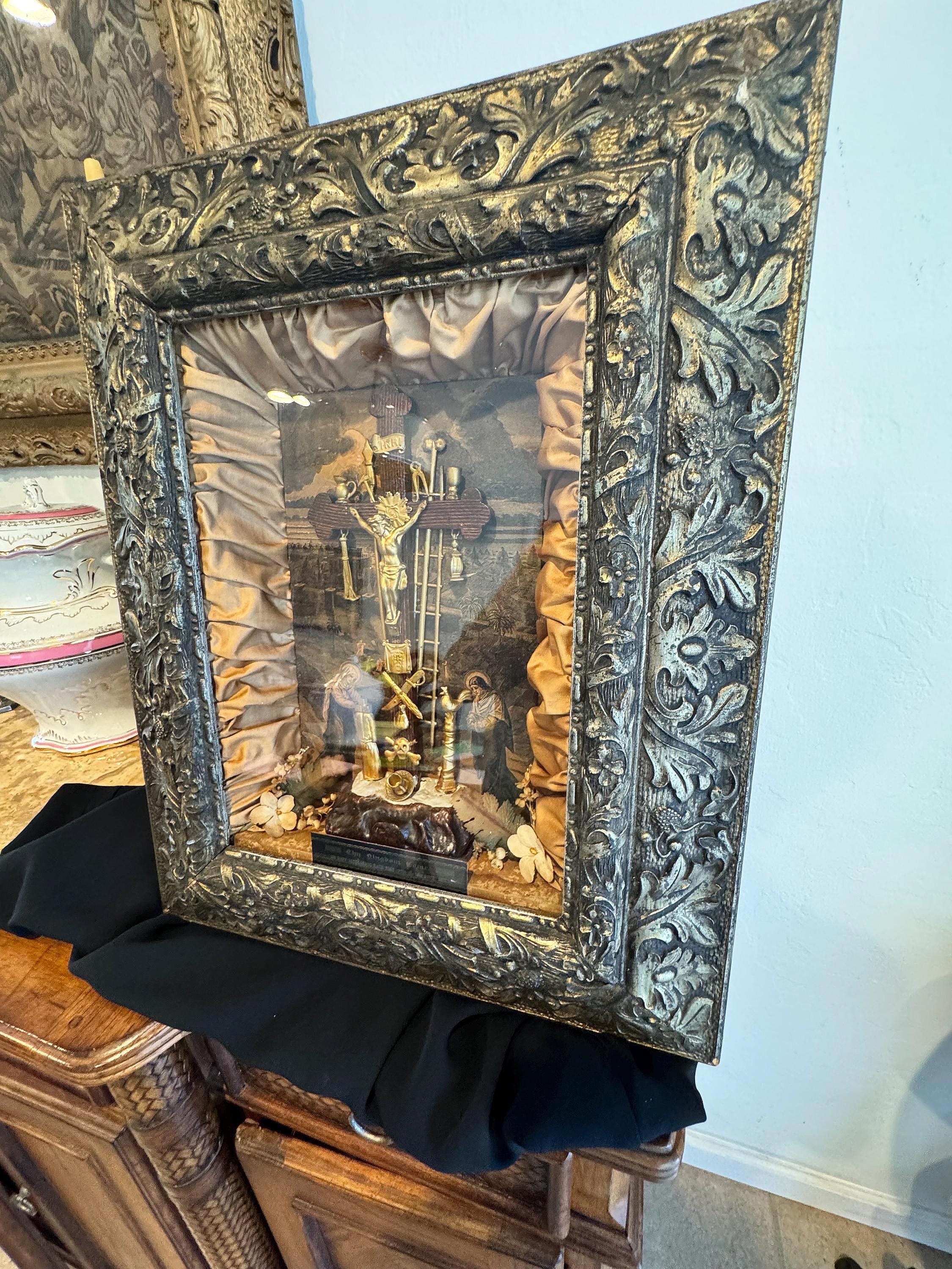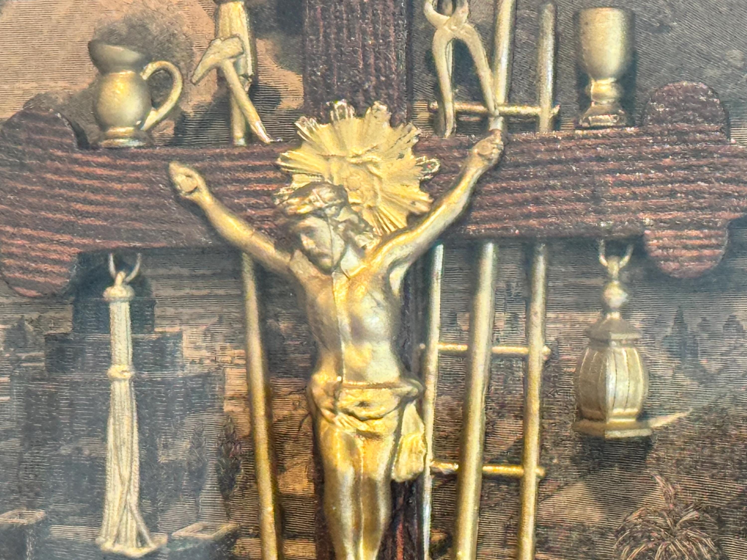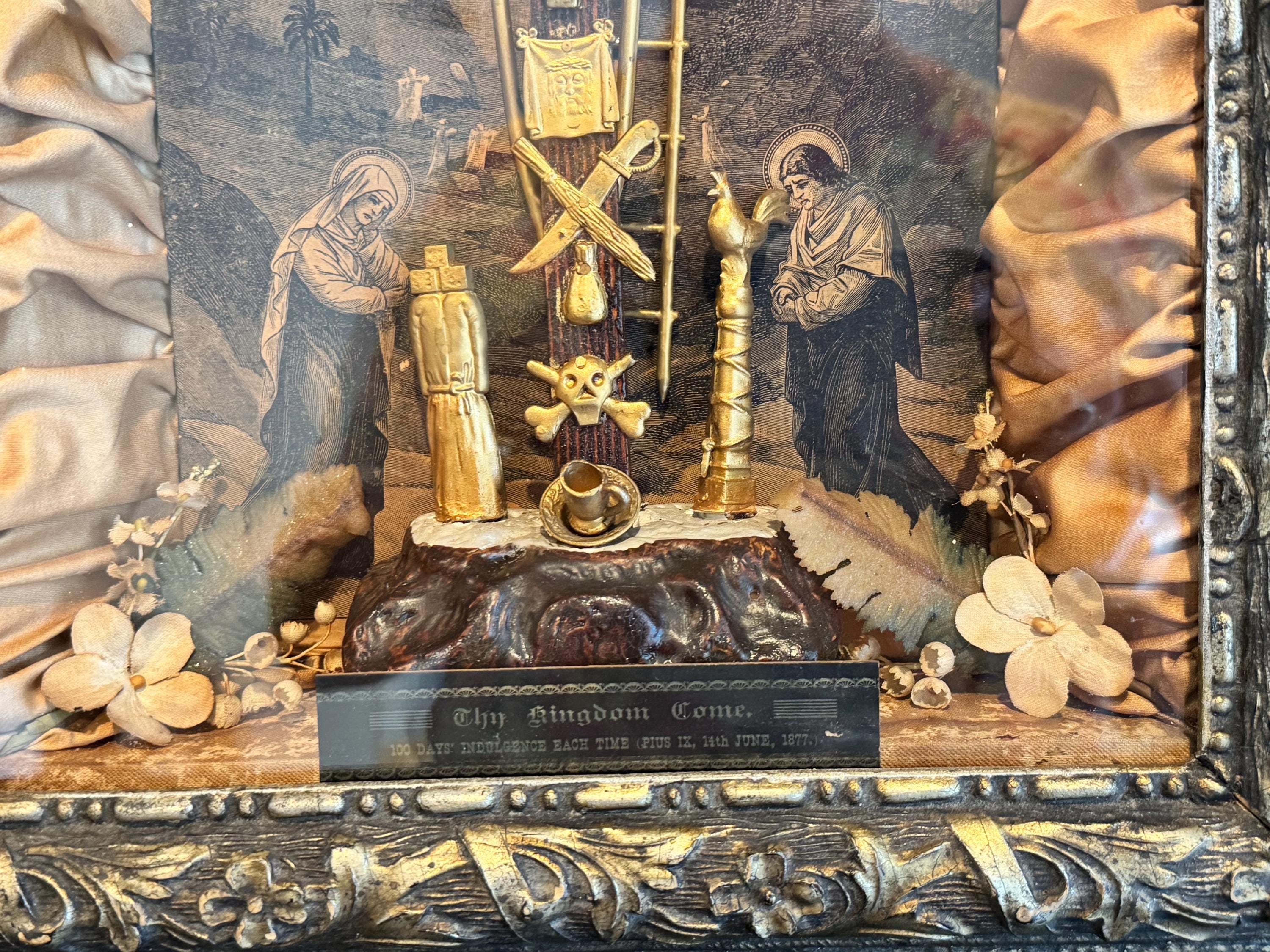 Information from the Vintage Catholic website: Detailed crucifixion scene with symbols antique highly detailed original shadow box from the 1800's representing the Crucifixion of Christ.