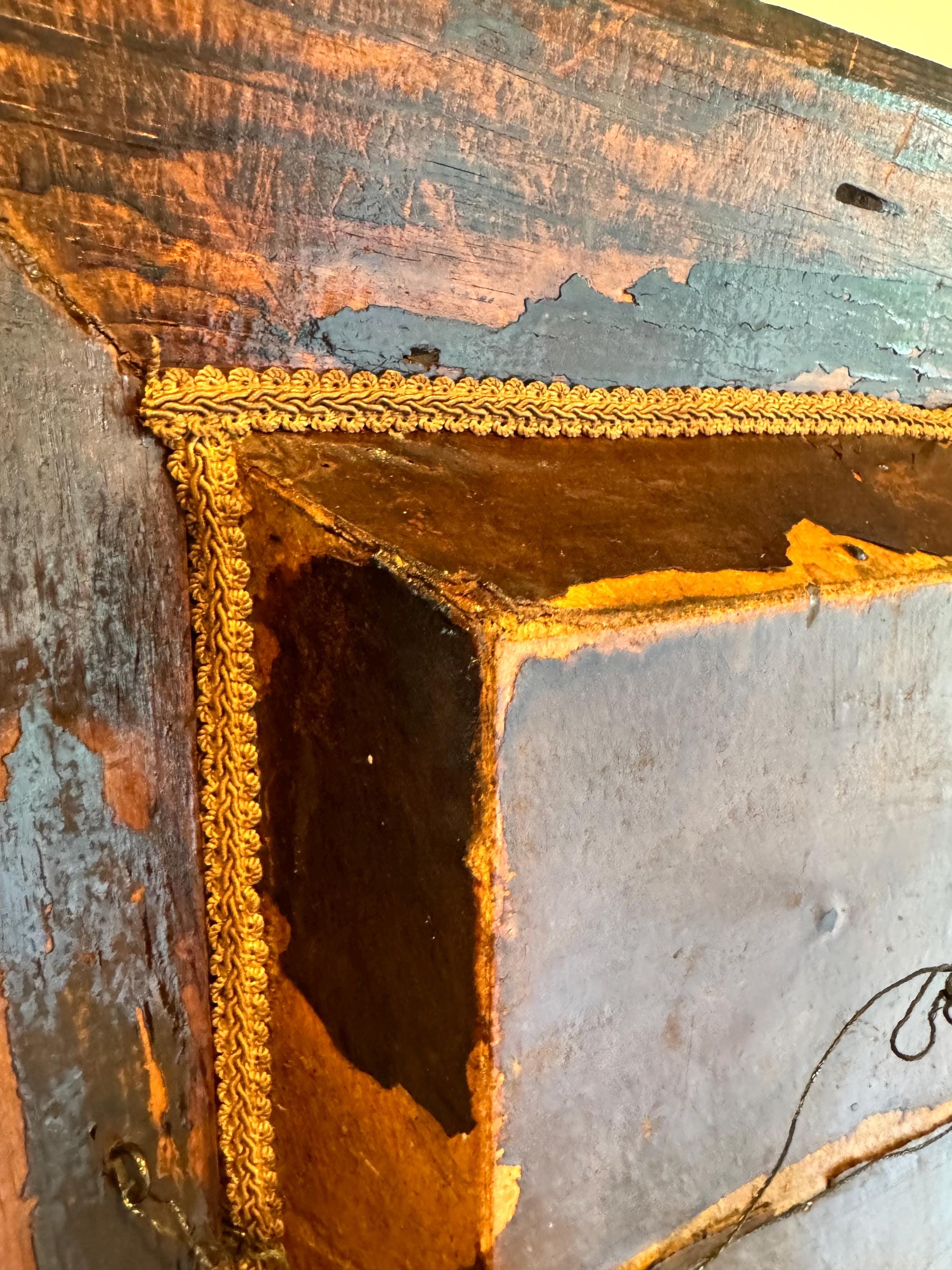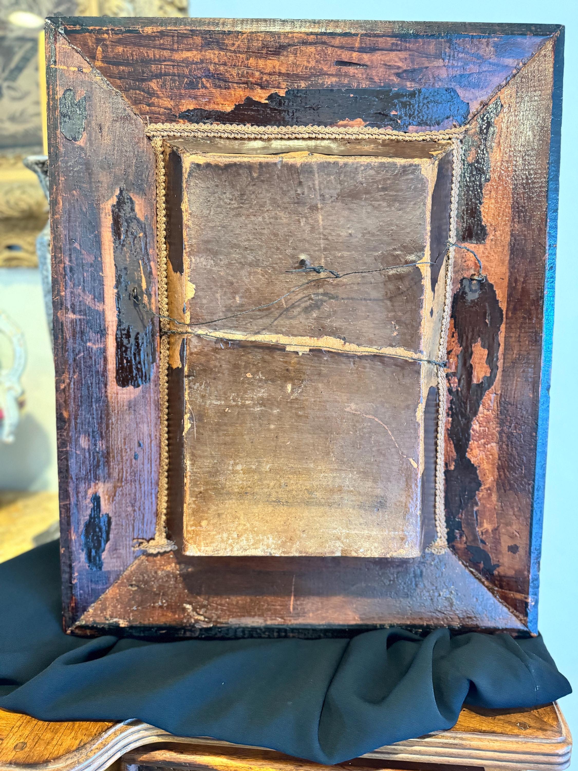 2nd Hand Revival Art Studios took this piece it apart and cleaned and also strengthen up the back of the box and they oil based polyurethane .. this process to keep the box strong and due to age preserve it for many years to come . The back old paper and seams are coated and protected from future wear and tear with this coating .