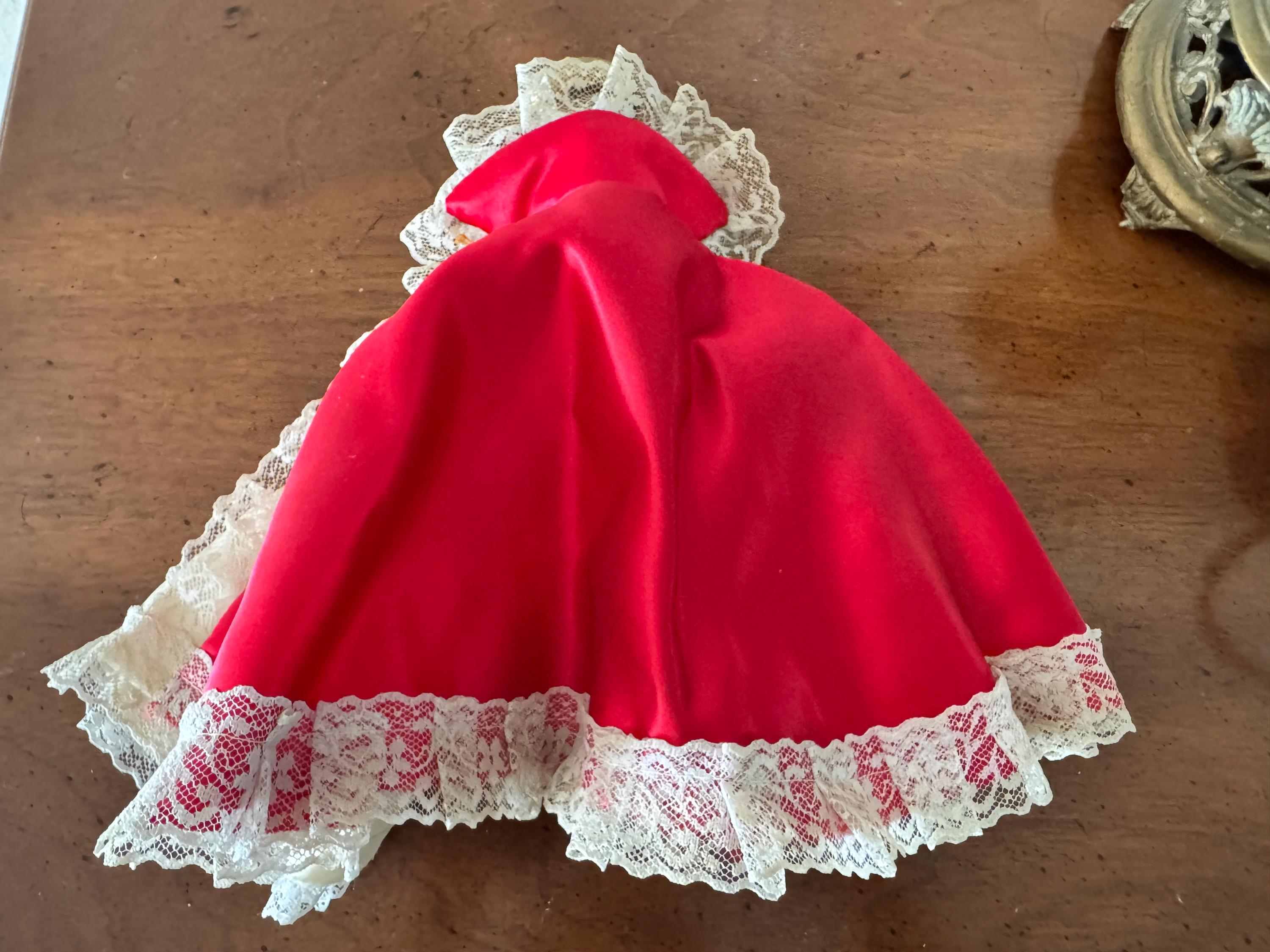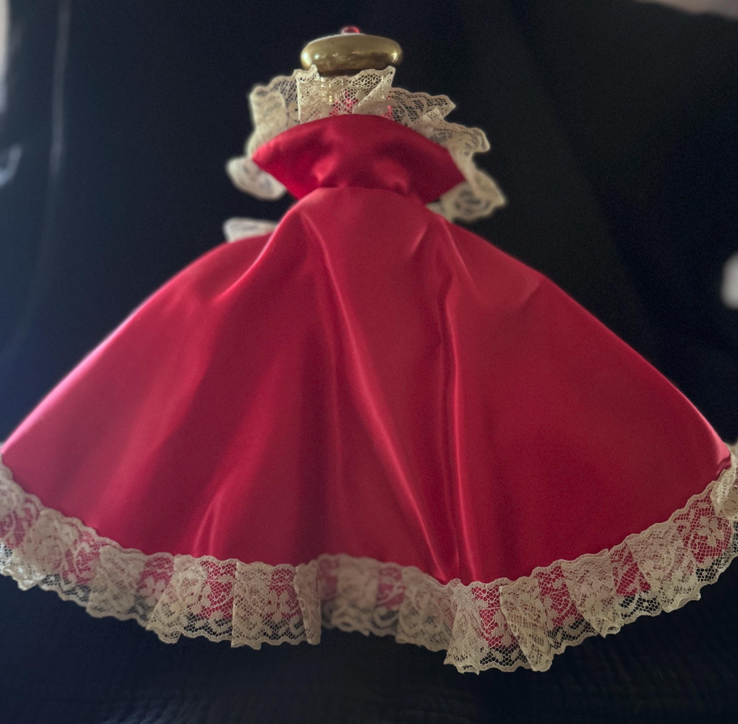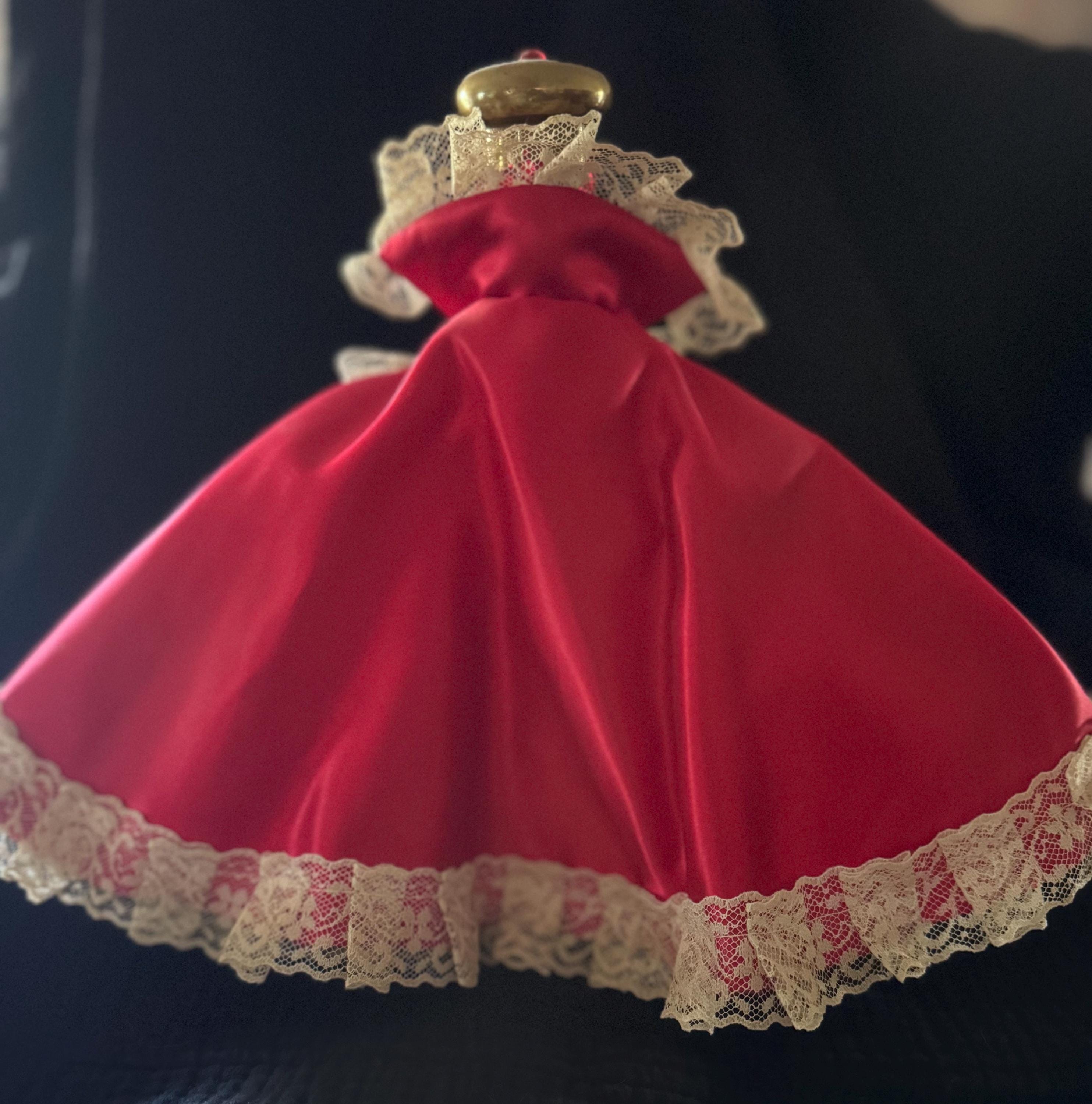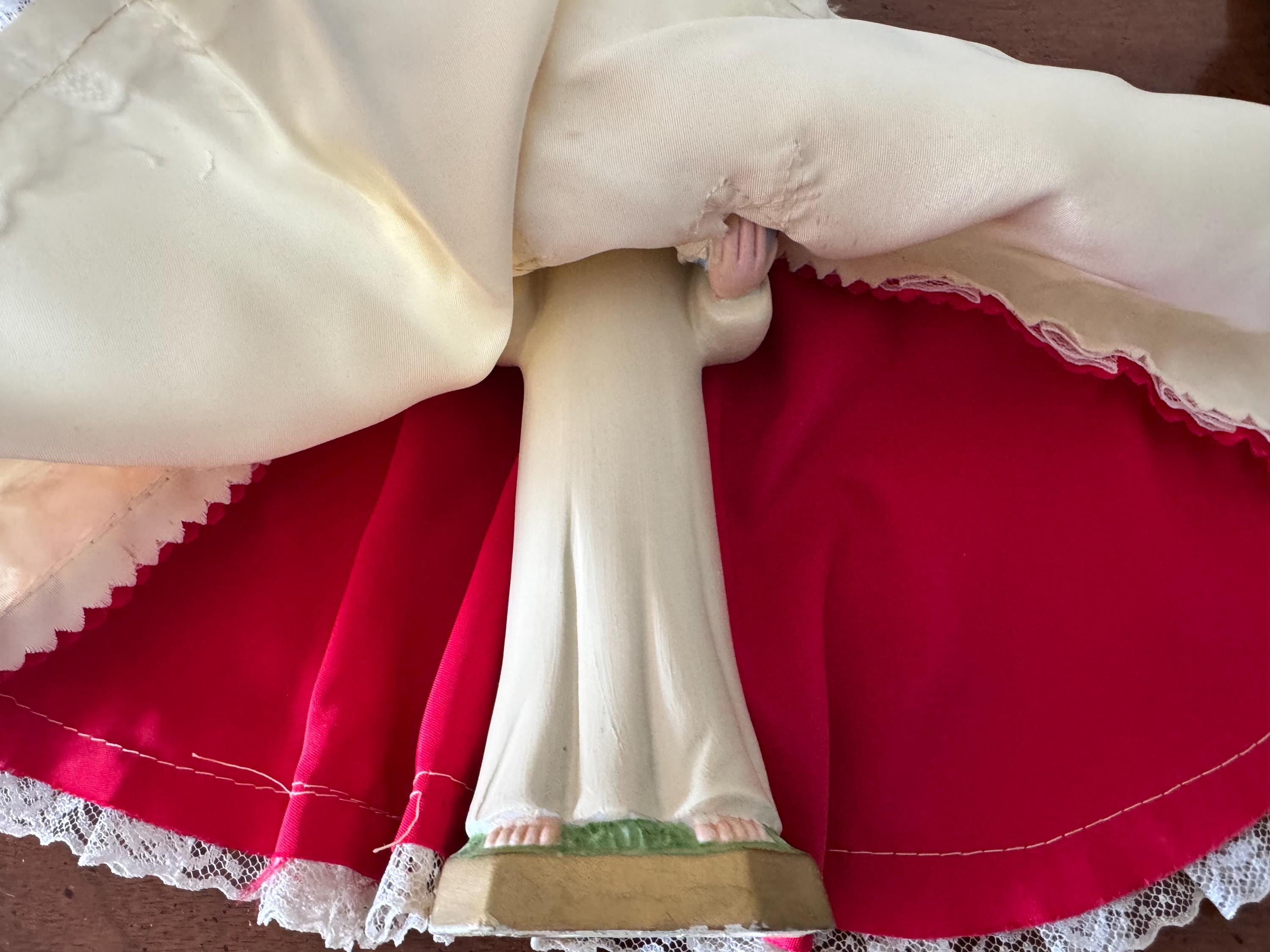 Devotional Art - One of a Kind !! 2nd Hand Revival takes antique and vintage religious statues that have had prior age use & discolor or damage and turns each piece into a unique piece of art ! Our pieces are not perfect and we don't want them to be perfect. We are 2nd Hand Revival as we bring back to life these beautiful vintage statues. We hand paint all details and add our personal touch of iconic embellishments. Statue is ceramic material We repainted his face and body and added a beautiful jeweled crown of vintage brass and red appliqués jewels . Original Satin One piece Dressing with Lace White Trim A Red Beaded Chaplet with silver tone metal crucifix .. a heart locket that opens and an antique oval brass Virgin Mary medal is pinned on the dressing .. We hope you can offer him a new life as he really is a beautiful piece of art !