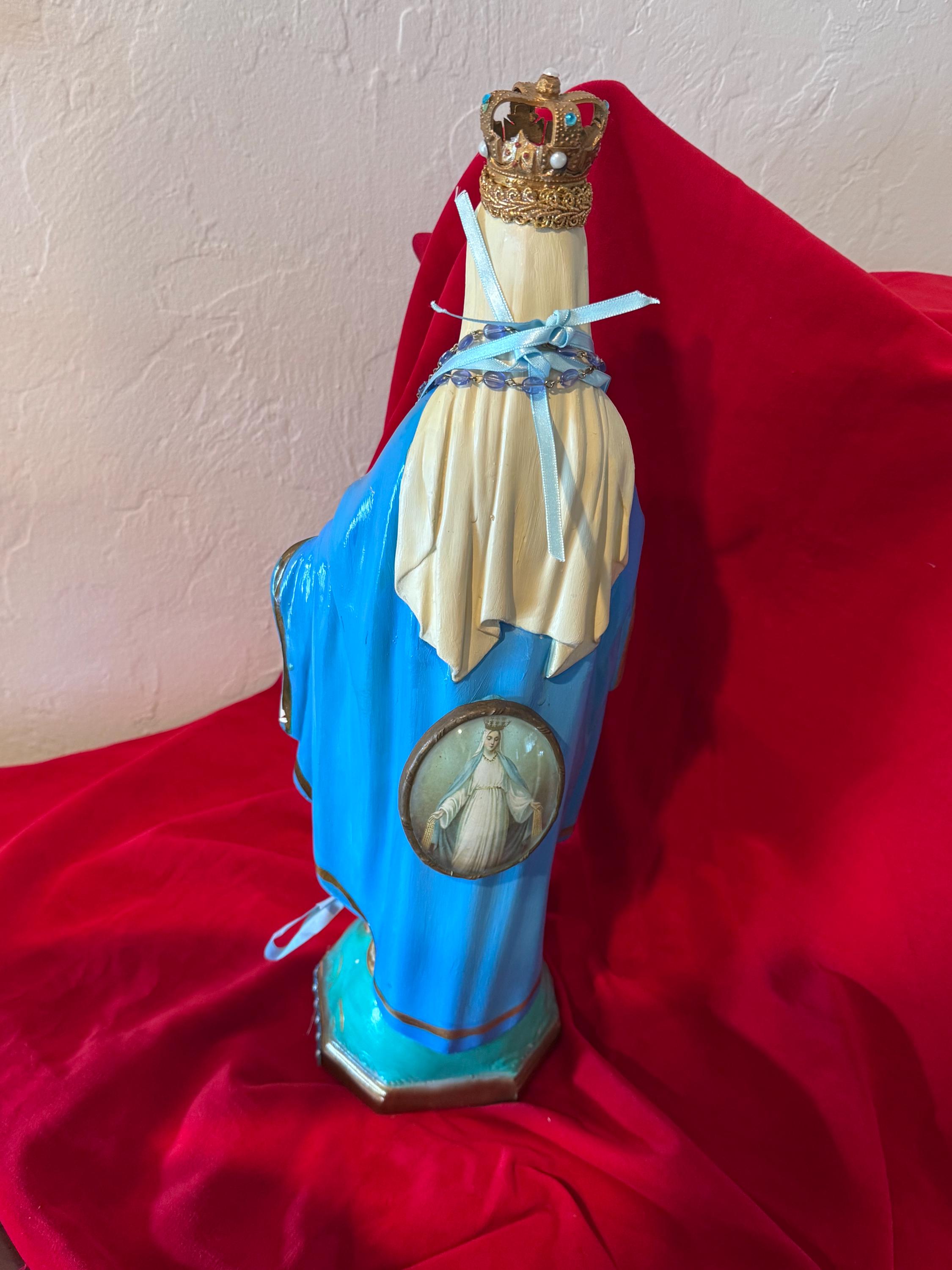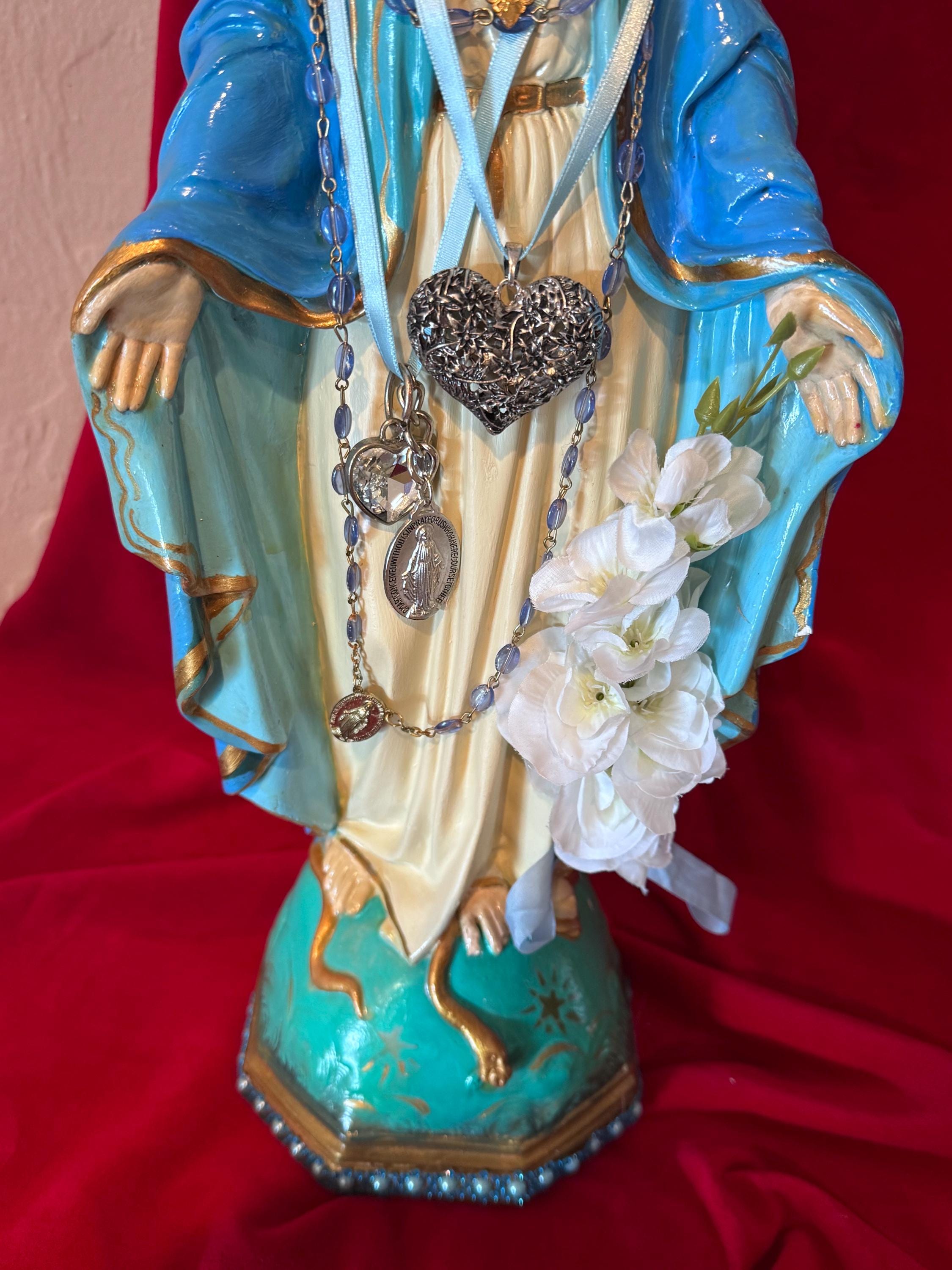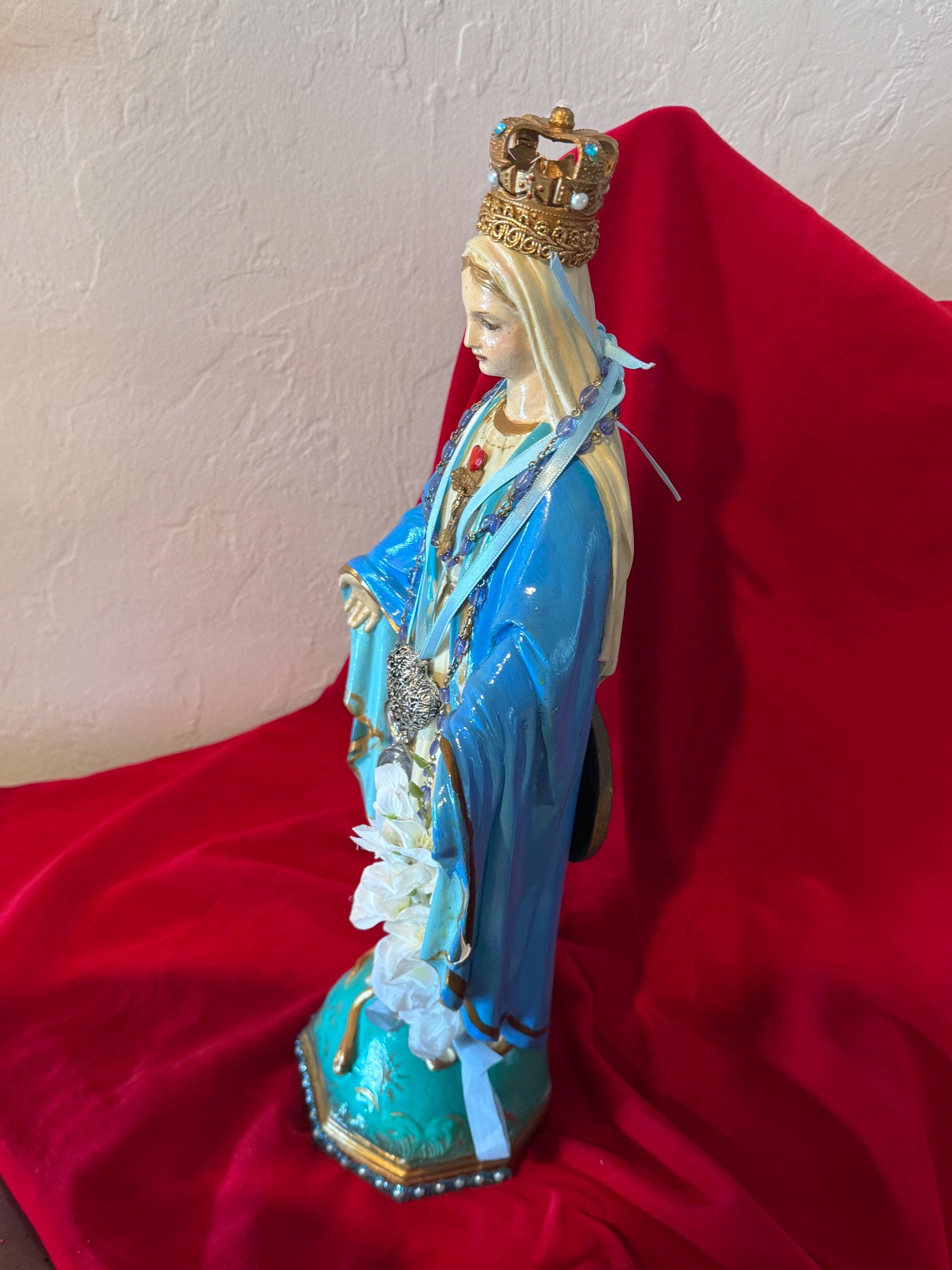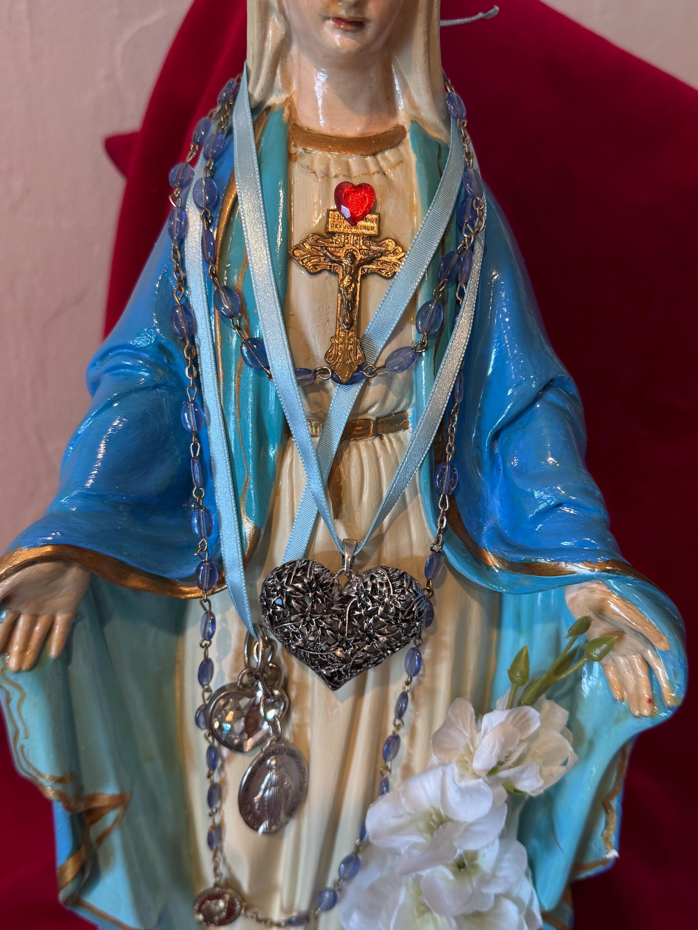 Lavender Rosary Beads with an Oval Medallion of Virgn Mary , Accents of Filigree Heart - Clear Faceted Glass Heart set in silver tone and Oval Virgin Mary Medal all on blue satin vintage ribbons .. Gold Embossed Crucifix with faceted red heart . Adorned crown is embossed plastic with small beading adding a striking touch of regal elegance Small white fabric flowers on the right side base Back is an antique convex print of Virgin Mary Standing at approximately 19.5" tall & 7" Wide across her hands This handmade piece is a beautiful fusion of religious devotion and artistic revival. Each statue is signed by the artist, DavKat, 2nd Hand Revival and dated 8 2025 on the bottom.