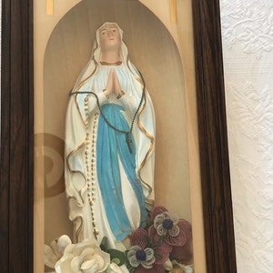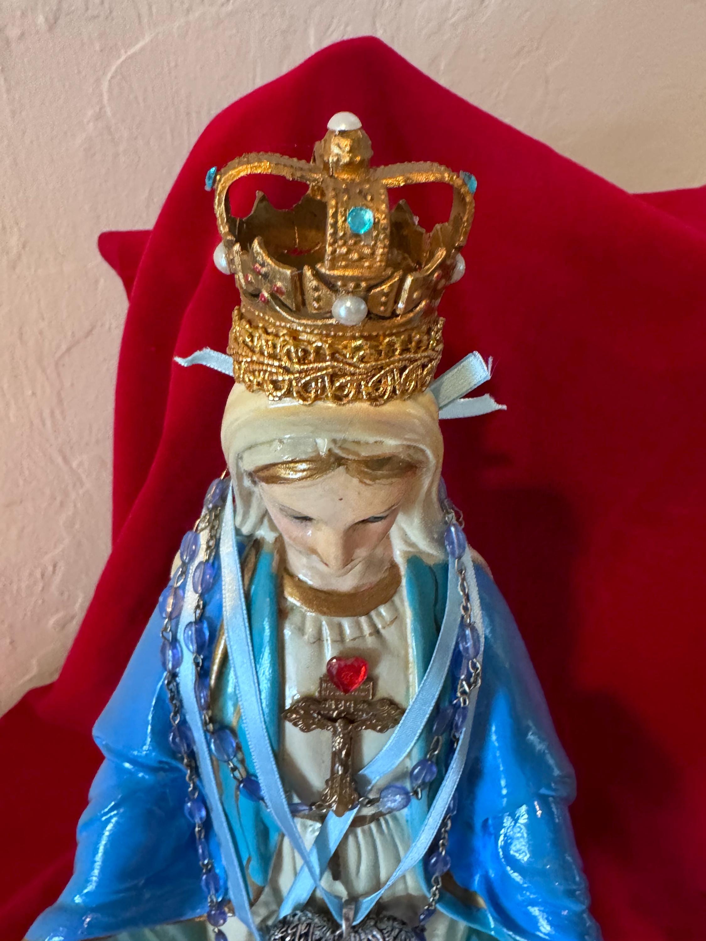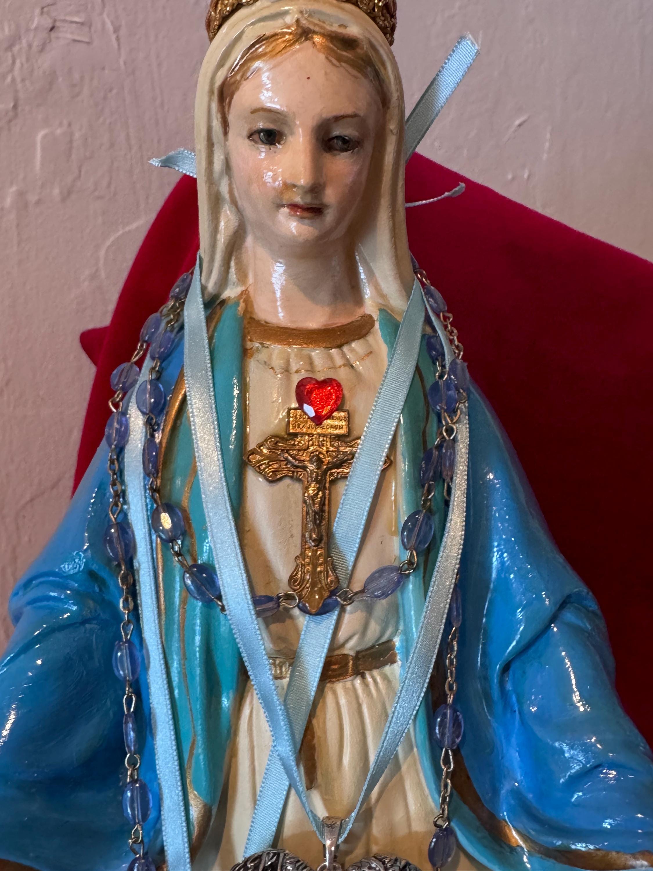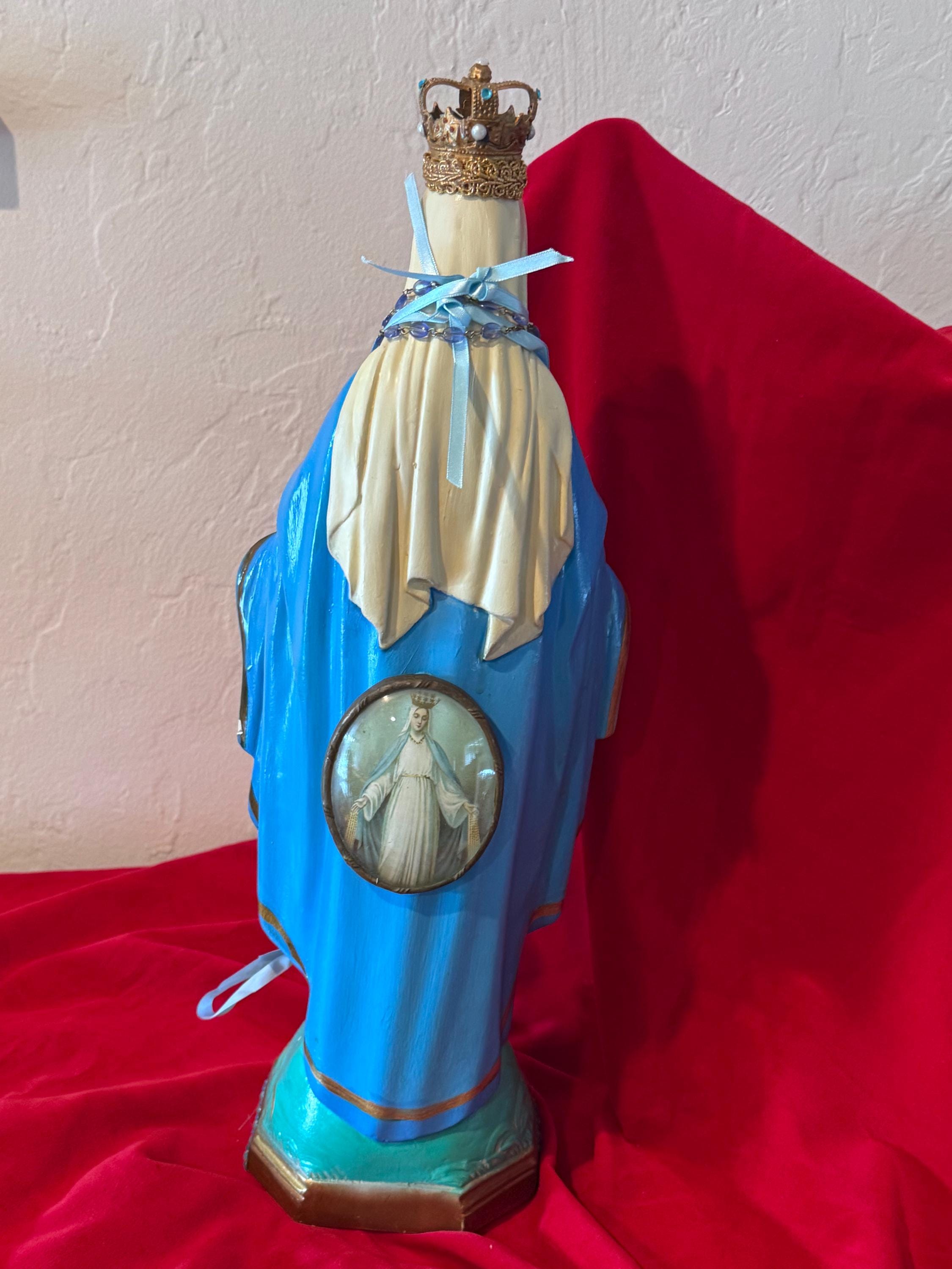 Lavender Rosary Beads with an Oval Medallion of Virgn Mary , Accents of Filigree Heart - Clear Faceted Glass Heart set in silver tone and Oval Virgin Mary Medal all on blue satin vintage ribbons .. Gold Embossed Crucifix with faceted red heart . Adorned crown is embossed plastic with small beading adding a striking touch of regal elegance Small white fabric flowers on the right side base Back is an antique convex print of Virgin Mary Standing at approximately 19.5" tall & 7" Wide across her hands This handmade piece is a beautiful fusion of religious devotion and artistic revival. Each statue is signed by the artist, DavKat, 2nd Hand Revival and dated 8 2025 on the bottom.