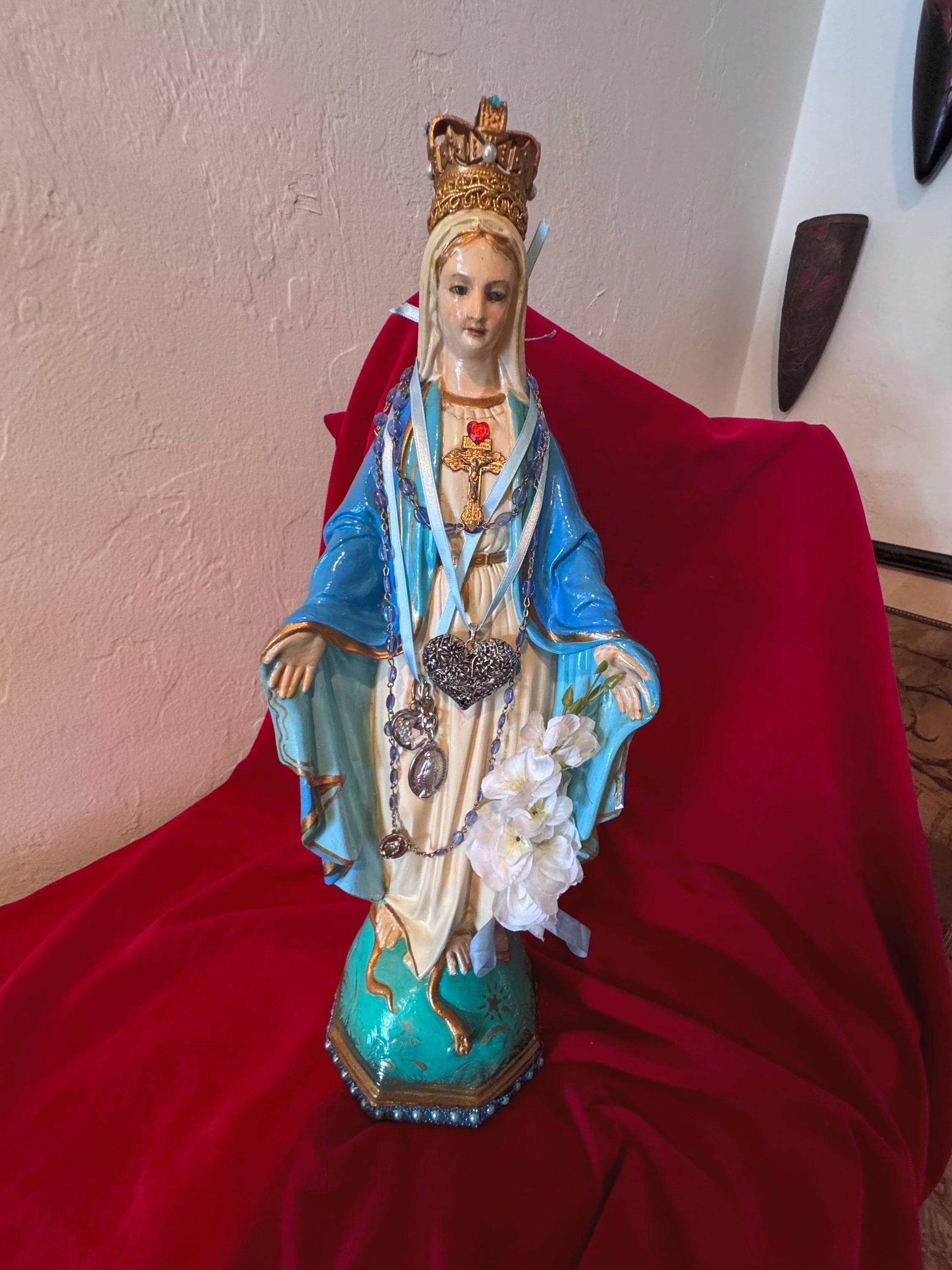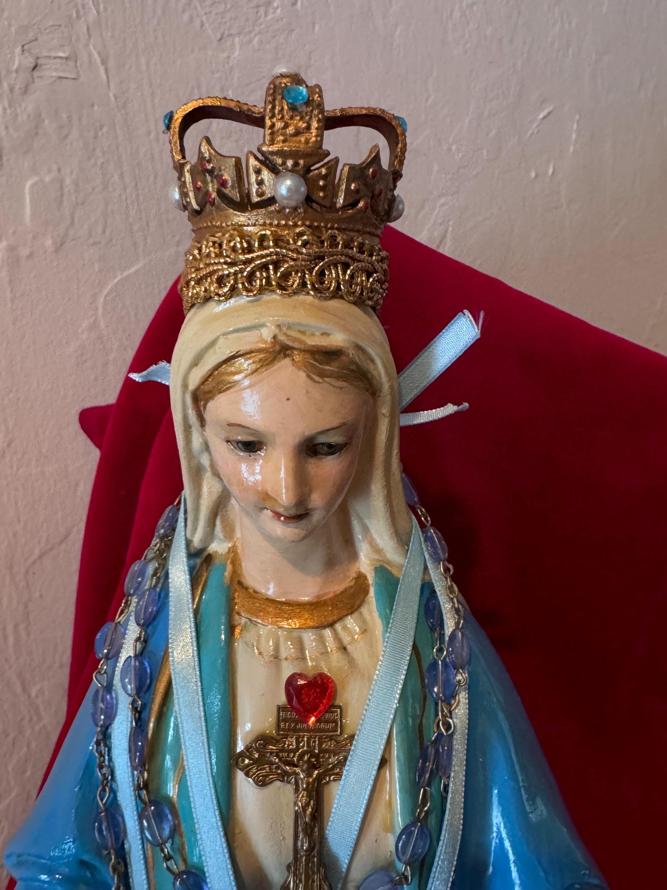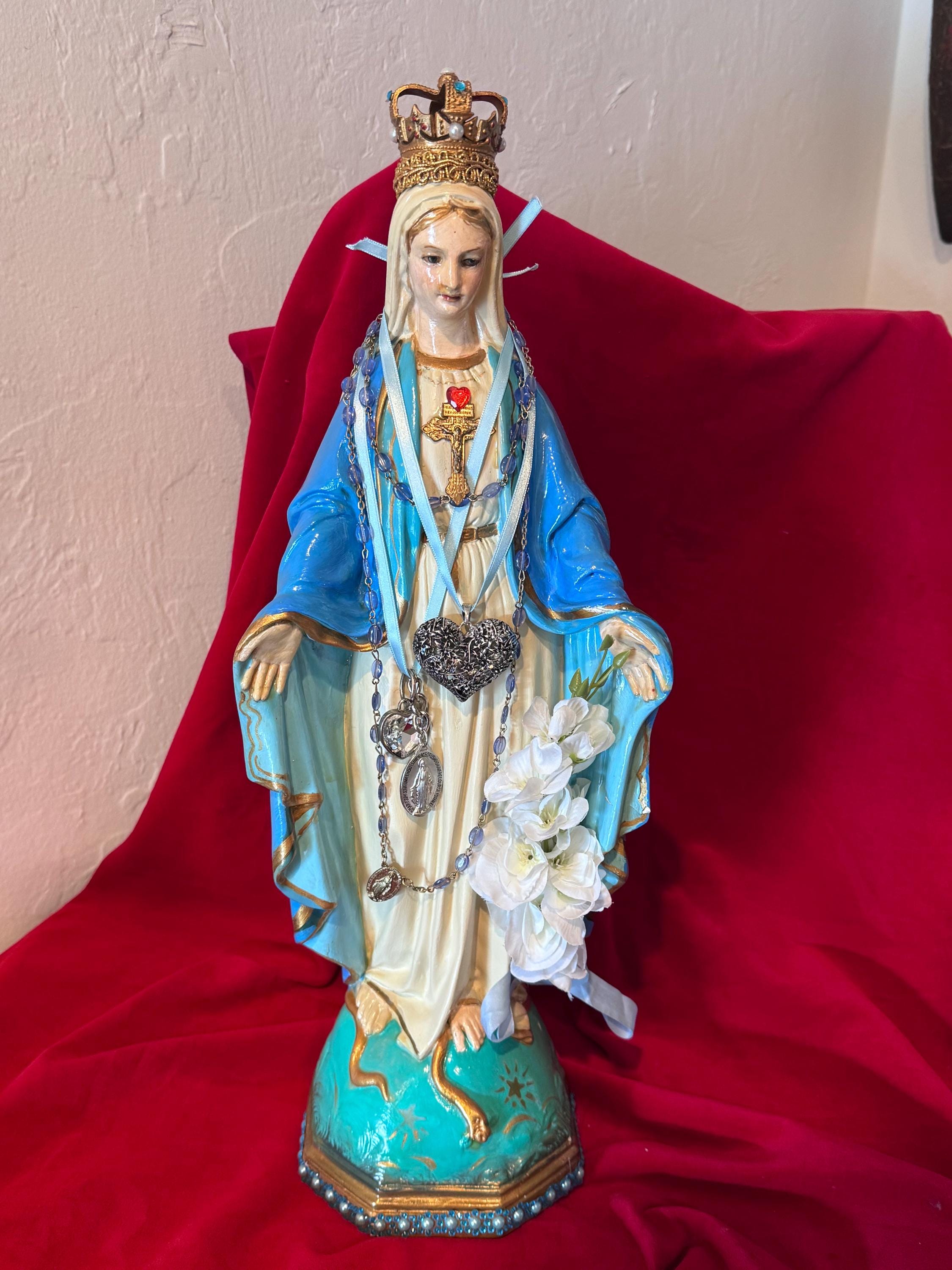 One-of-a-Kind Devotional Art Statue by 2nd Hand Revival Virgin Mary with Crown This stunning piece from 2nd Hand Revival brings new life to vintage religious statues, celebrating the beauty in imperfection. Each statue is carefully restored, with thoughtful attention to detail and personalized artistic embellishments that transform aged, worn figures into timeless works of art in our art studio 2nd Hand Revival. This statue came to use with worn paint - no crown or ornamentation