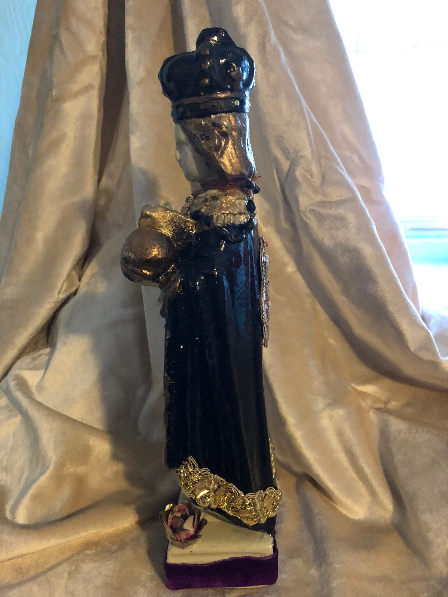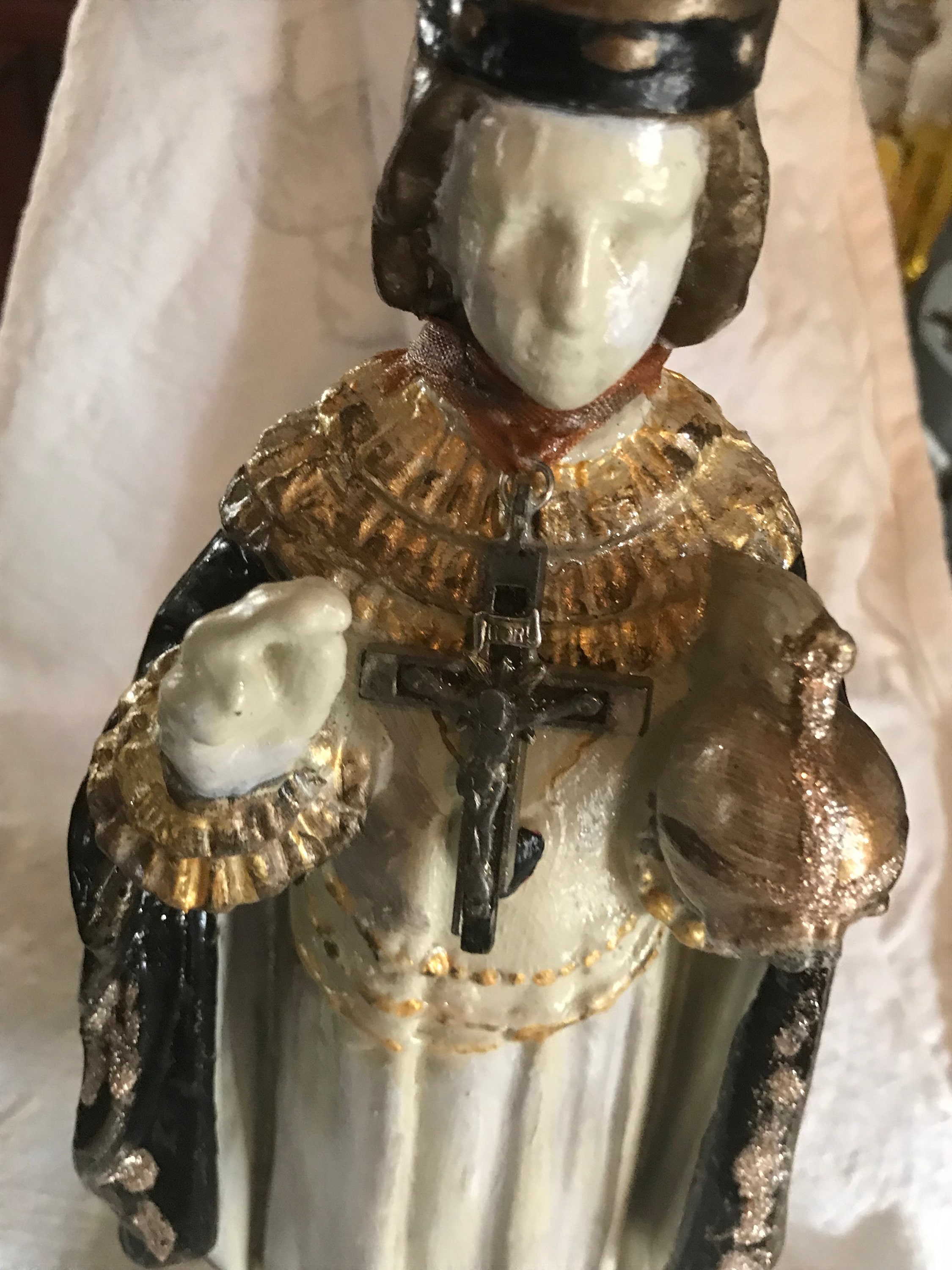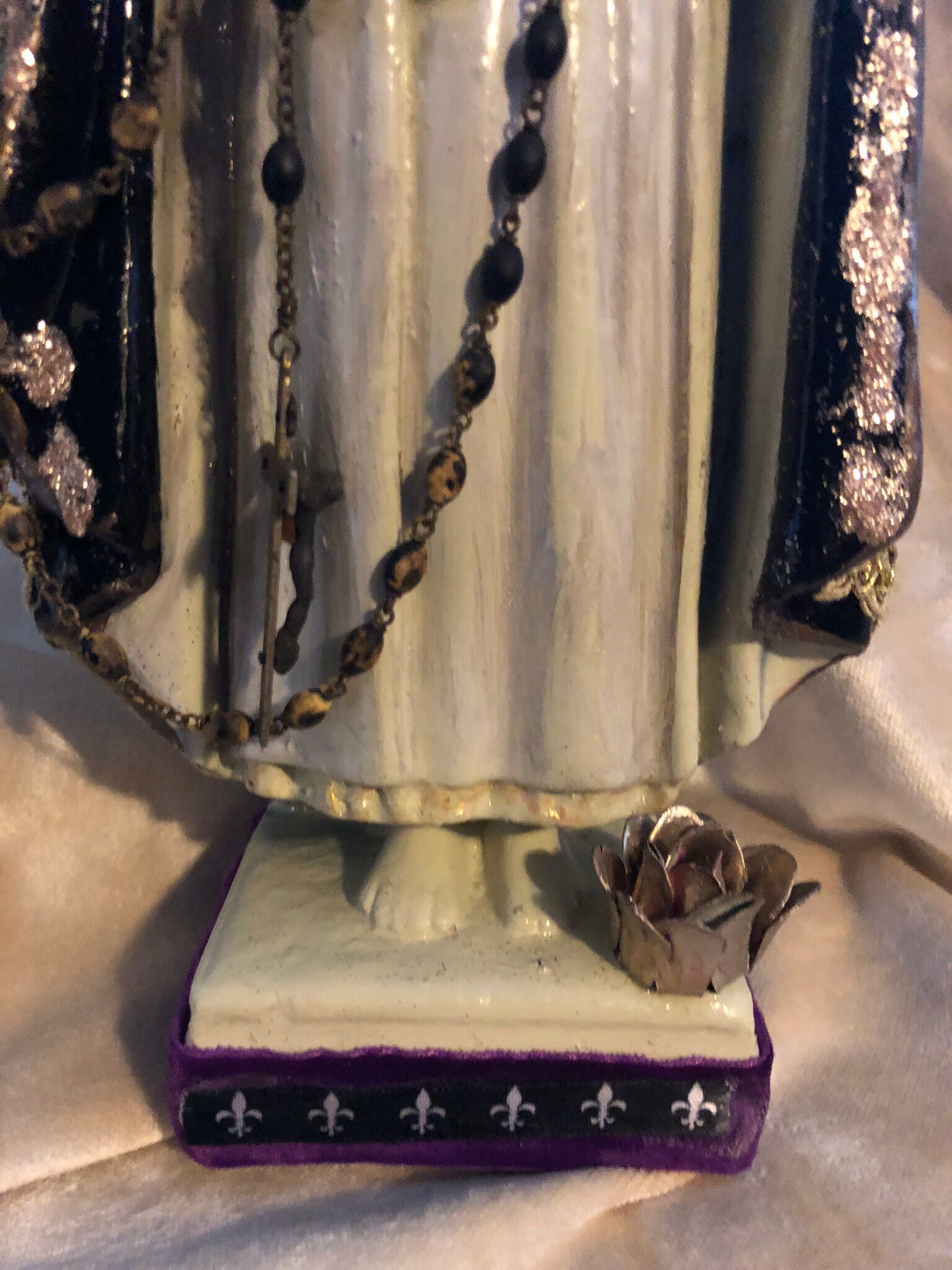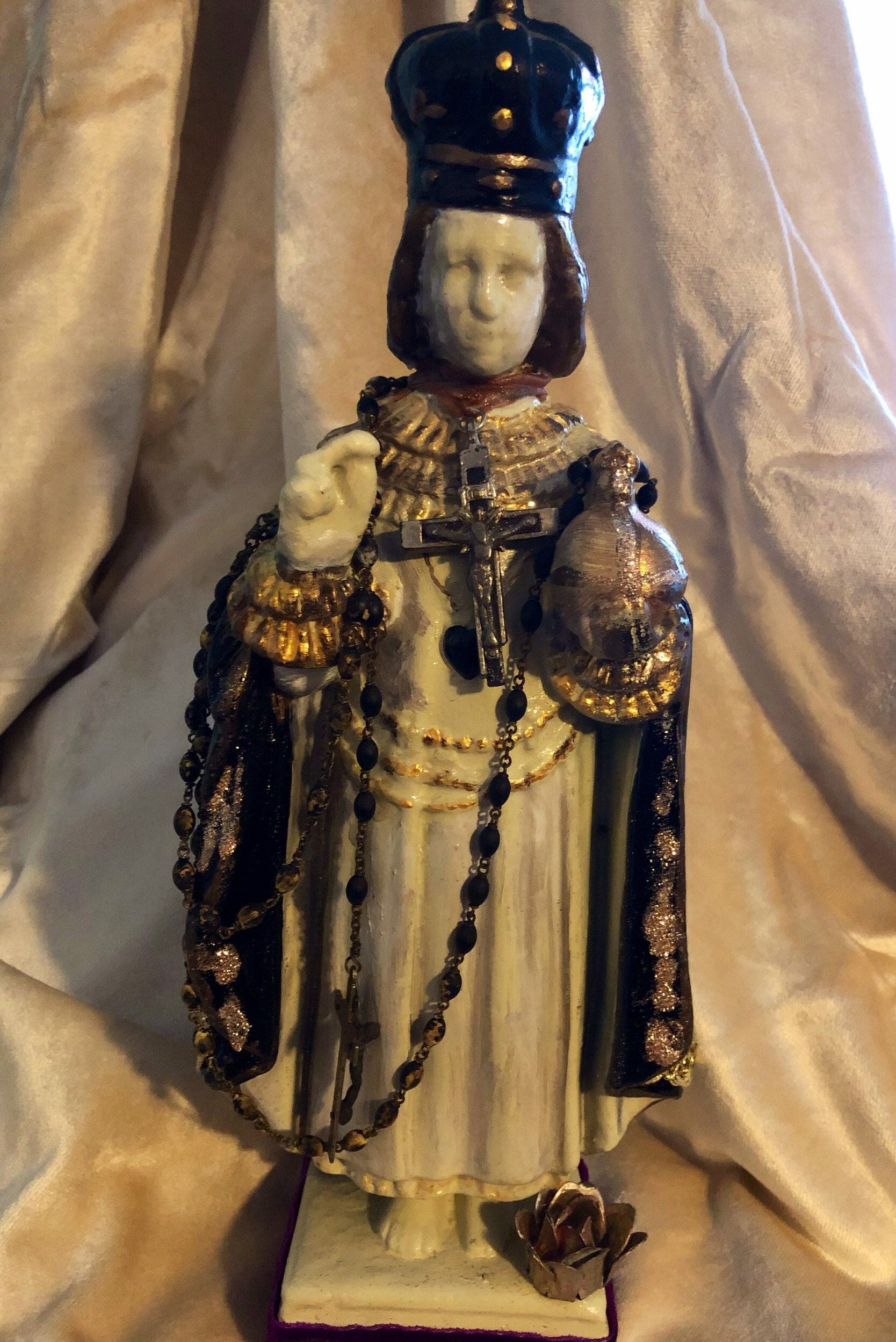 Infant of Prague Chalkware Statue Artist Statue - Devotional Art One of a Kind - Each Made with TLC 2nd Hand Revival takes old imperfect vintage religious statues with issues such as broken necks, hands, missing fingers, and revives their life into pieces of art.. One of a kind with adornments and accents .. This Infant of Prague has a soft white face with no other colors or details. Distressed Soft White and Black Glossy Roses with gold trim paint and some gold glitter .. Gold Trim with small stones at back. Around the neck is a crucifix and around the body & hand is an antique pair of rosary beads. Small Metal Flower at Back . Purple Trim with Flueur De Lis trim at front . Beautiful Medallion at back . Distressed paint and as cool as can be and artist signed - T Murtha 2016 Measures 13" Tall and Base 3" wide