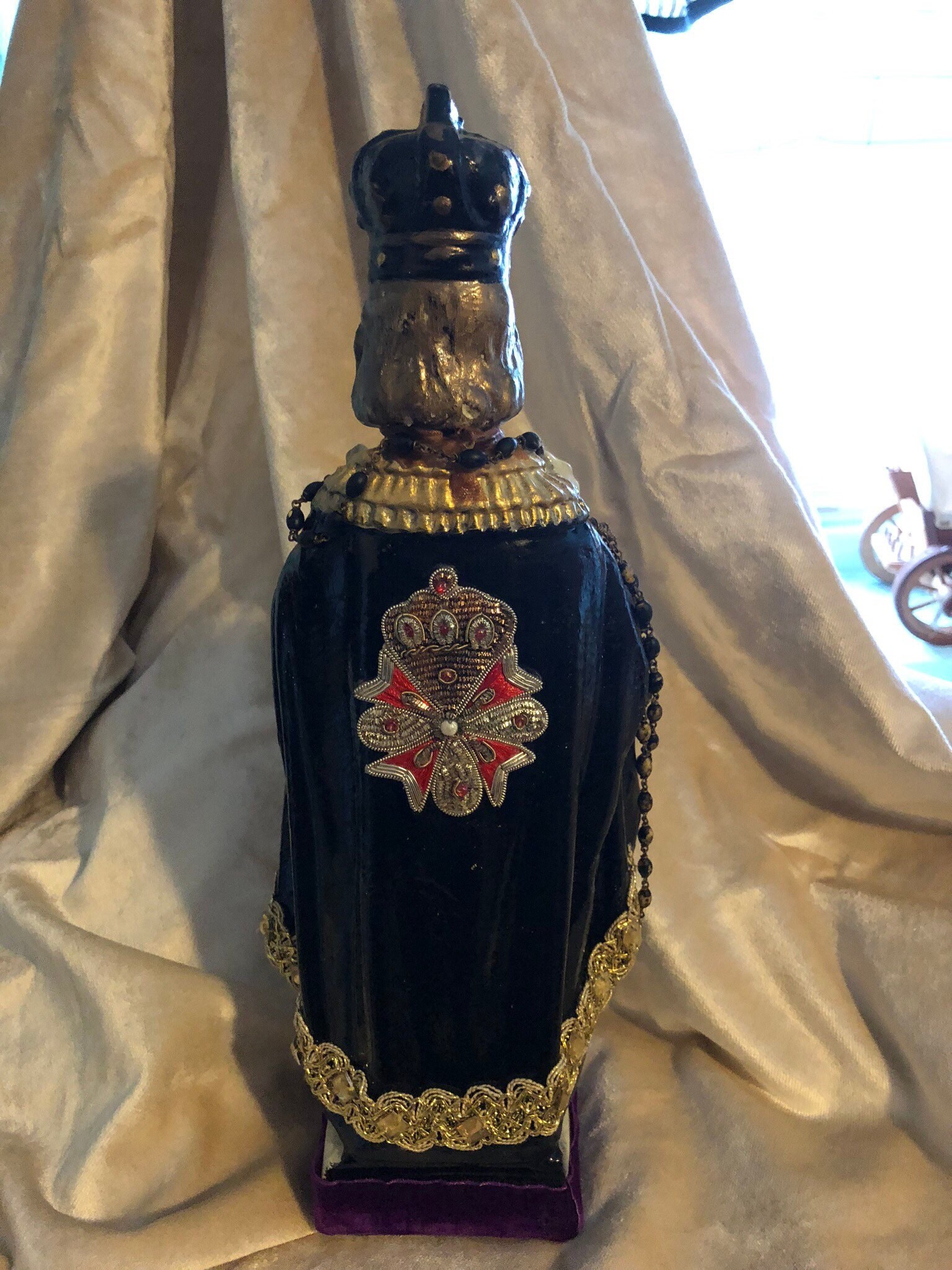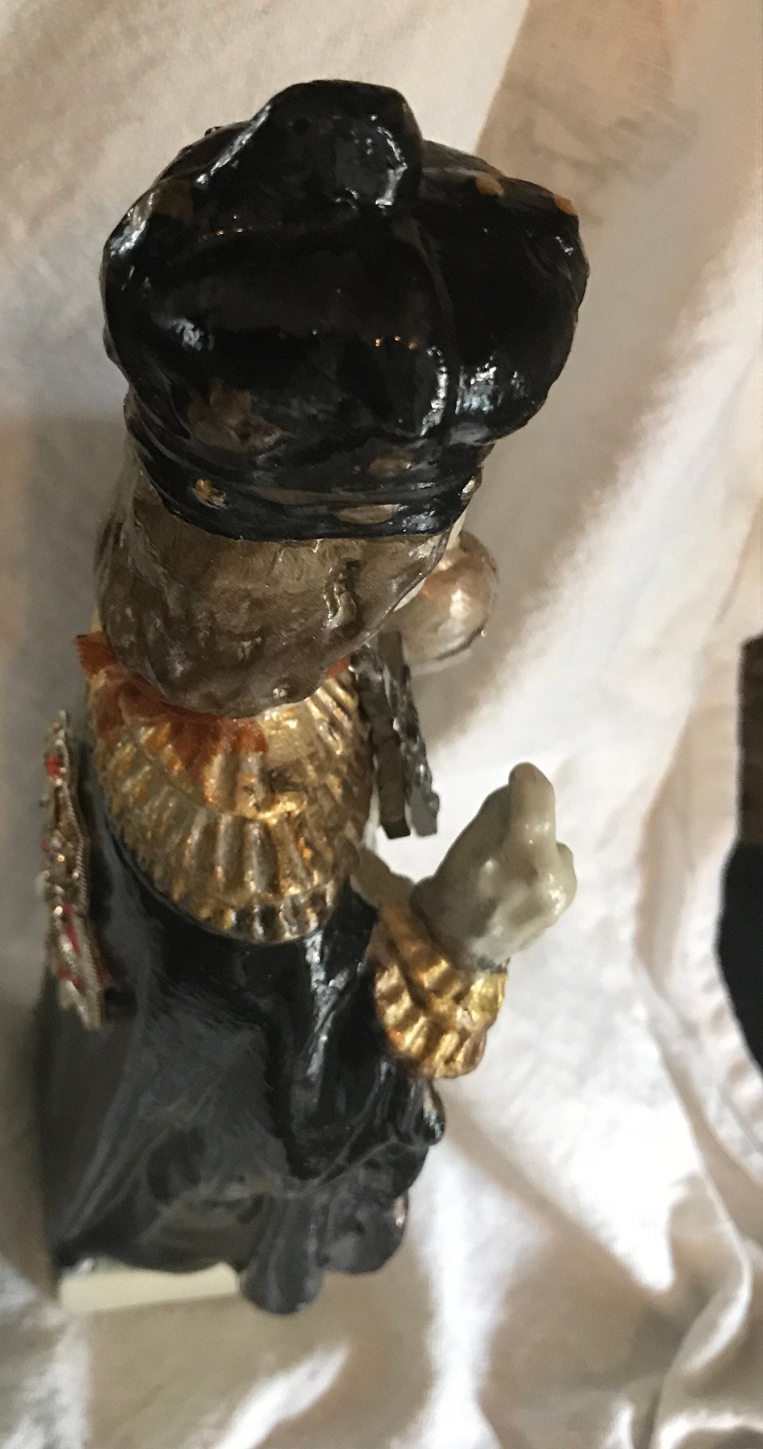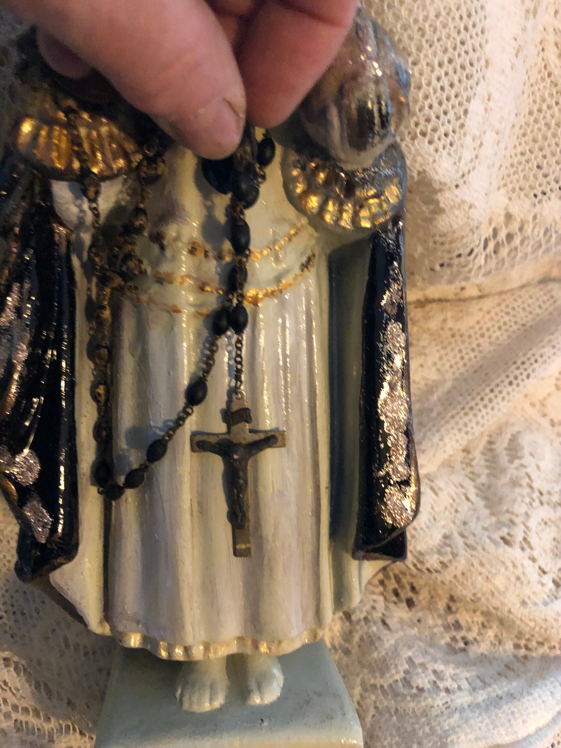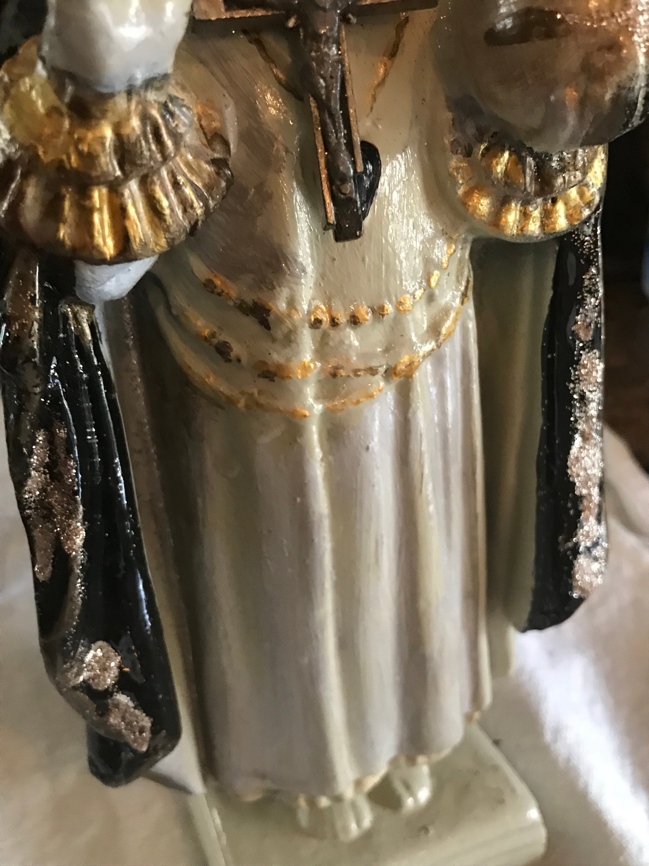 Infant of Prague Chalkware Statue Artist Statue - Devotional Art One of a Kind - Each Made with TLC 2nd Hand Revival takes old imperfect vintage religious statues with issues such as broken necks, hands, missing fingers, and revives their life into pieces of art.. One of a kind with adornments and accents .. This Infant of Prague has a soft white face with no other colors or details. Distressed Soft White and Black Glossy Roses with gold trim paint and some gold glitter .. Gold Trim with small stones at back. Around the neck is a crucifix and around the body & hand is an antique pair of rosary beads. Small Metal Flower at Back . Purple Trim with Flueur De Lis trim at front . Beautiful Medallion at back . Distressed paint and as cool as can be and artist signed - T Murtha 2016 Measures 13" Tall and Base 3" wide