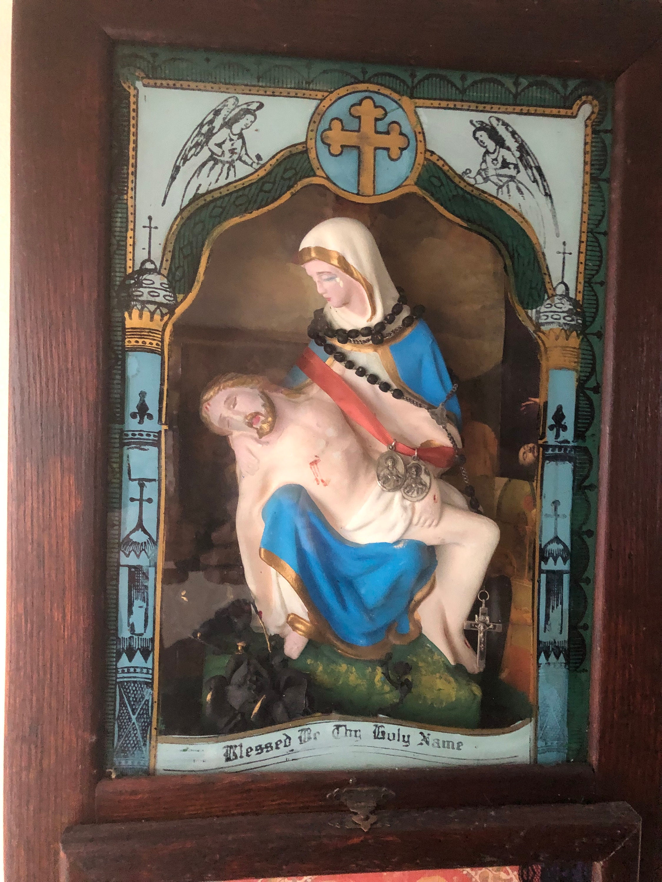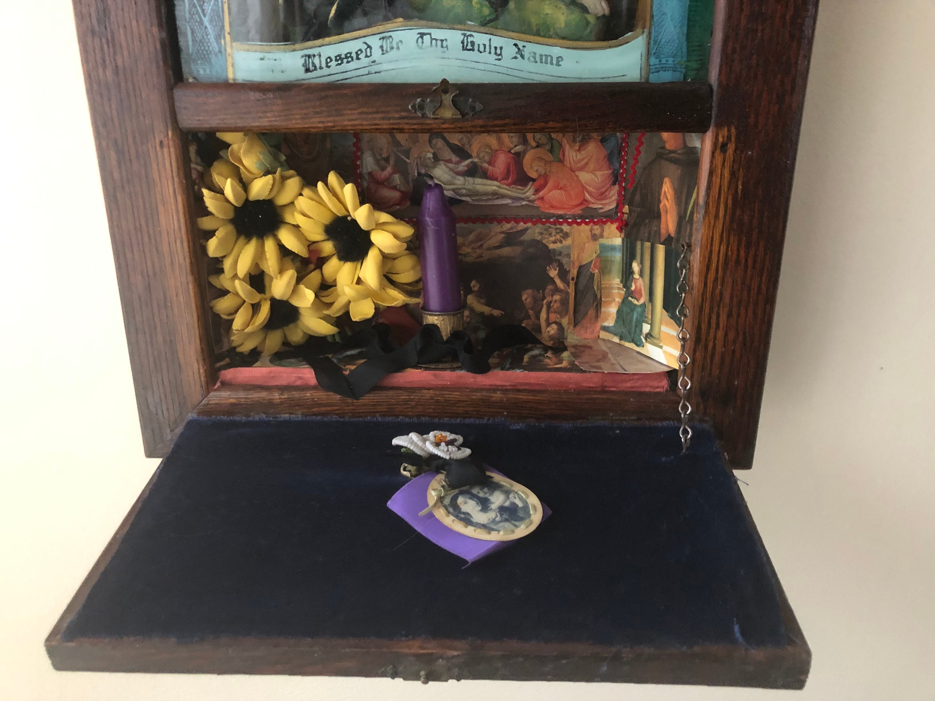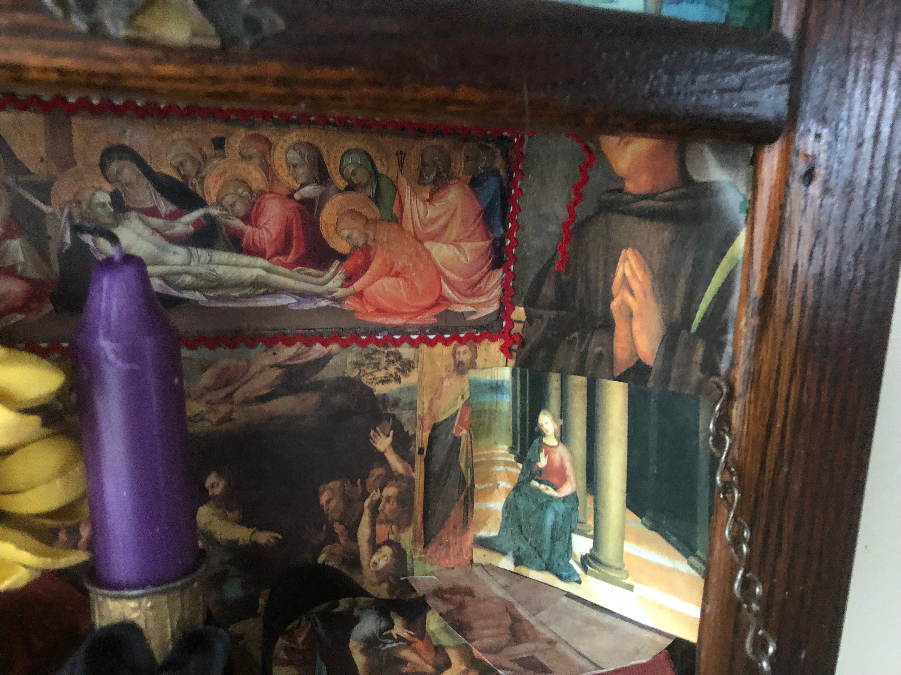 WALLS OF BOX ARE A DECOUPAGE OF DIFFERENT RELIGIOUS PICTURES..