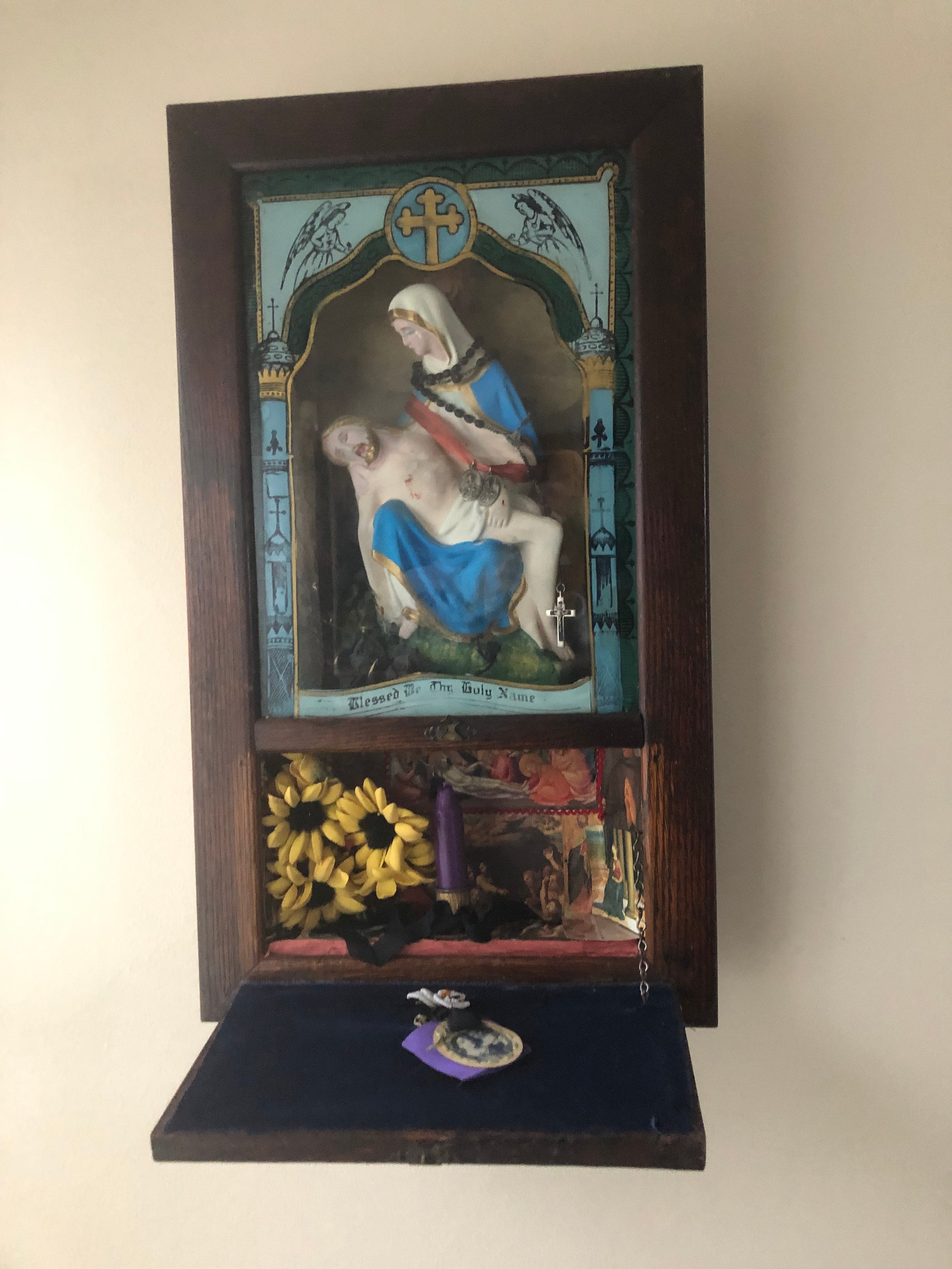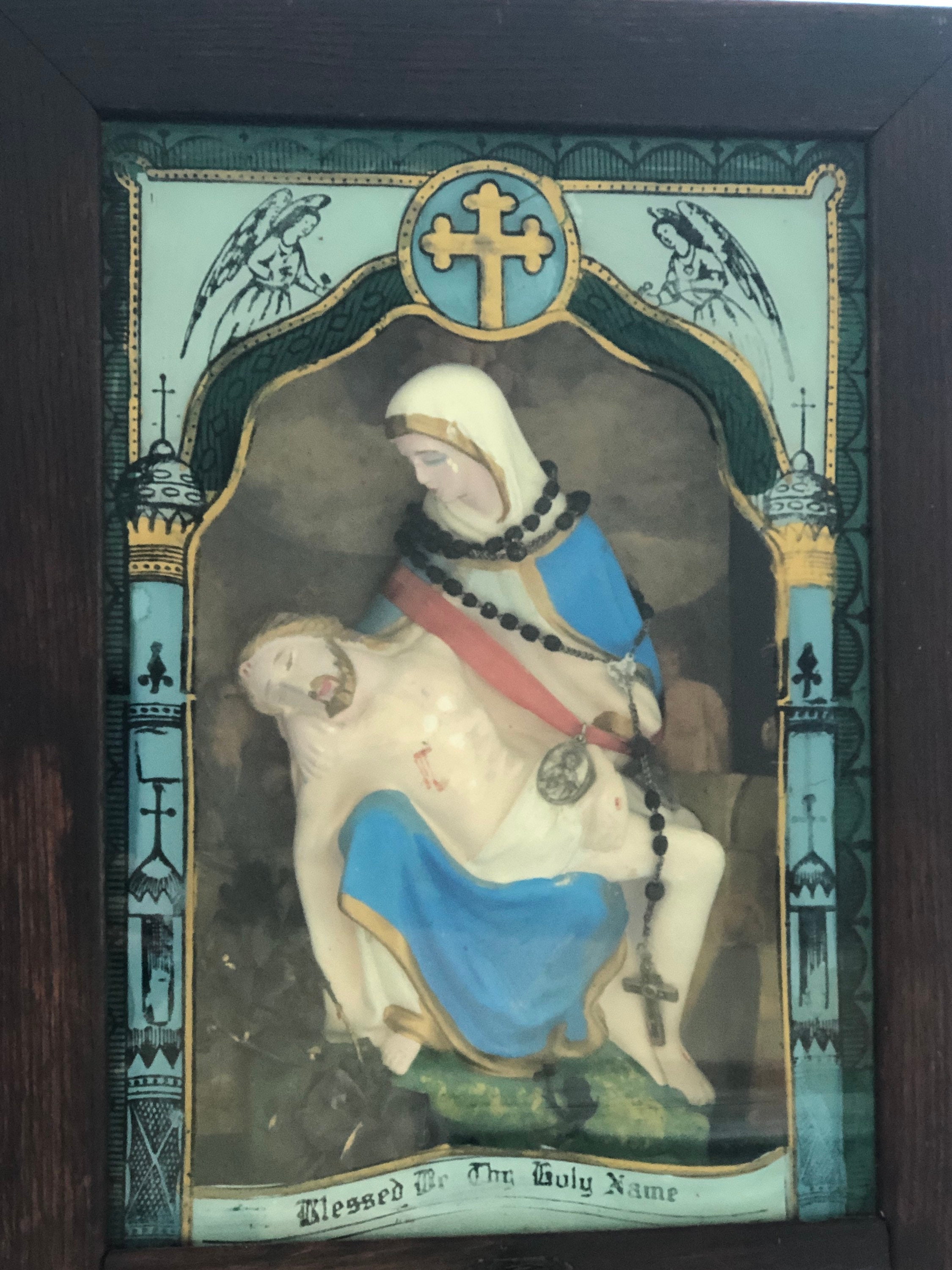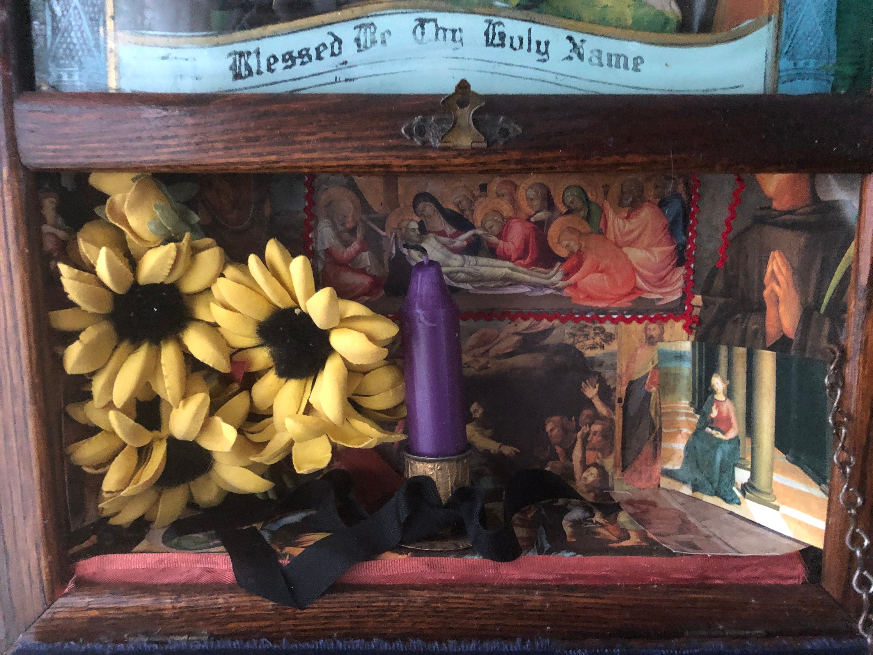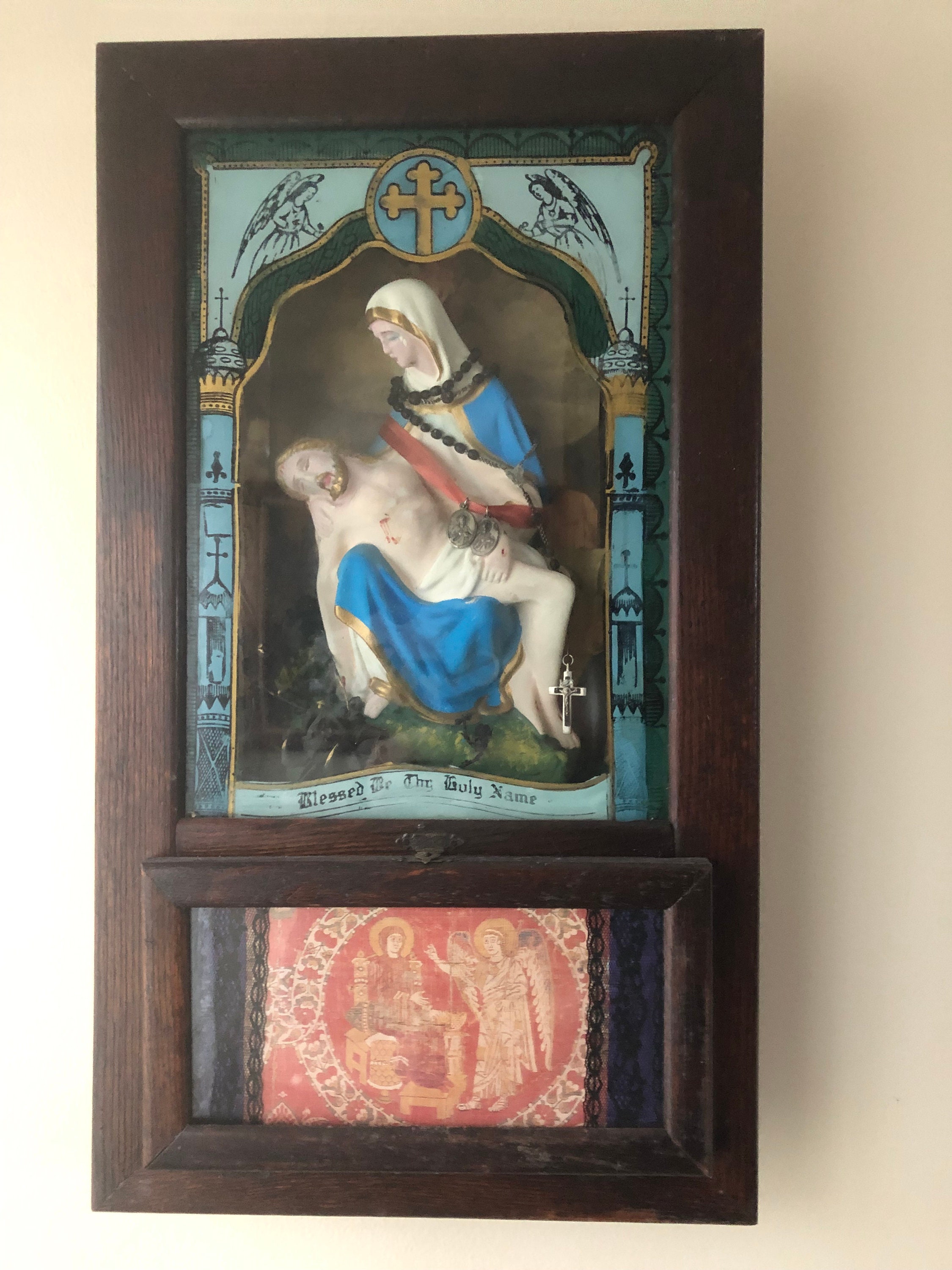 WALLS OF BOX ARE A DECOUPAGE OF DIFFERENT RELIGIOUS PICTURES..