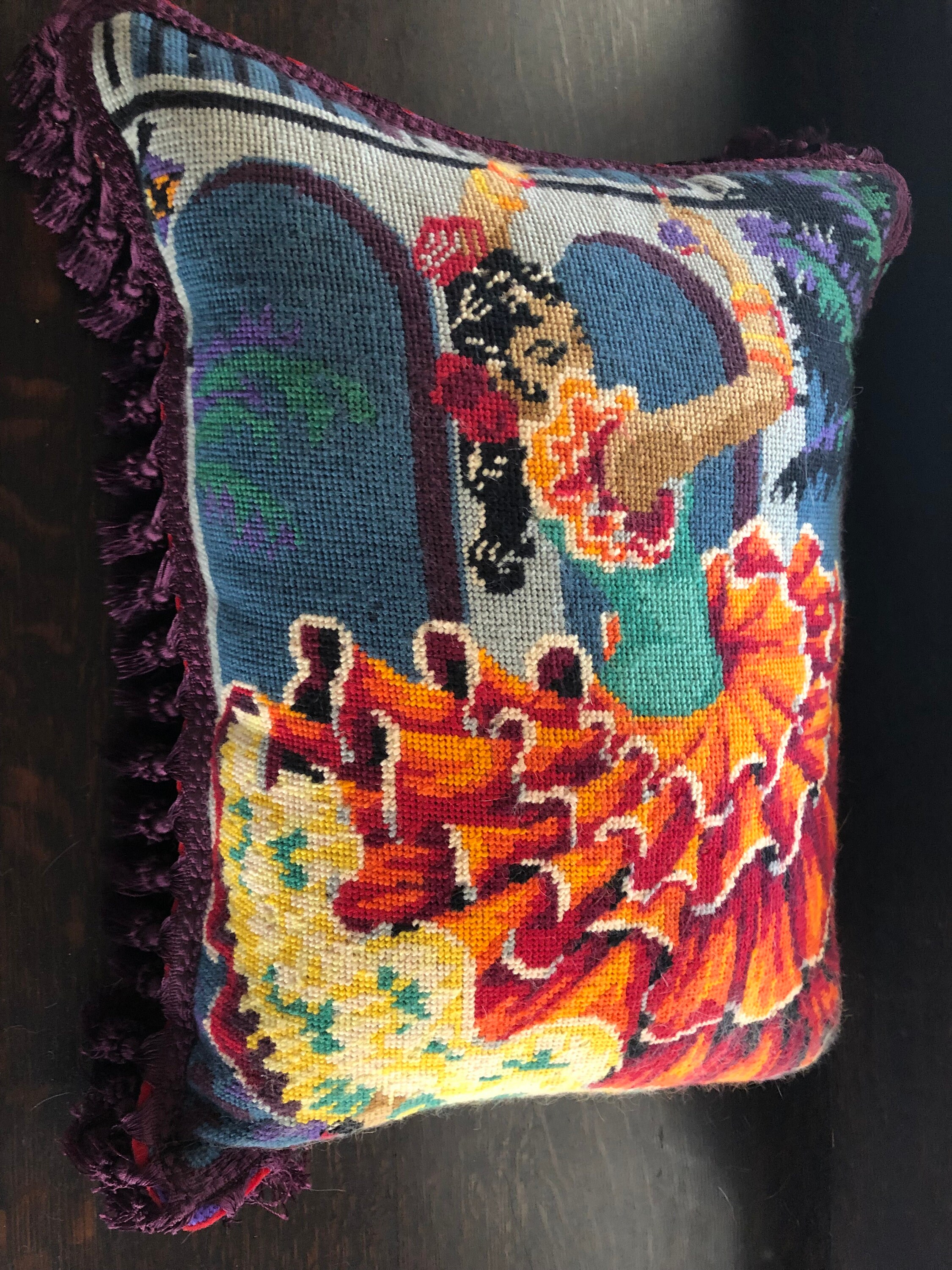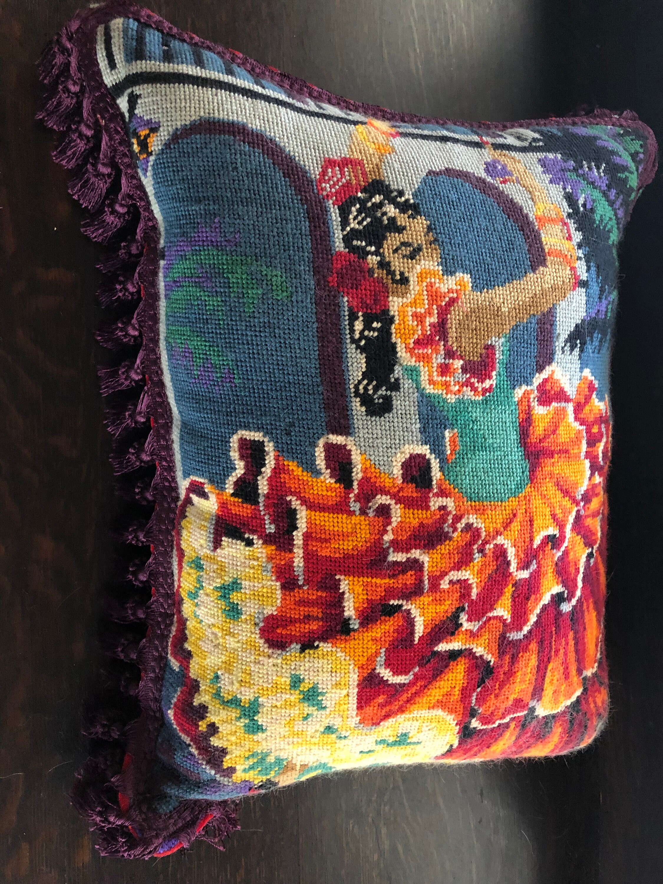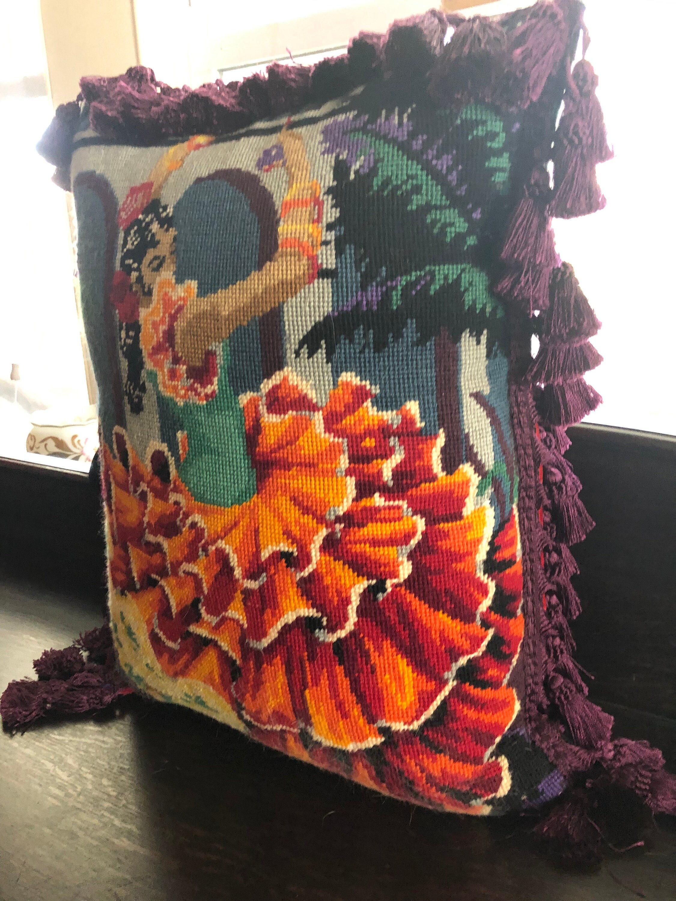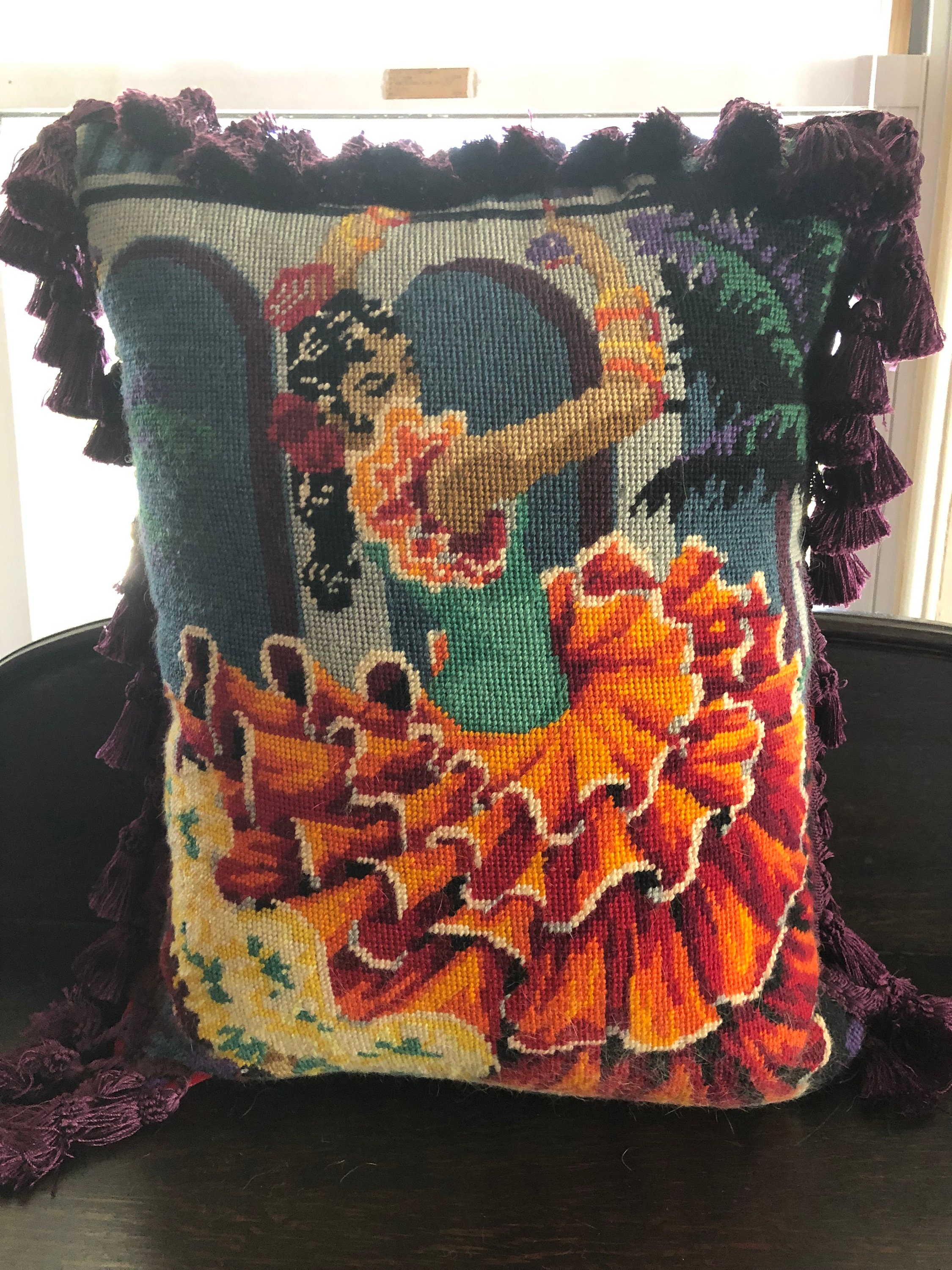 Needlepoint Pillow Beautiful ! One of a Kind.. Handmade with Vintage Needlepoint and Velvet Backing by 2nd Hand Revival Art Studios - A Vintage Original by Katy Davison Label attached under the tassle Beautiful Flamenco Dancer & a Deep Red Velvet Backing Nice Craftsmanship and Stitching to the Wool Needlepoint Nice Tassle Trim - a deep Eggplant Purple Color 15" Wide x 20" Tall and add 3" for the Trim About 8" Thick See Photos for Details