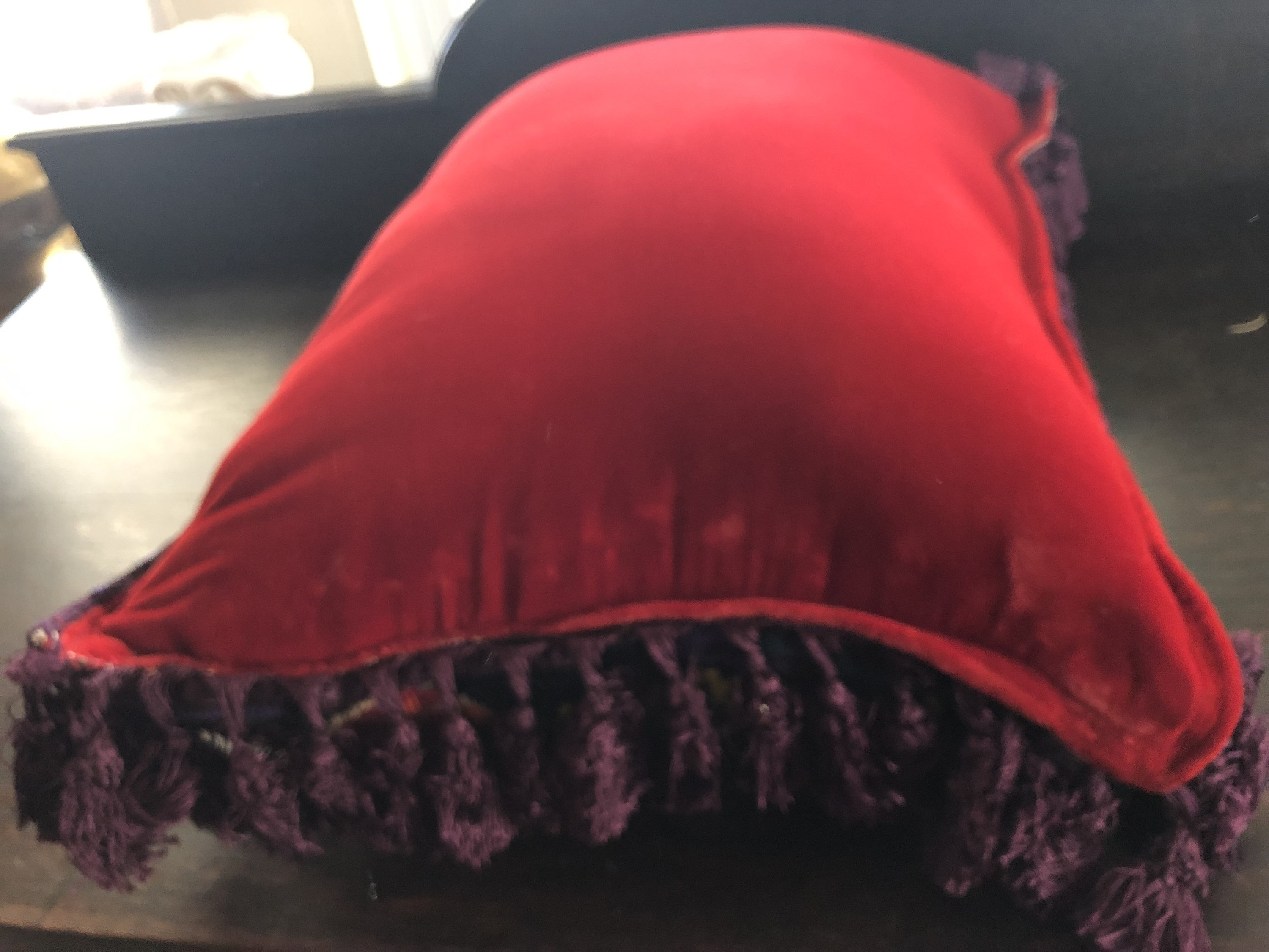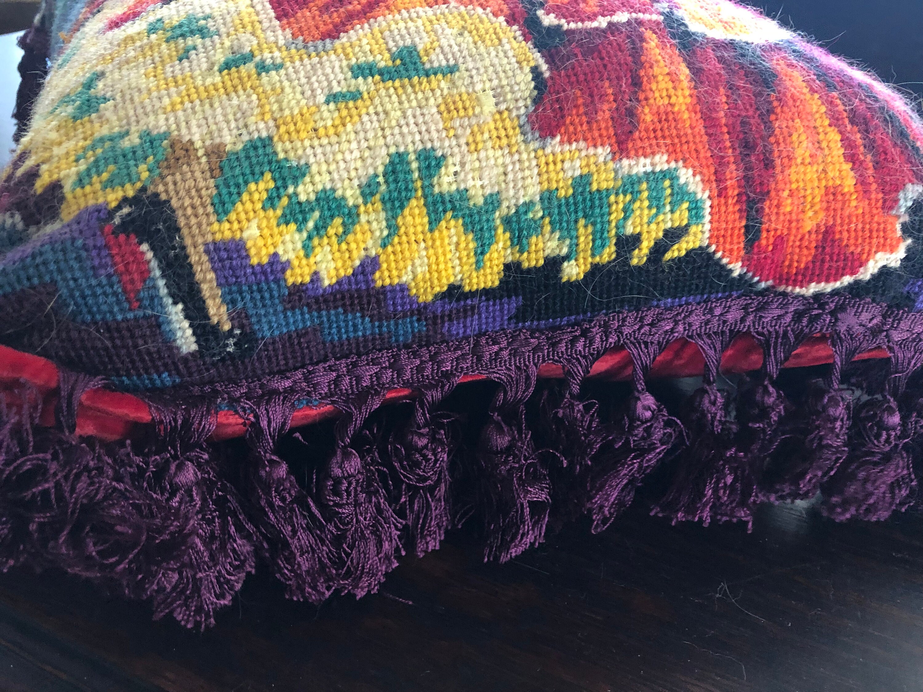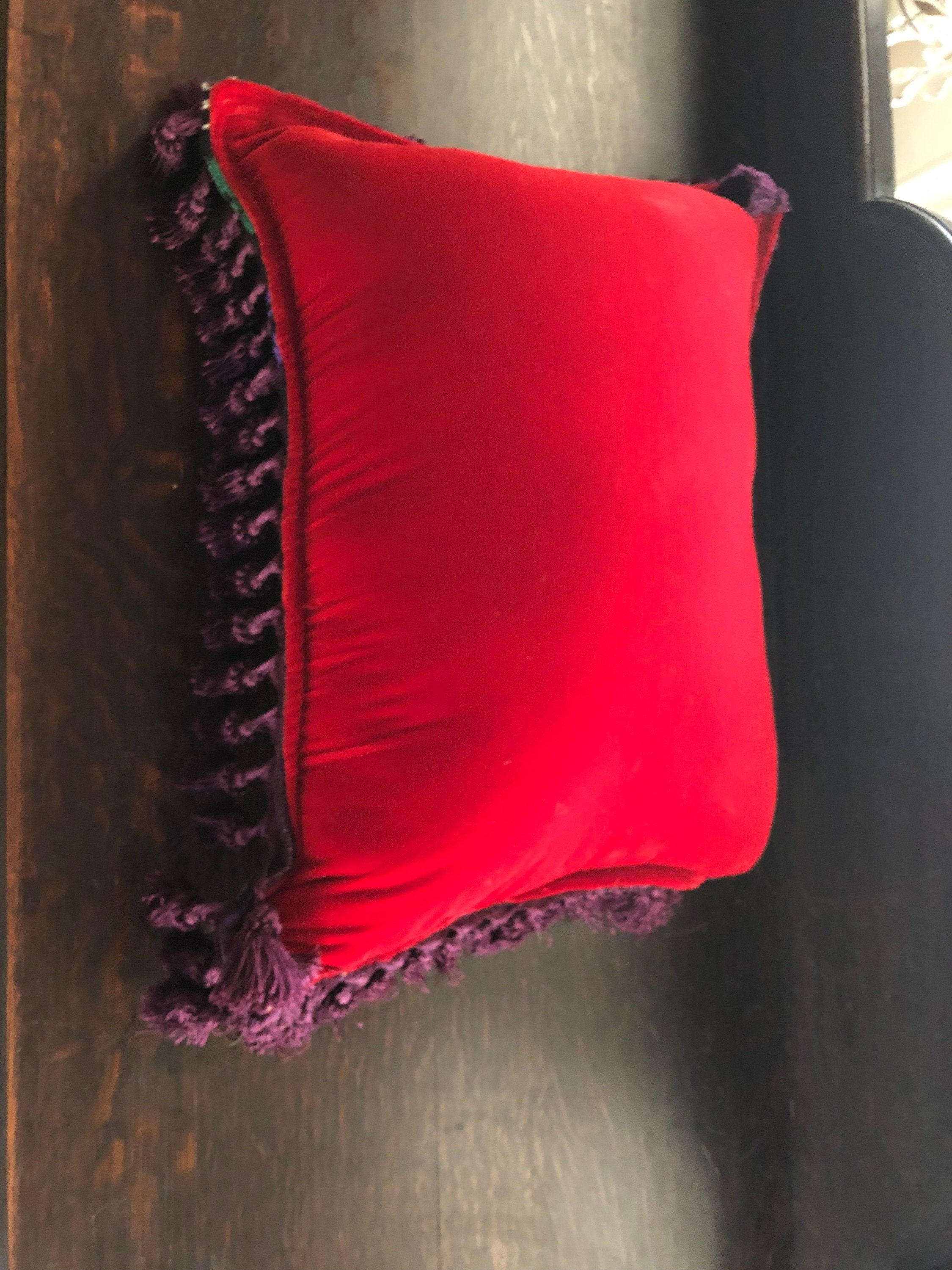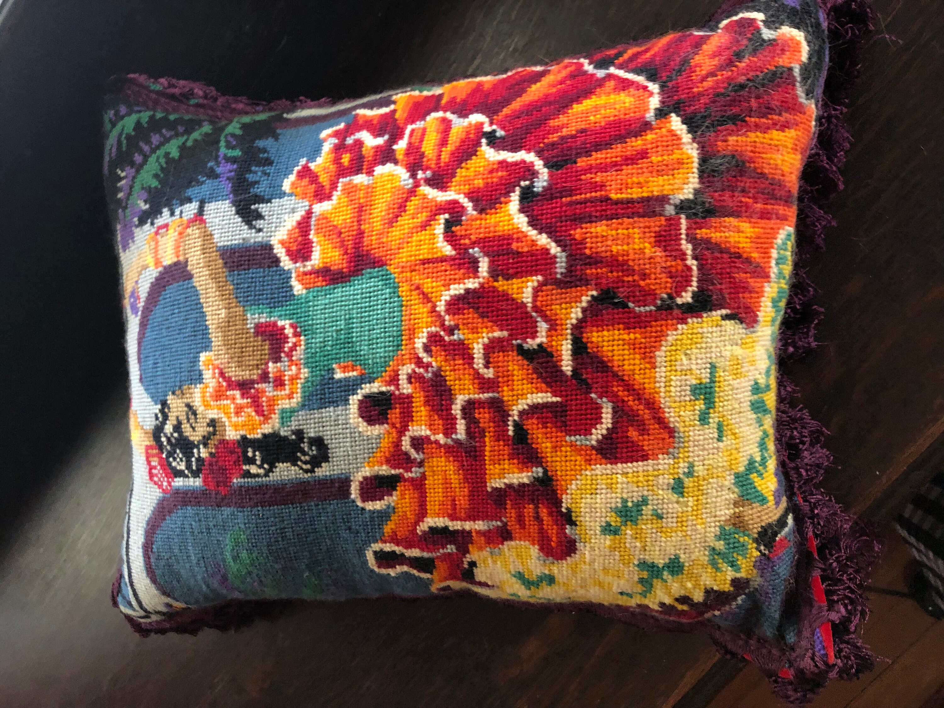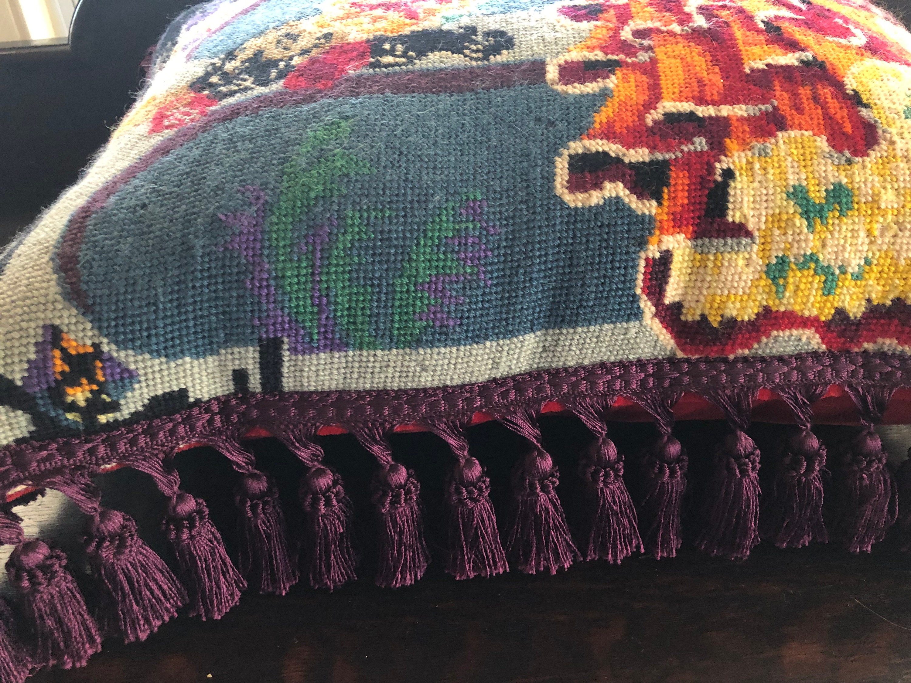 Needlepoint Pillow Beautiful ! One of a Kind.. Handmade with Vintage Needlepoint and Velvet Backing by 2nd Hand Revival Art Studios - A Vintage Original by Katy Davison Label attached under the tassle Beautiful Flamenco Dancer & a Deep Red Velvet Backing Nice Craftsmanship and Stitching to the Wool Needlepoint Nice Tassle Trim - a deep Eggplant Purple Color 15" Wide x 20" Tall and add 3" for the Trim About 8" Thick See Photos for Details
